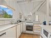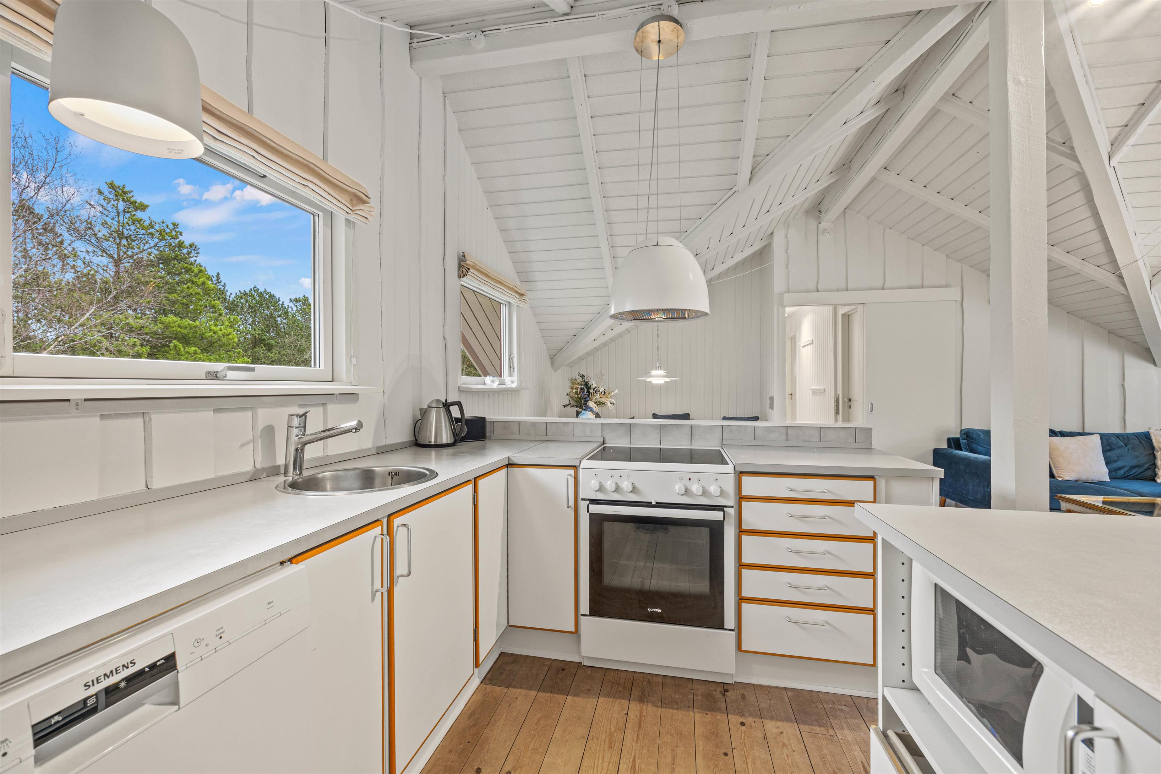 Midtpunktet i sommerhuset er det indbydende alrum med stue, spisestue og integreret køkken med opvaskemaskine i ét. Feriehuset rummer også en energisparende varmepumpe og et badeværelse med gulvvarme.