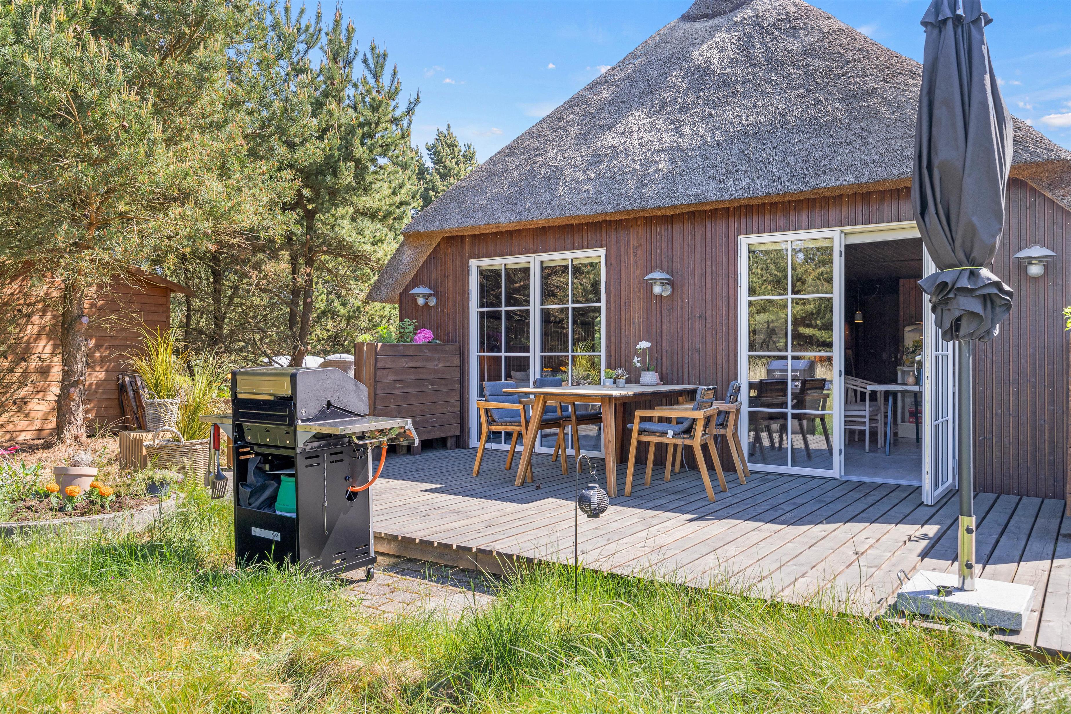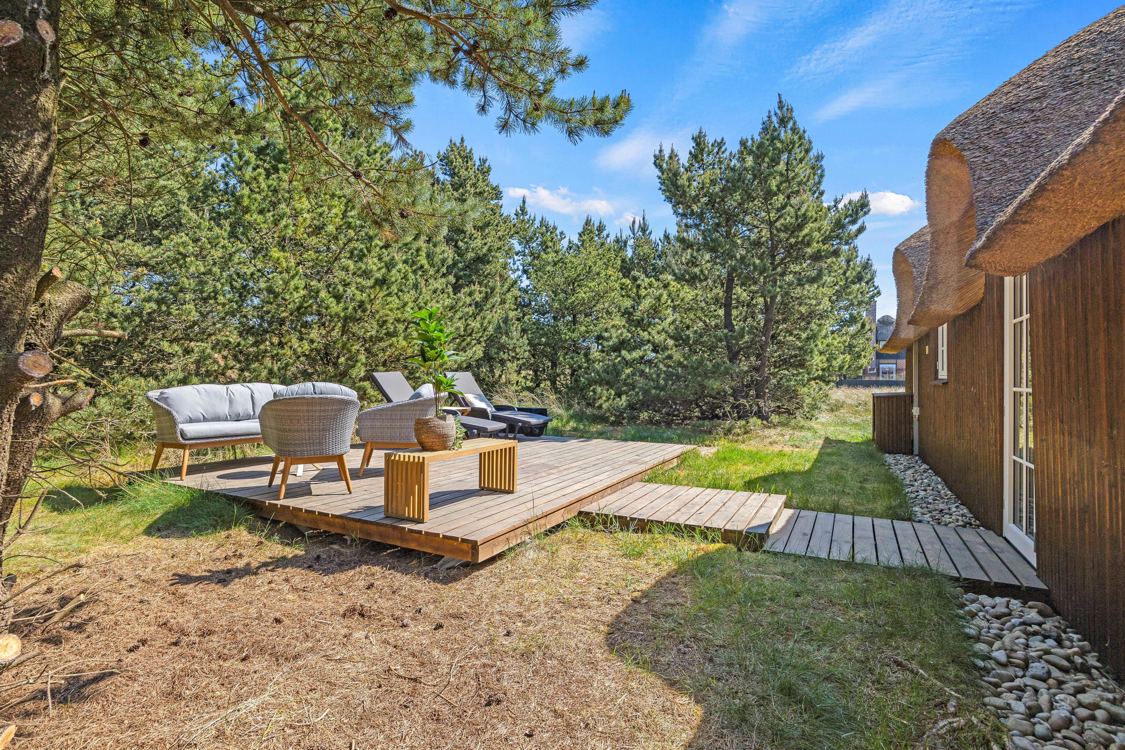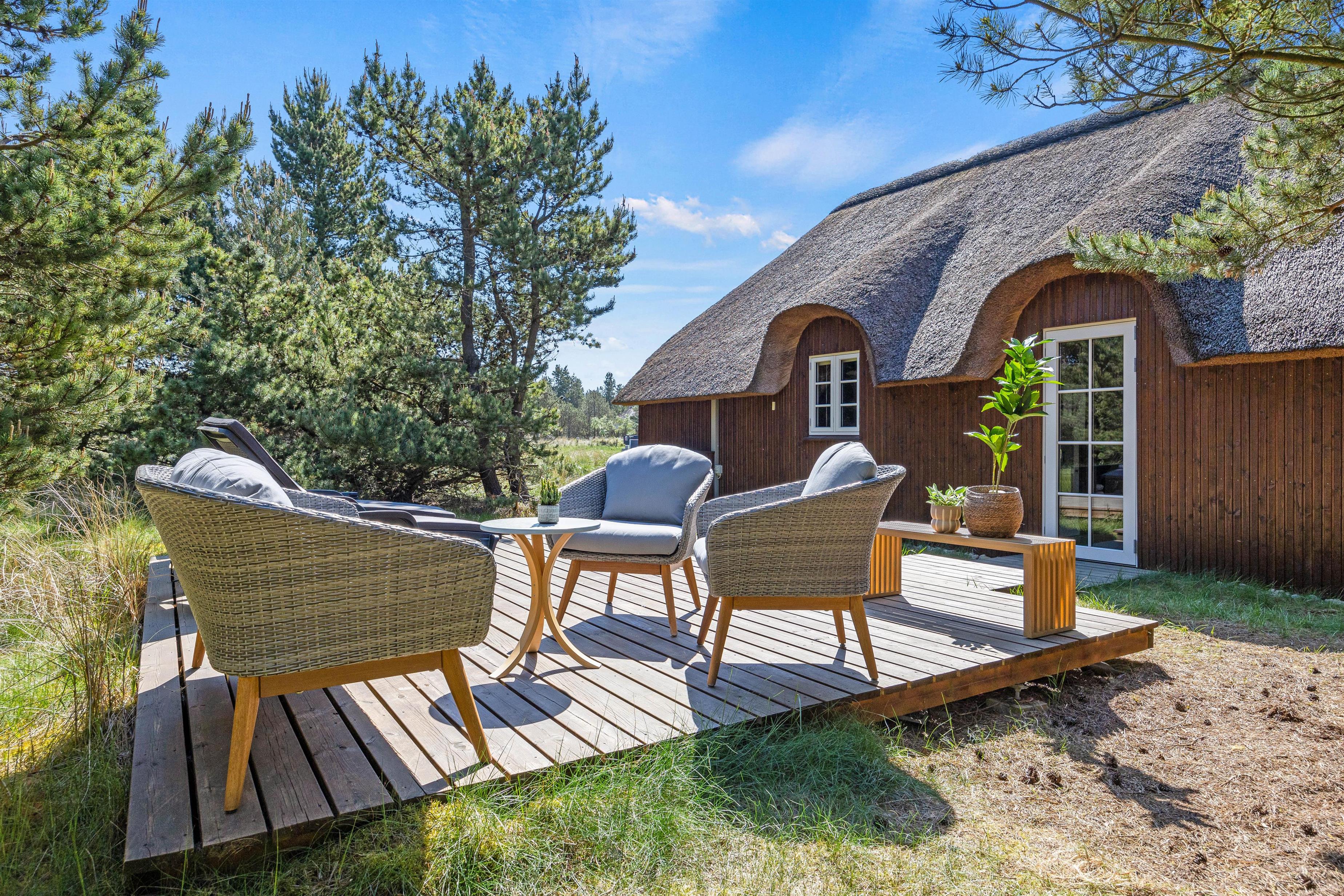 Den store klitgrund på omtrent 2300 m2 grænser op til et stort skovområde – her kan I holde en fredelig ferie og nyde solen på den store åbne træterrasse. På syd- og vest side omfavnes feriehuset af en dejlig terrasse, som er perfekt til brunch eller lidt koldt at drikke i den bløde udendørssofa. På modsatte side af huset er endnu en fin terrasse, hvor I kan sidde i læ bag fyrretræerne. Tænd op i grillen og tilbered et lækkert måltid, som hører de lune sommeraftner til.