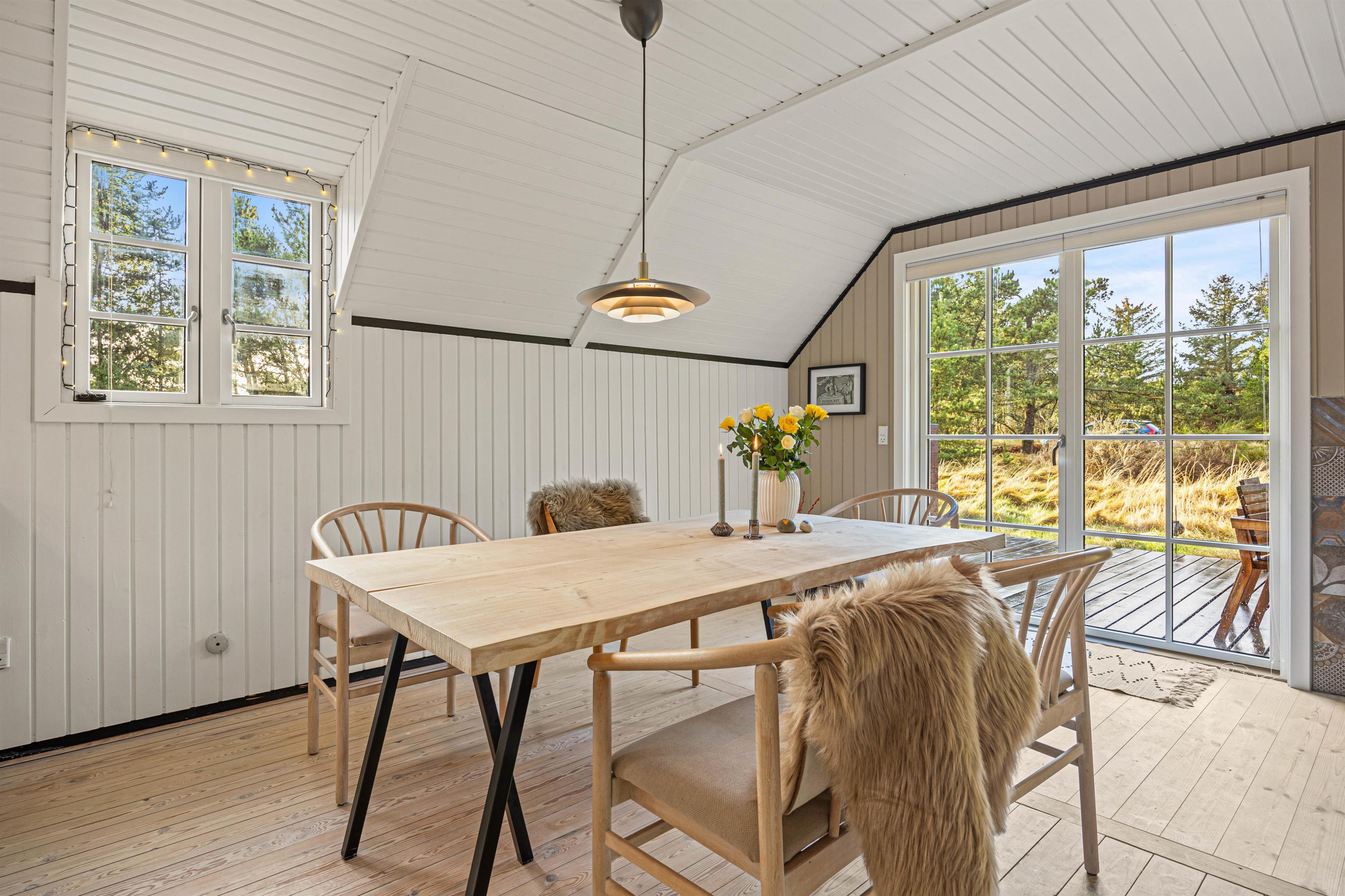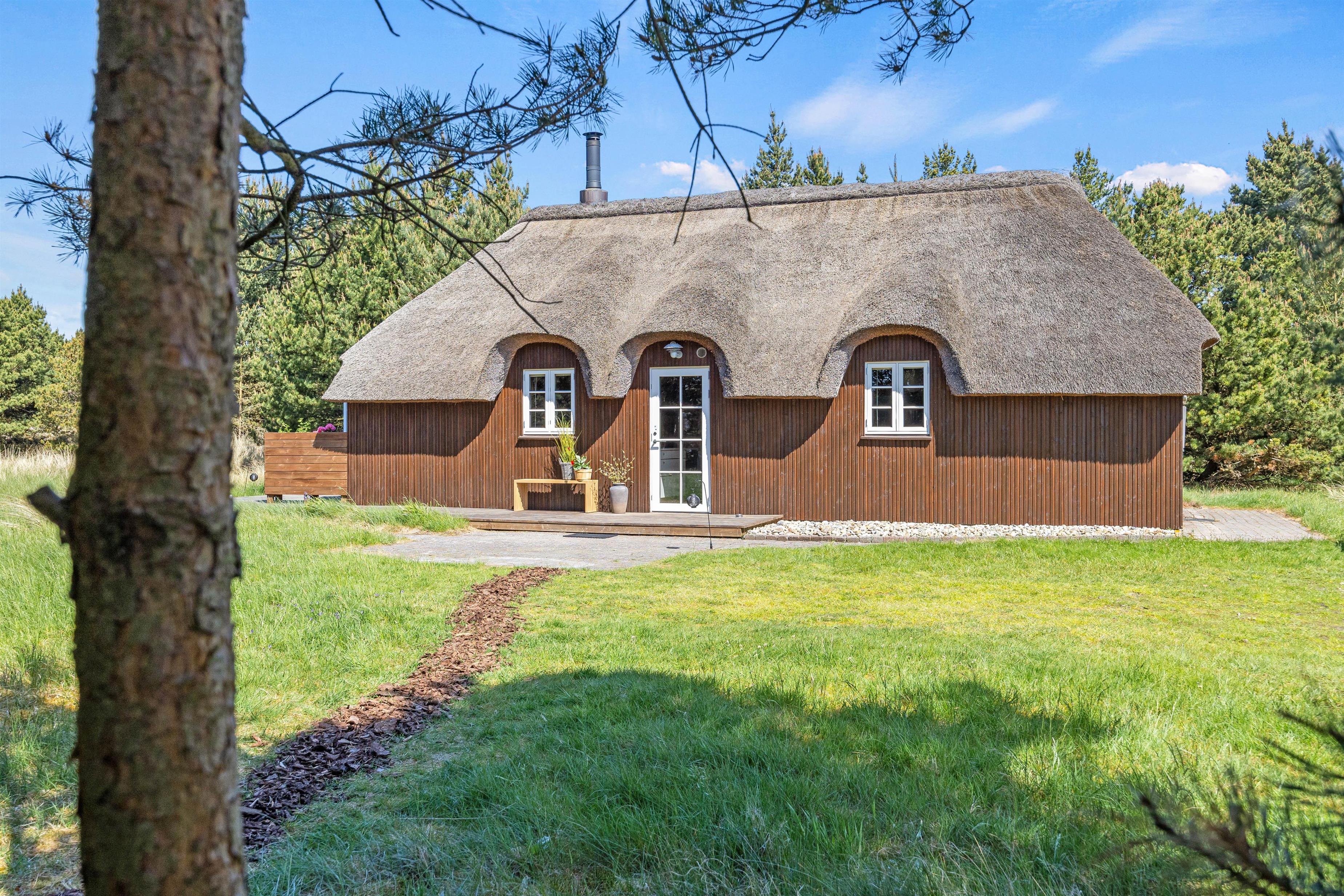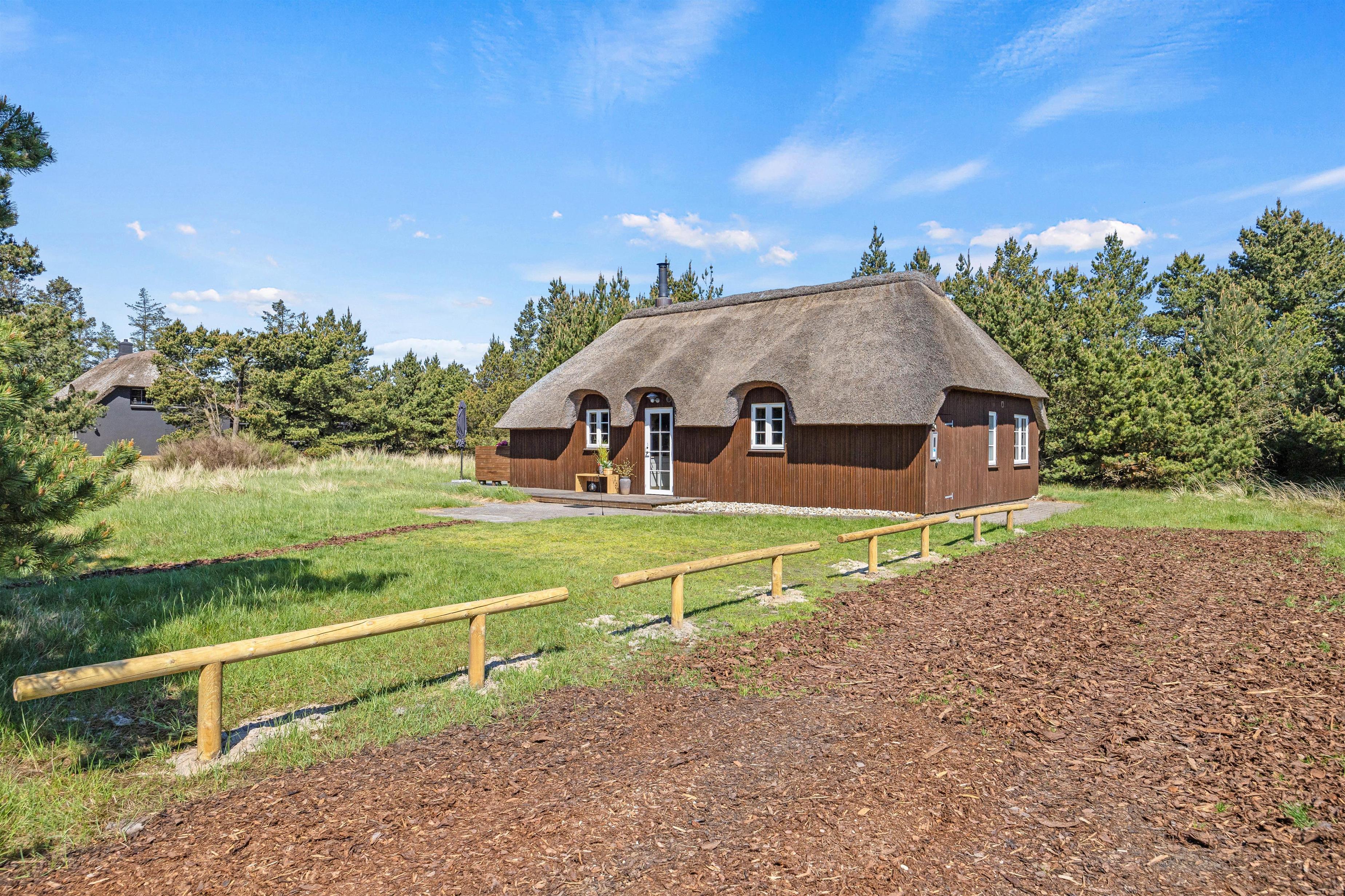 Den store klitgrund på omtrent 2300 m2 grænser op til et stort skovområde – her kan I holde en fredelig ferie og nyde solen på den store åbne træterrasse. På syd- og vest side omfavnes feriehuset af en dejlig terrasse, som er perfekt til brunch eller lidt koldt at drikke i den bløde udendørssofa. På modsatte side af huset er endnu en fin terrasse, hvor I kan sidde i læ bag fyrretræerne. Tænd op i grillen og tilbered et lækkert måltid, som hører de lune sommeraftner til.