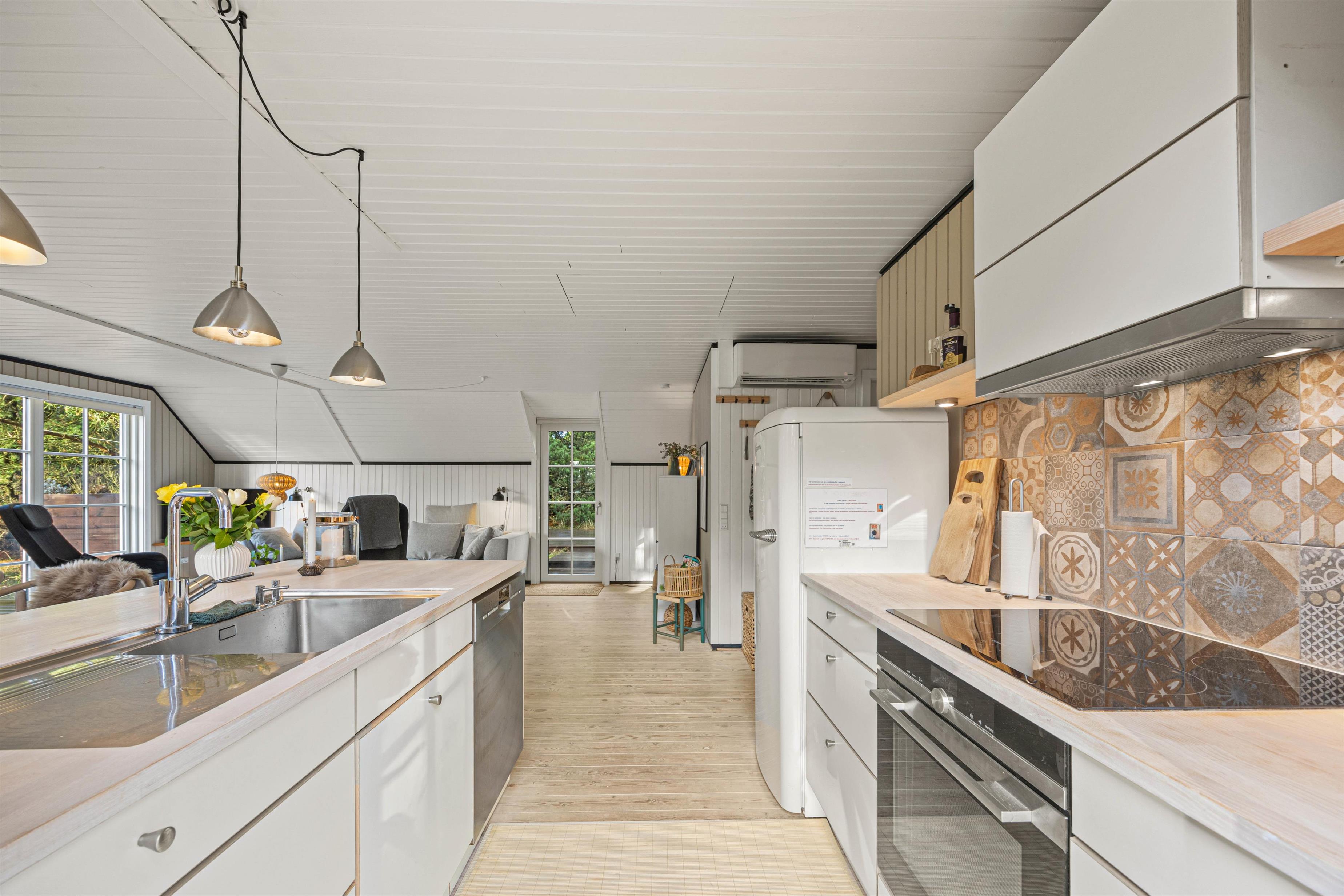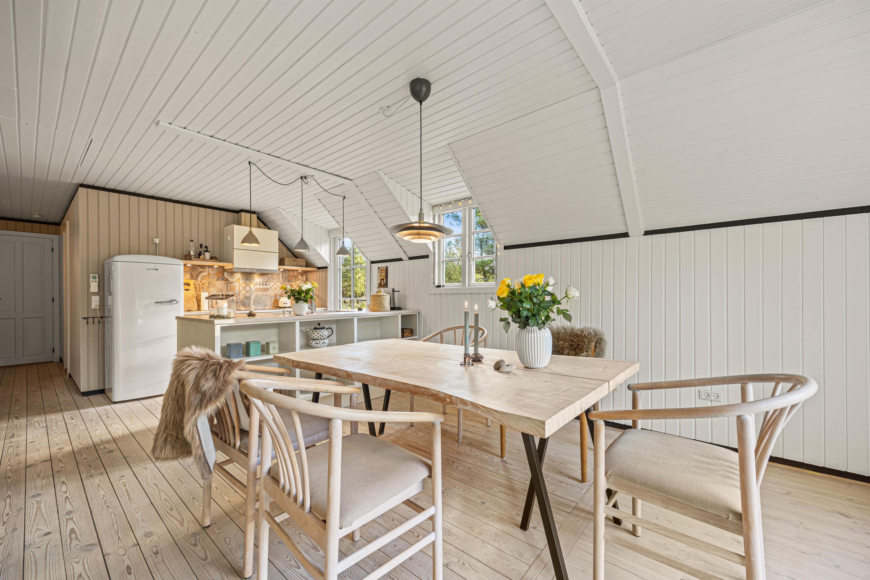 Feriehusets hjerterum er den rummelige opholdsstue med åbent køkken og stue, hvorfra I kan spejle over det smukke landskab. Med en funktionel indretning er der plads til hele flokken, om I vil være fælles om madlavningen i køkkenet eller slå jer ned til filmhygge i den store sofa. Saml jer omkring et brætspil eller læs yndlingskrimien fra den behagelige lænestol – imens spreder brændeovnen varme og glæde i rummet. Desuden kan I også bruge den energibesparende varmepumpe til opvarmning.