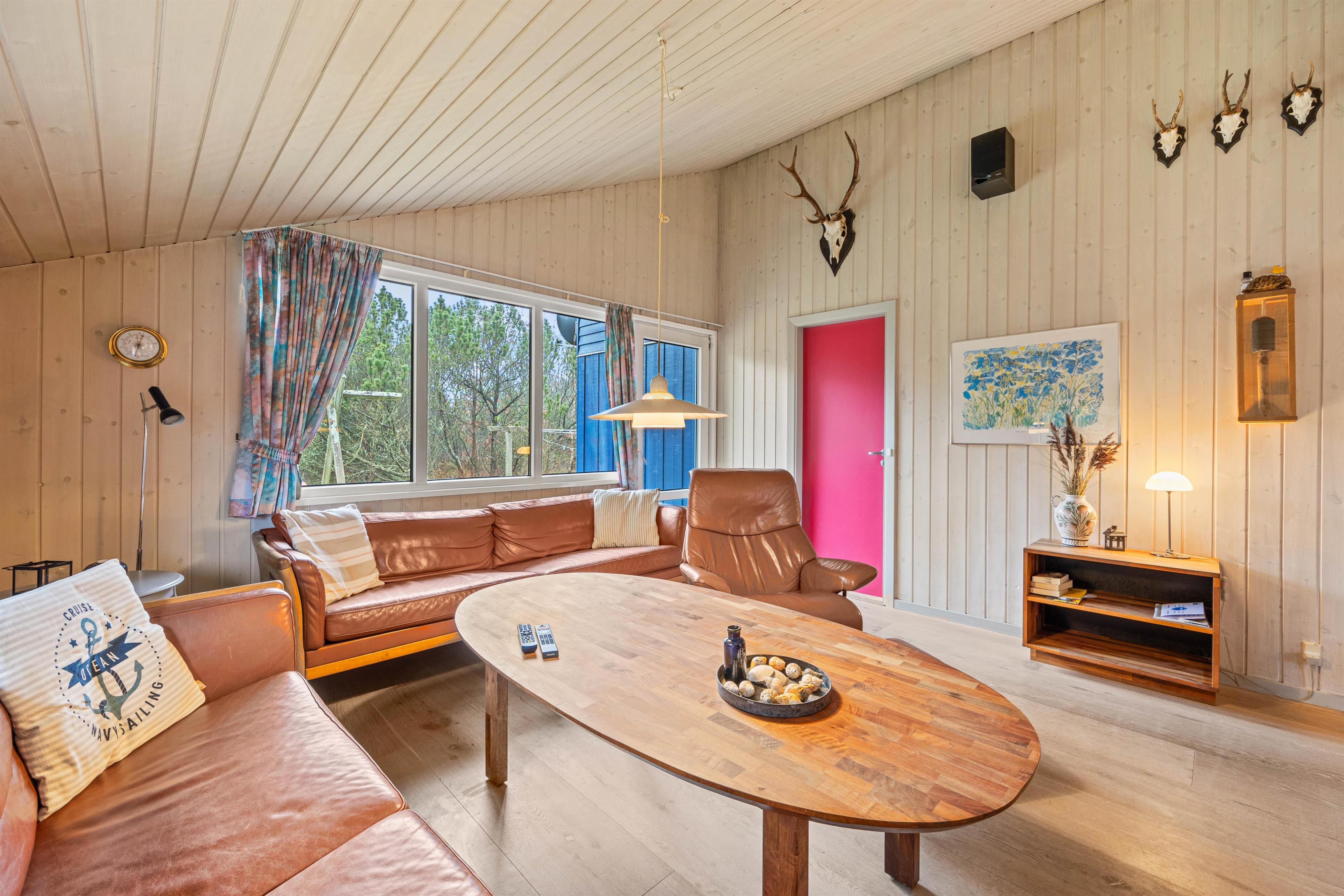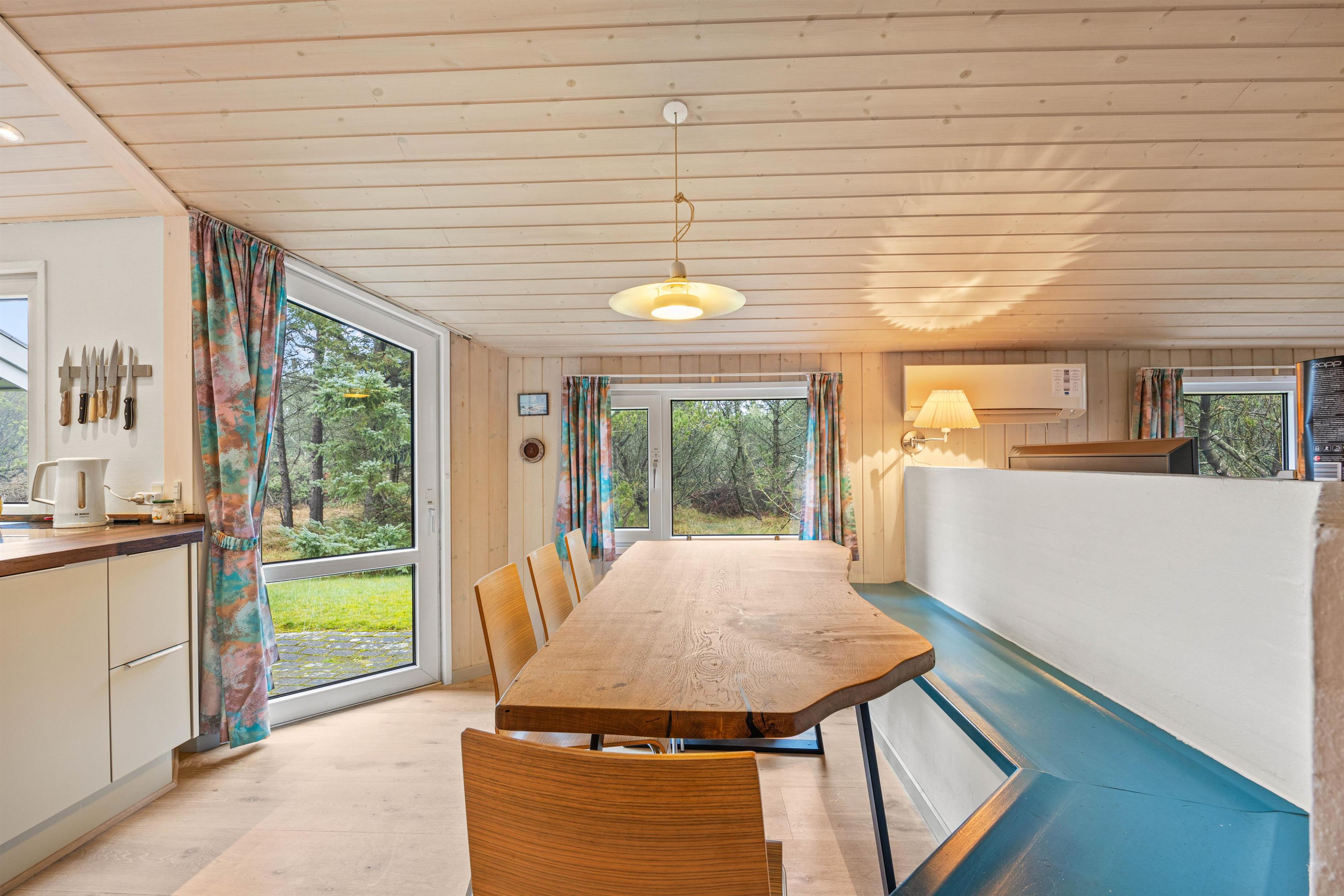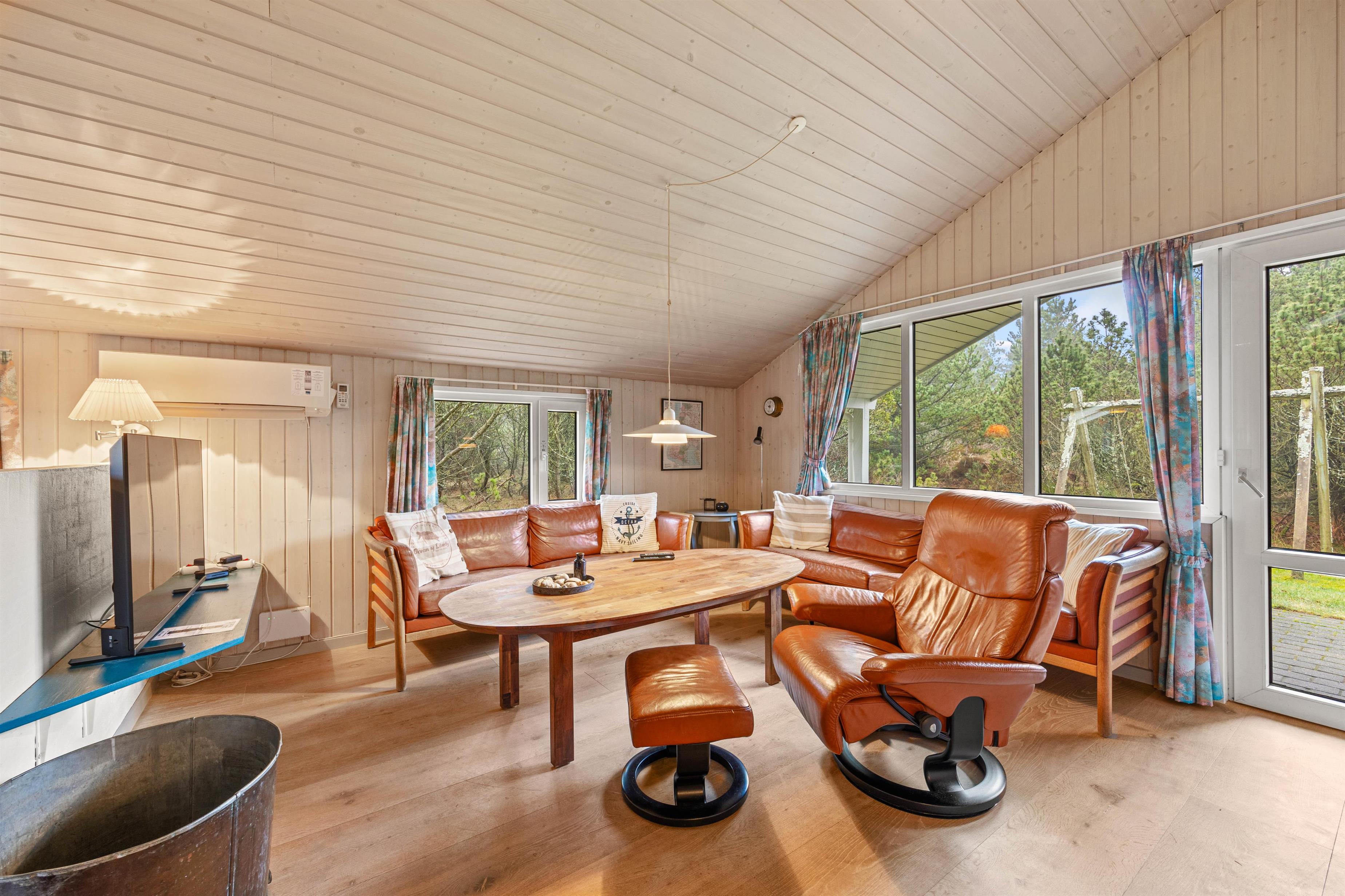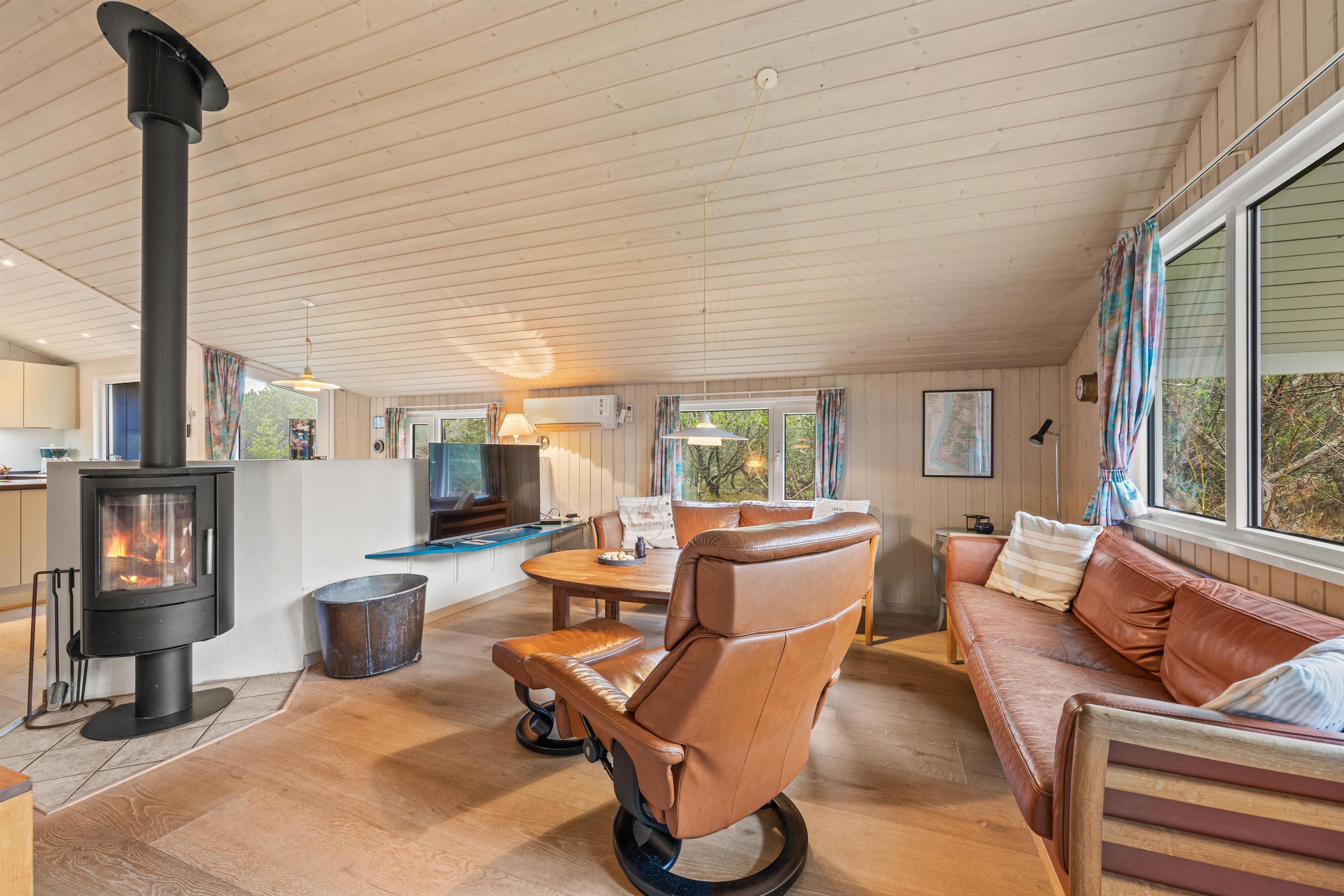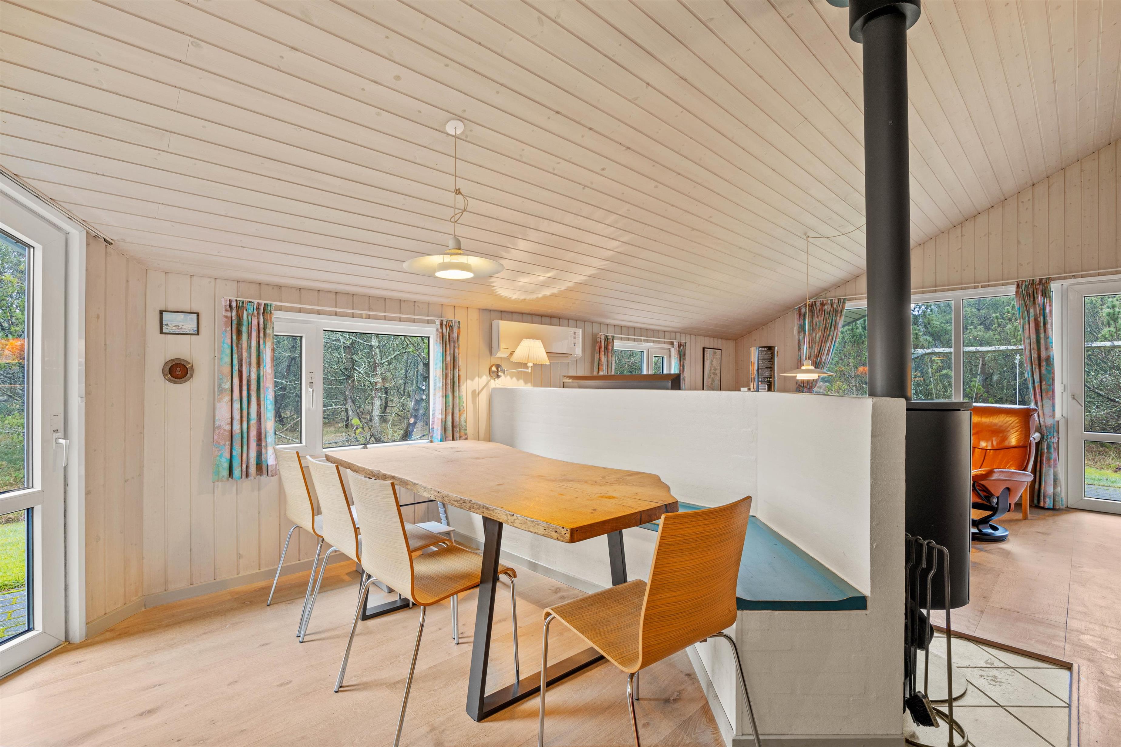 Sommerhusets hjerte er det skønne alrum, der inviterer til mange hyggelige feriestunder for hele ferieflokken. Her kan I samles til lækre måltider eller sjove spil omkring spisebordet, eller I kan sætte jer til rette foran tv’et til en god film – via Chromecasten kan I endda streame jeres favoritfilm! I alrummet står brændeovnen for at fuldende den hyggelige feriestemning med sin knitren og varme.