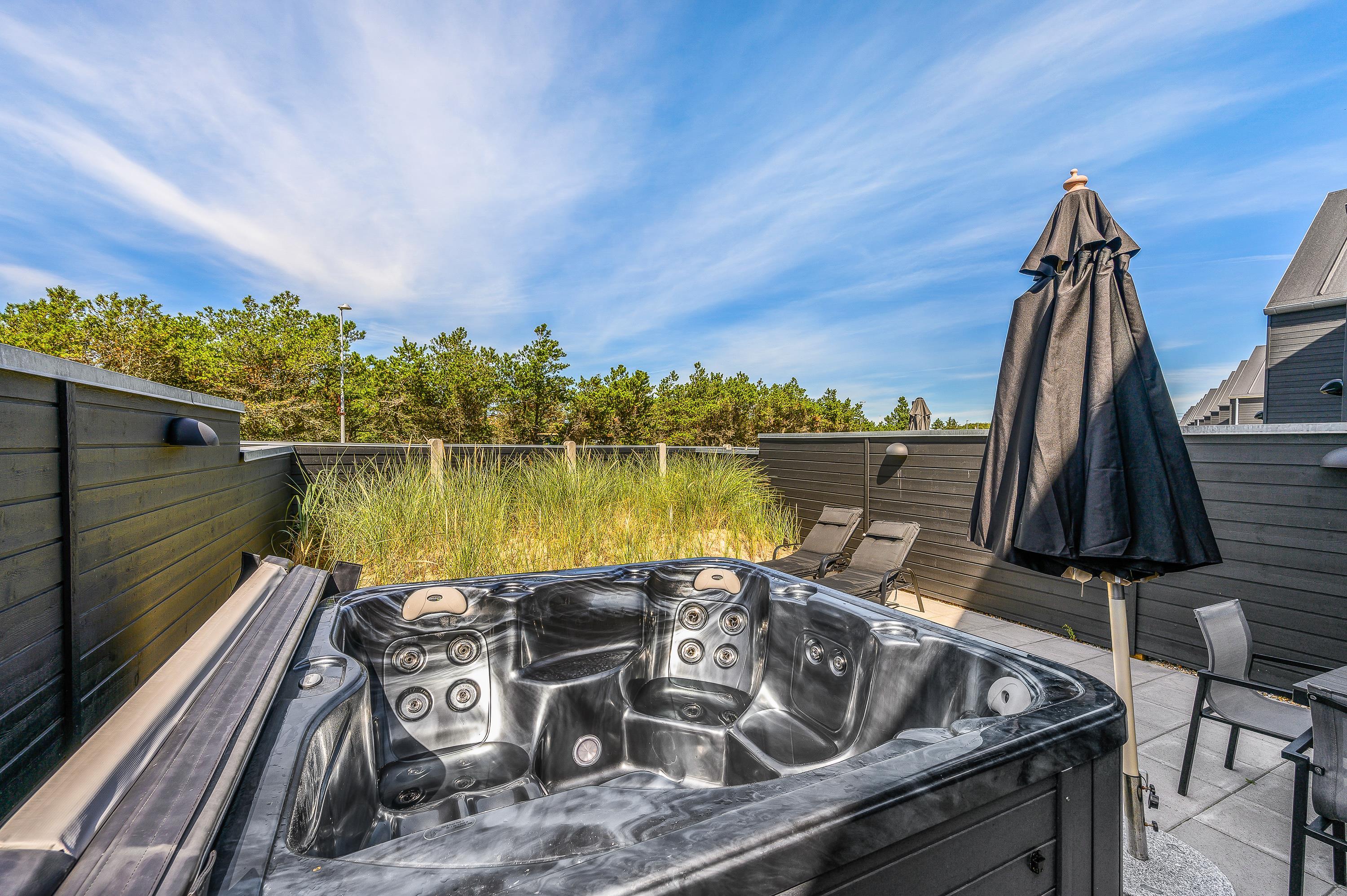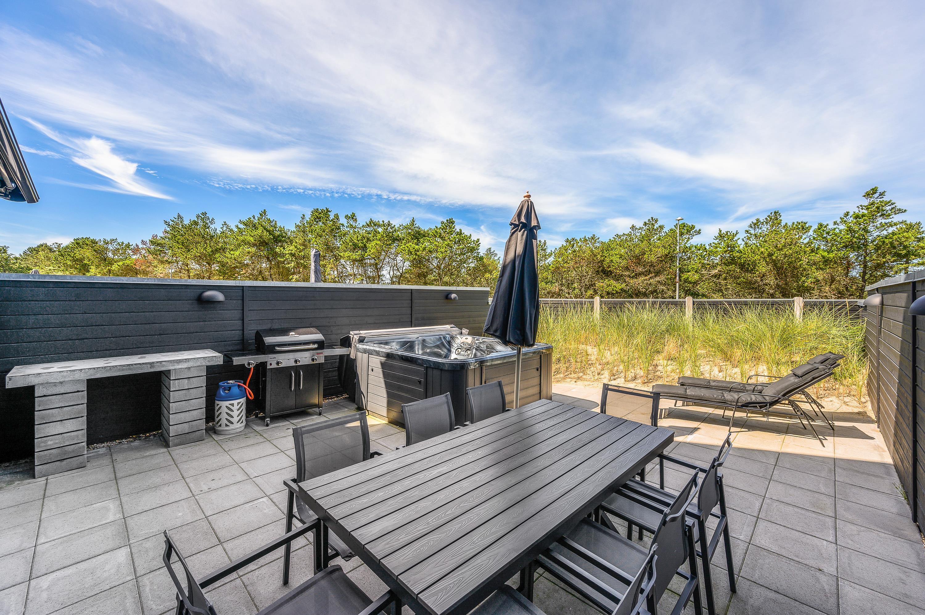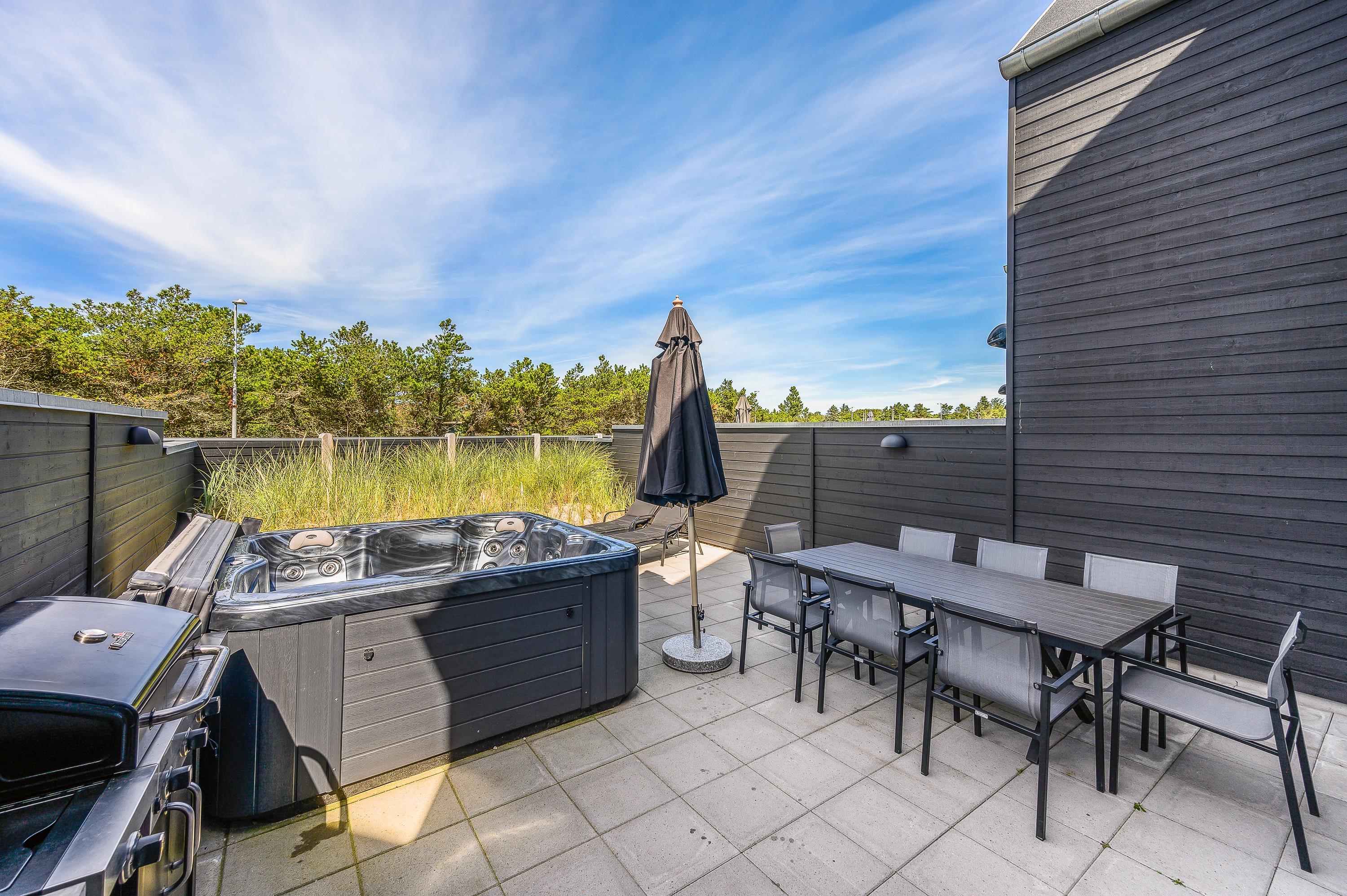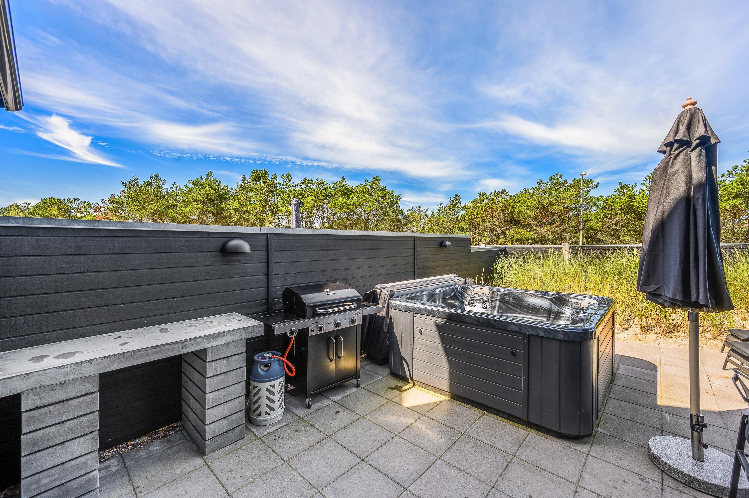 Fra stuen er der udgang til den lukkede terrasse, hvor havemøbler, liggestole og en god gasgrill står klar, så I rigtig kan nyde de solrige dage. Terrassen gemmer desuden på endnu en lækker wellnessfacilitet, nemlig et udendørs spabad. Markisen må ikke benyttes. Et varmt boblebad under åben himmel kan man vel altid bruge, ligegyldigt hvornår på året, man holder ferie?