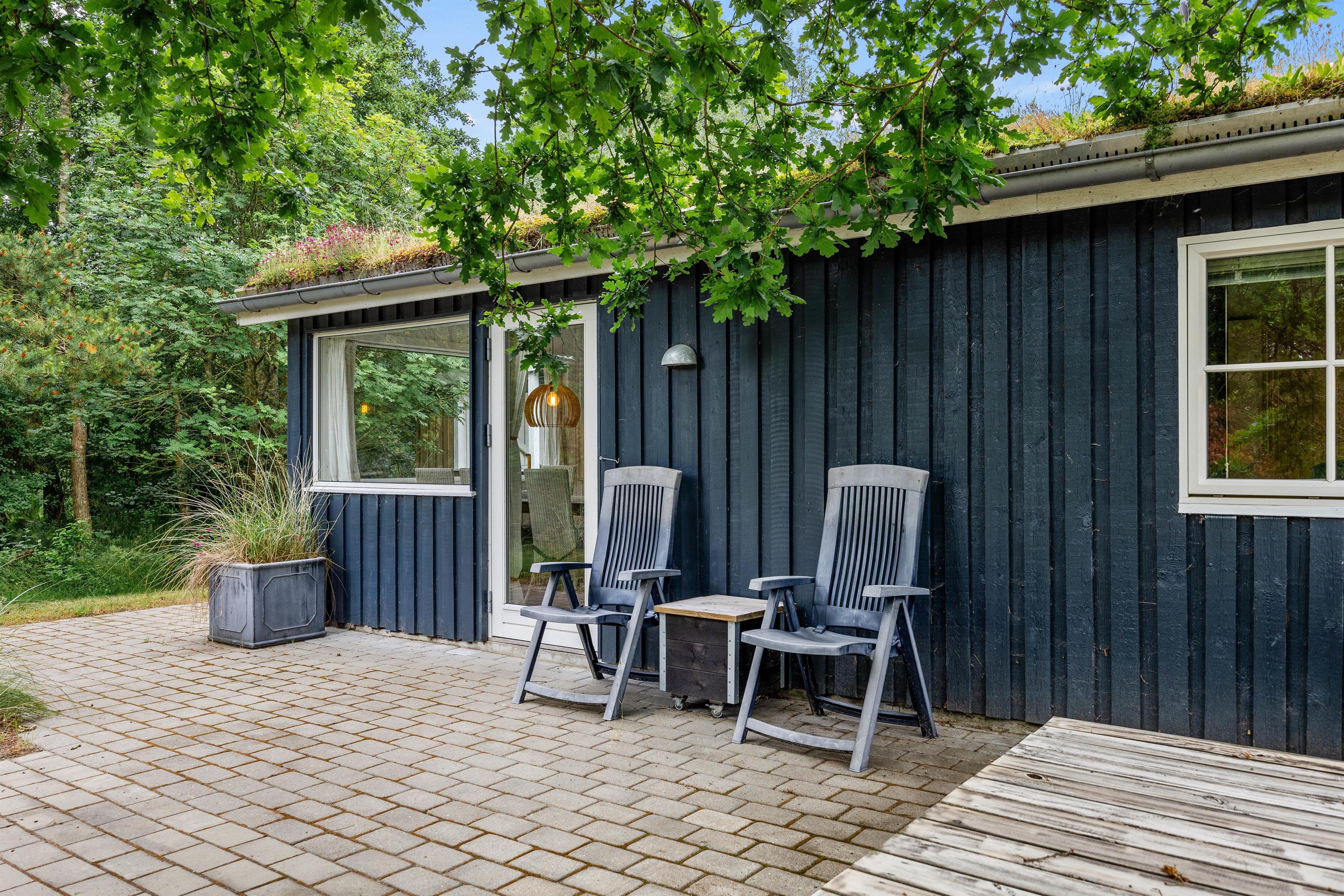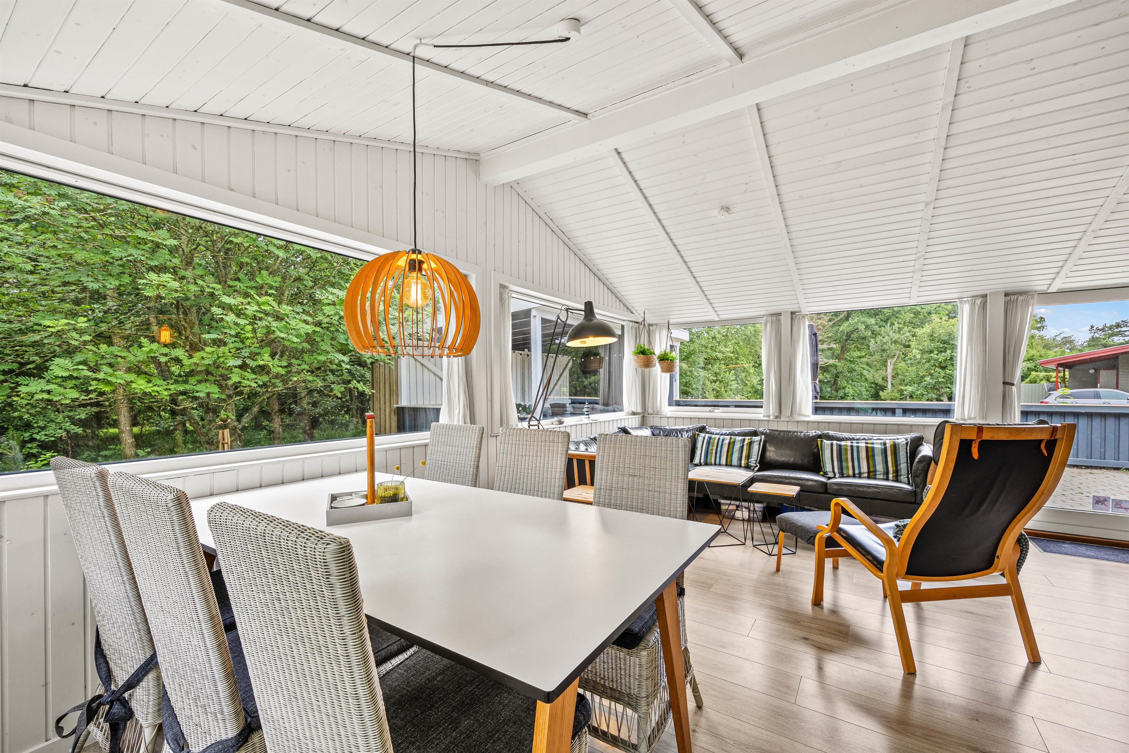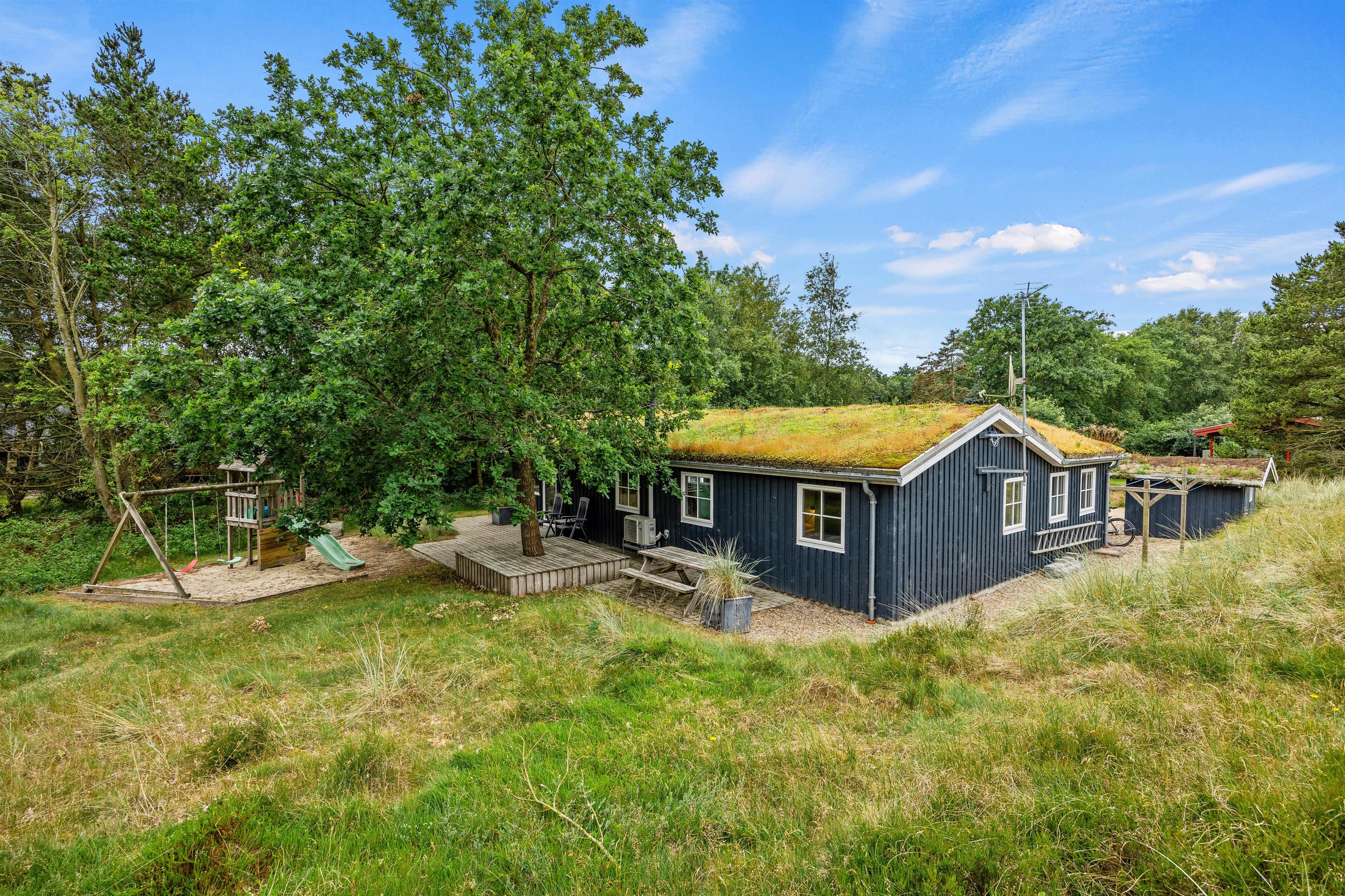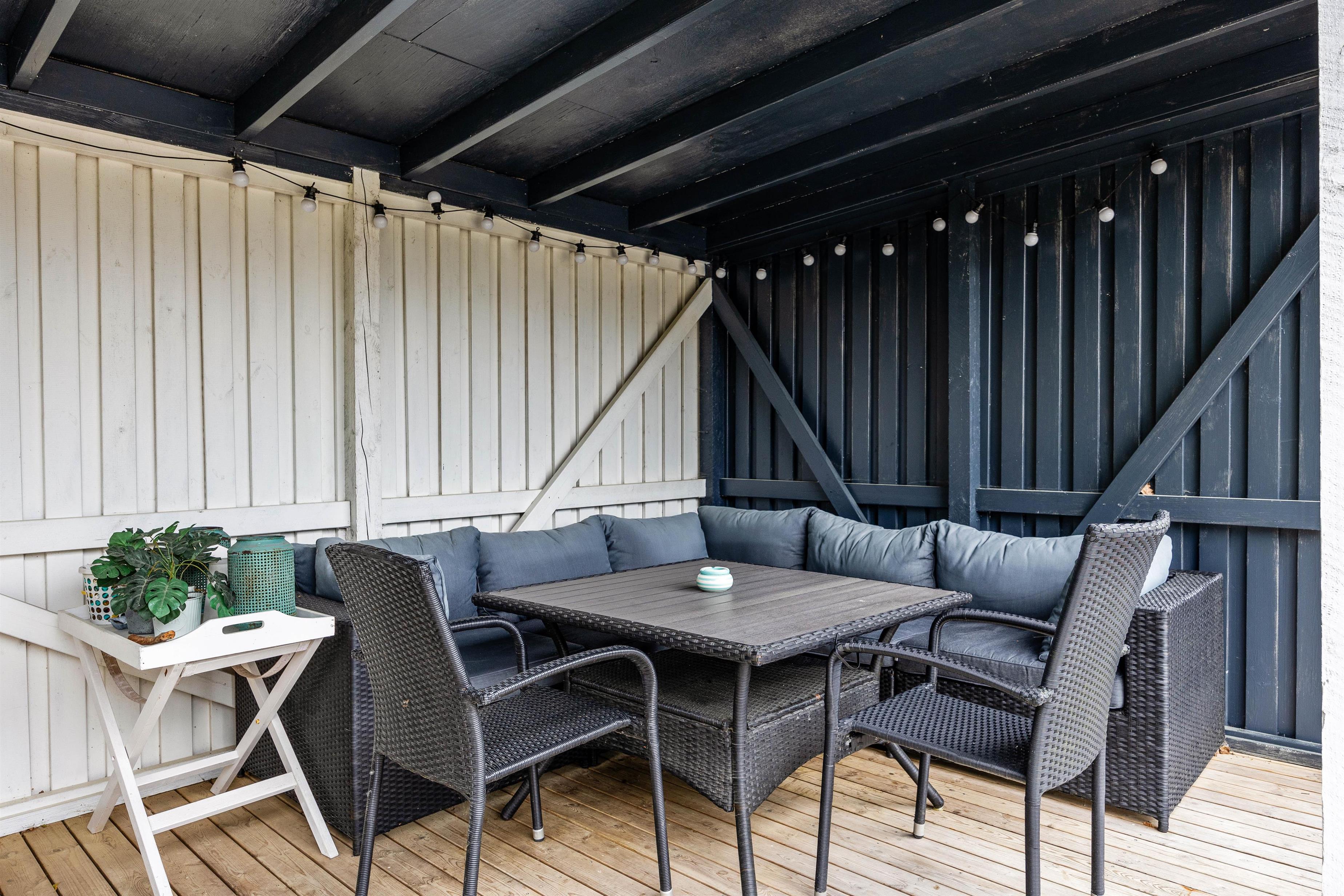 Den åbne og overdækkede terrasse giver mulighed for hyggelige aftener og grillfester med familie og venner, og havemøblerne inviterer til afslapning flere steder rundt om huset, mens børnene leger i sandkassen eller på gyngen. Få en pause fra hverdagen, og skab gode ferieminder i de naturskønne omgivelser i huset med sedum på taget.