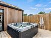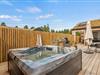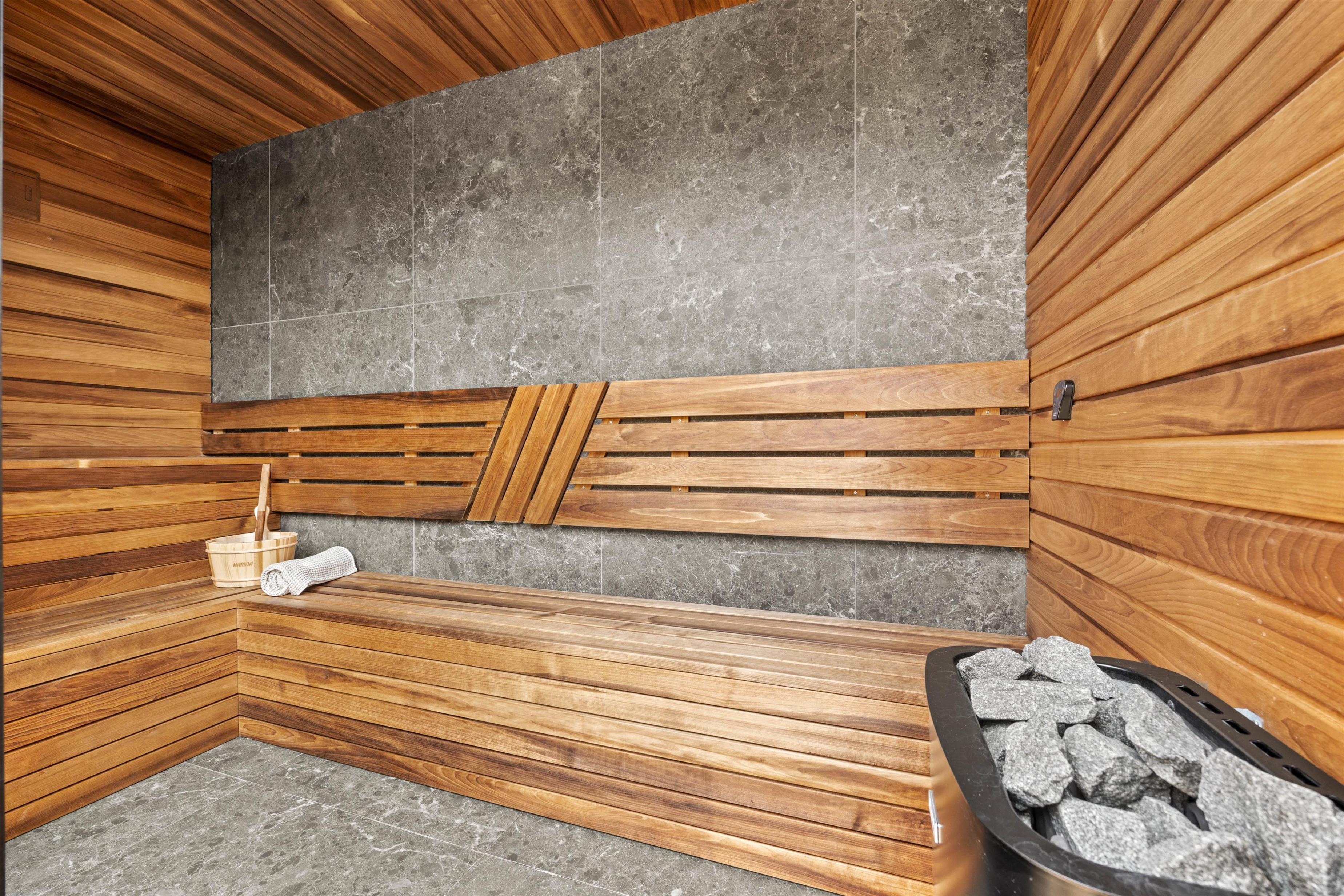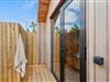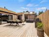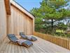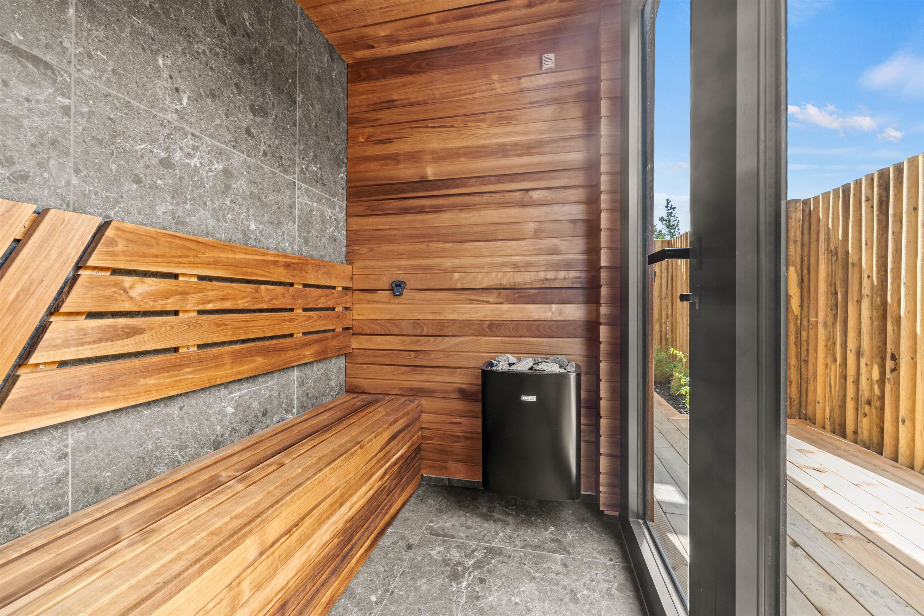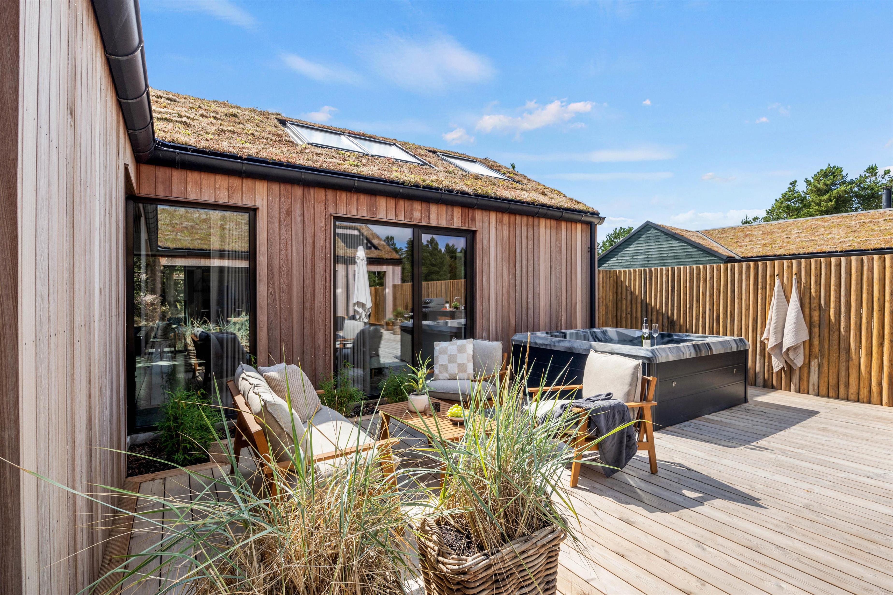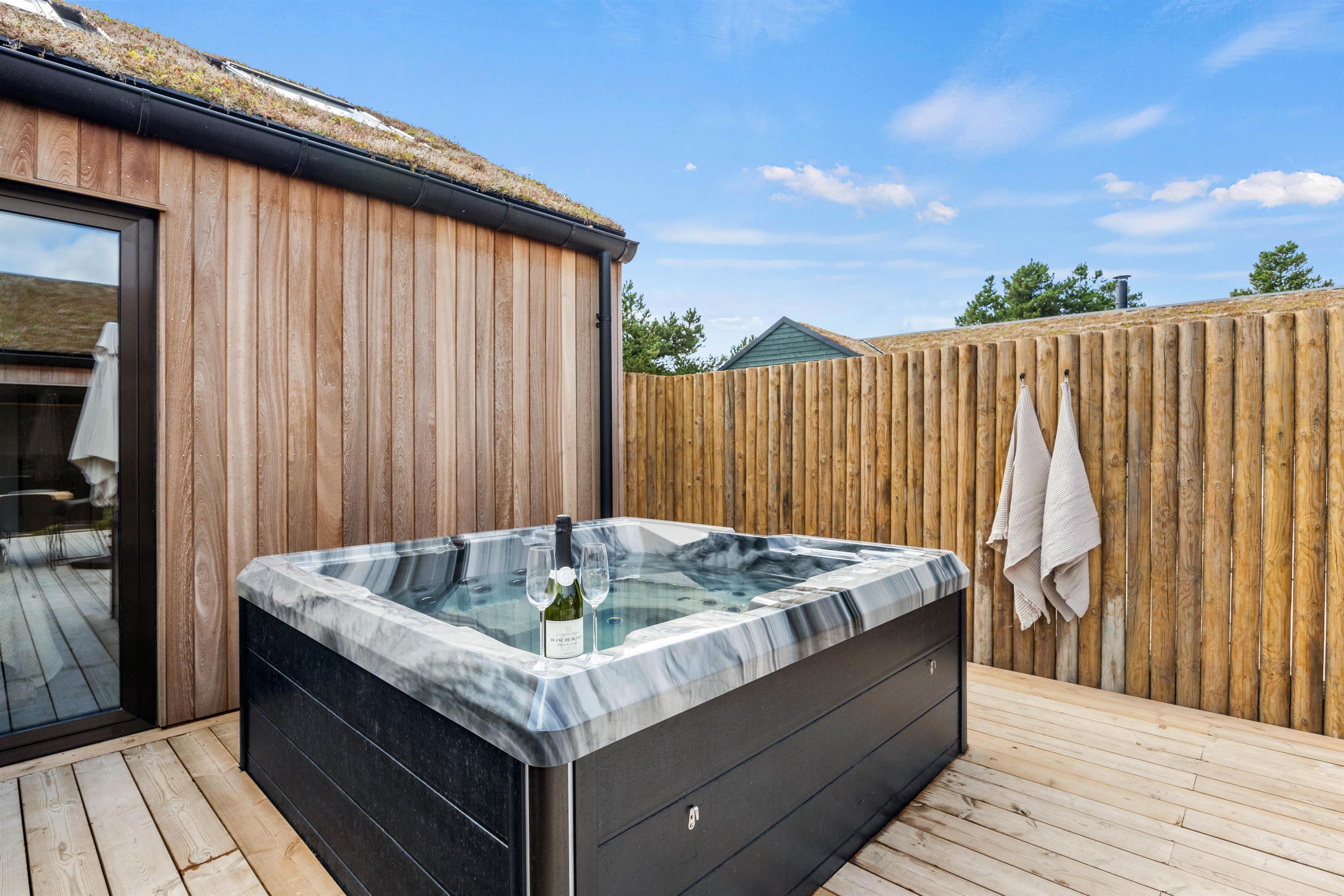 Den store flotte træterrasse er indrettet med spisepladser, liggestole og hygge-loungemøbler, der sammen med den 5-personers udespa og udesaunaen er designet til fælles hygge i det fri. I spaen og saunaen kan der slappes af efter dagens indtryk uanset årstid. Udebruseren er til rådighed fra 1. april til 30. oktober.