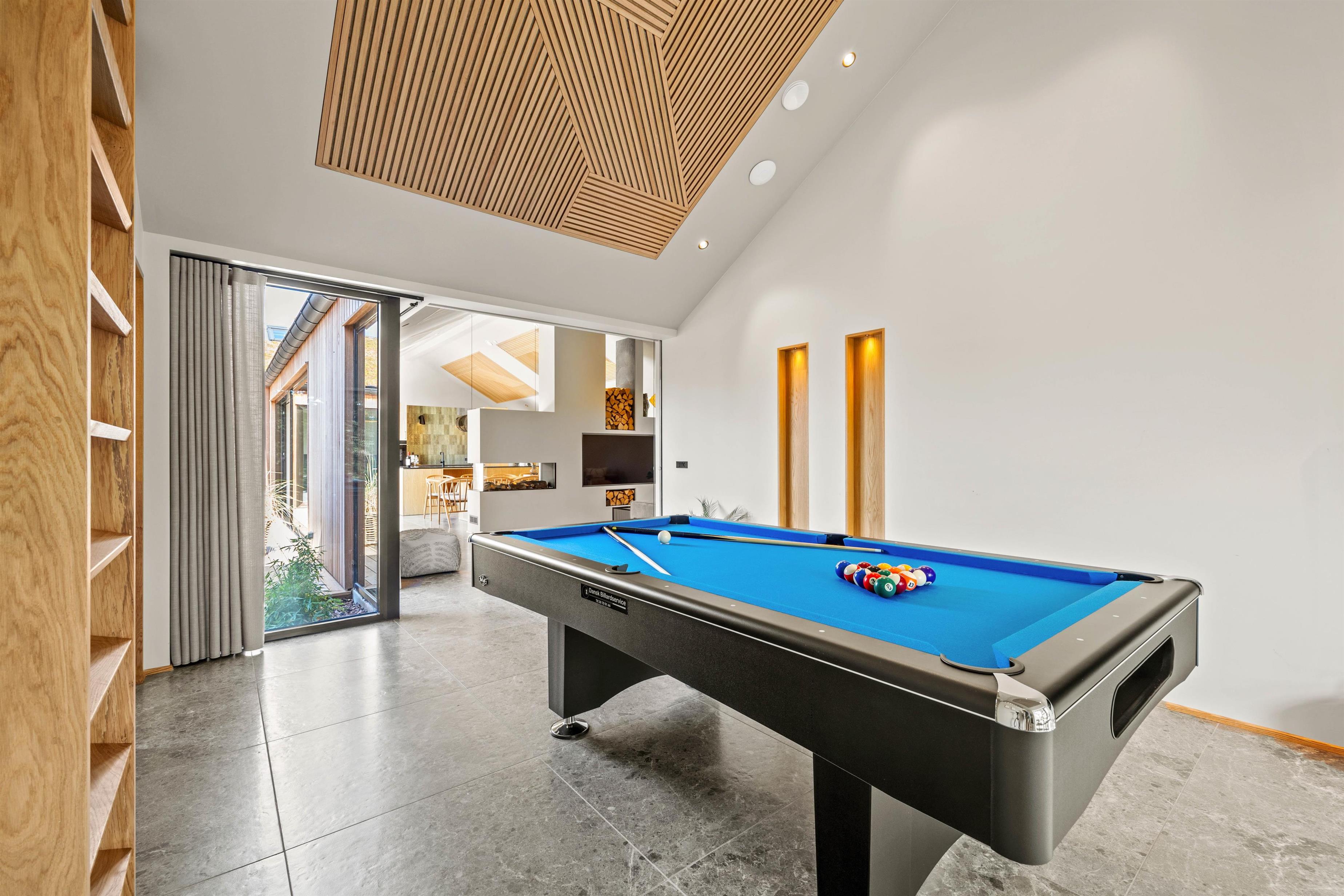 Aktivitetsrummet med billard ligger i forlængelse af stuen, så de spillelystne kan udfolde sig og finde feriens mester. Overalt i huset er der gulvvarme under de smukke klinker og det kan anbefales at bruge den energivenlige varmepumpe.