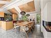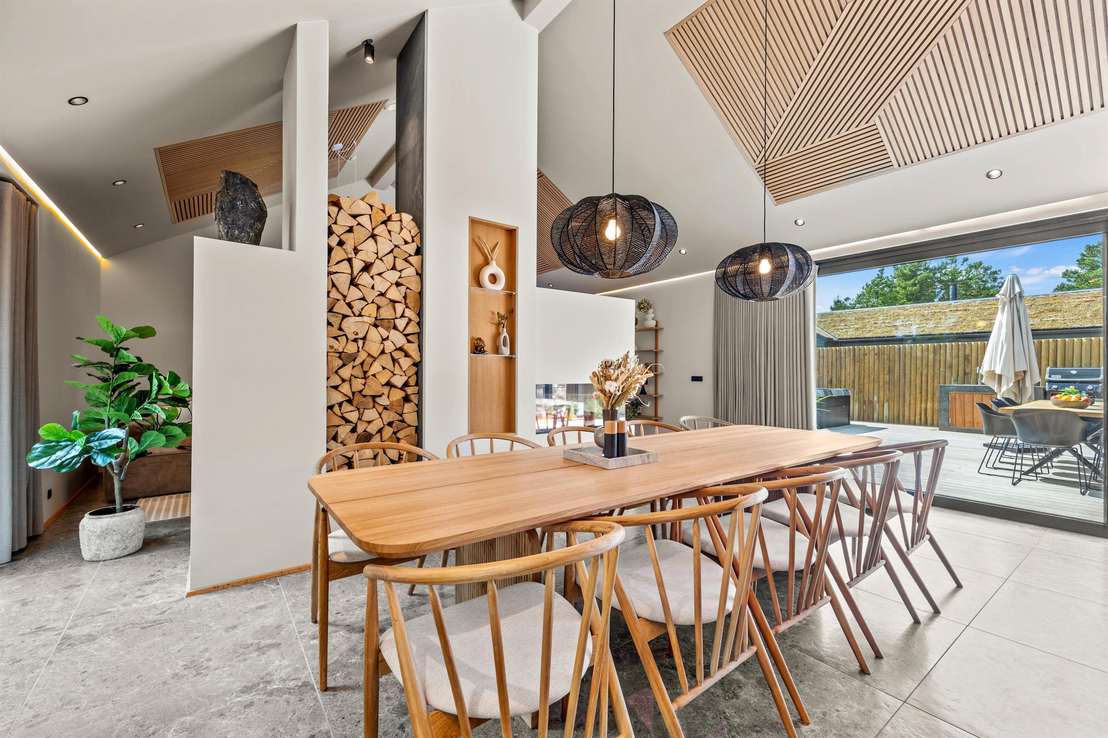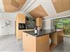 Ved ankomst til huset møder I de lyse og gedigne materialer, der giver en let og lys stemning, som fortsætter gennem hele huset. Lige fra det flotte åbne snedkerkøkken med kogeø, opvaskemaskine, mikroovn, ovn og induktionskogeplade til spisebordet foran pejsen, som i øvrigt også kan nydes i stuen på den anden side af rumadskillelsesmuren.