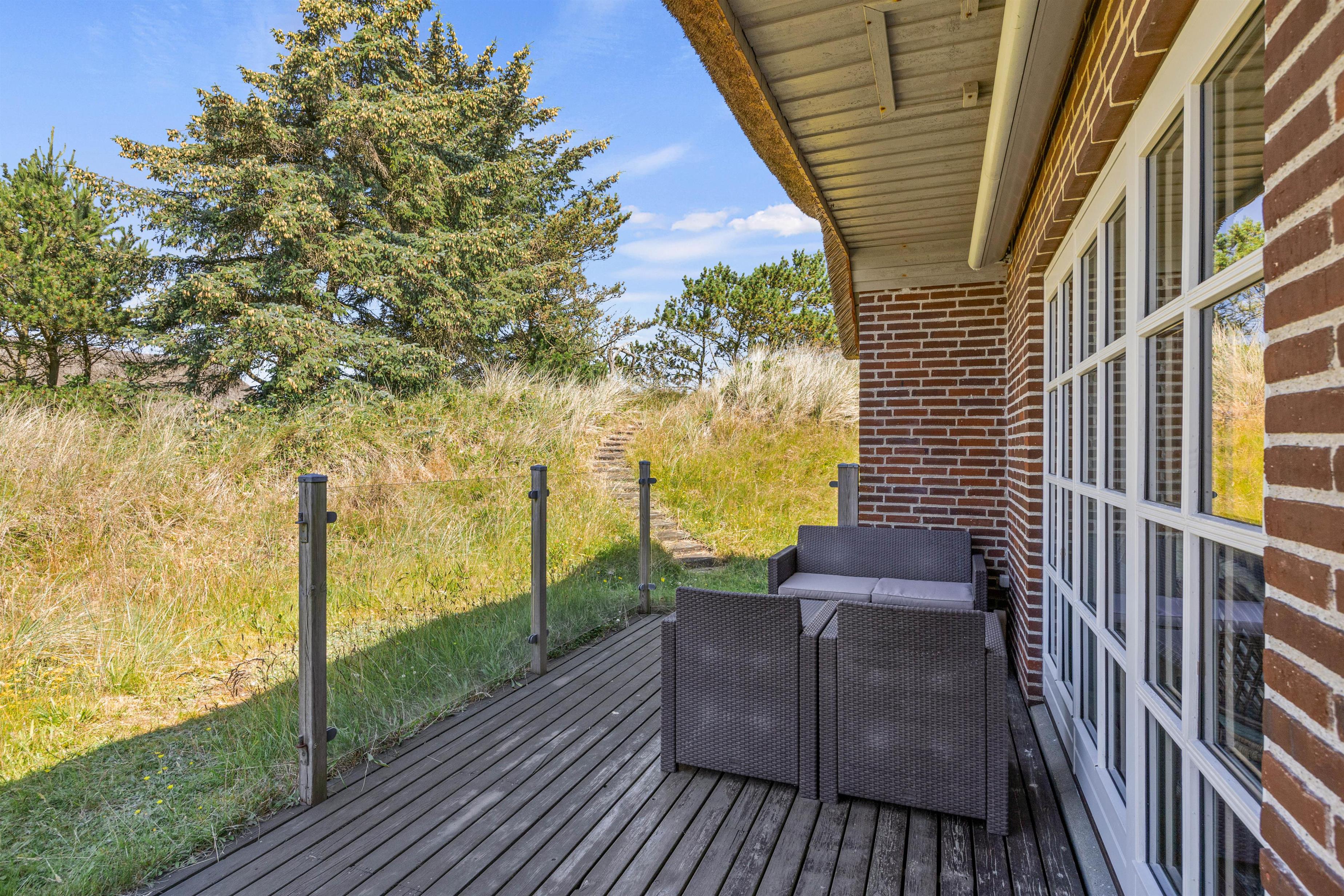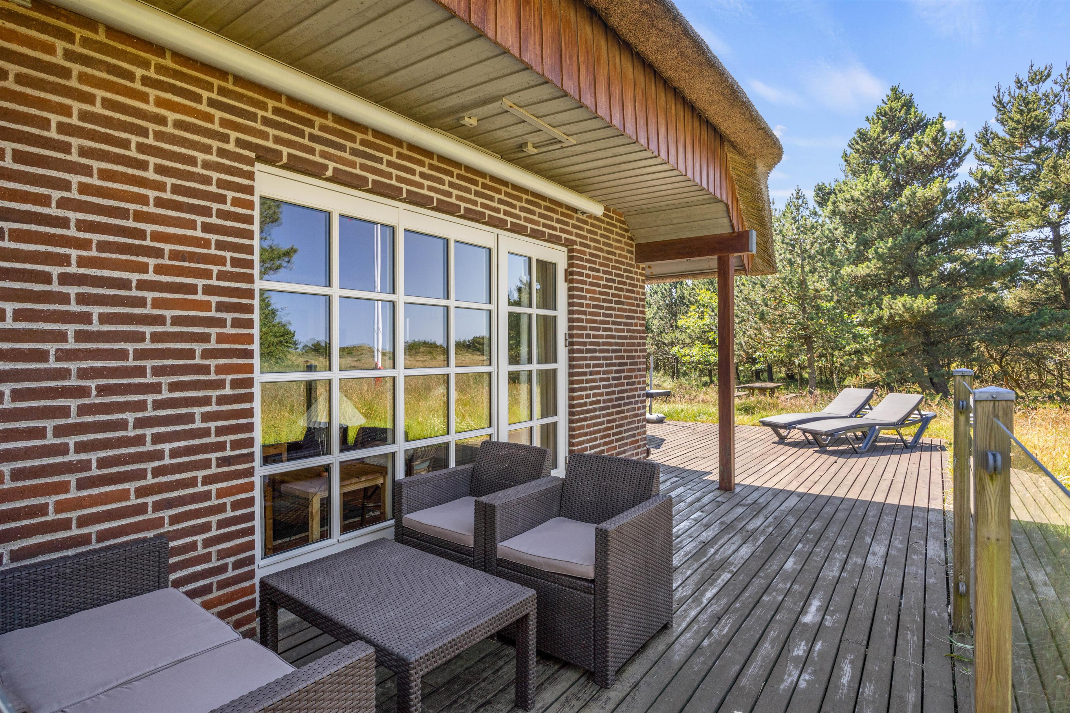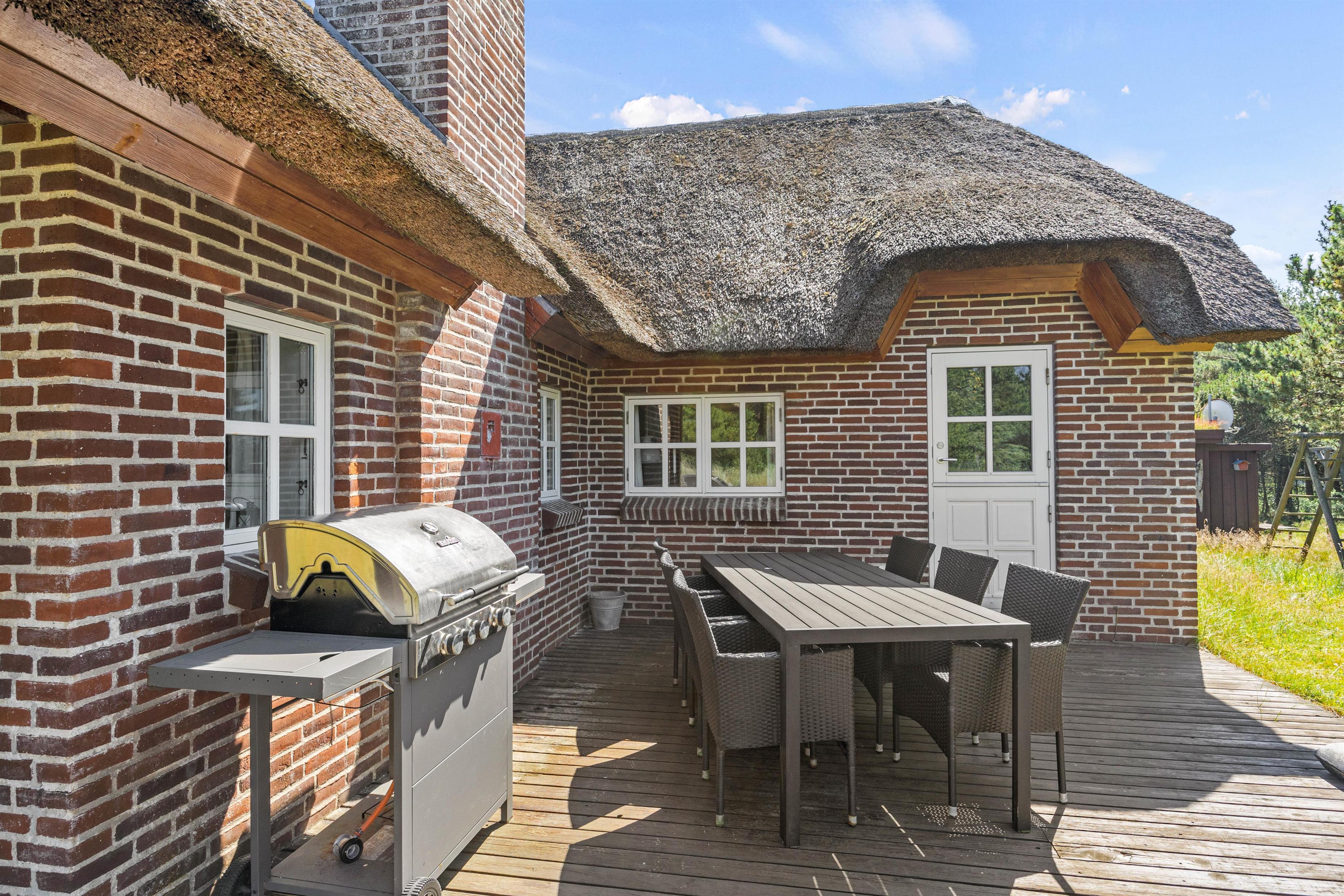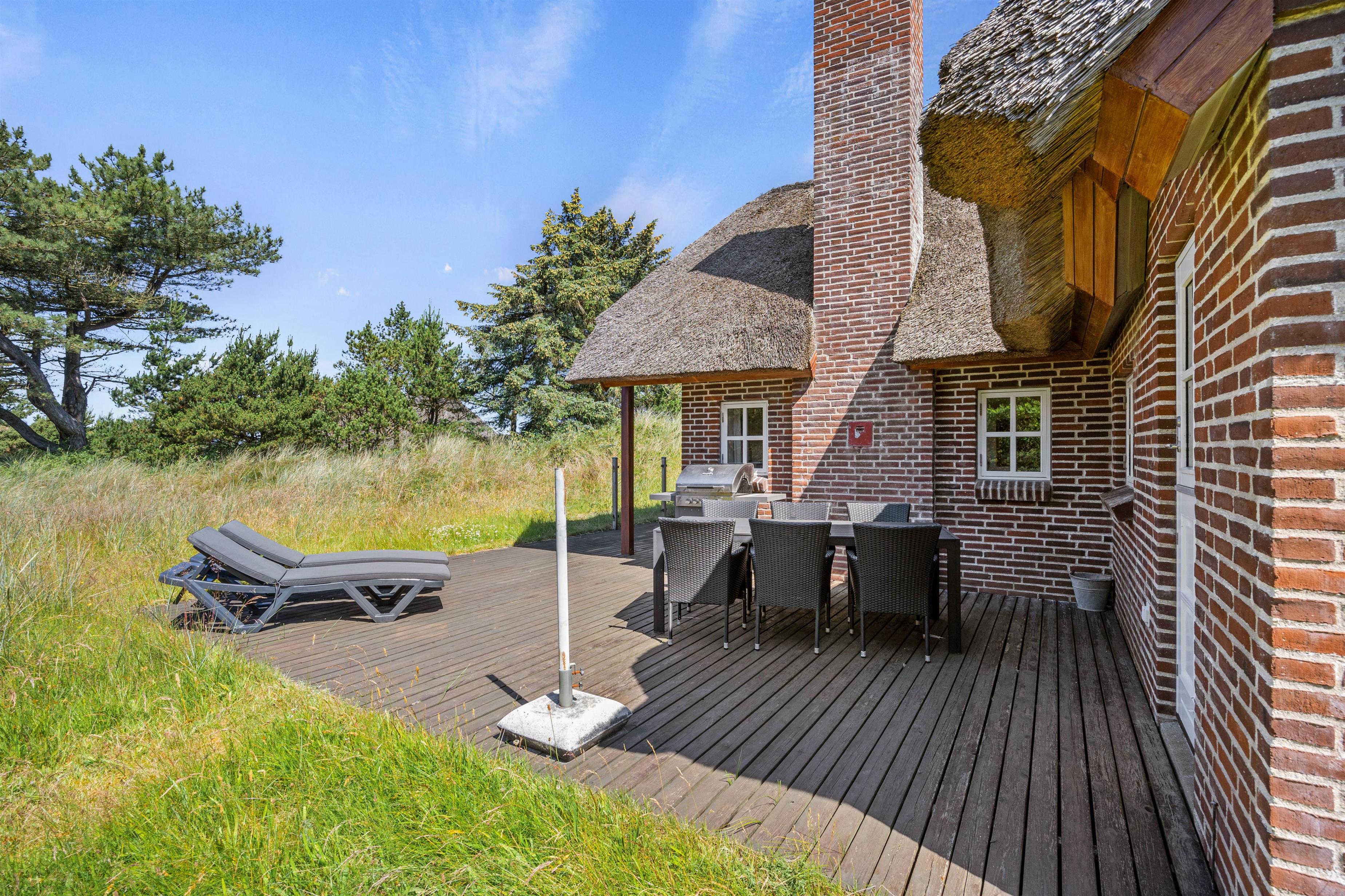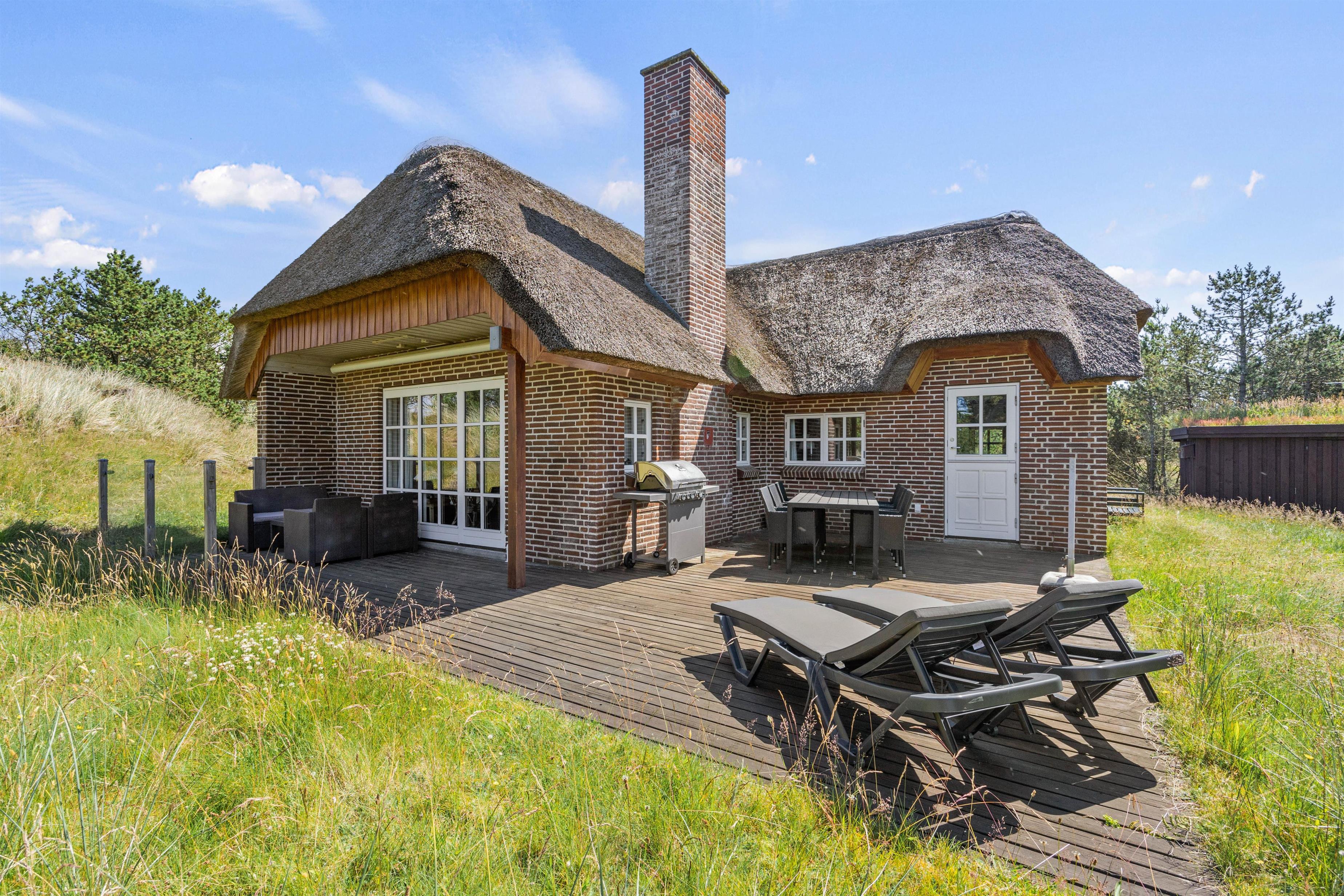 Den 400 kvm store klitgrund omgiver sommerhuset og har plads til afslapning i den friske havluft. Den åbne terrasse er udstyret med komfortable havemøbler og liggestole, så I kan gøre det hyggeligt med en bog og en lækker drink. En gasgrill står til jeres rådighed, så I kan tilberede velsmagende retter og nyde et lækkert grillmåltid sammen, imens skyggerne bliver lange. Med kun 850 meter til havet, kan I nå en tur til stranden og opleve solnedgangen i Vesterhavet.