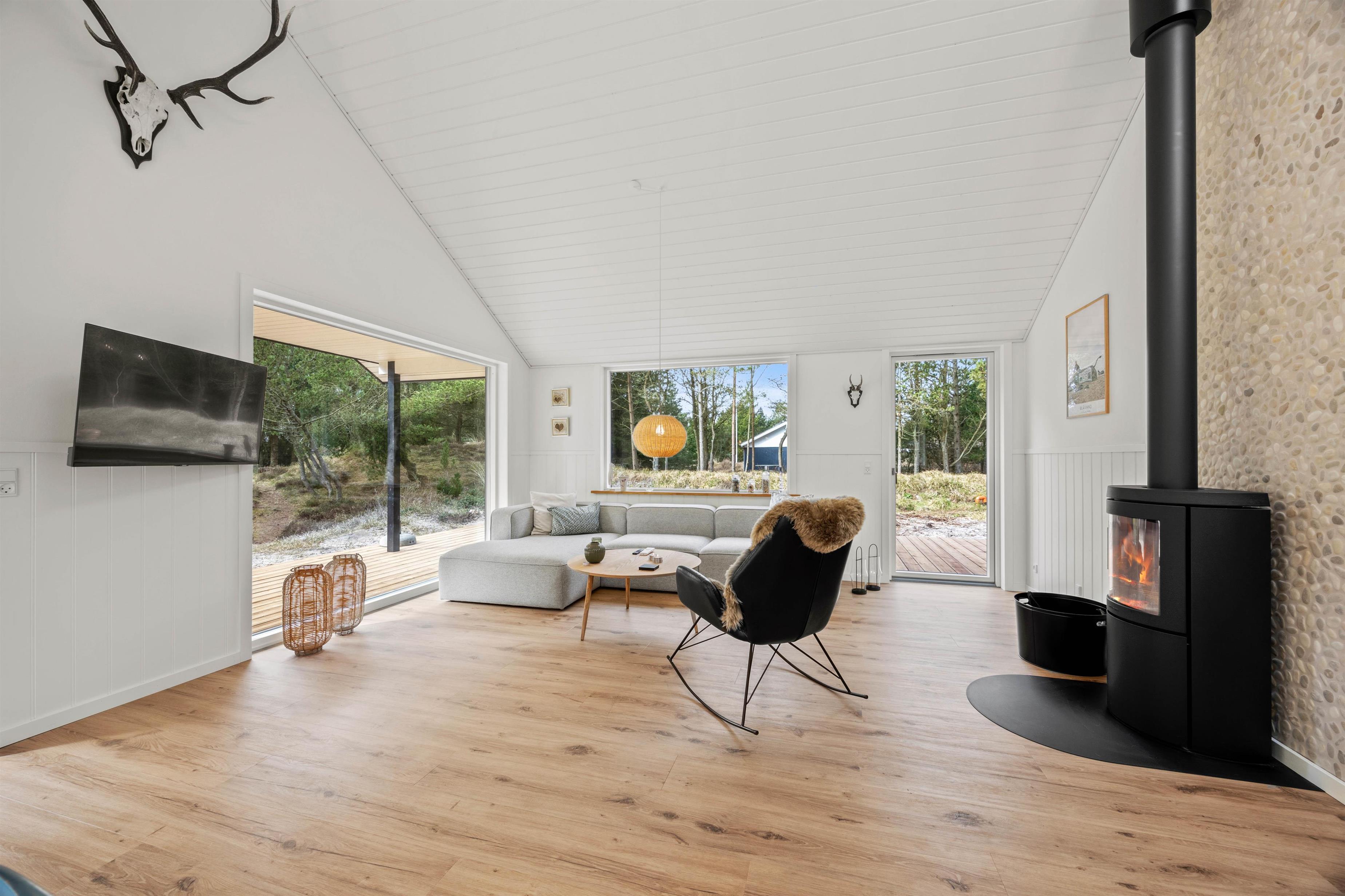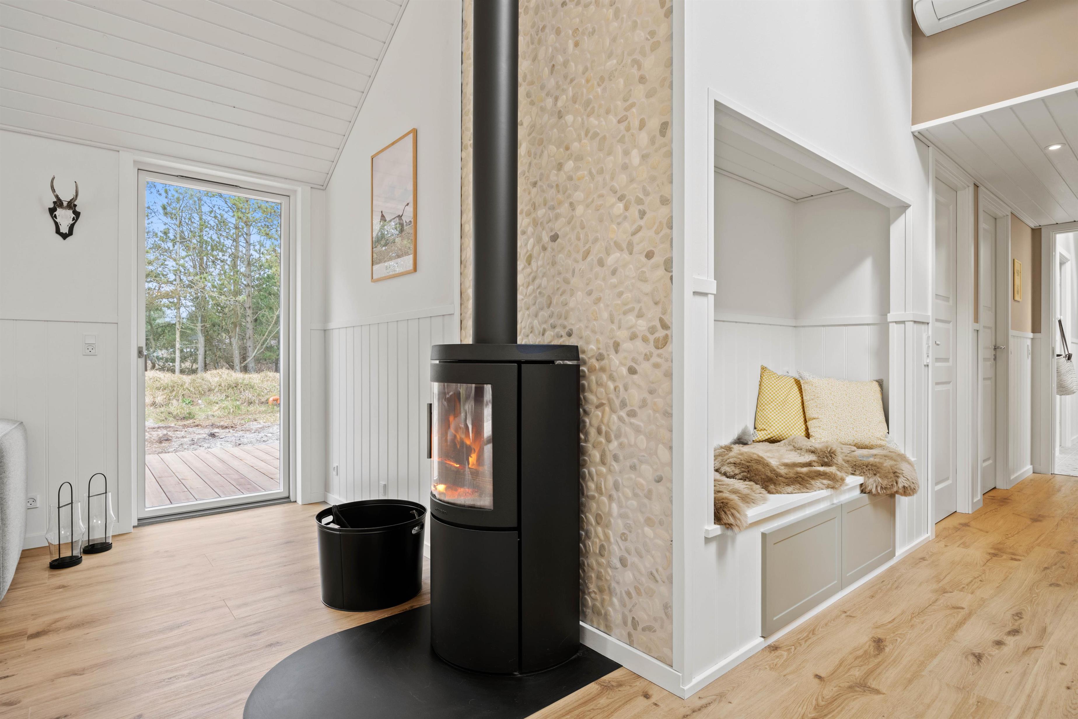 I stuen finder I en brændeovn, der skaber en varm og hyggelig atmosfære, mens den åbne og overdækkede terrasse samt den store klitgrund giver rige muligheder for aktiviteter og afslapning i det fri. Bemærk, at der også er en udebruser til rådighed fra 1. april til 31. oktober.