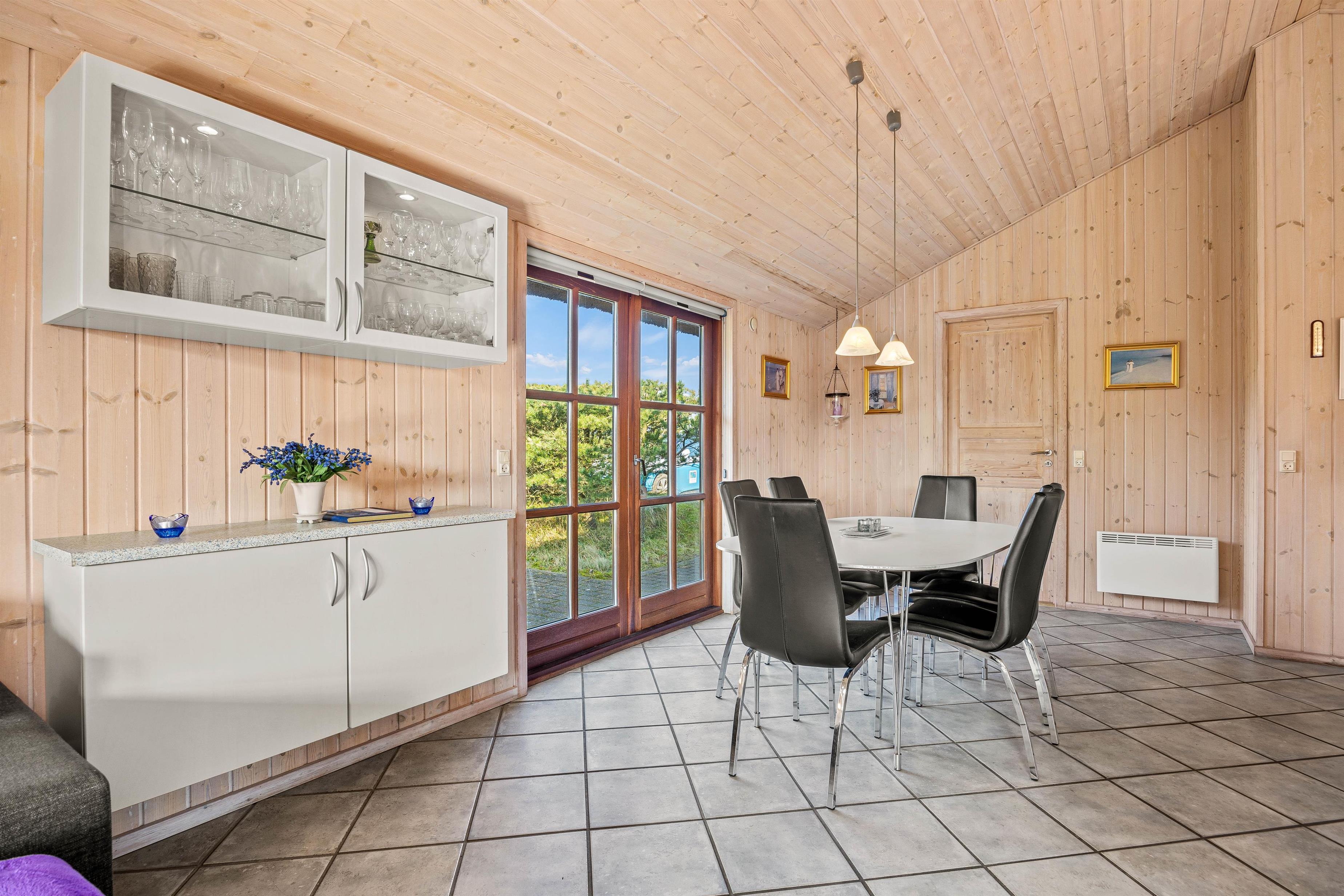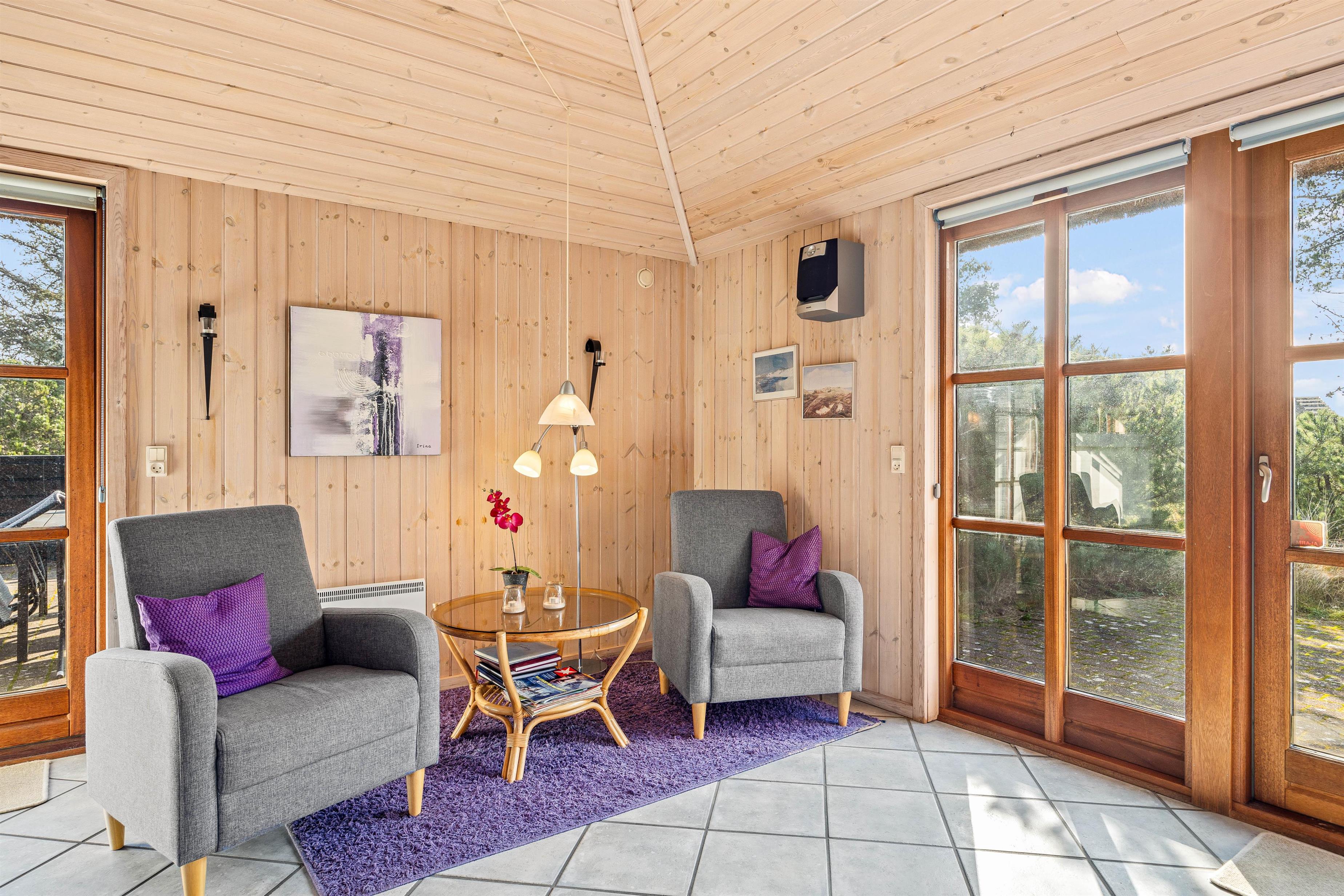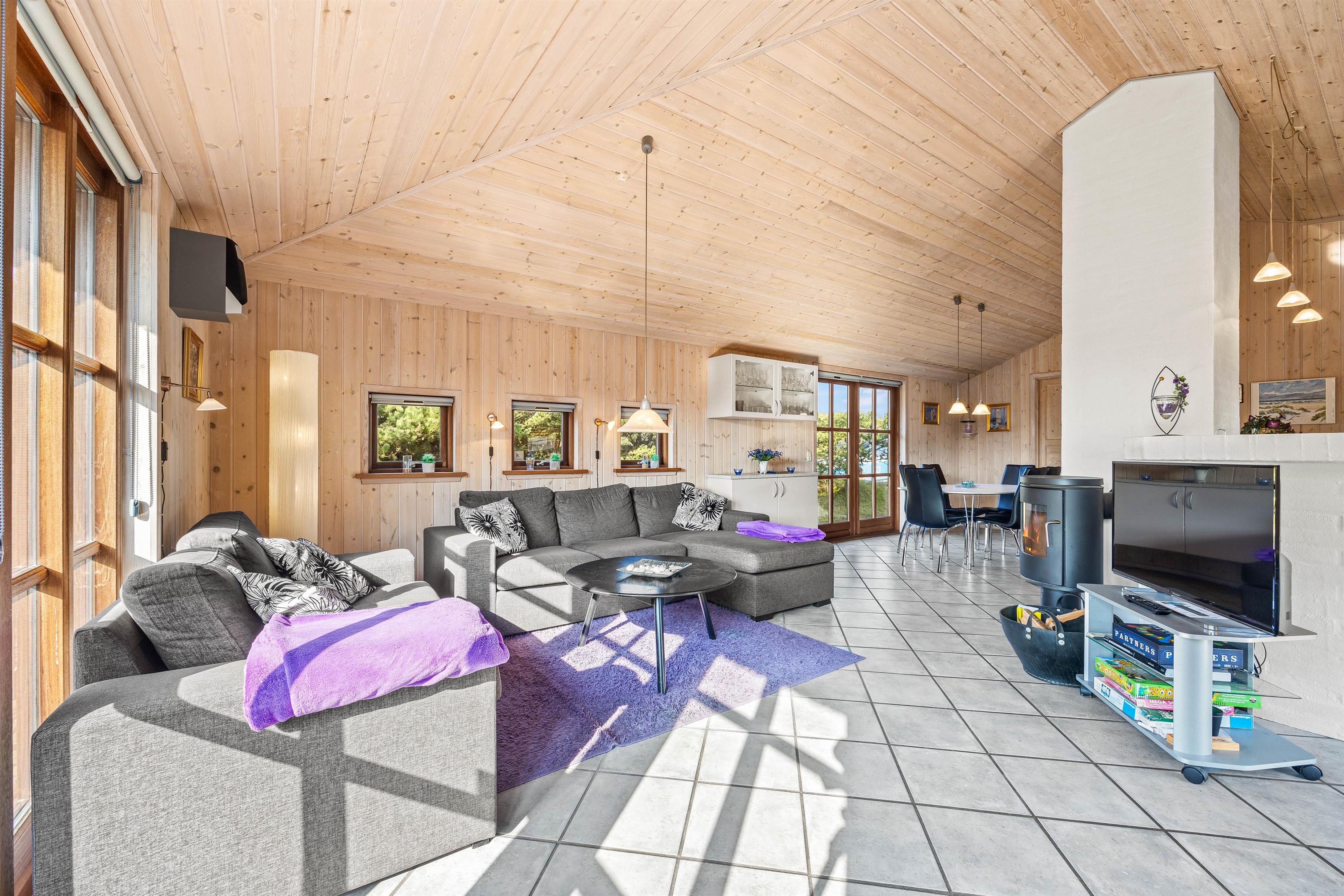 I stueafdelingen lokker de behagelige sofaer foran brændeovnen til en hyggelig fjernsynsaften, og huset byder også på en hyggekrog, hvor læseheste kan smække benene op og slappe af. Det lyse klinkegulv med gulvvarme og de mange vinduer giver en let og lys stemning i det 102 m2 skønne sommerhus.