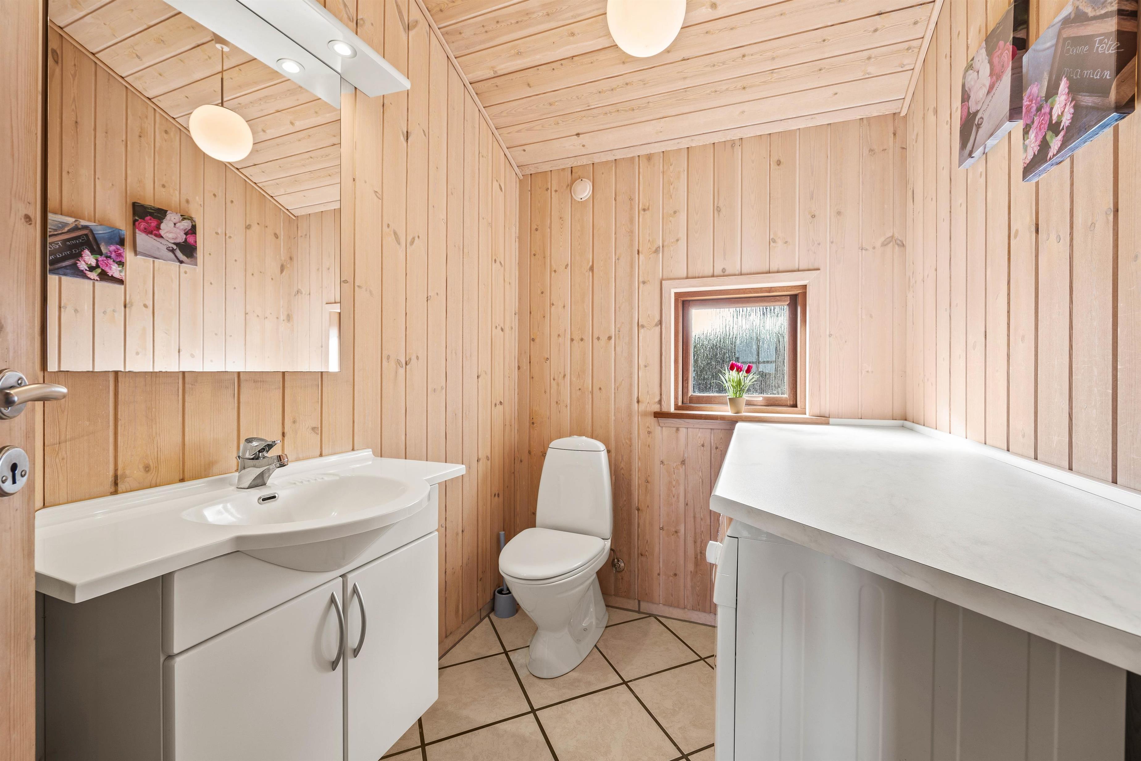 Straks I kommer ind i entreen, hvor der god plads til sko og overtøj, vil I føle jer hjemme. Her er adgang til 2 af husets 3 soveværelser og det store lækre badeværelse med 2-personers spa og sauna. Der er også et gæstetoilet, hvor der desuden er vaskemaskine og tørretumbler til jeres rådighed.