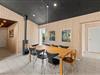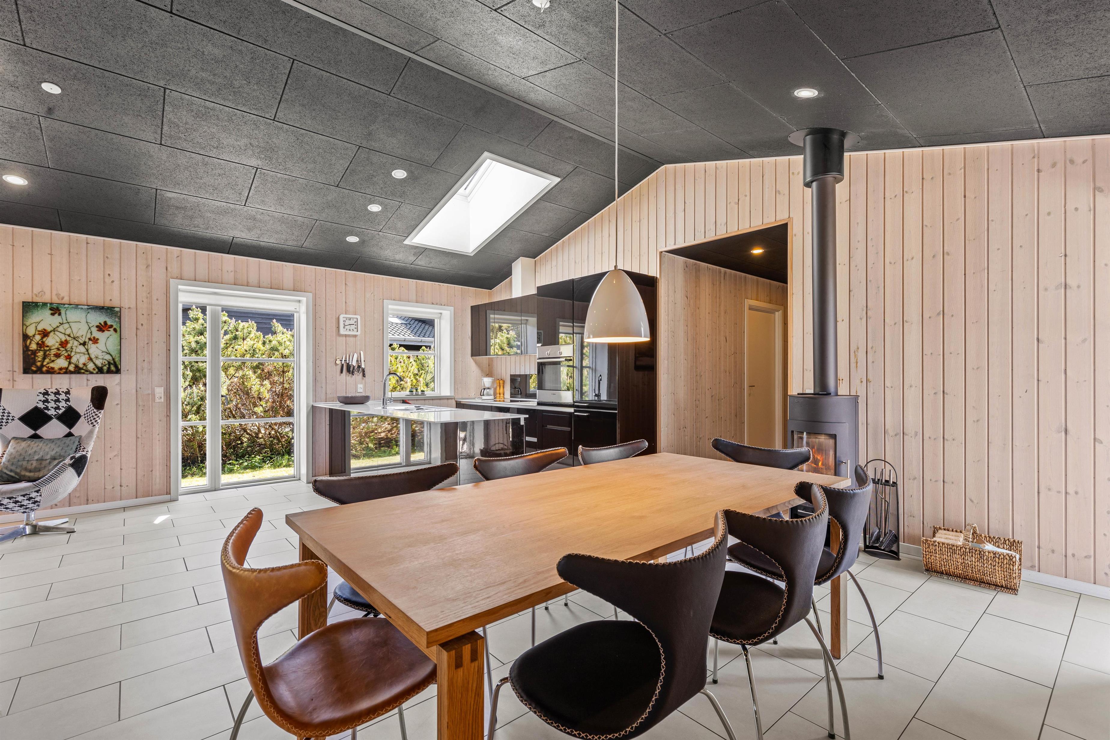 I kan også slappe af foran fjernsynet i opholdsrummet, hvor køkken, stue og spiseafdeling er samlet. Det store rum med højt til loftet er perfekt til enhver hyggelig stund med film, spil og god mad. Den hyggelige brændeovn sørger for, at stemningen er i top.