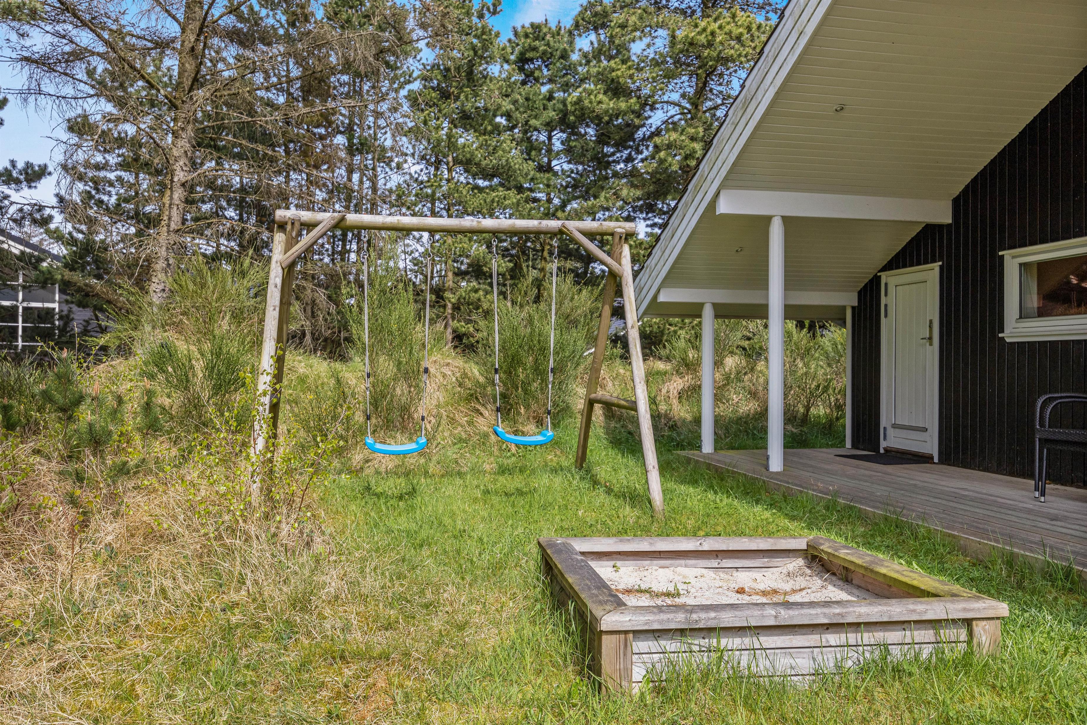 Beskyttet grund med træterrasse, sandkasse og gynge