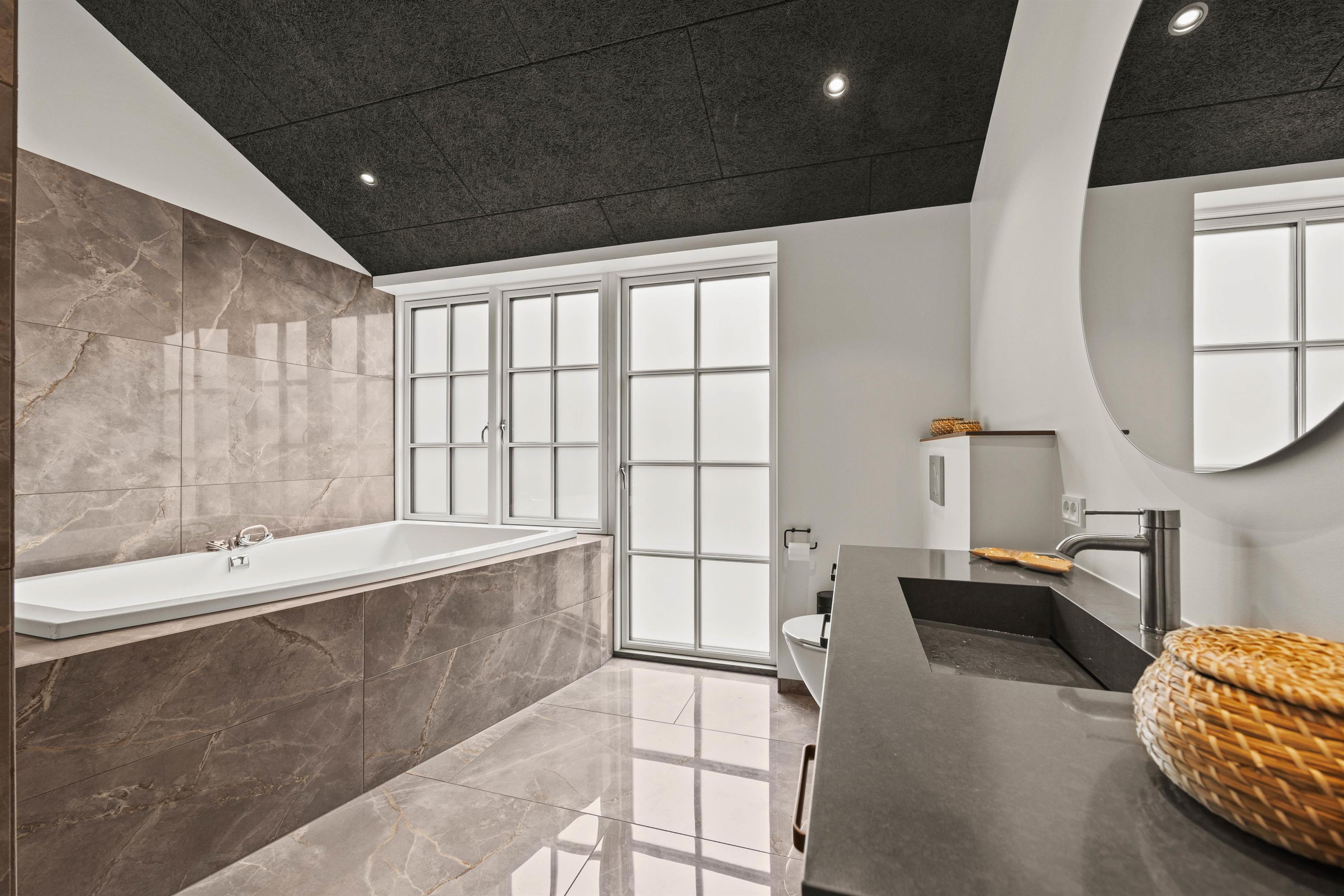 Soveværelserne og opholdsstuen har trægulve med gulvvarme. De to badeværelser er fuldt udstyrede og er ligesom alle de andre rum indrettet med materialer af høj kvalitet. Der står også et badekar til jeres rådighed.