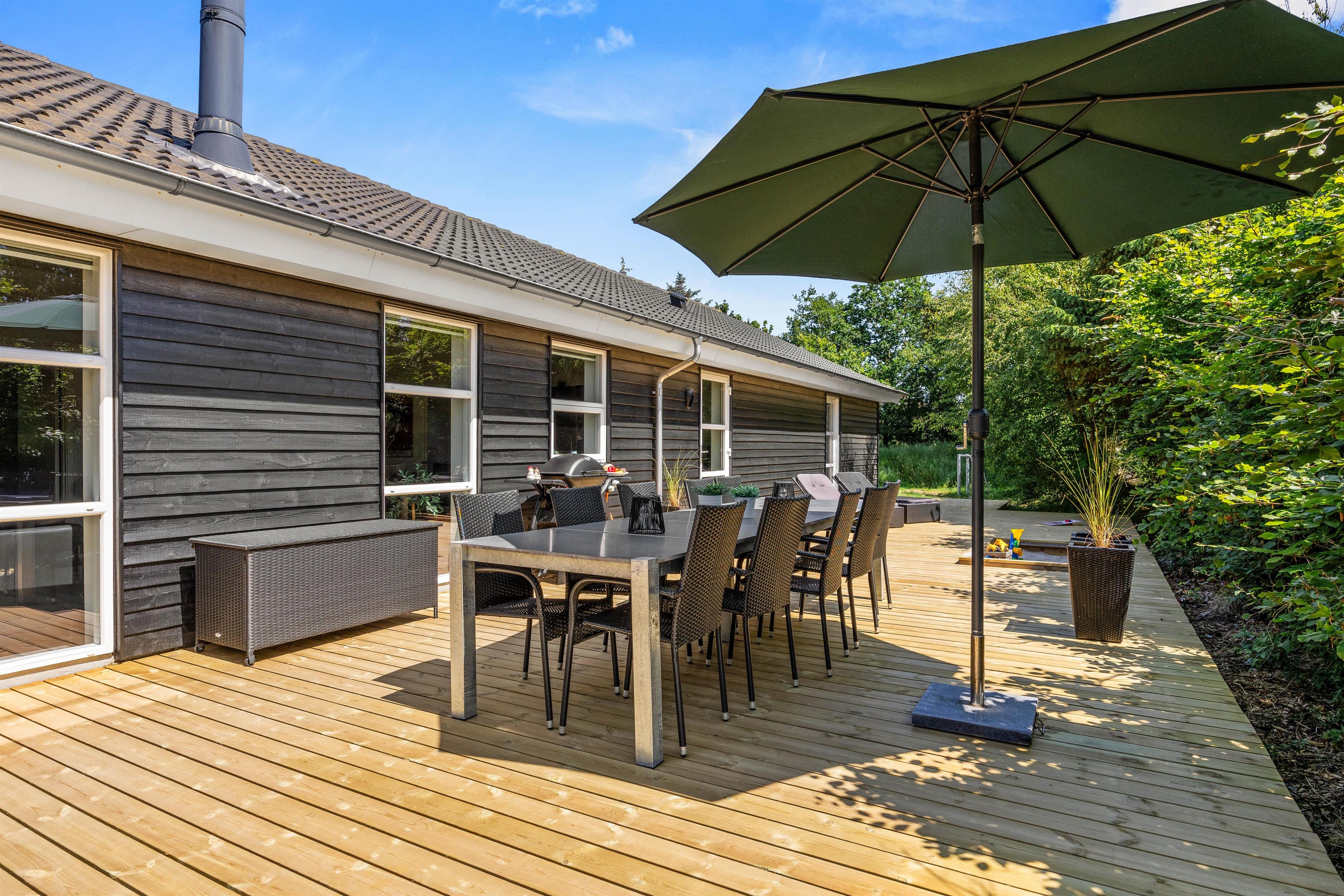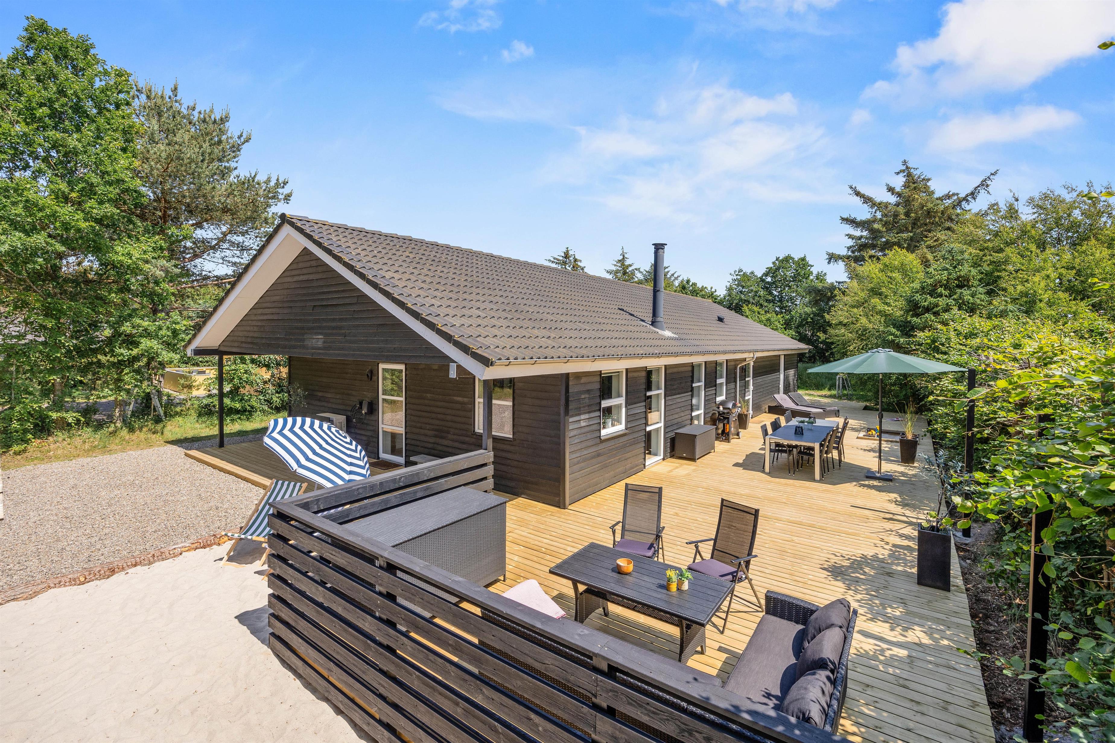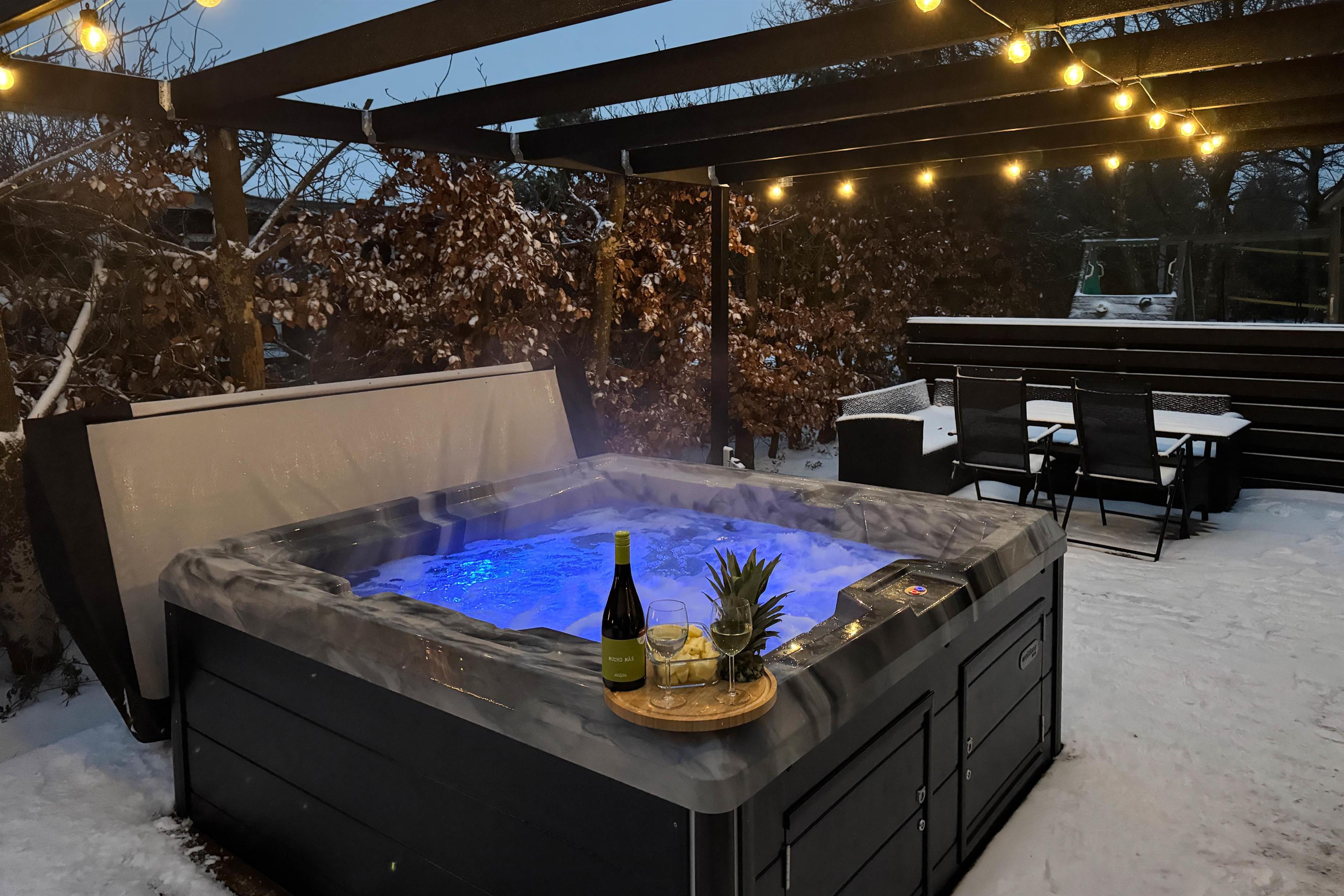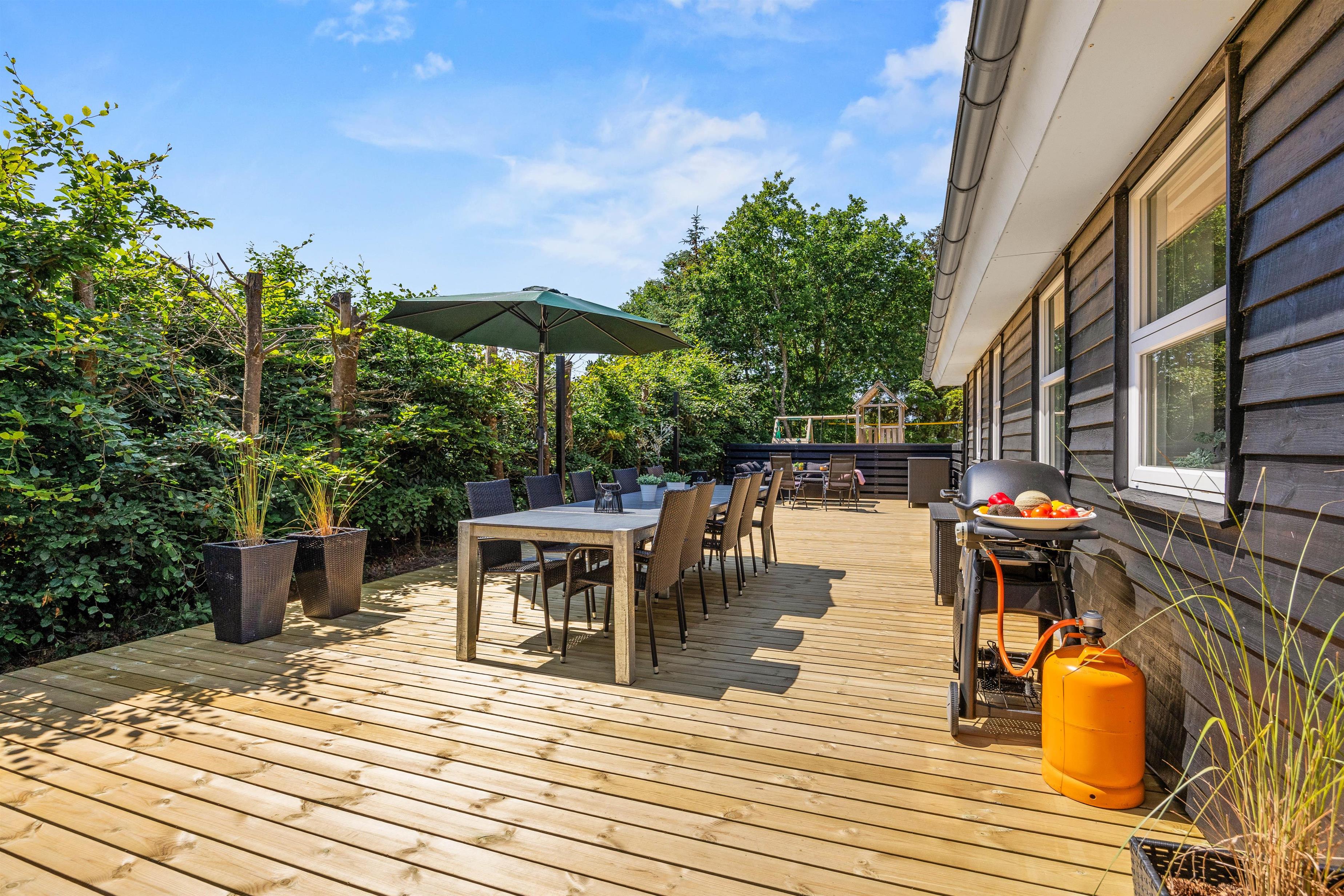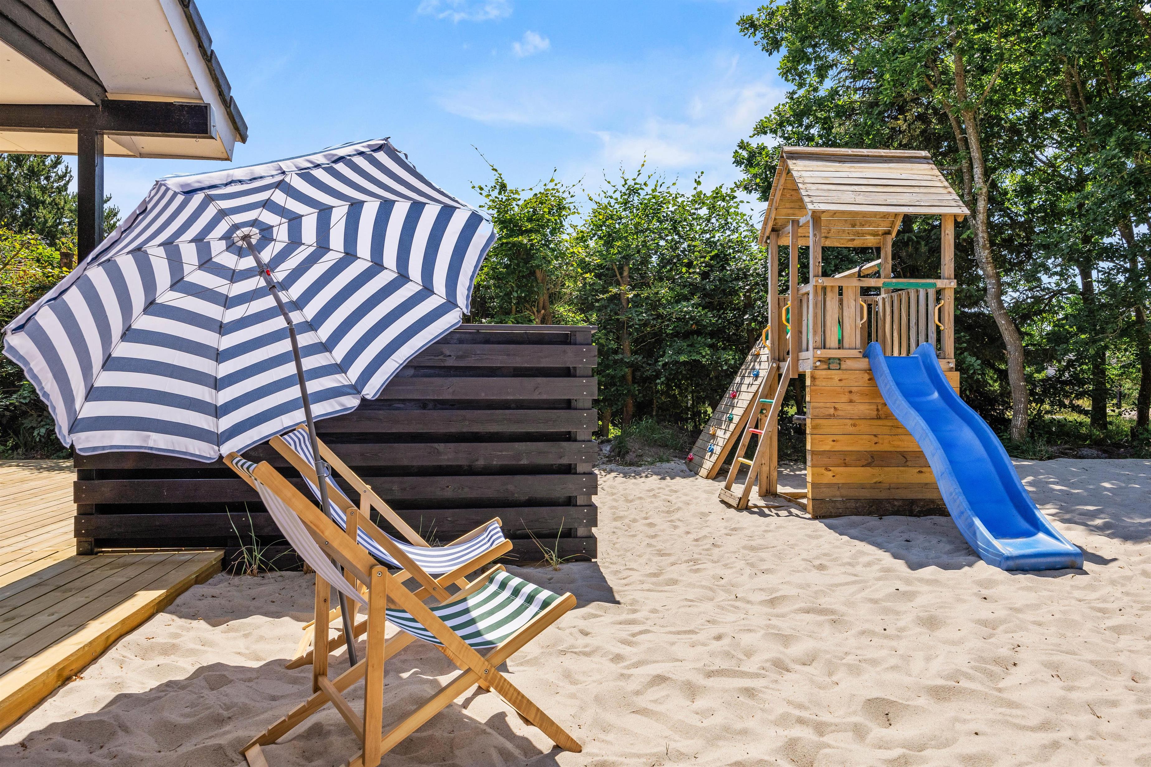 Sommerhuset har i 2025 fået en ny, stor terrasse og et ude-anlæg, hvor I kan nyde sommerdagene. Hiv liggestole og havemøbler frem, og læn jer tilbage, imens I ser på børnene, som leger i haven. Her er der både udespa, udebruser (som kan benyttes fra 1. april til 31. oktober), strandvolley og legestativ med gynge og rutschebane, som helt sikkert vil glæde både børn og voksne. I kan også tænde op for gasgrillen, som er varm på ingen tid, når den hurtige sult melder sig, og i haven nyde den flotte pergola.