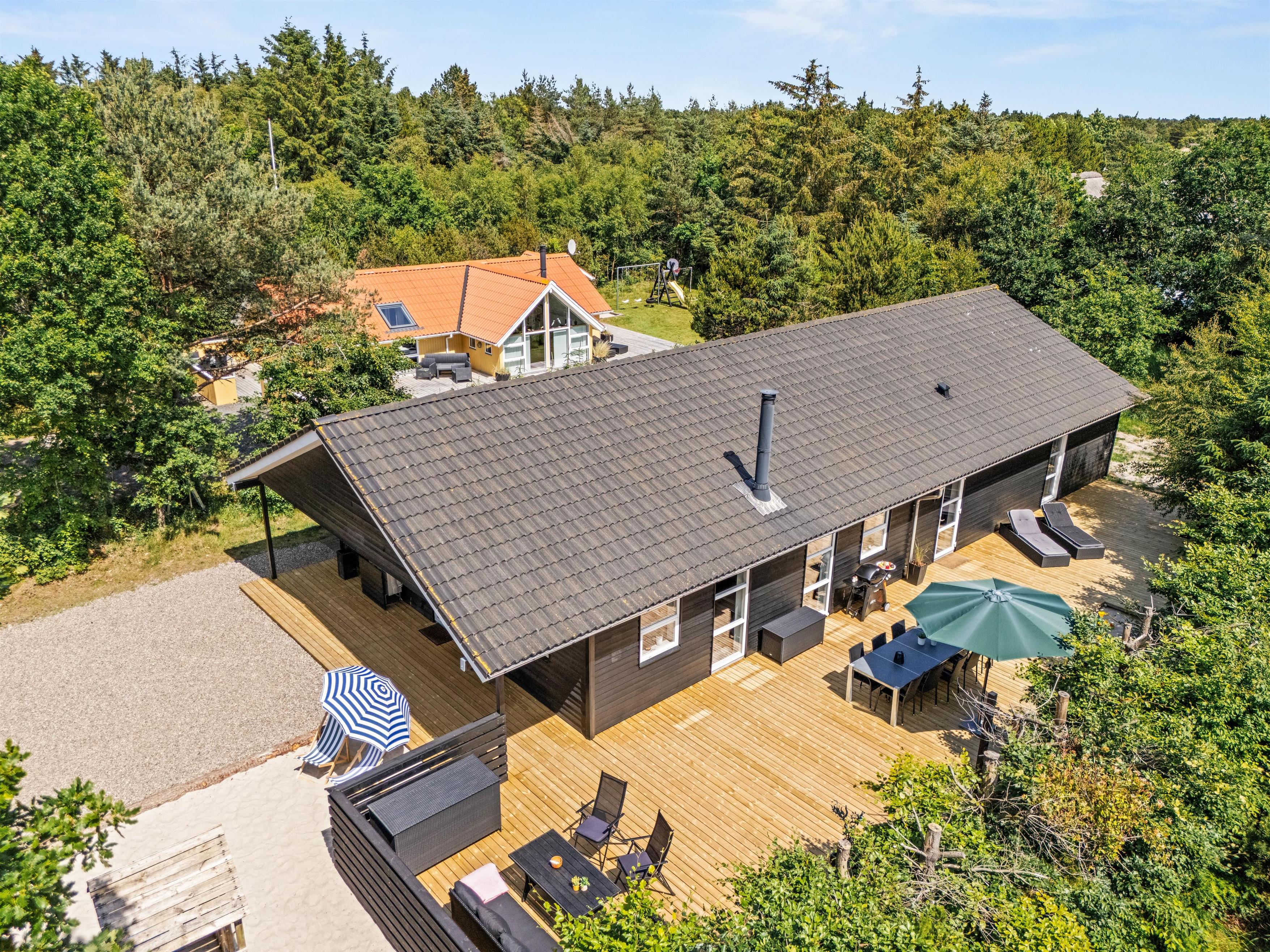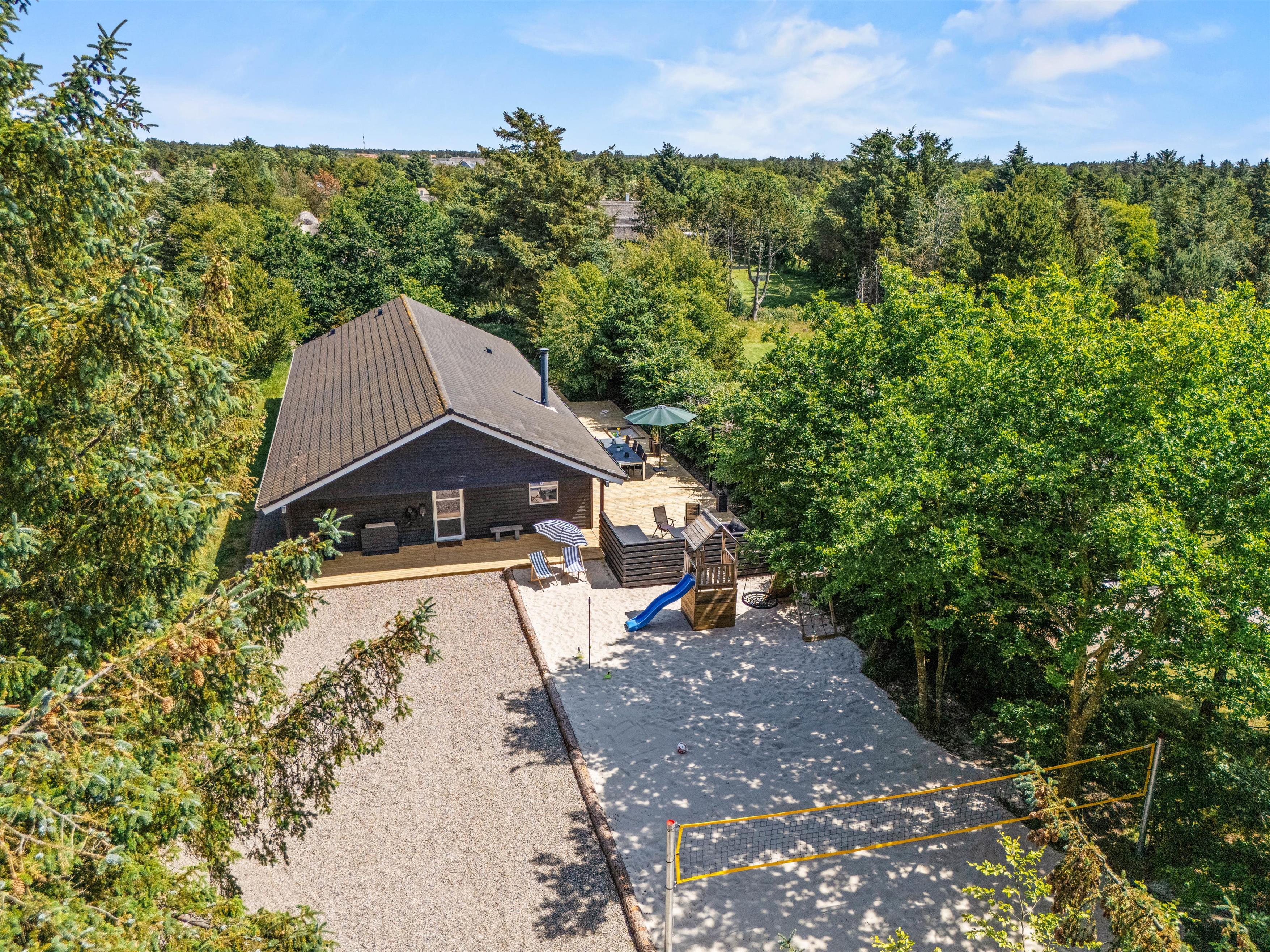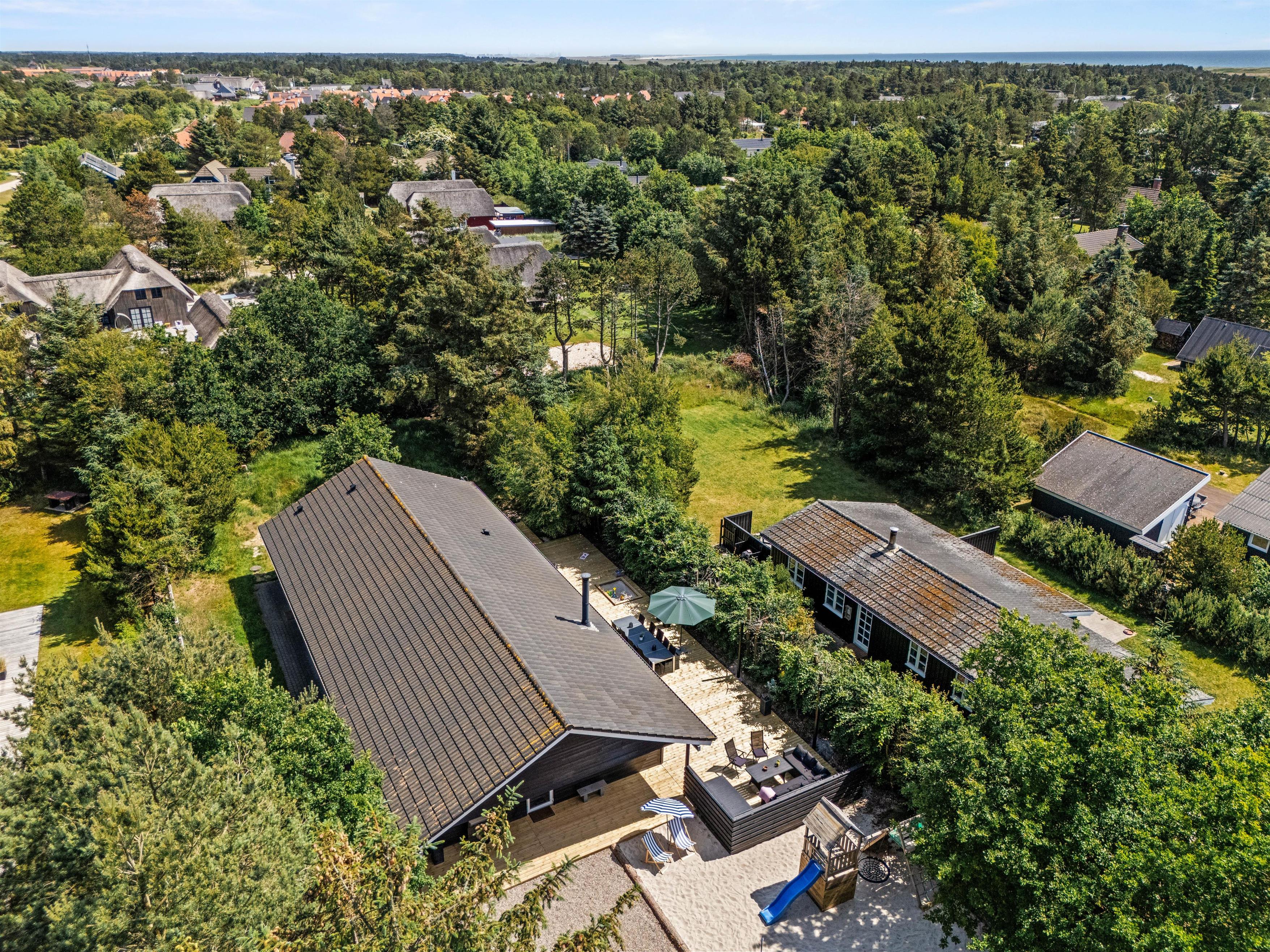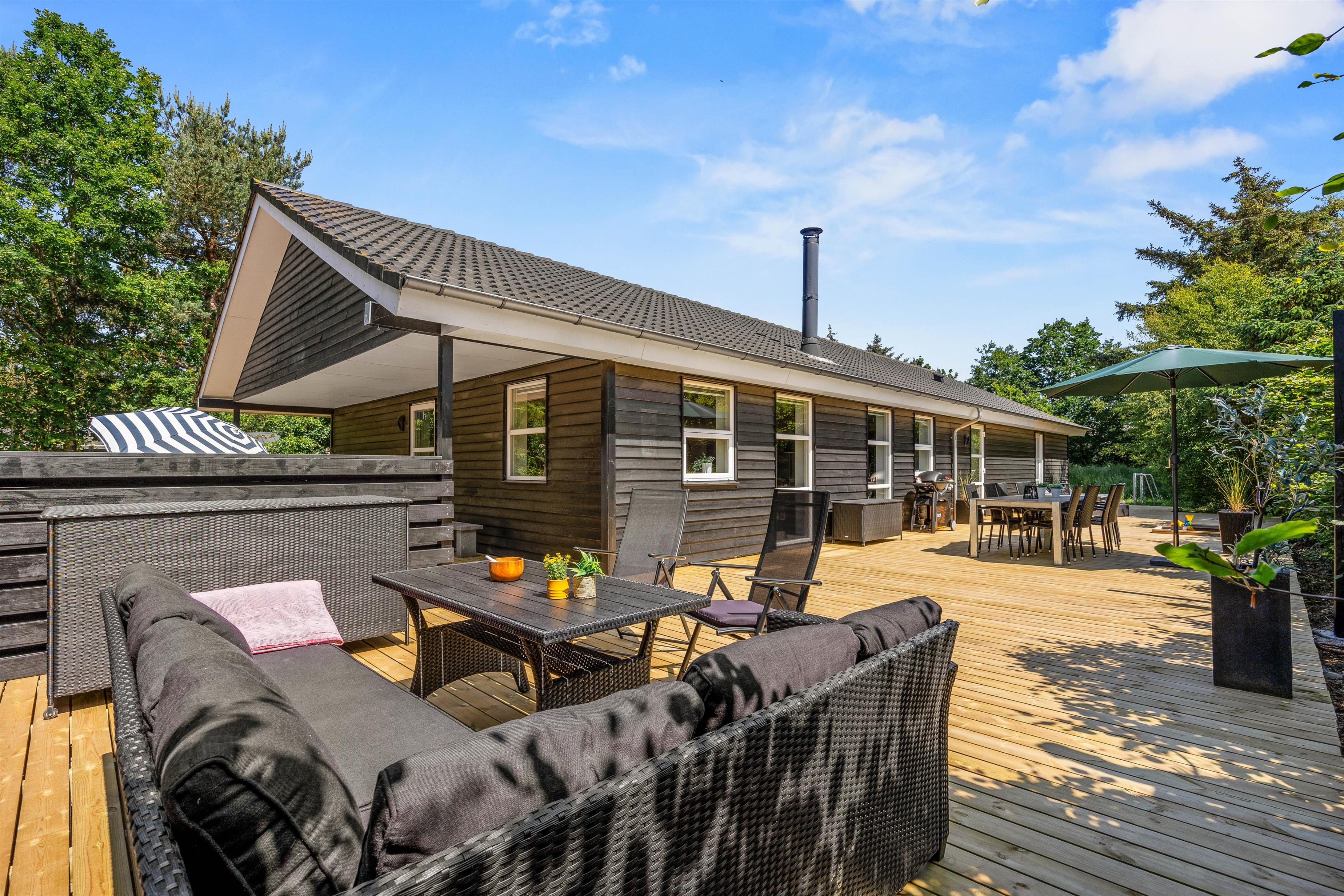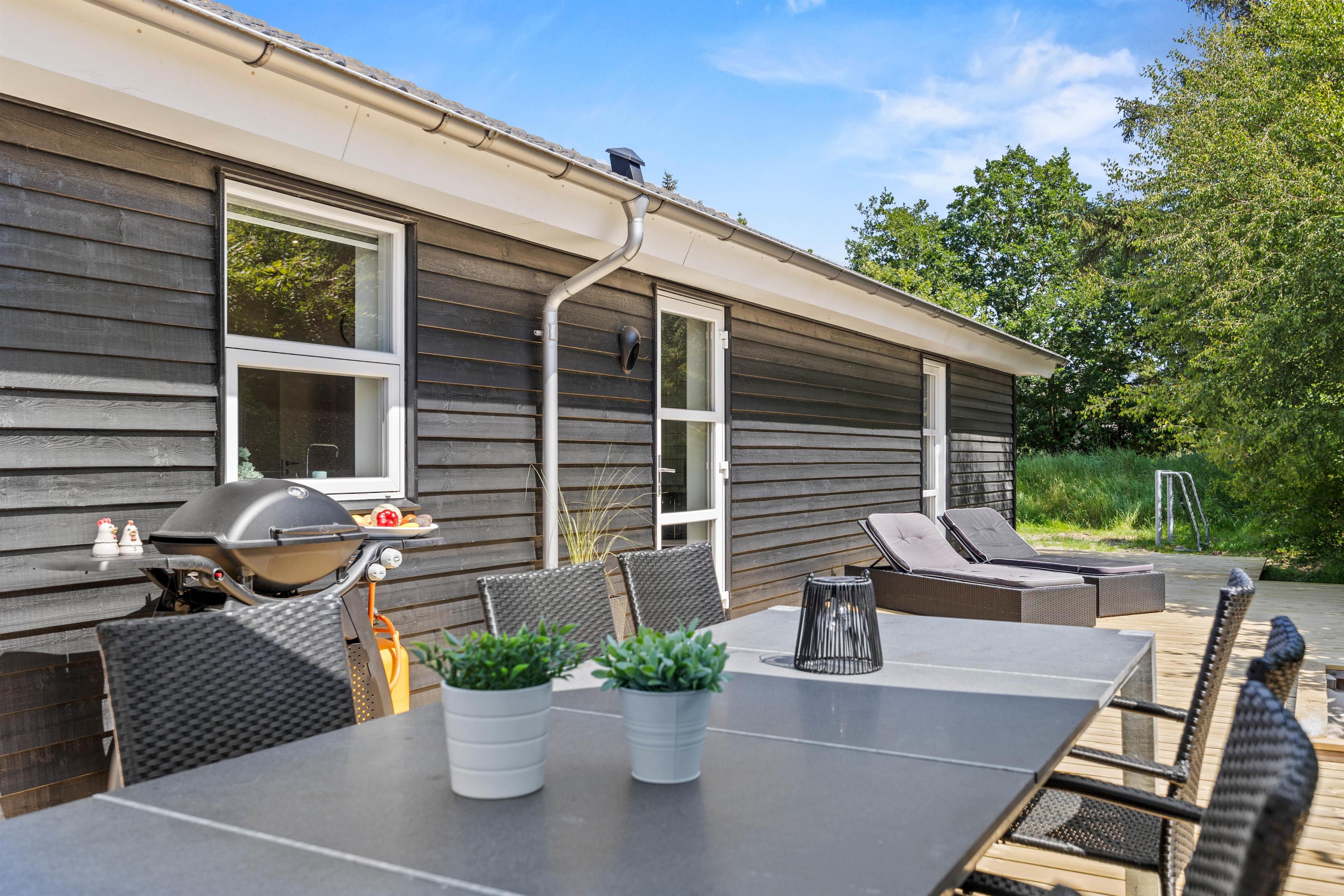 Sommerhuset har i 2025 fået en ny, stor terrasse og et ude-anlæg, hvor I kan nyde sommerdagene. Hiv liggestole og havemøbler frem, og læn jer tilbage, imens I ser på børnene, som leger i haven. Her er der både udespa, udebruser (som kan benyttes fra 1. april til 31. oktober), strandvolley og legestativ med gynge og rutschebane, som helt sikkert vil glæde både børn og voksne. I kan også tænde op for gasgrillen, som er varm på ingen tid, når den hurtige sult melder sig, og i haven nyde den flotte pergola.