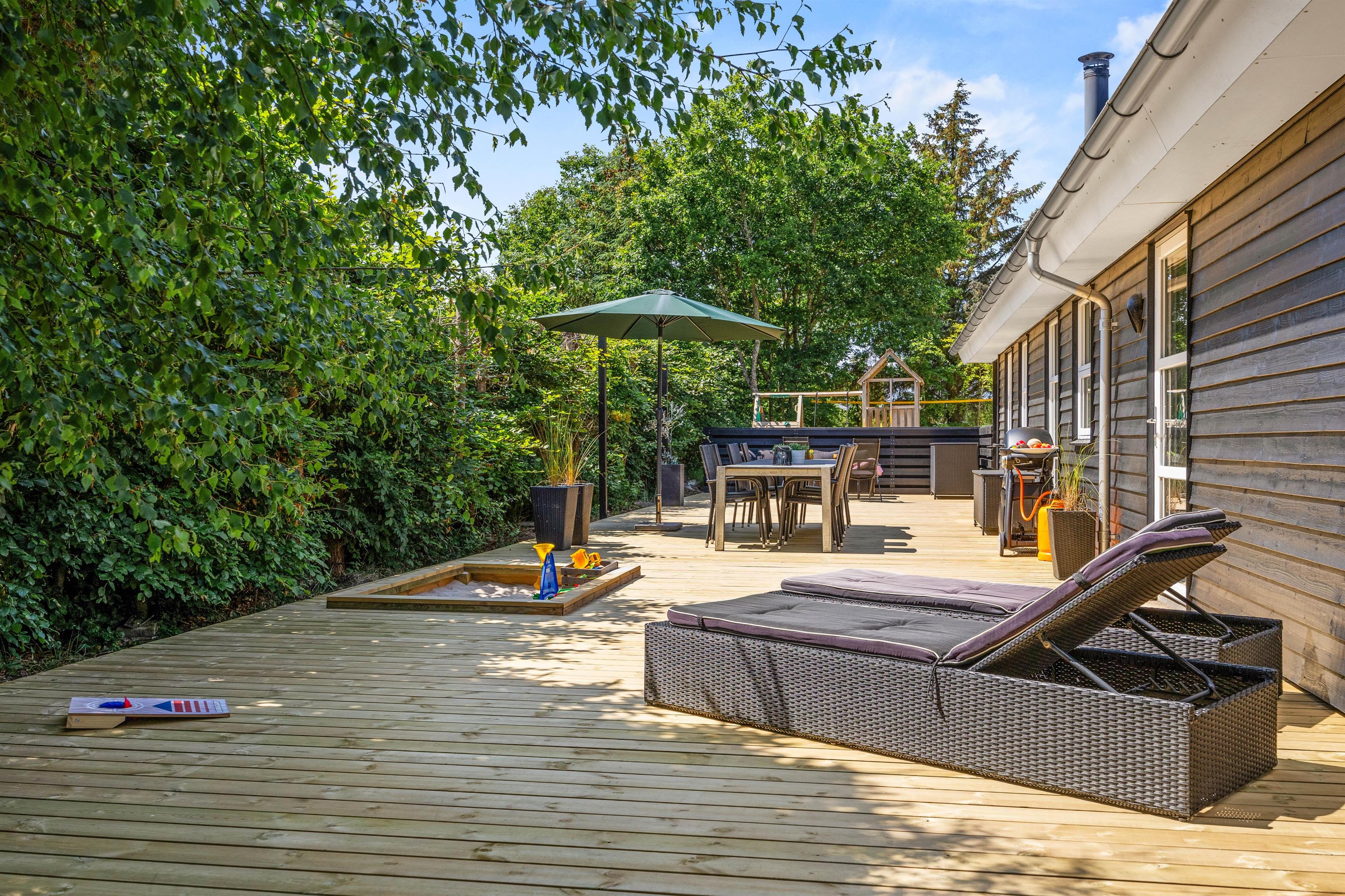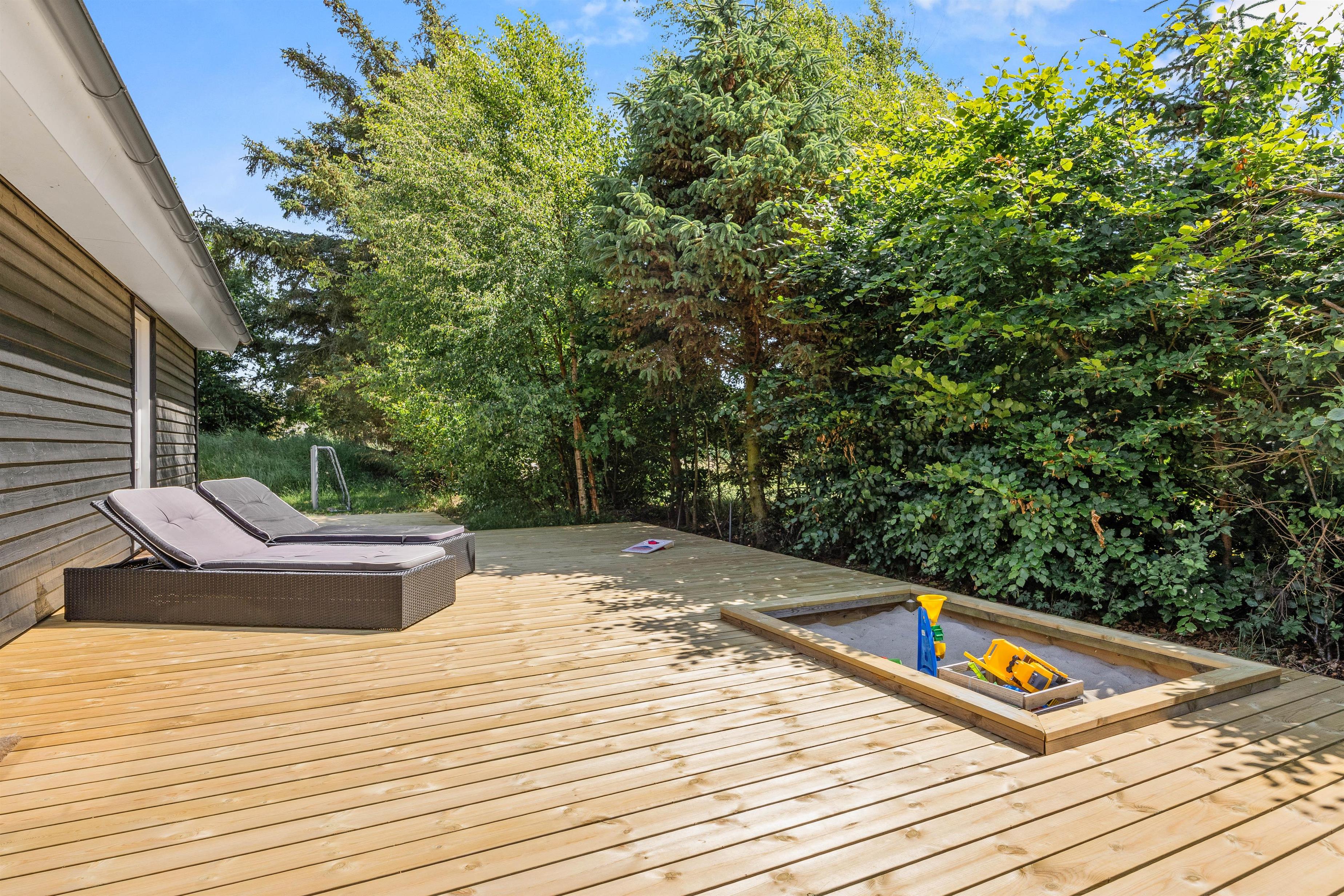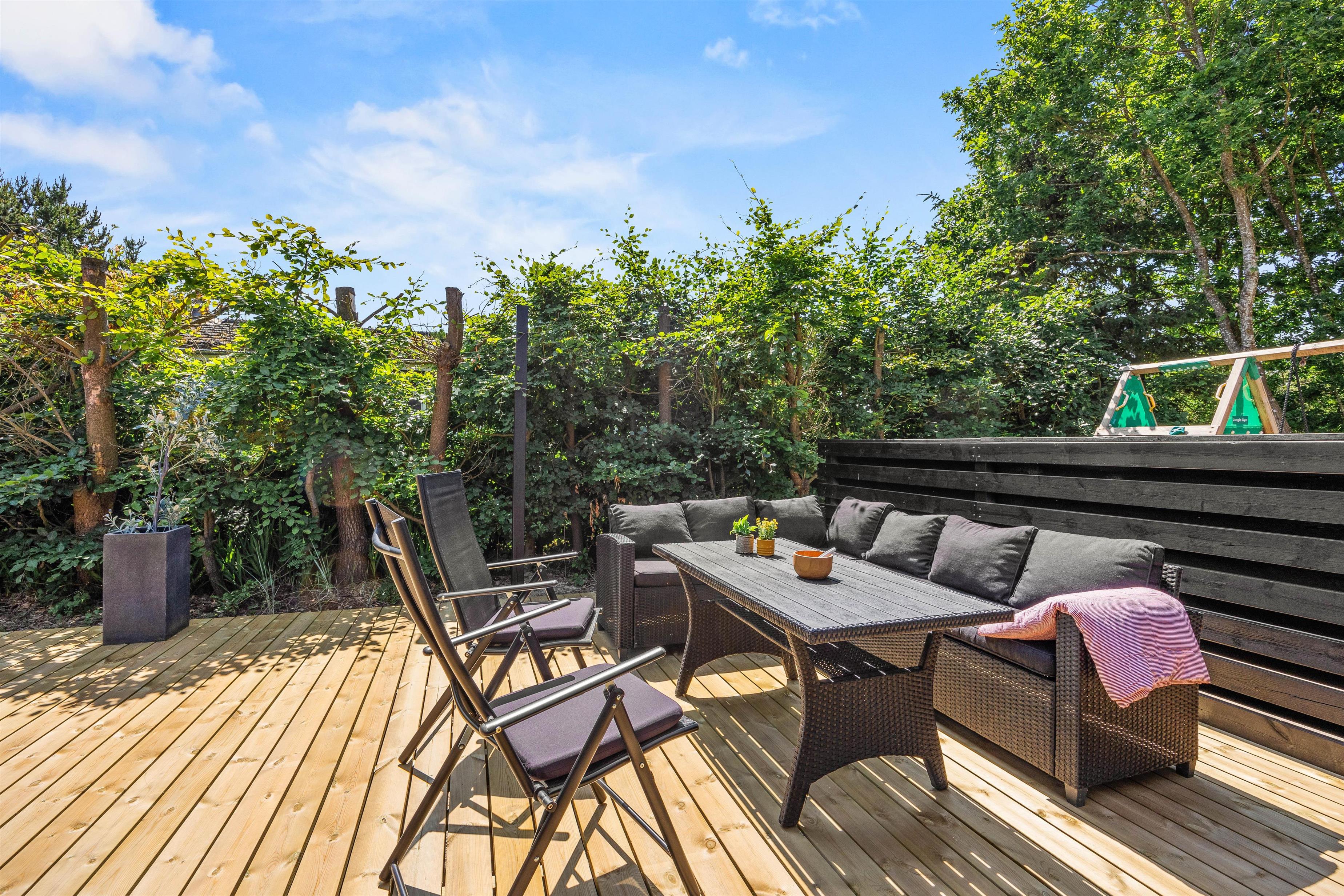 Stor terrasse, sandkasse og gynge