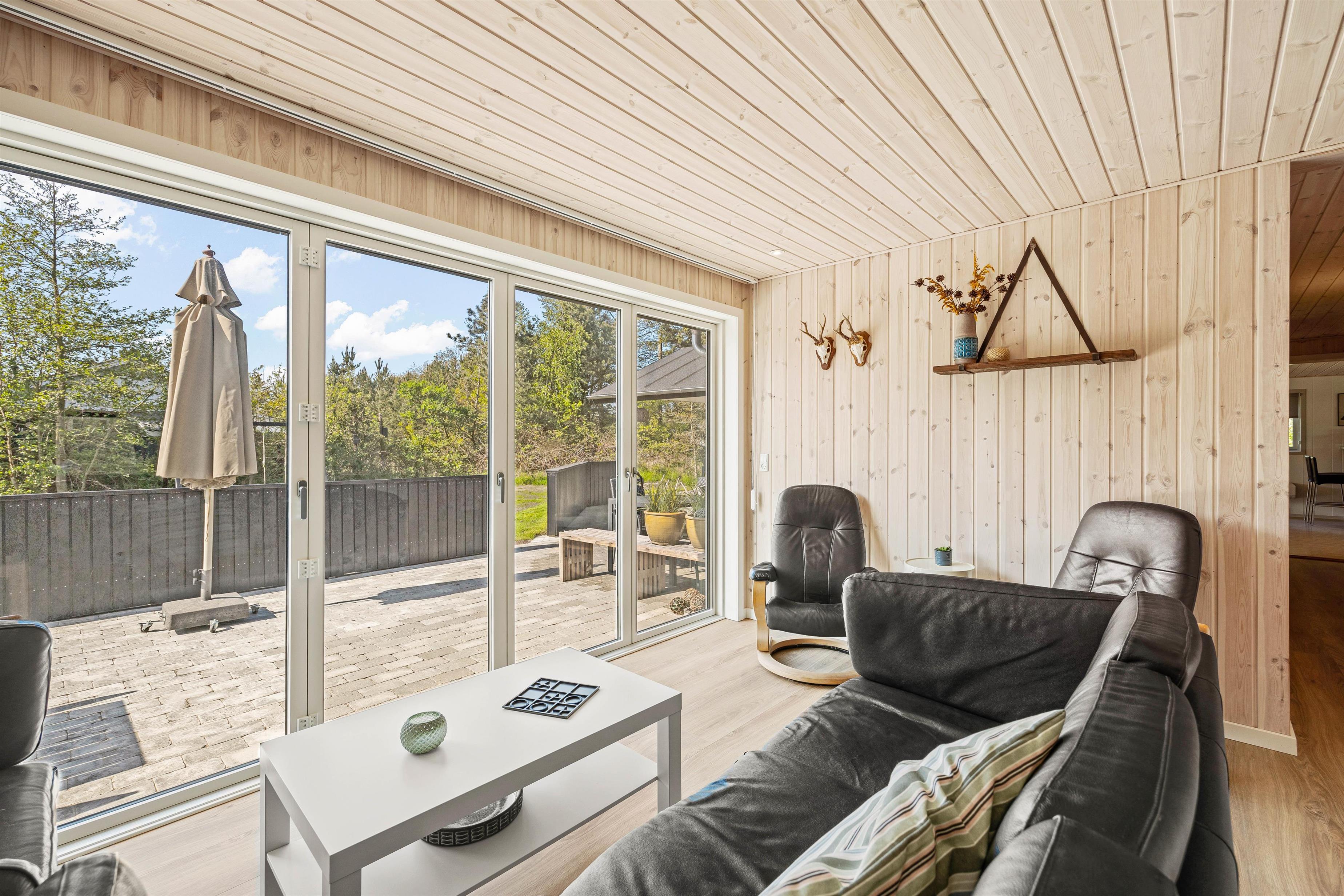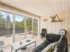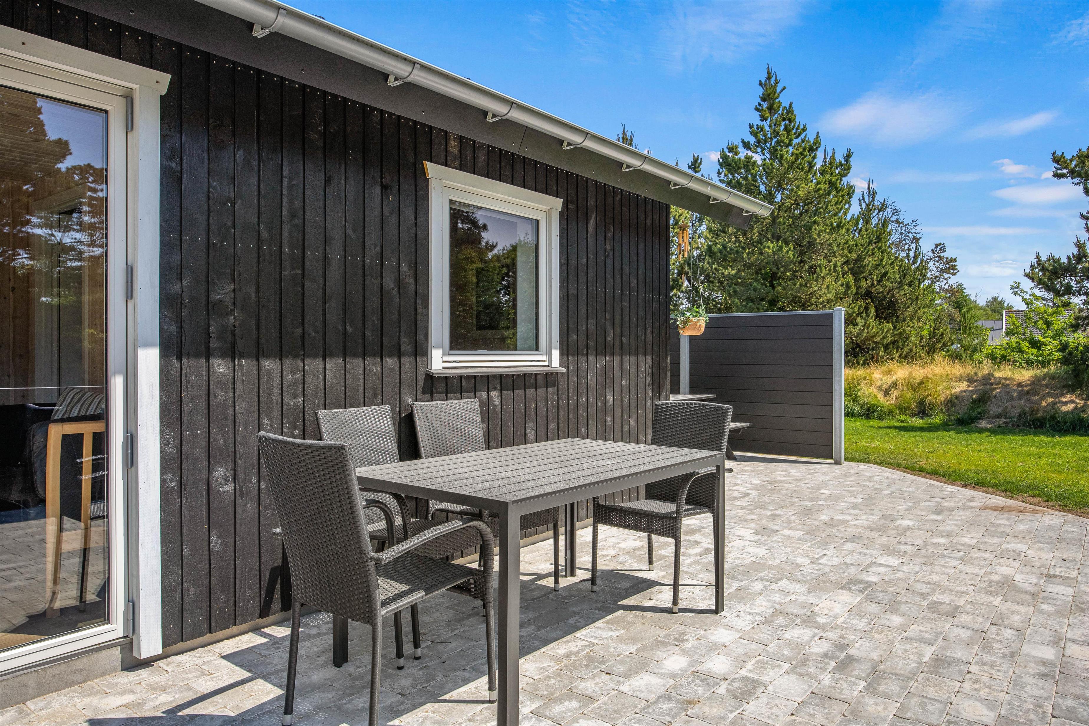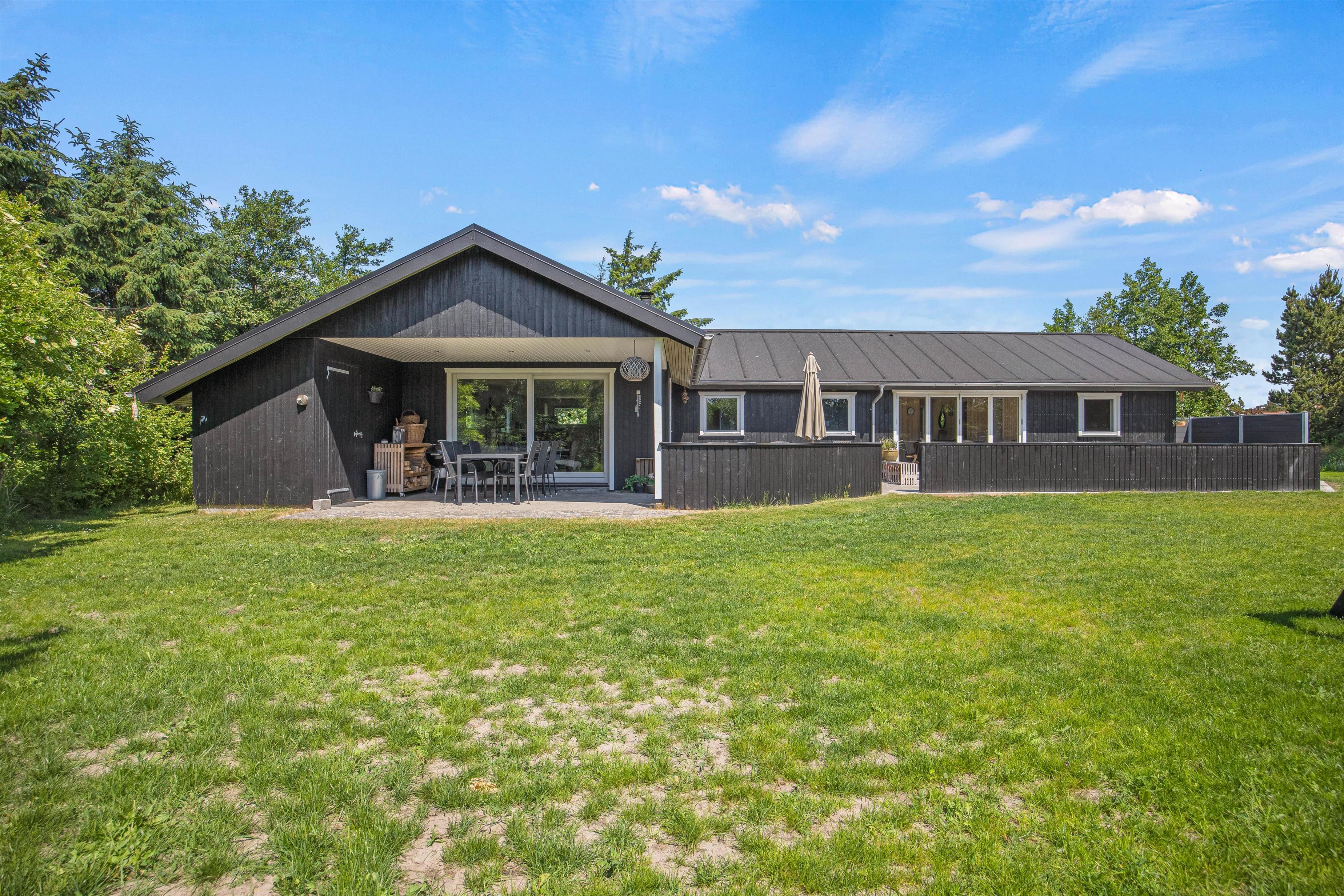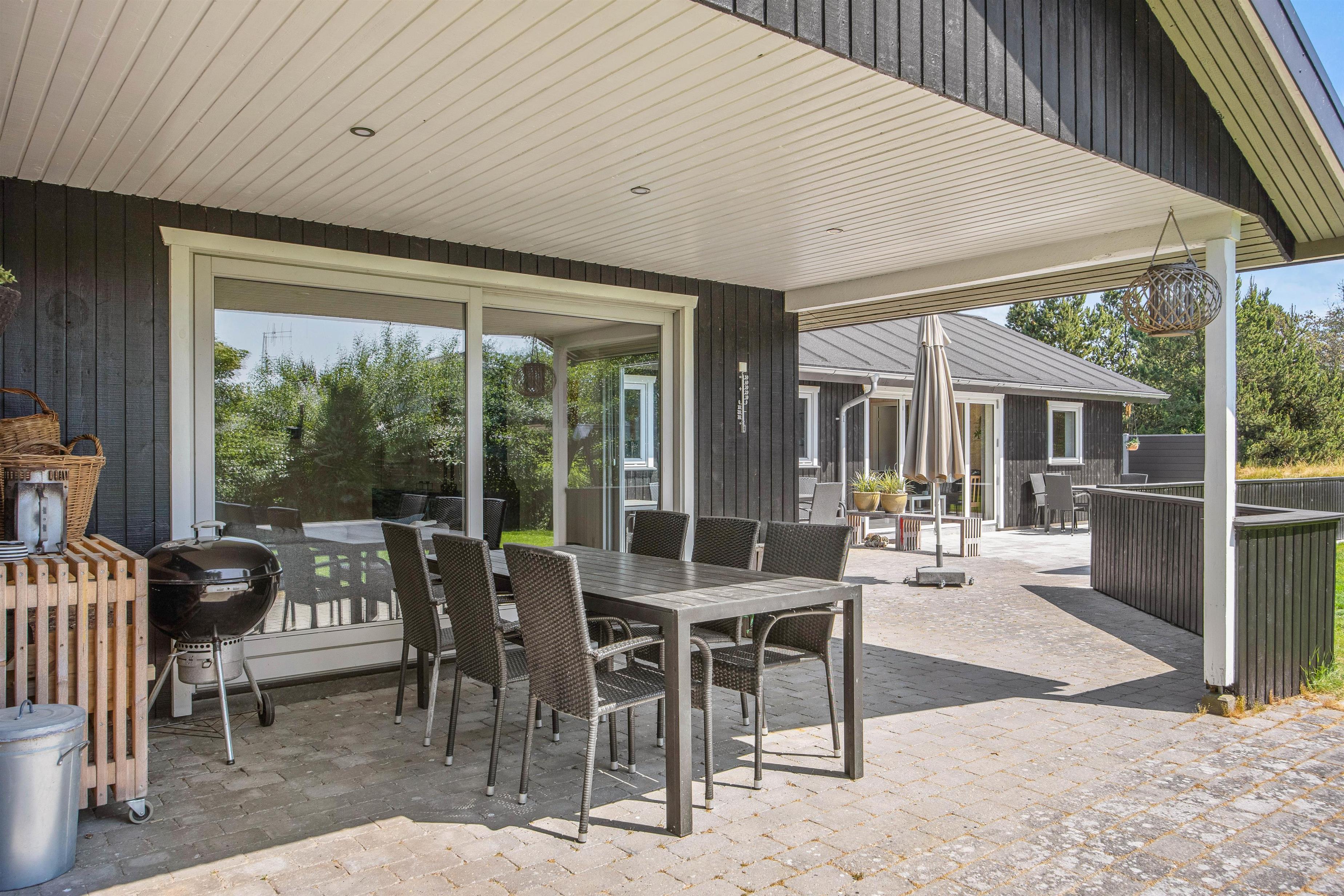 Til sommerhuset hører en fin og stor, delvist overdækket terrasse, hvor solrige dage kan nydes, og som I kan åbne fuldt op til i forbindelse med tilbygningen. Her finder I komfortable havemøbler og en kulgrill, hvorpå I hurtigt og nemt kan tilberede lækre måltider, som I kan nyde til god vin eller velsmagende, lokal øl.