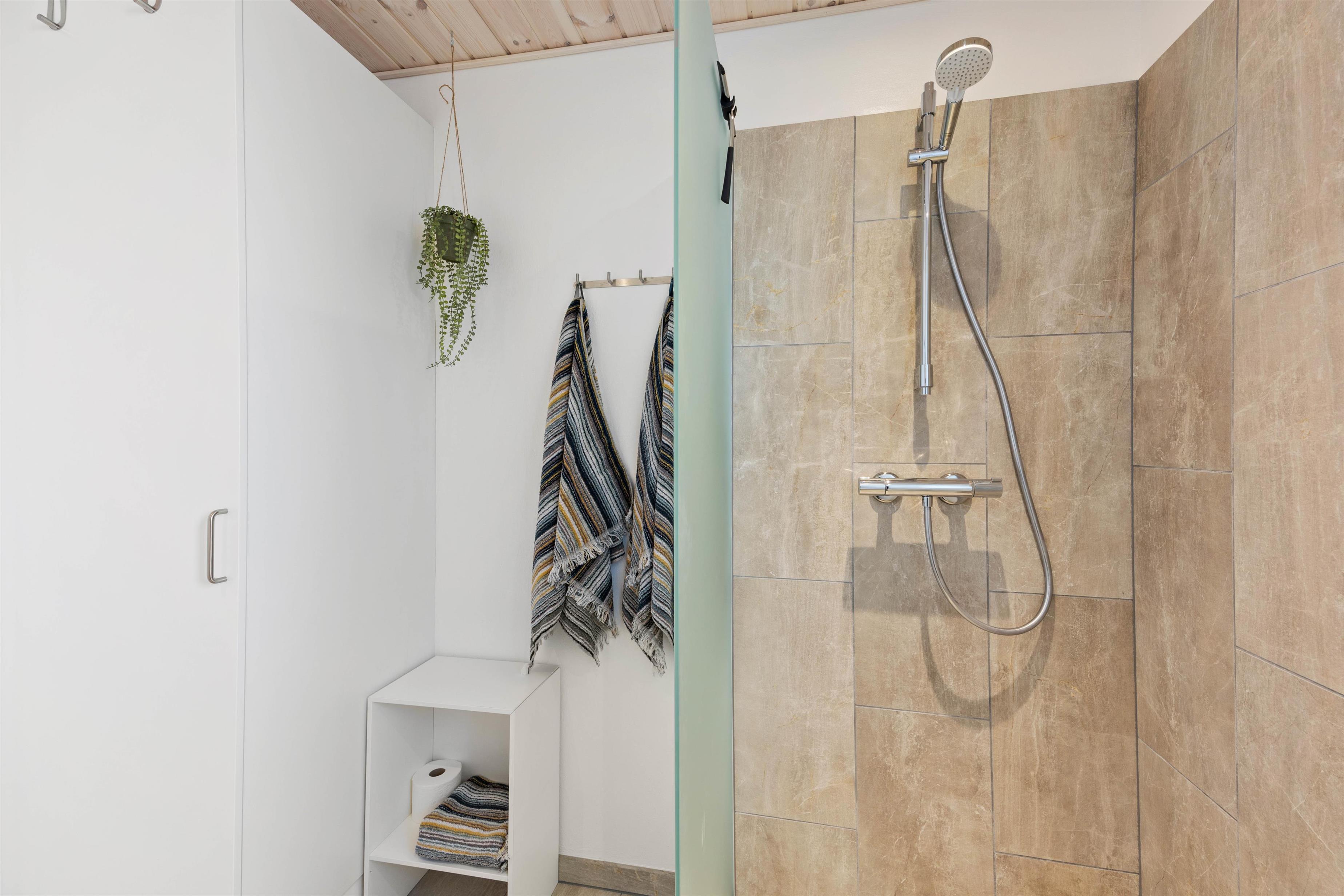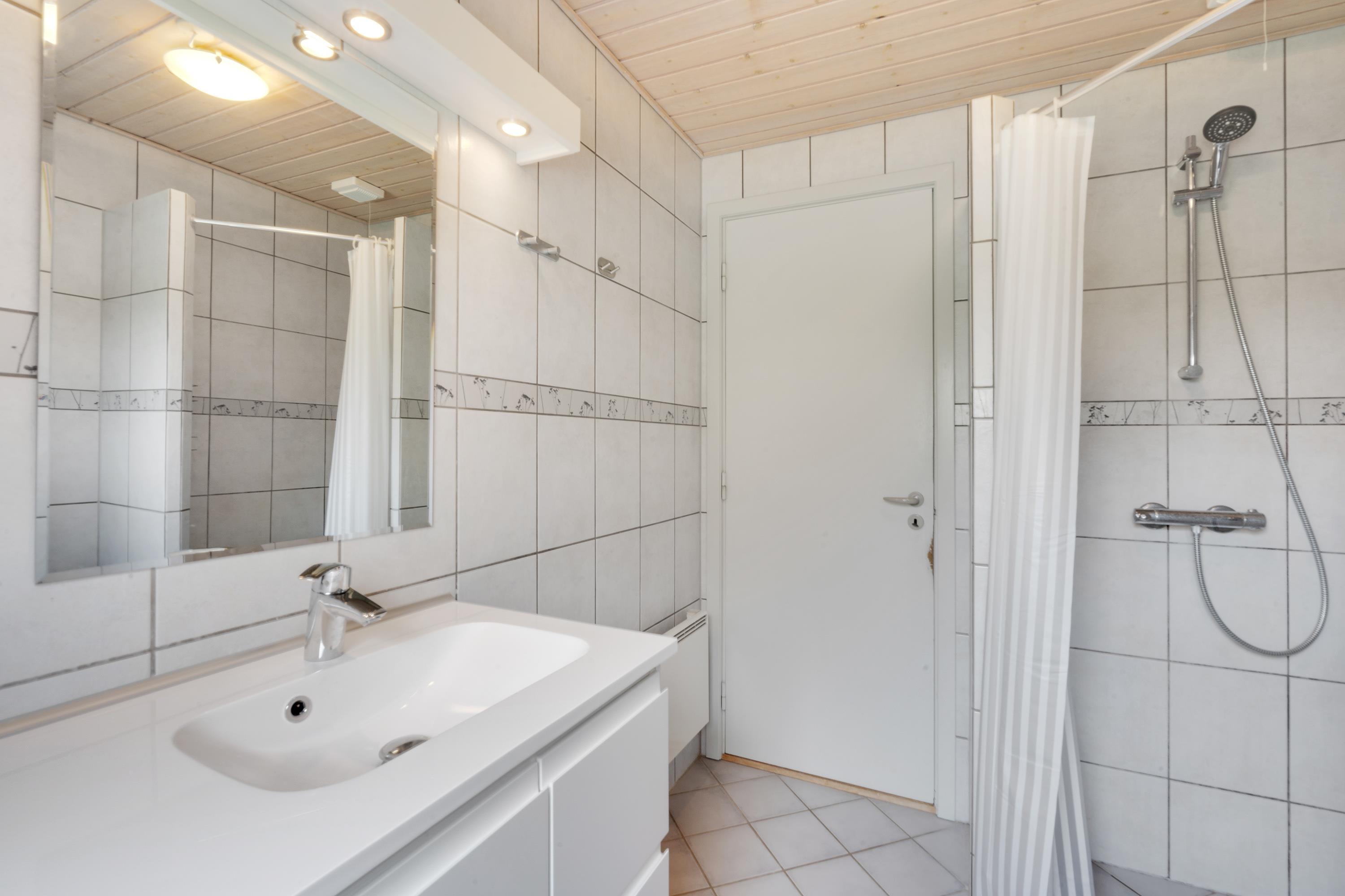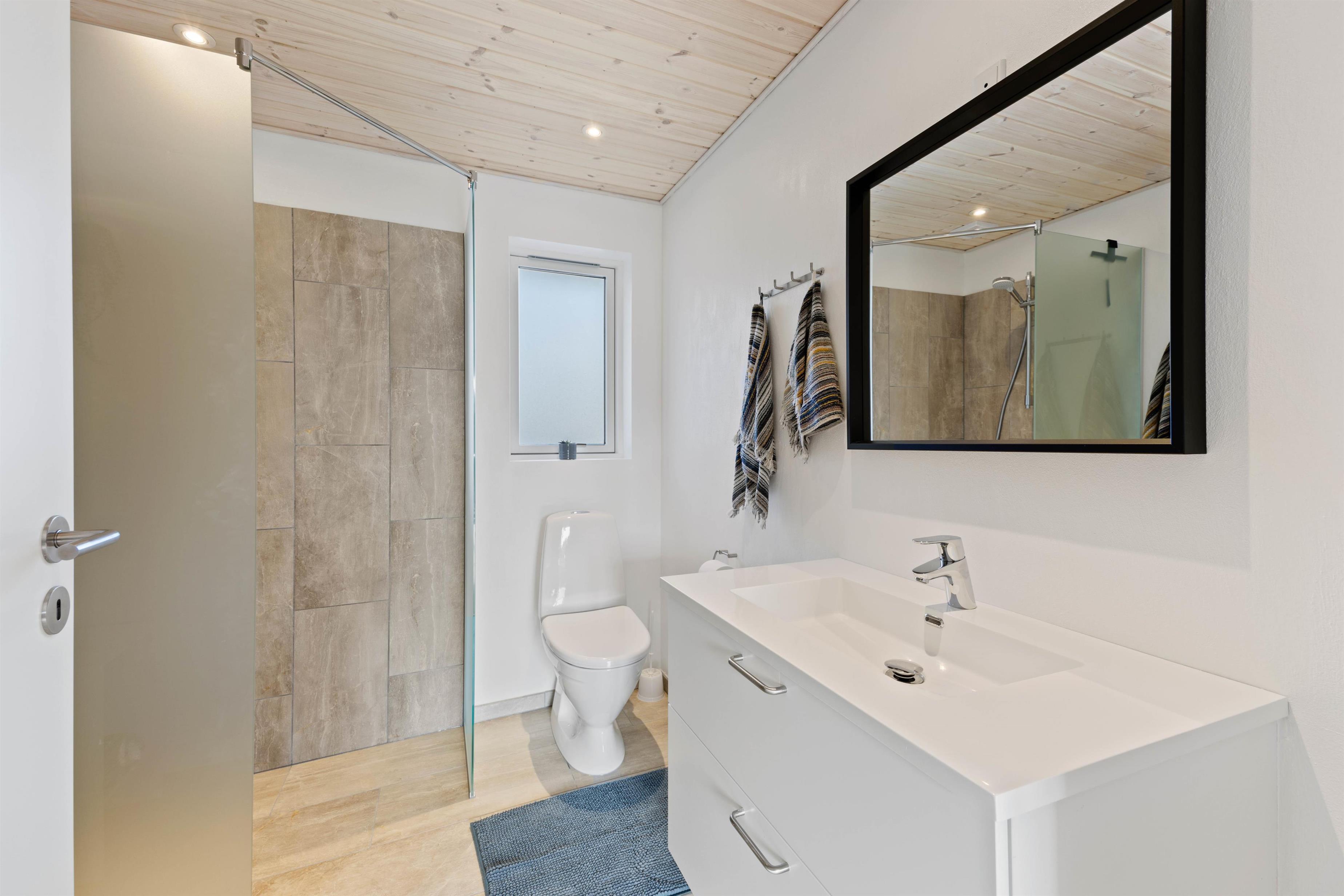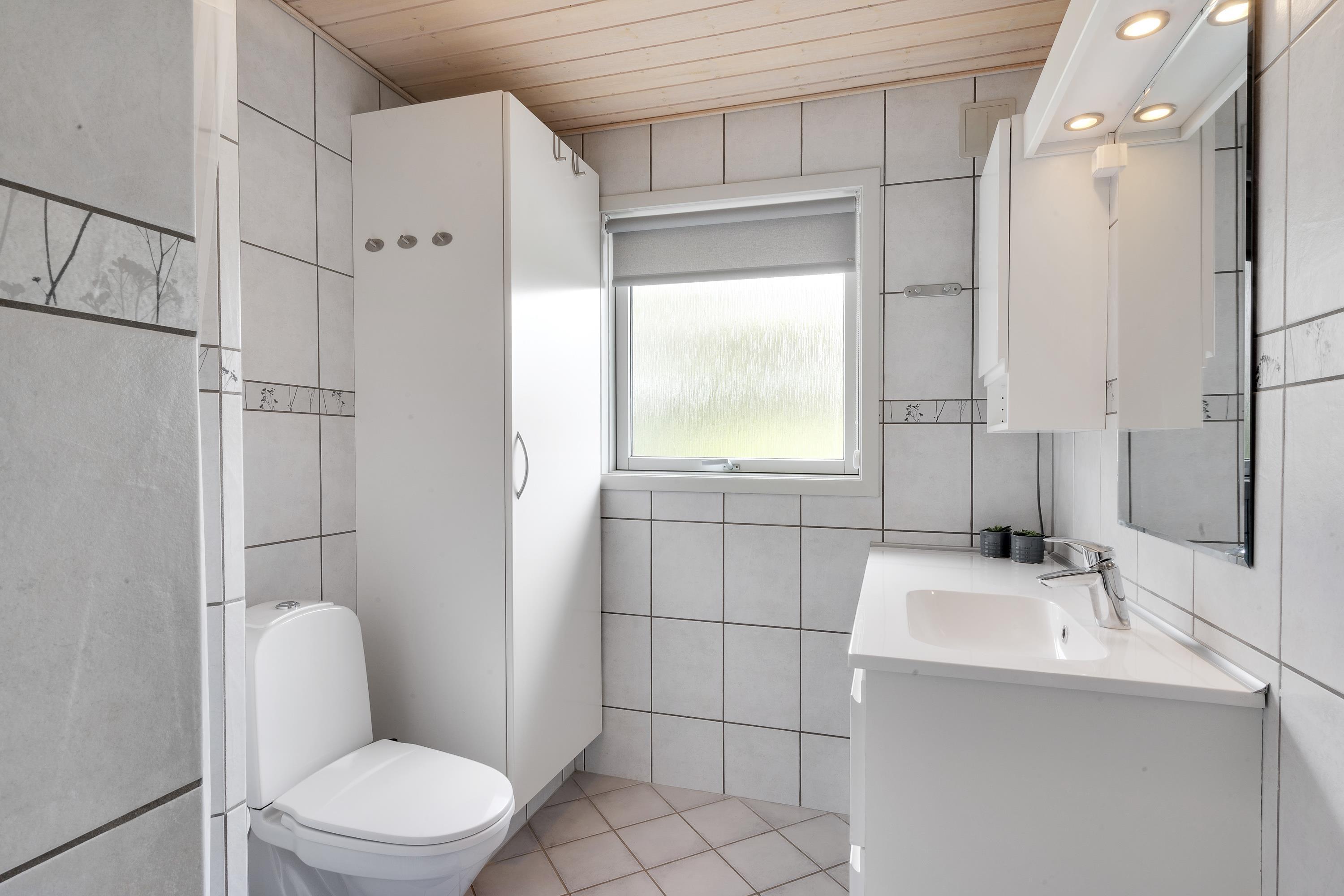 Sommerhuset har hele 2 badeværelser med gulvvarme, så I ikke behøver at stå i kø til morgentoiletten, og i det ene badeværelse finder I en vaskemaskine, så I kan få vasket og tørret ferietøjet undervejs. Desuden har sommerhuset også en energivenlig varmepumpe, der året rundt sørger for et godt indeklima uden de store omkostninger.