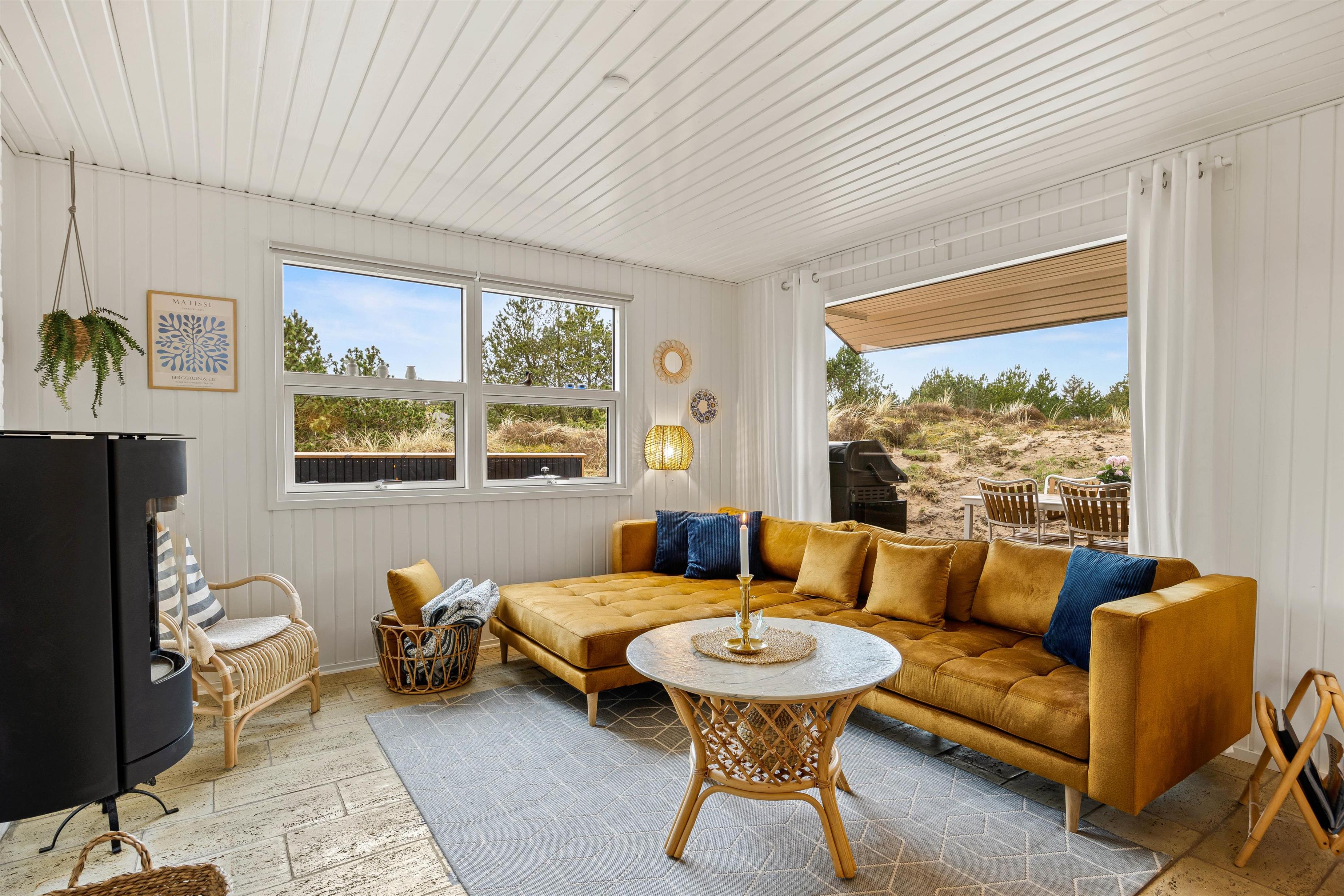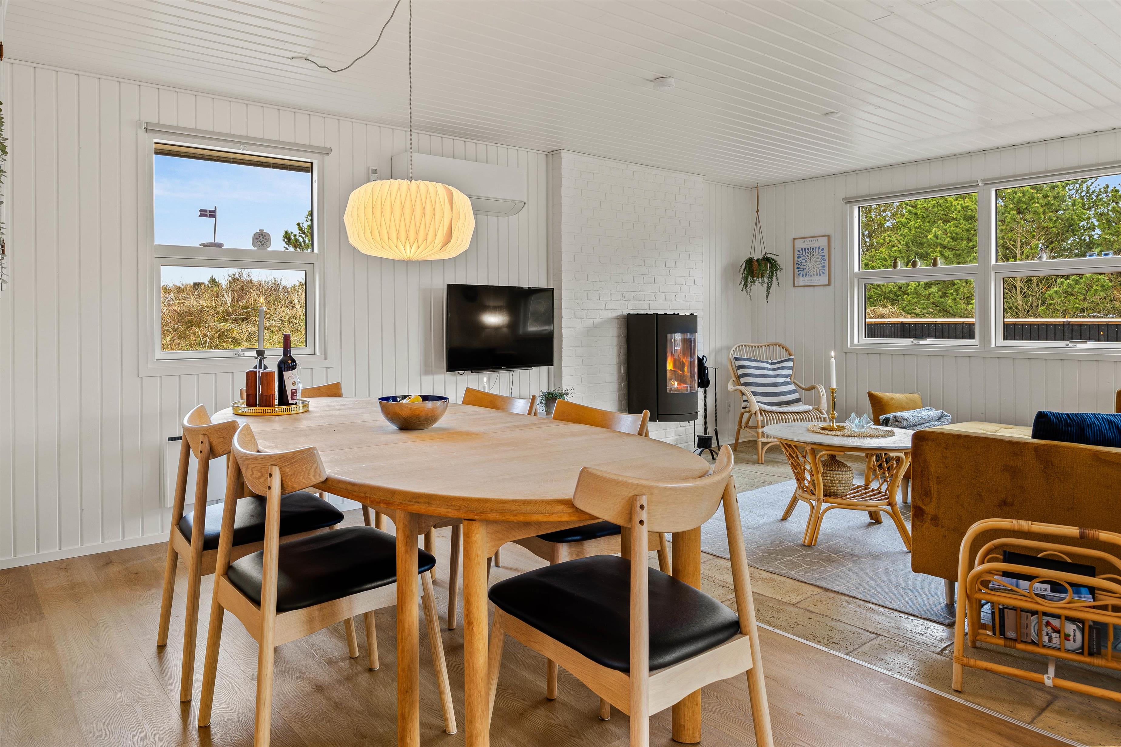 Køkkenalrummet, som er lyst og hyggeligt, bliver helt sikkert jeres samlingspunkt i sommerhuset, og brændeovnen er med til at sætte rammen for mange hyggelige feriestunder for alle 5 feriegæster.