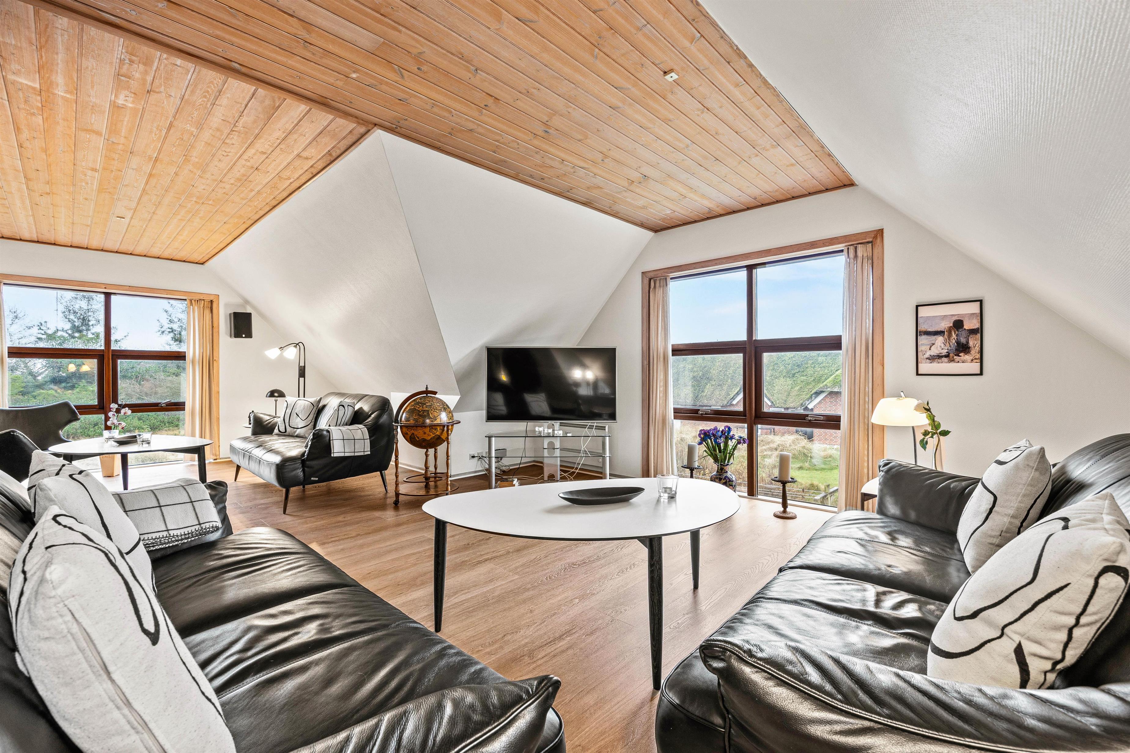 Sommerhusets 191 m² er fordelt i 2 plan, og på 1. salen finder i den hyggelige stue, hvor I kan samles til mange hyggelige feriestunder - måske med et spil kort? Herfra har I kig til Blåvandshuk Fyr, der ligger på Danmarks vestligste punkt.