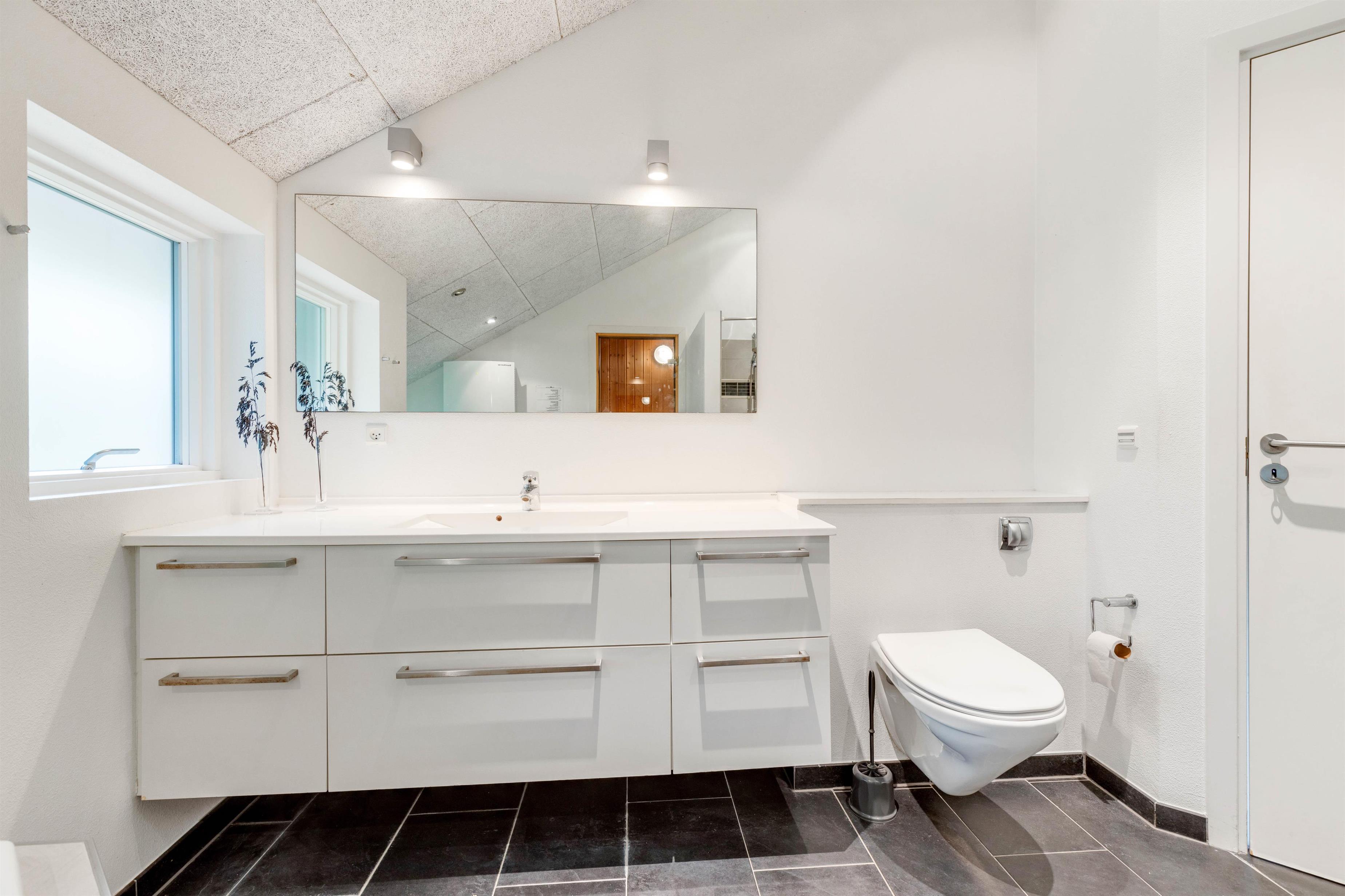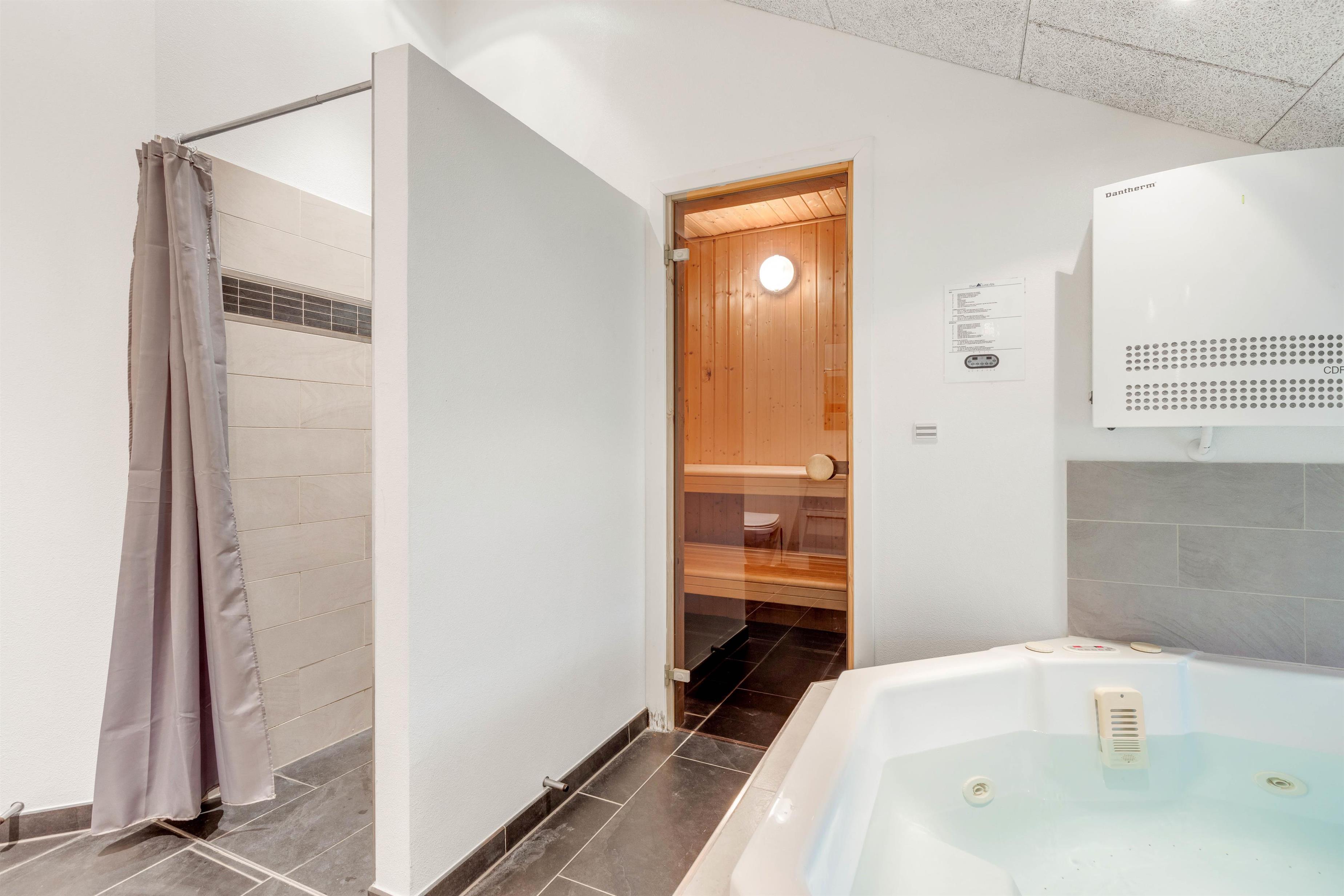 Er der i stedet afslapning på programmet, er det sommerhusets store badeværelse, I skal søge mod. På badeværelset kan I sætte jer godt til rette i den varme spa, mens I lader kroppen slappe fuldstændig af. Efterfølgende kan I sætte jer ind i den dejlige sauna.