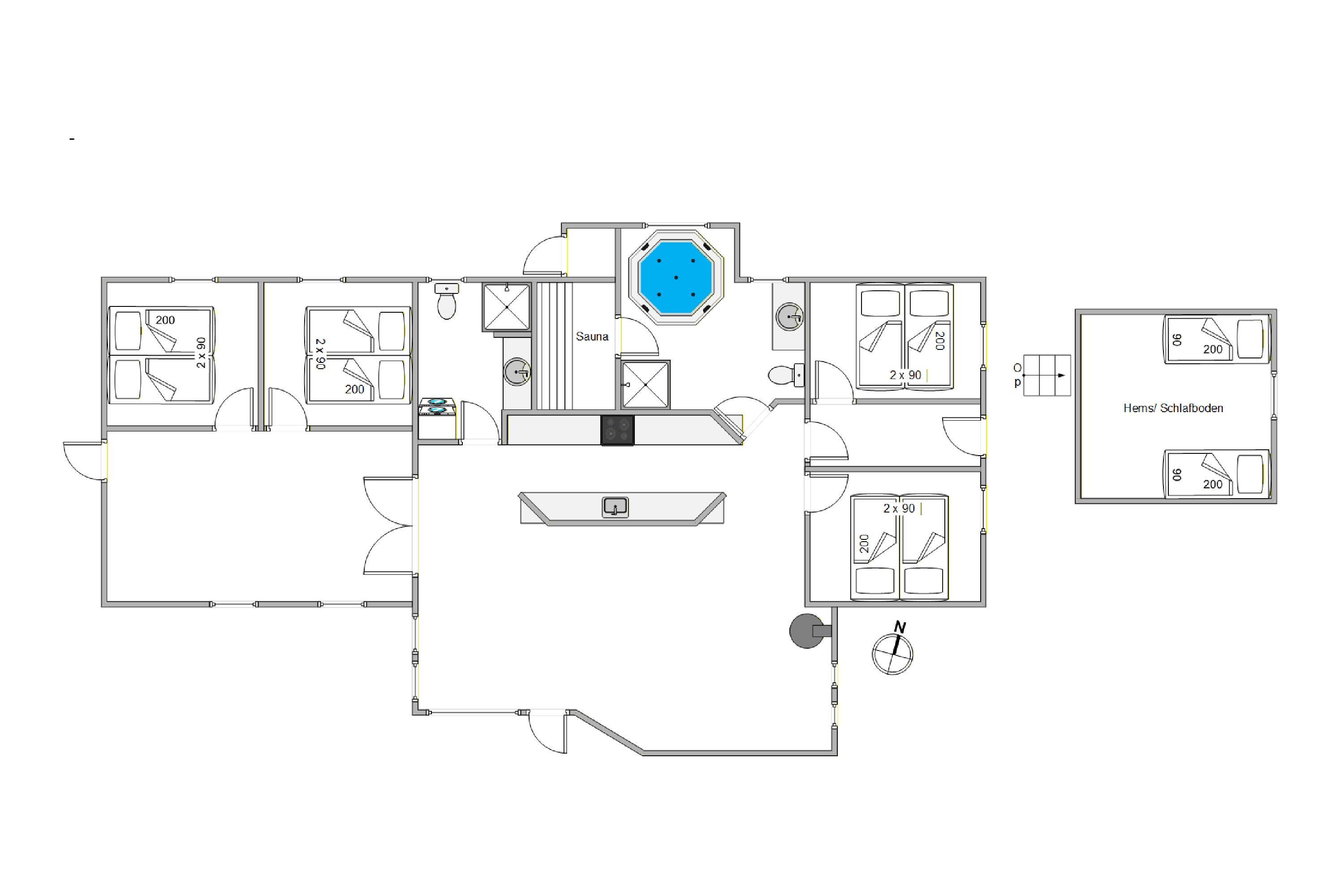 Efter en dejlig feriedag kan I søge mod de 4 soveværelser og en hems i sommerhuset. At sove i hemsen er et sikkert hit blandt ungerne! Her kan I få jeres skønhedssøvn, så I er klar til endnu en god feriedag. Om morgenen skal I ikke frygte kø til toilettet – der er nemlig hele 2 badeværelser (endda med gulvvarme).