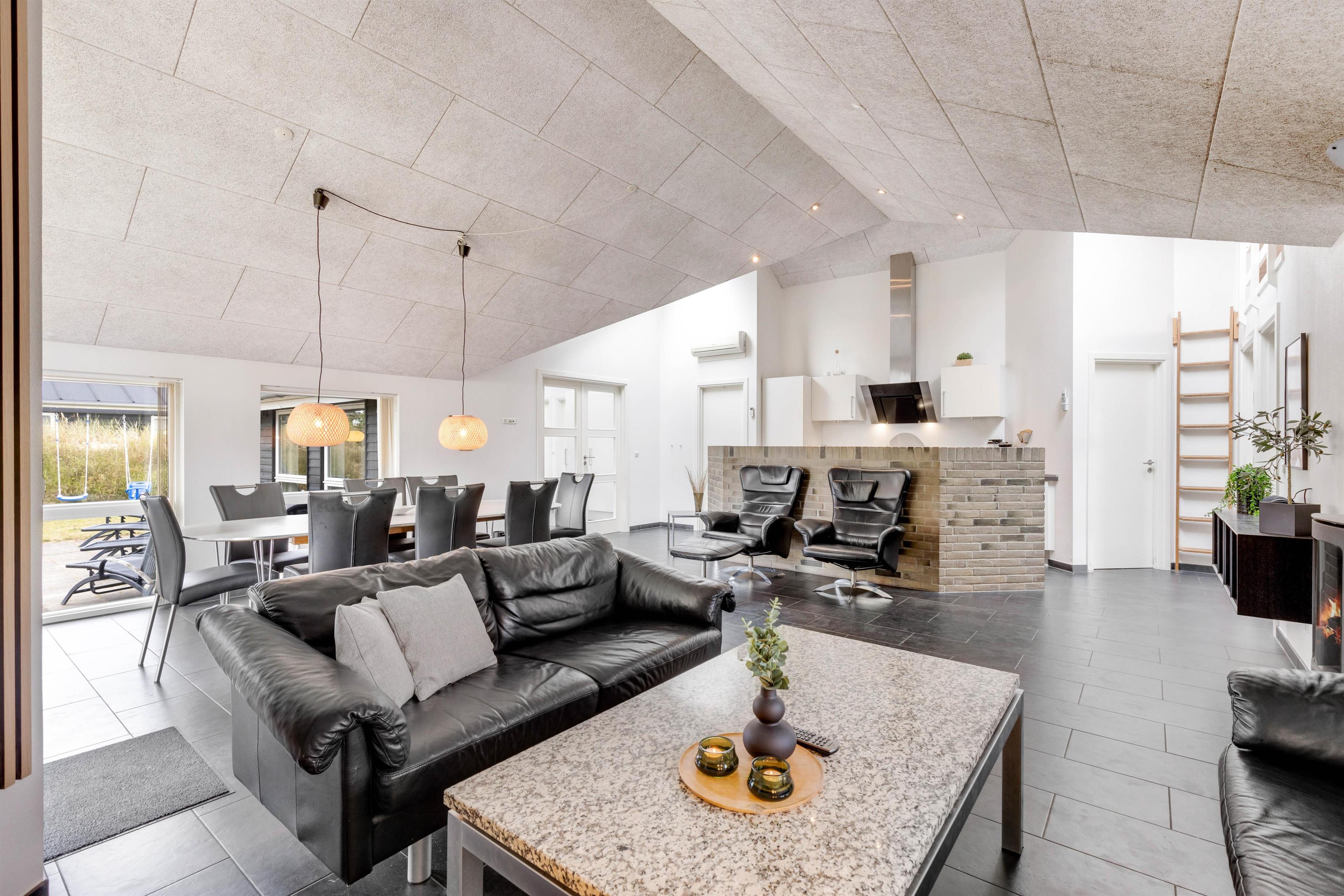 Det lyse sommerhus med højt til loftet rummer en moderne indretning, som I straks vil finde jer godt til rette i. Det store opholdsrum, der forener køkken, spiseafdeling og stue, er hjertet i sommerhuset, hvor mange af jeres hyggelige feriestunder kommer til at foregå. Fra opholdsrummet er der adgang til en hems – et sikkert hit hos børnene.