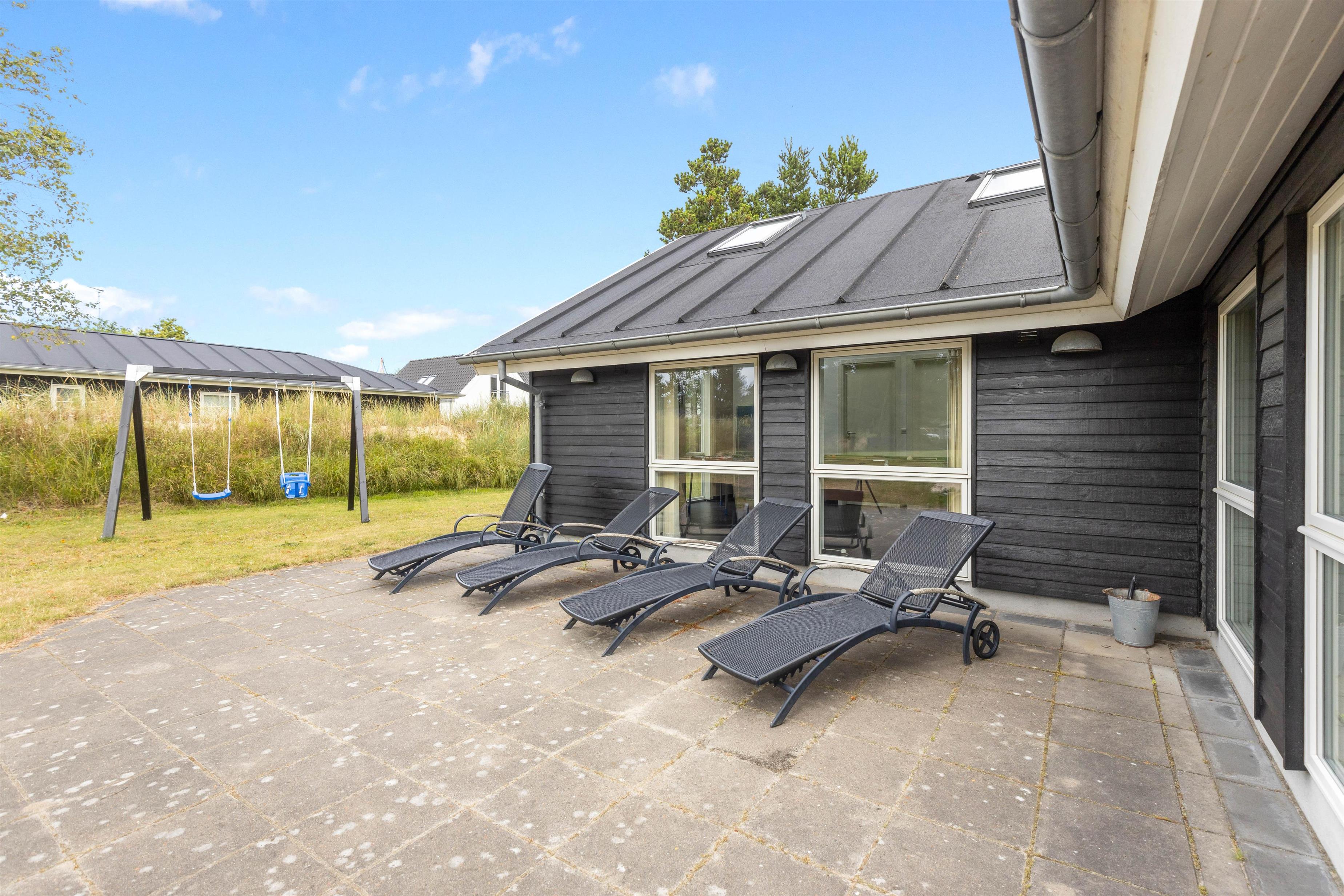 De varme feriedage kan I tilbringe på sommerhuset terrasse. Terrassen er delvist overdækket, så her kan I både finde jer en god plads i solen og trække ind i skyggen, når I har brug for det. Mens de voksne nyder ferien på terrassen, kan børnene lege i sandkassen og gynge på gyngerne.