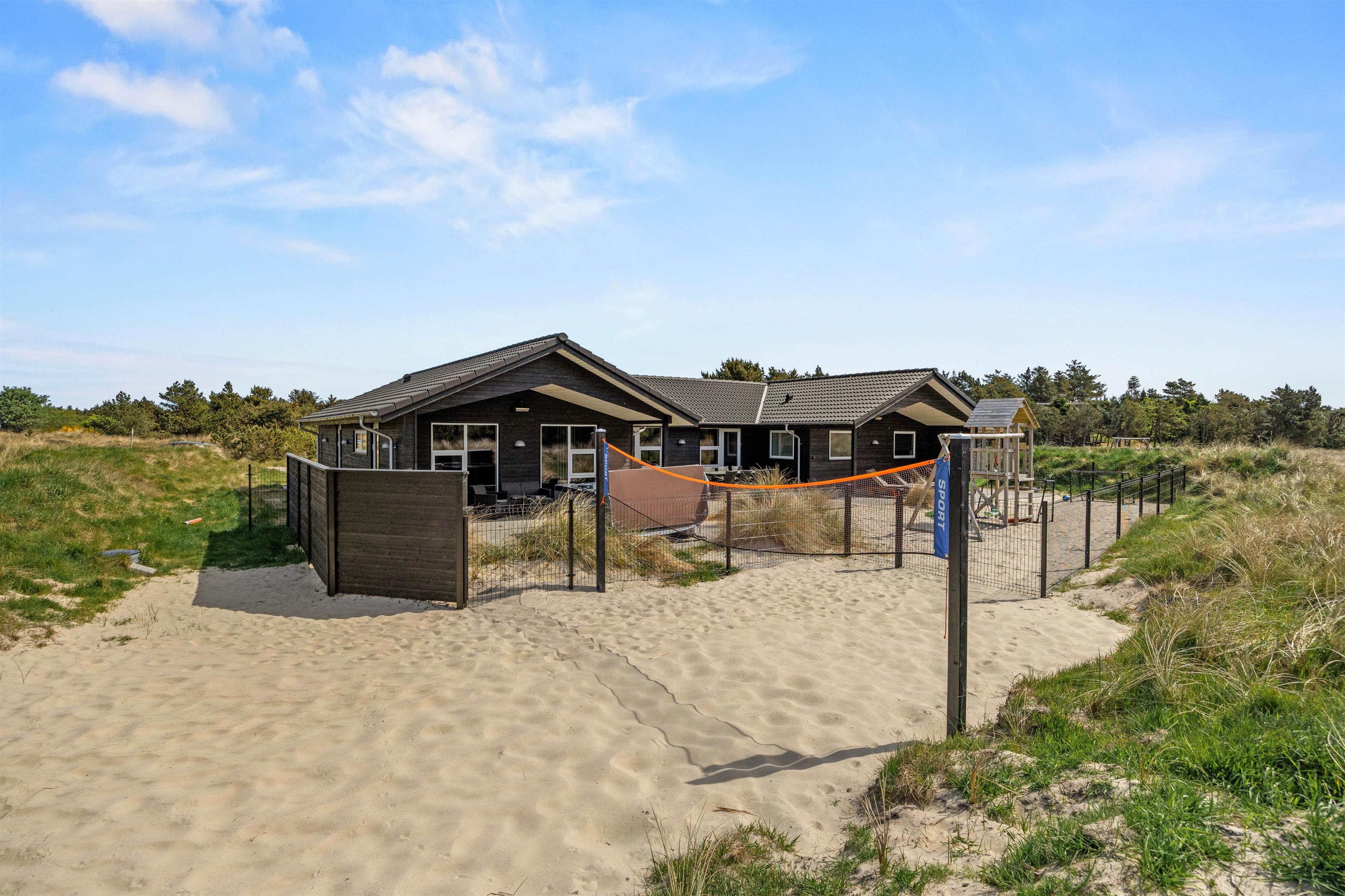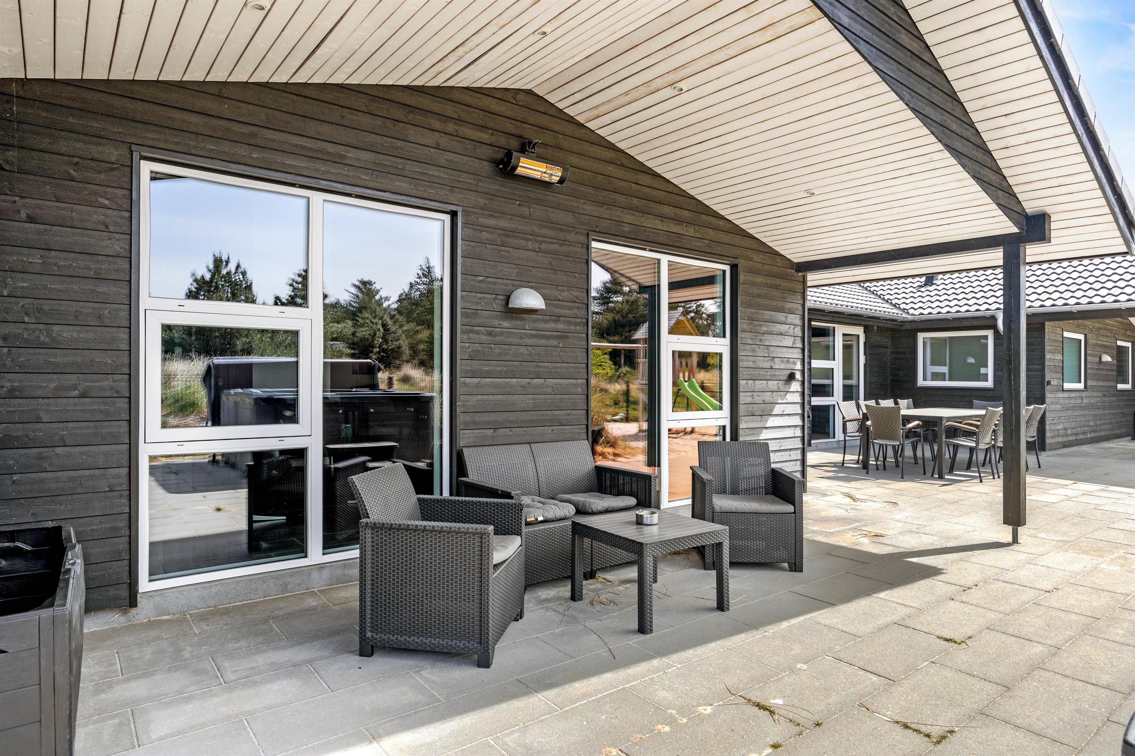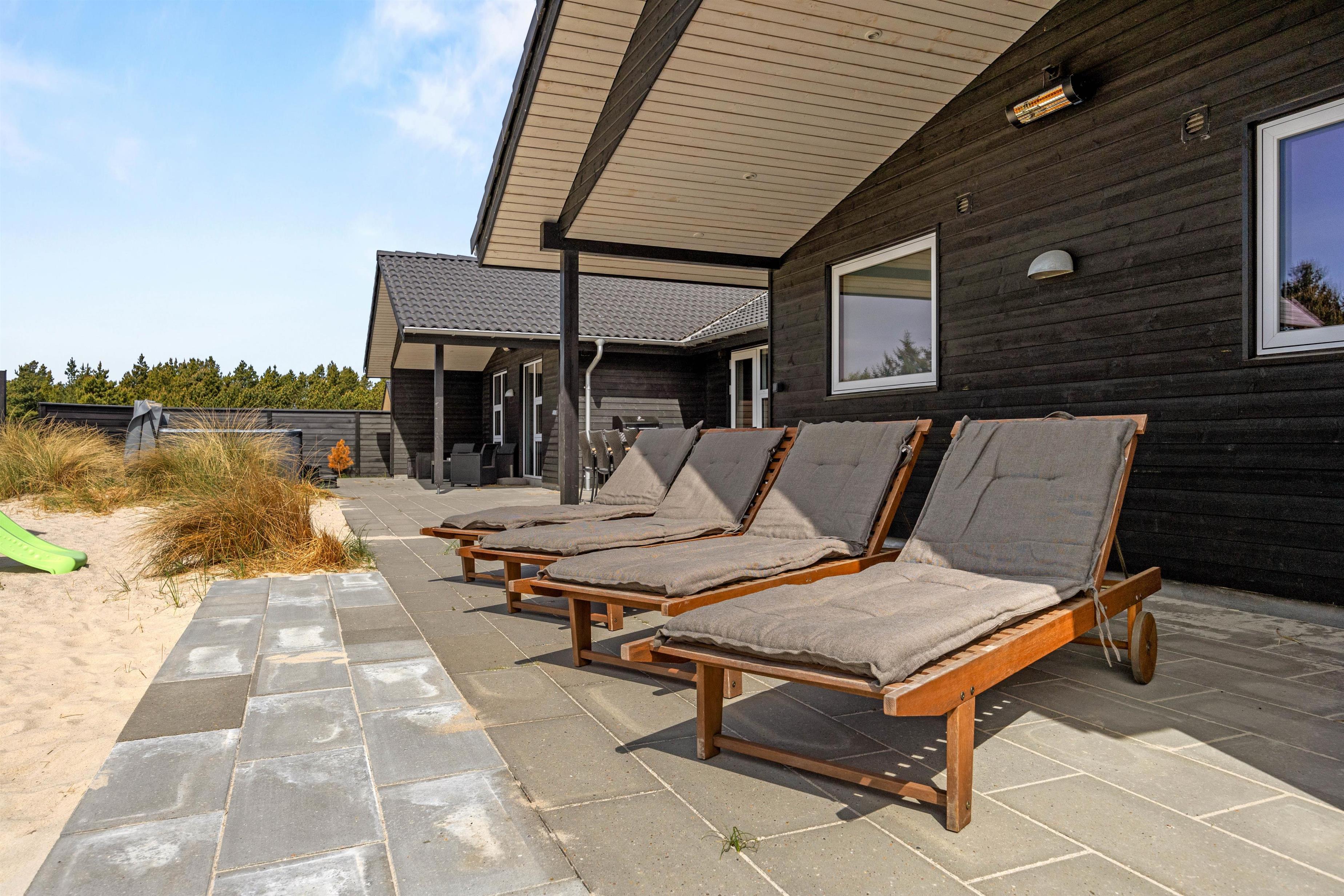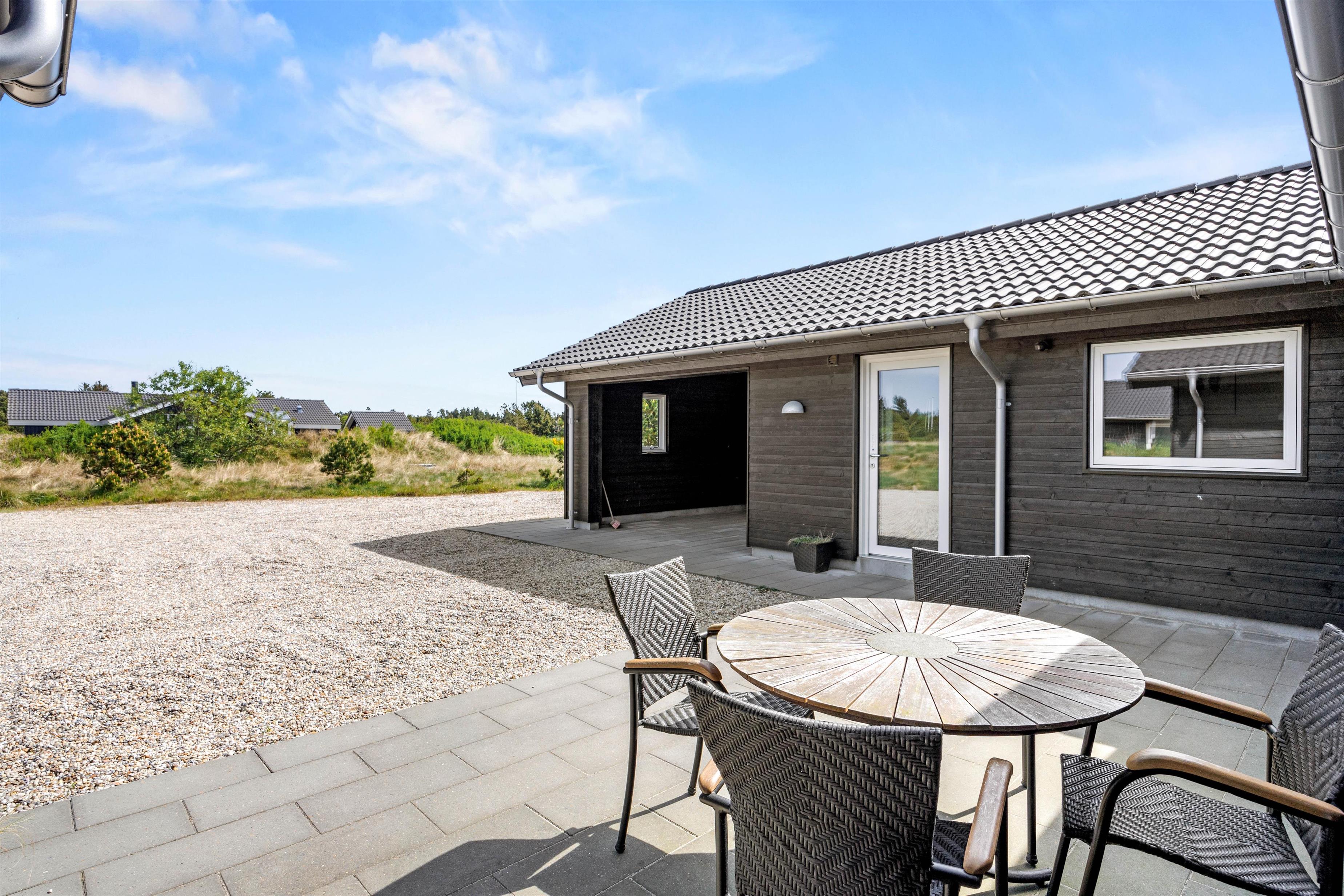 Sommerhuset er beliggende på en dejlig stor klitgrund og har en skøn fliseterrasse i syd. Fra køkkenet har I adgang til terrassen, hvor I kan holde grillaftner med lækre bøffer på grillen og et godt glas vin. Når timerne bliver sene, og luften bliver kølig, kan I gøre brug af terrassevarmeren. En del af grunden og terrassen er indhegnet, så hverken børn eller hunde kan løbe bort - lågerne til hegnet er sågar børnesikrede, så de ikke selv kan åbne lågerne.