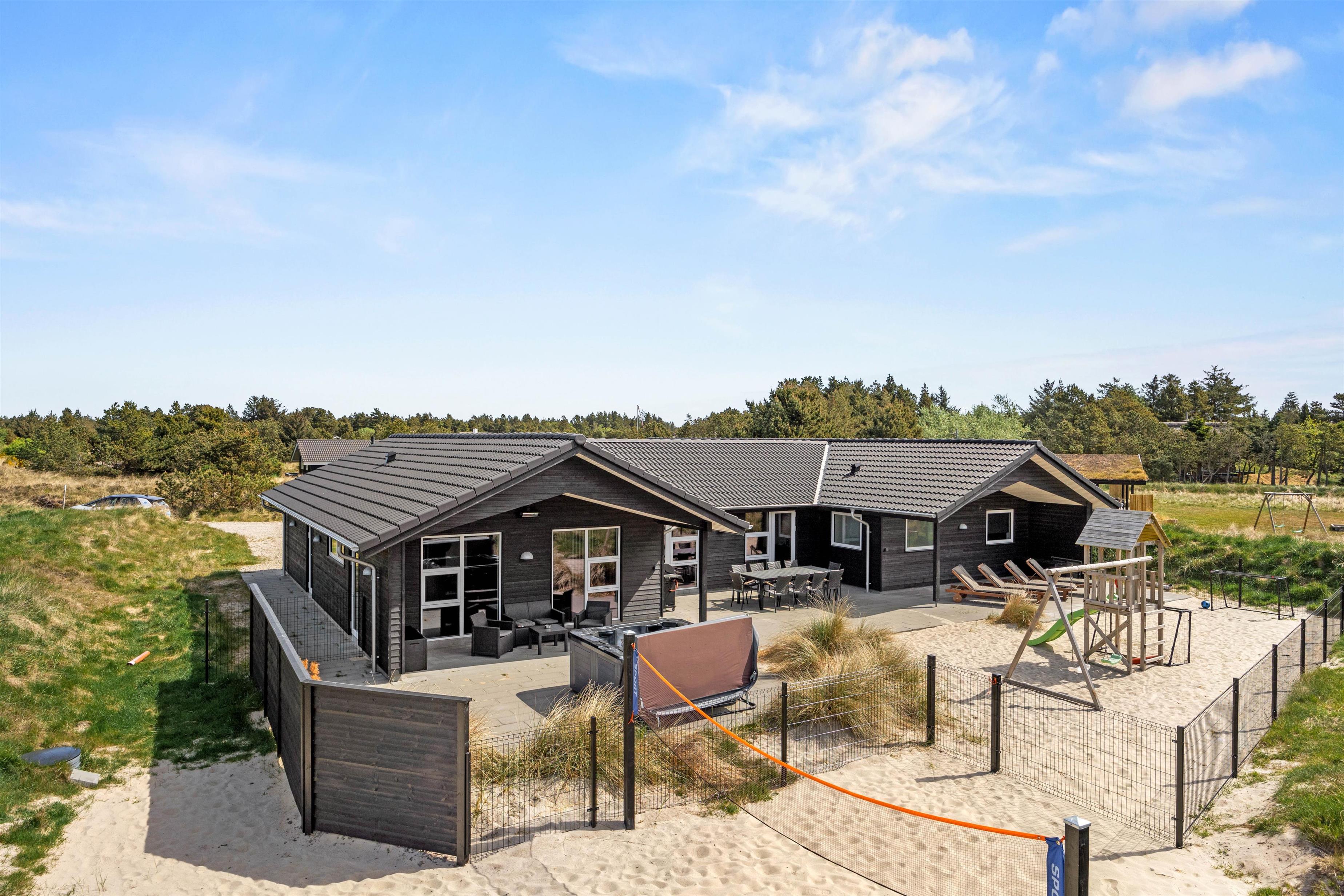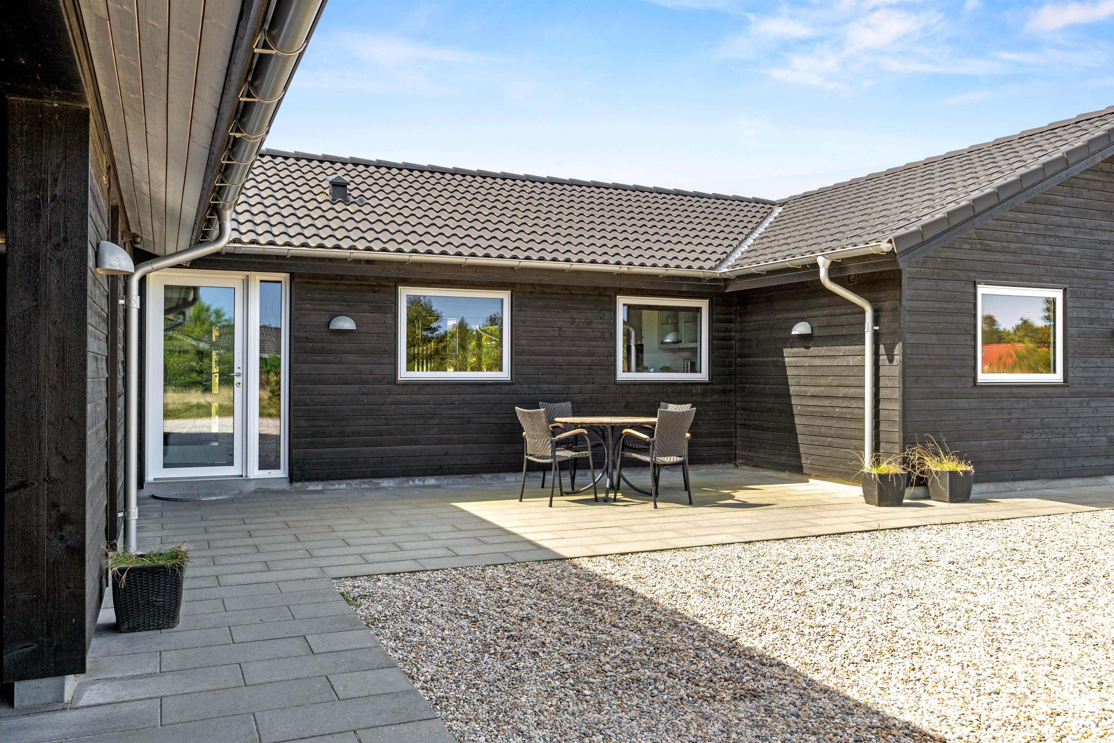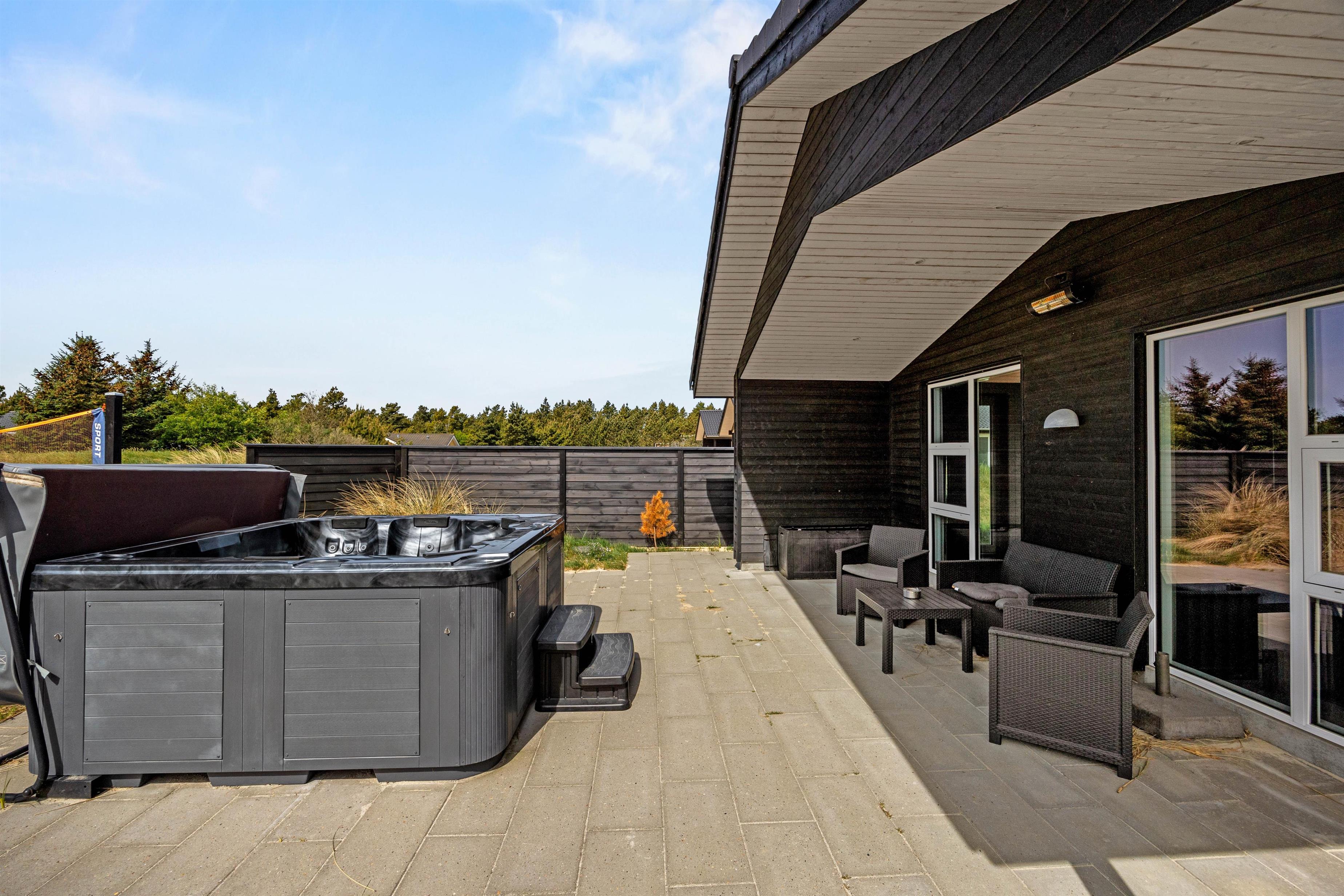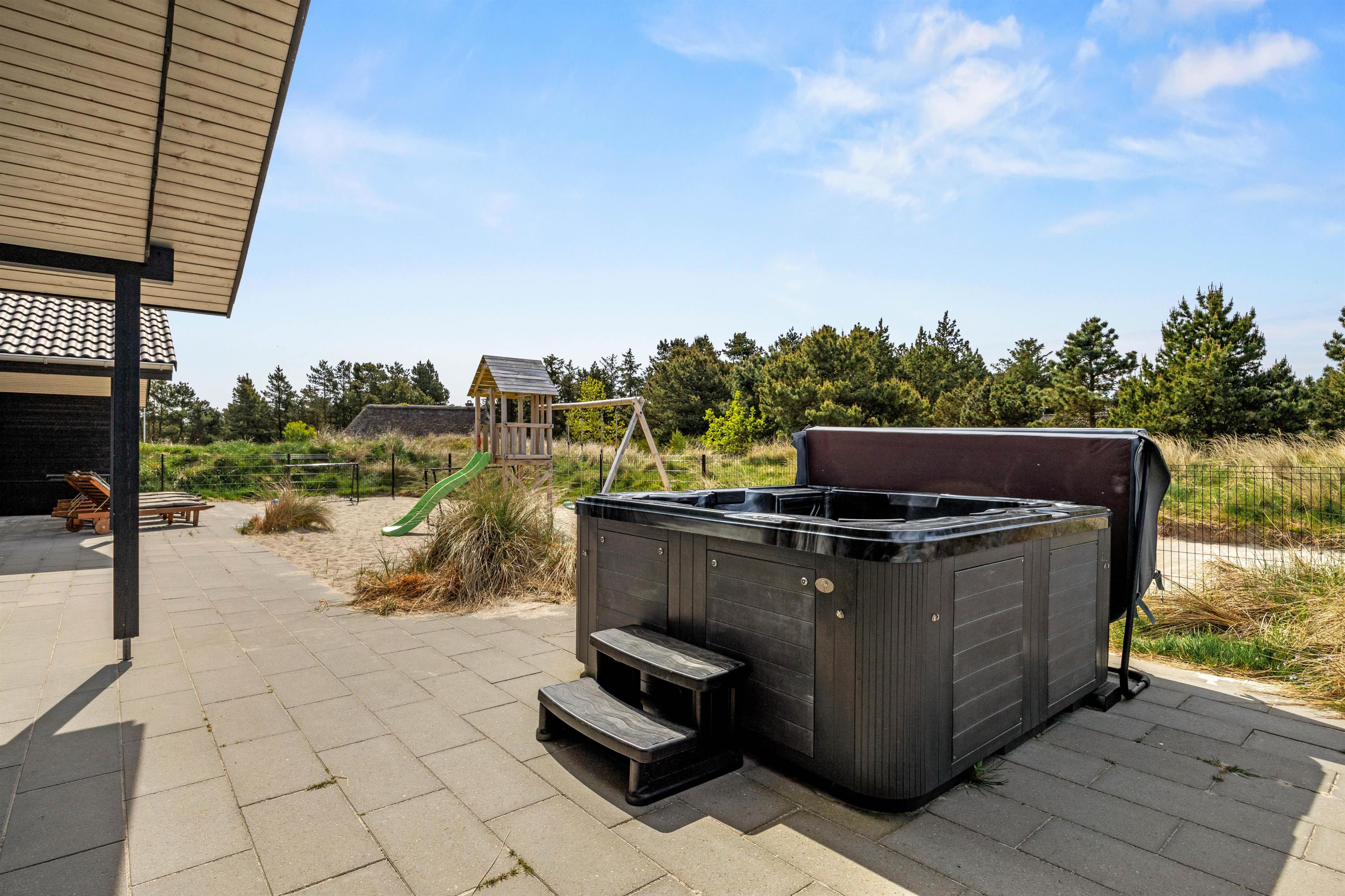 Sommerhuset er beliggende på en dejlig stor klitgrund og har en skøn fliseterrasse i syd. Fra køkkenet har I adgang til terrassen, hvor I kan holde grillaftner med lækre bøffer på grillen og et godt glas vin. Når timerne bliver sene, og luften bliver kølig, kan I gøre brug af terrassevarmeren. En del af grunden og terrassen er indhegnet, så hverken børn eller hunde kan løbe bort - lågerne til hegnet er sågar børnesikrede, så de ikke selv kan åbne lågerne.