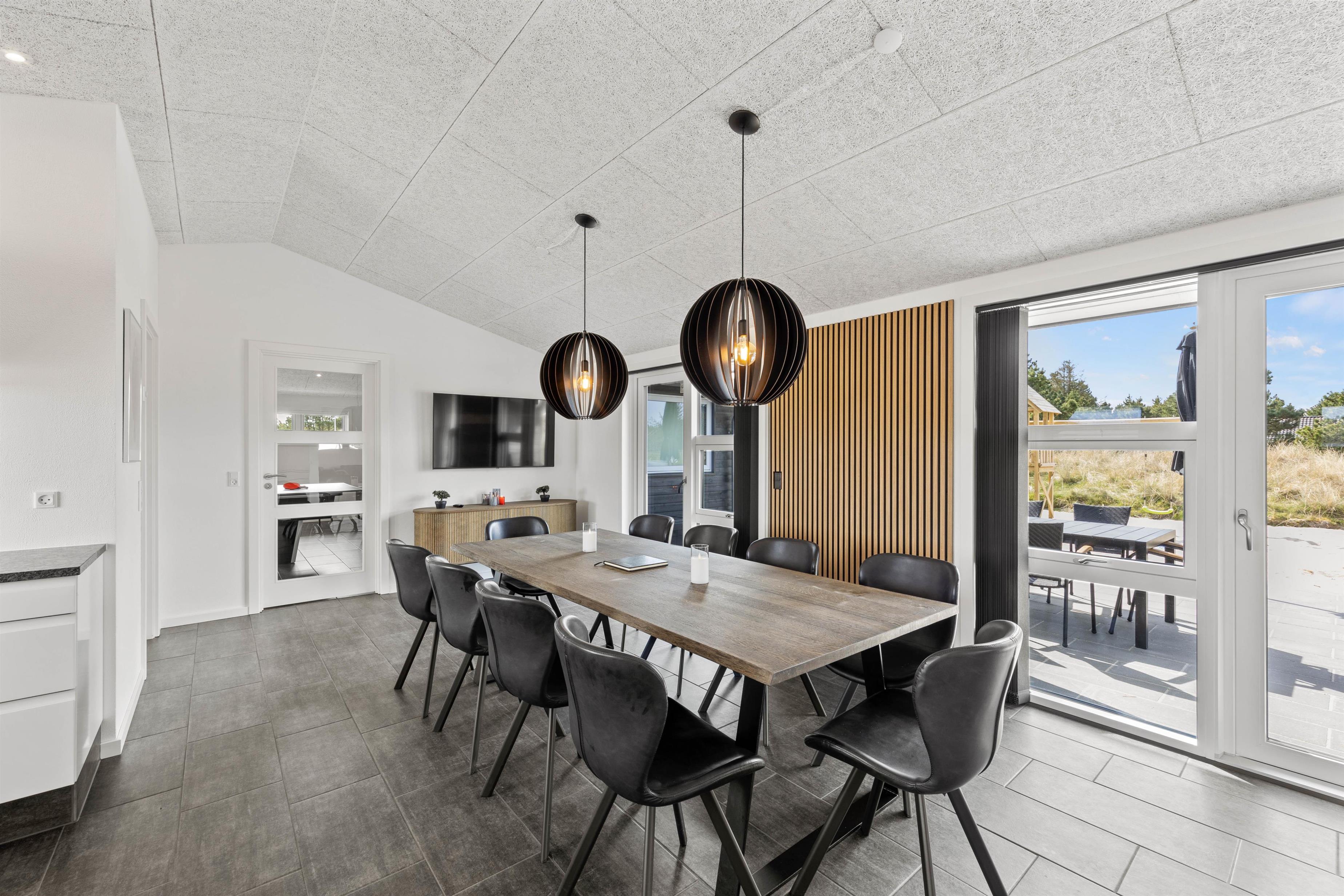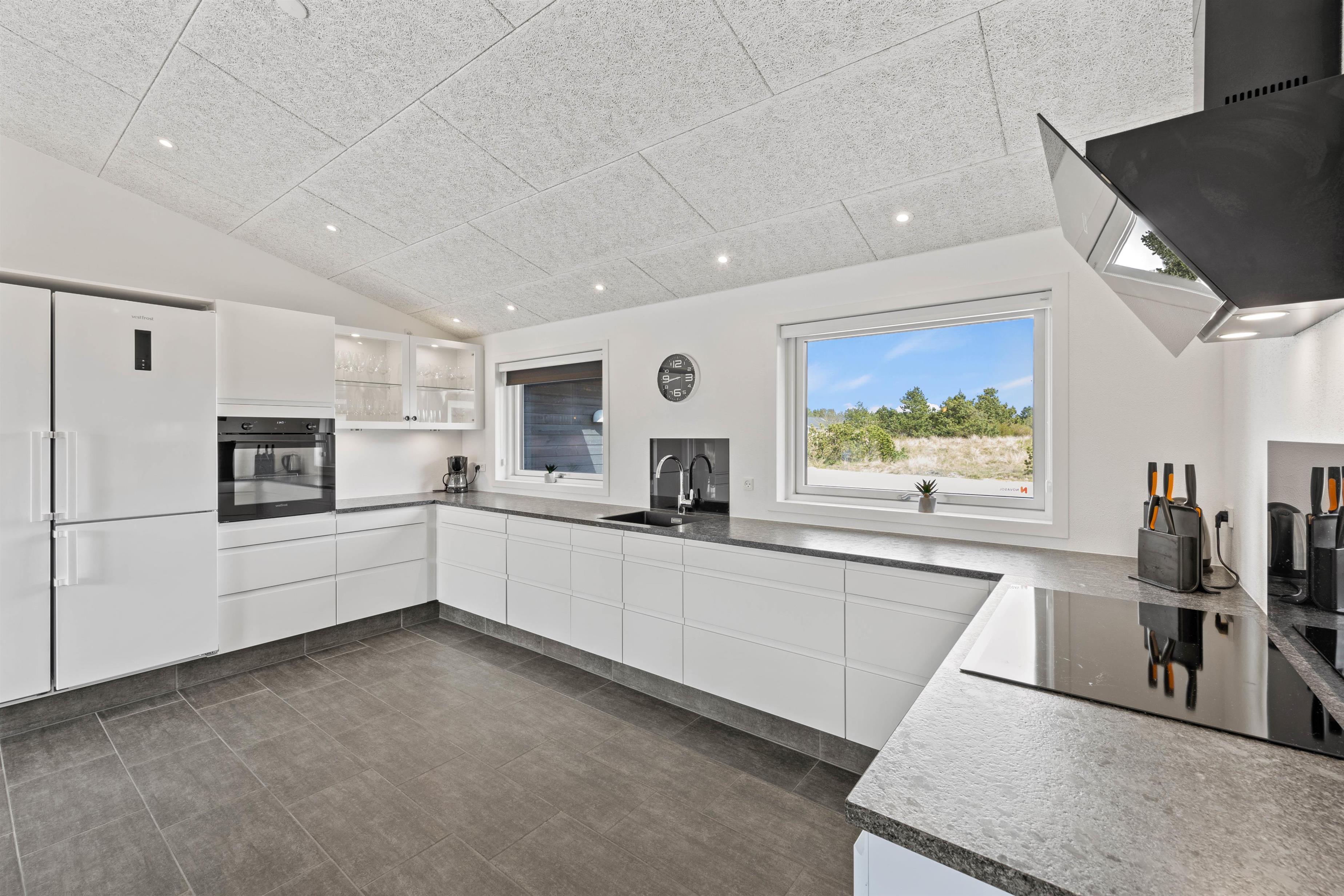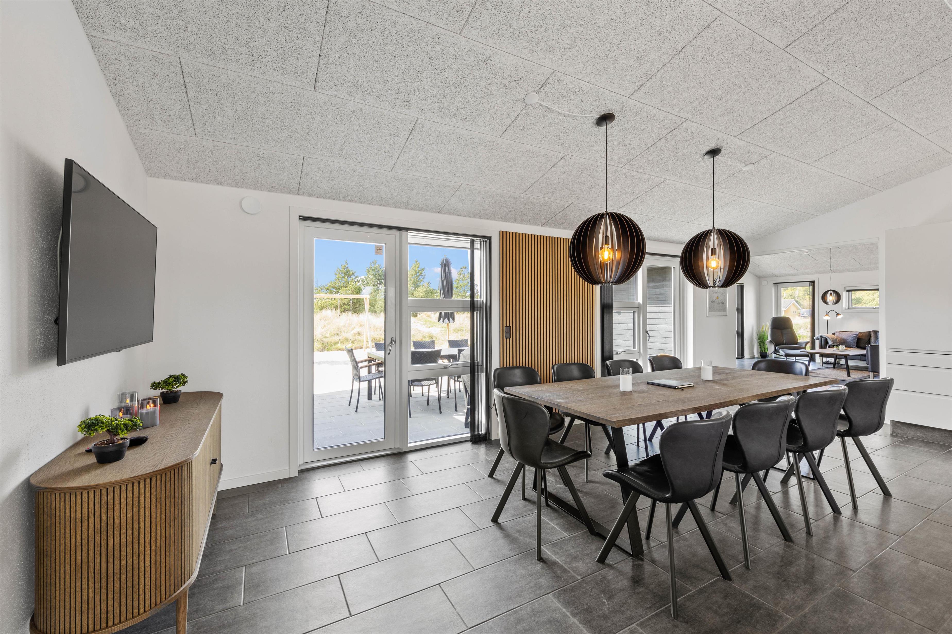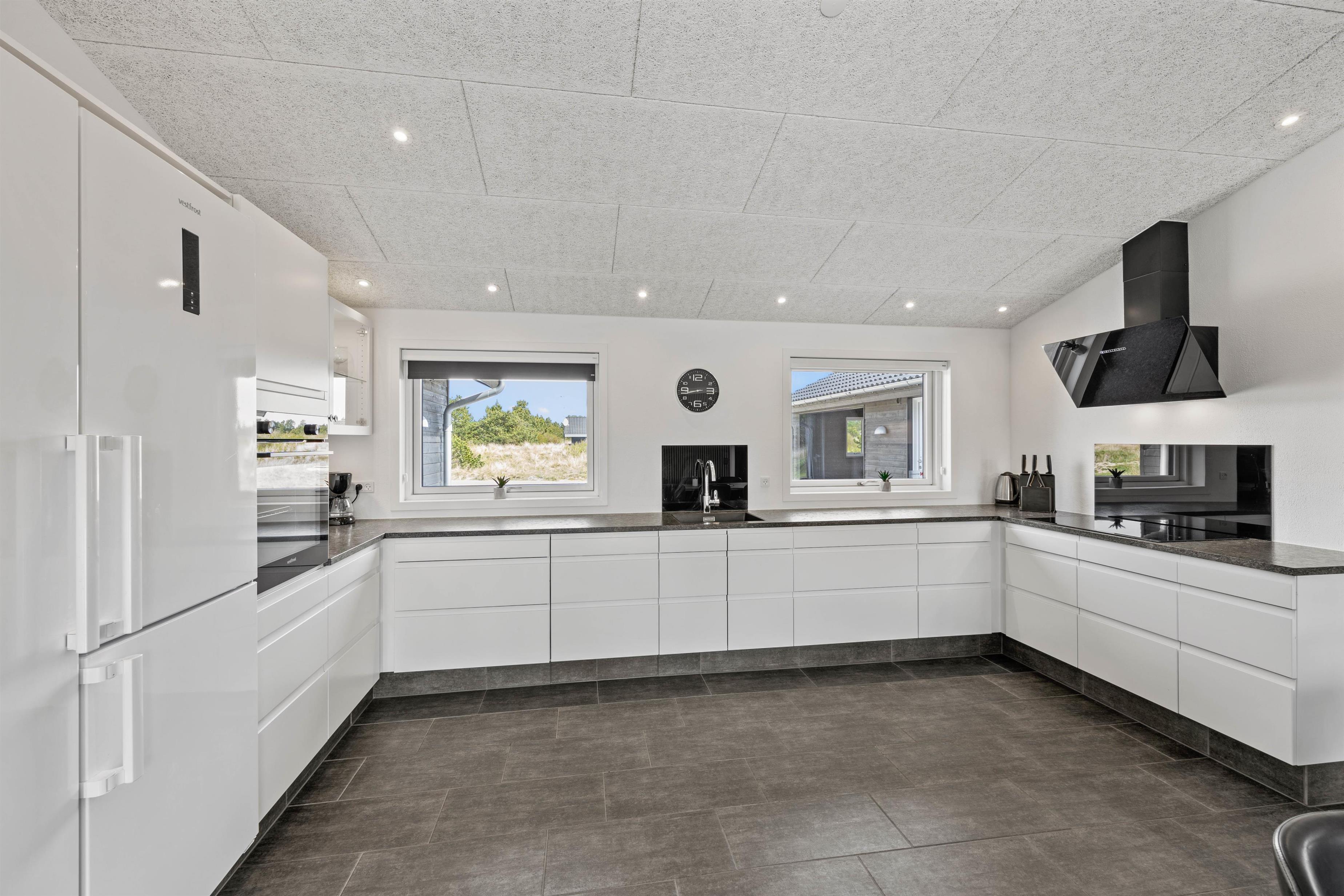 Sommerhuset er beliggende på en dejlig stor klitgrund og har en skøn fliseterrasse i syd. Fra køkkenet har I adgang til terrassen, hvor I kan holde grillaftner med lækre bøffer på grillen og et godt glas vin. Når timerne bliver sene, og luften bliver kølig, kan I gøre brug af terrassevarmeren. En del af grunden og terrassen er indhegnet, så hverken børn eller hunde kan løbe bort - lågerne til hegnet er sågar børnesikrede, så de ikke selv kan åbne lågerne.