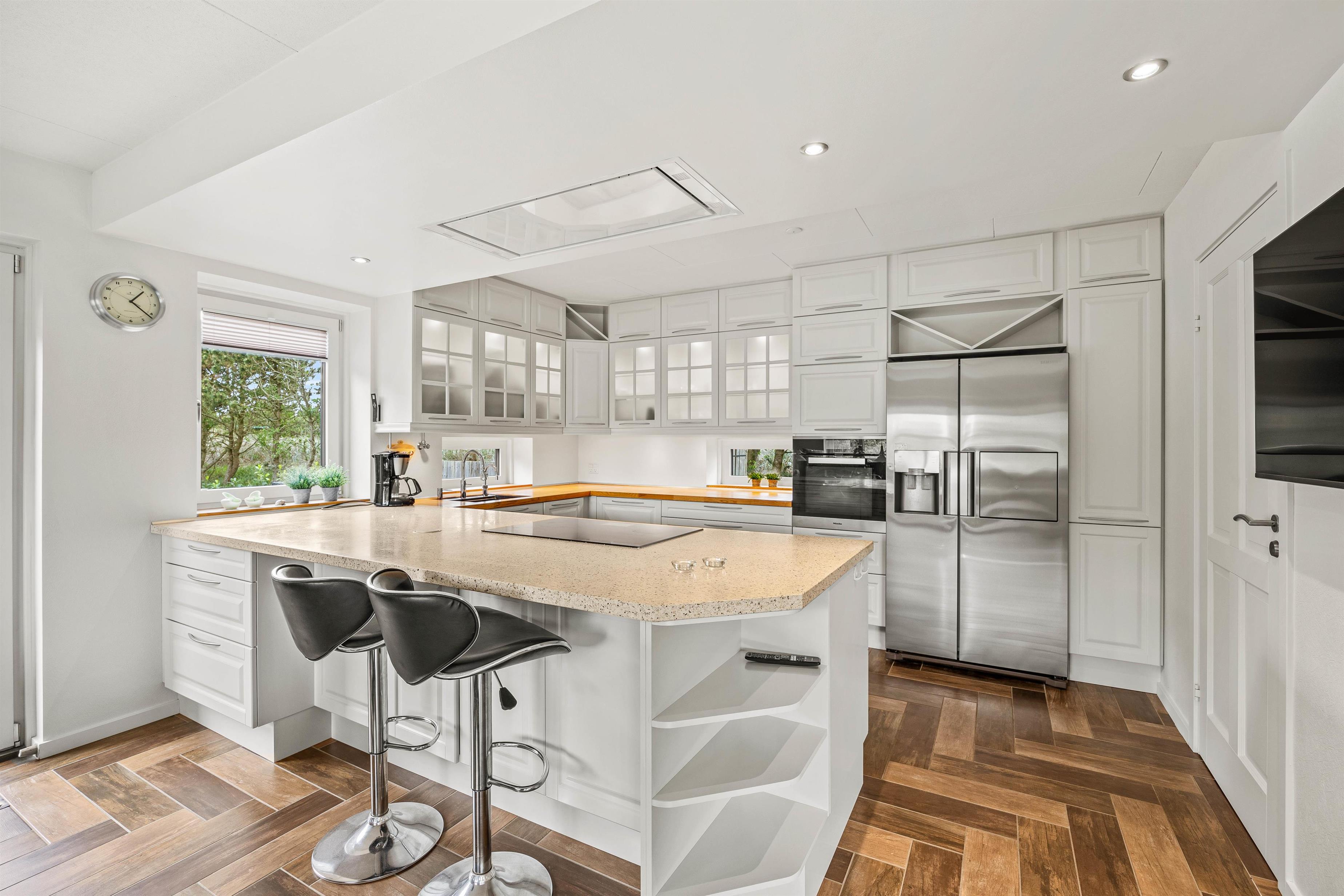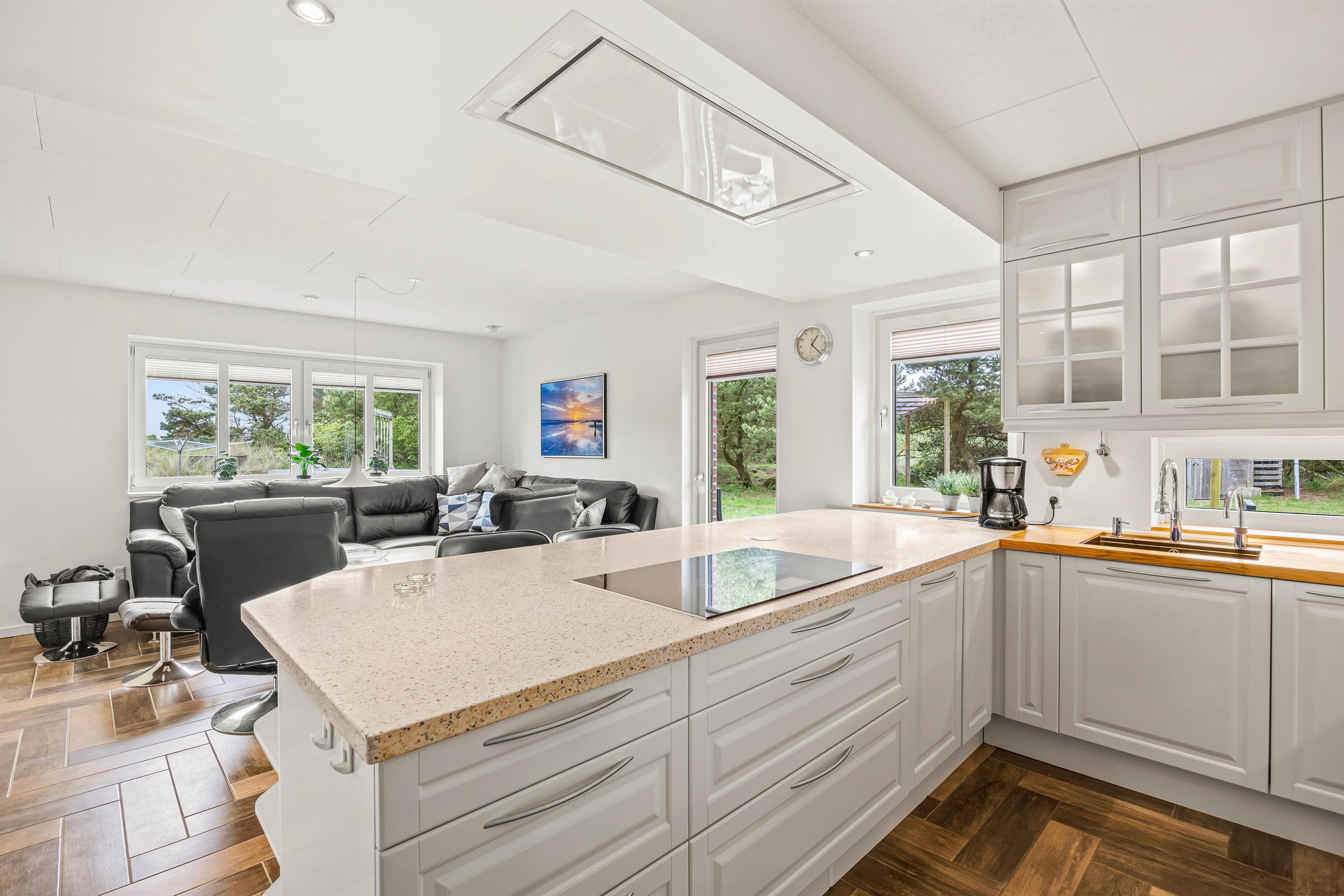 Sommerhusets køkken er veludstyret, og her finder I alt, hvad I skal bruge til at fremtrylle lækre feriemåltider. Efter madlavningen kan I lade opvaskemaskinen klare opvasken, imens I selv sætter jer godt til rette i stuen til en hyggelig filmaften med popcorn og bland selv-slik. Der er danske tv-kanaler i feriehuset.