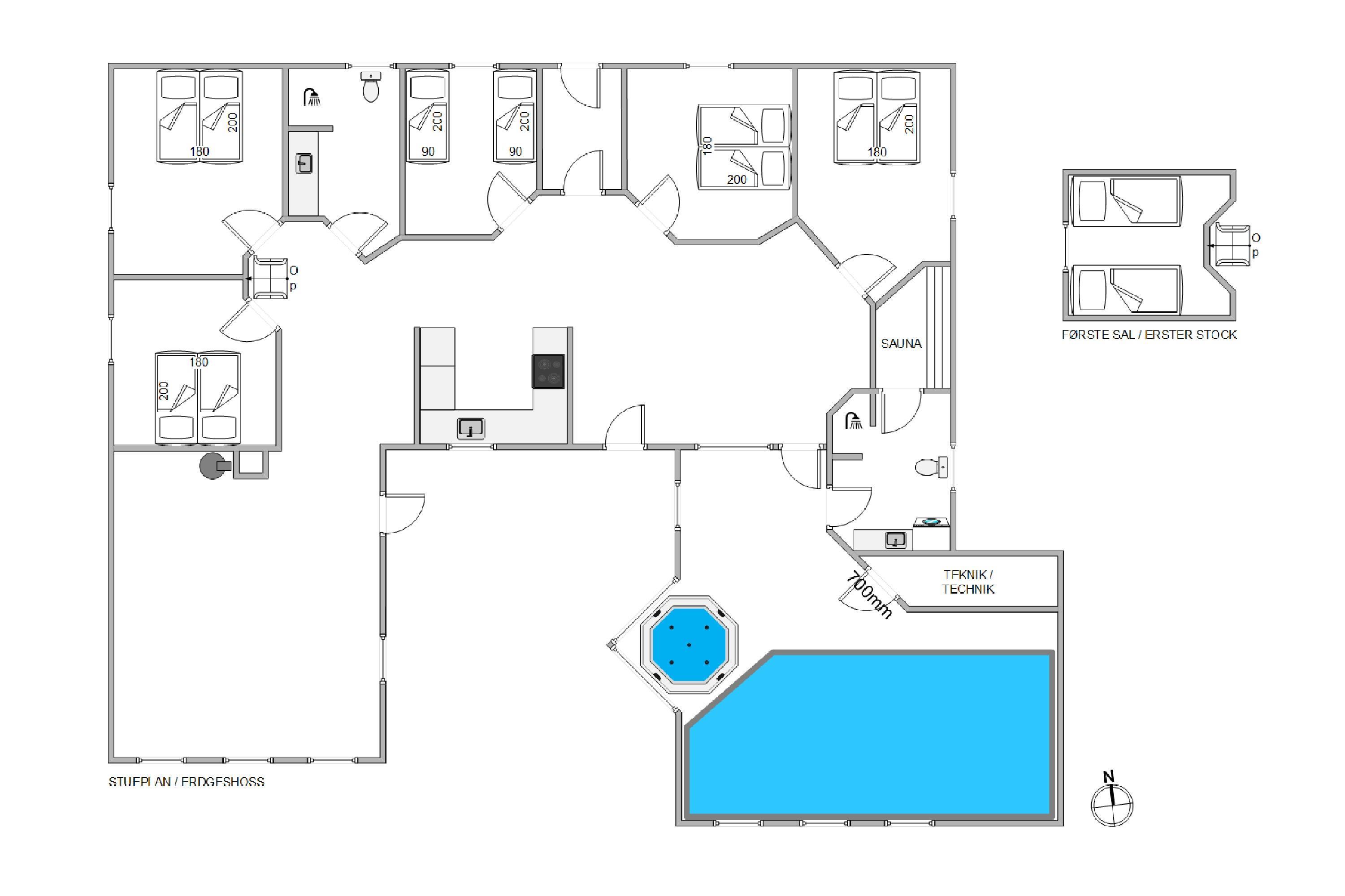 Fra sommerhusets spisestue har I adgang til sommerhusets poolafdeling. Her er der en 18 m2 pool og et spabad. Det er også her I finder det ene af sommerhusets 2 badeværelser med gulvvarme, hvorfra I har adgang til sommerhusets sauna. Her er der altså rig mulighed for afslapning og velvære.