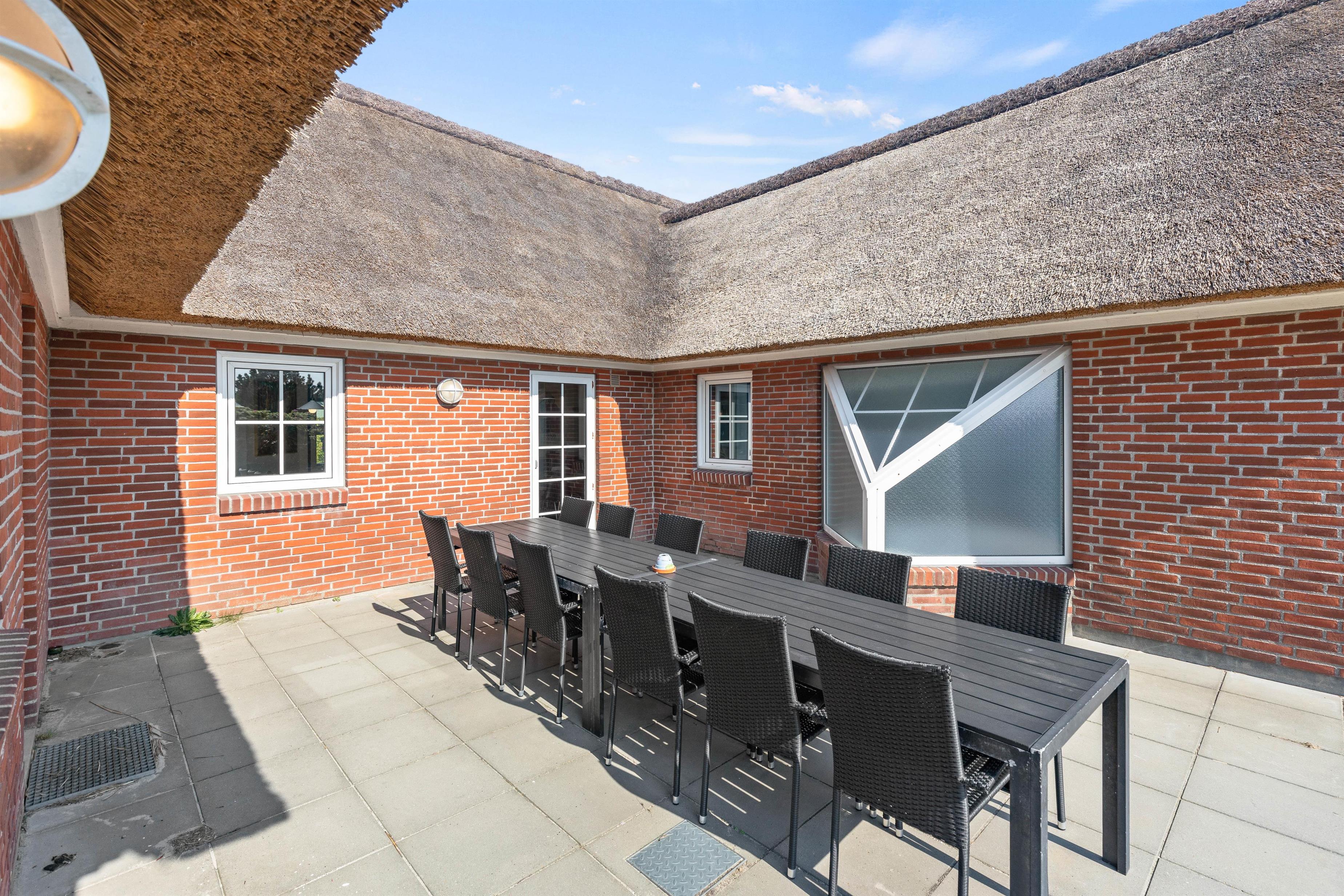 Tilhørende sommerhuset en dejlig, stor terrasse, som er beliggende mellem sommerhusets fløje. Dermed kan I sidde i læ, når grillmiddagen skal nydes på en lun sommeraften. Til børnene er der både sandkasse og gyngestativ på den store plænegrund, hvor der er god plads til sjov og leg.