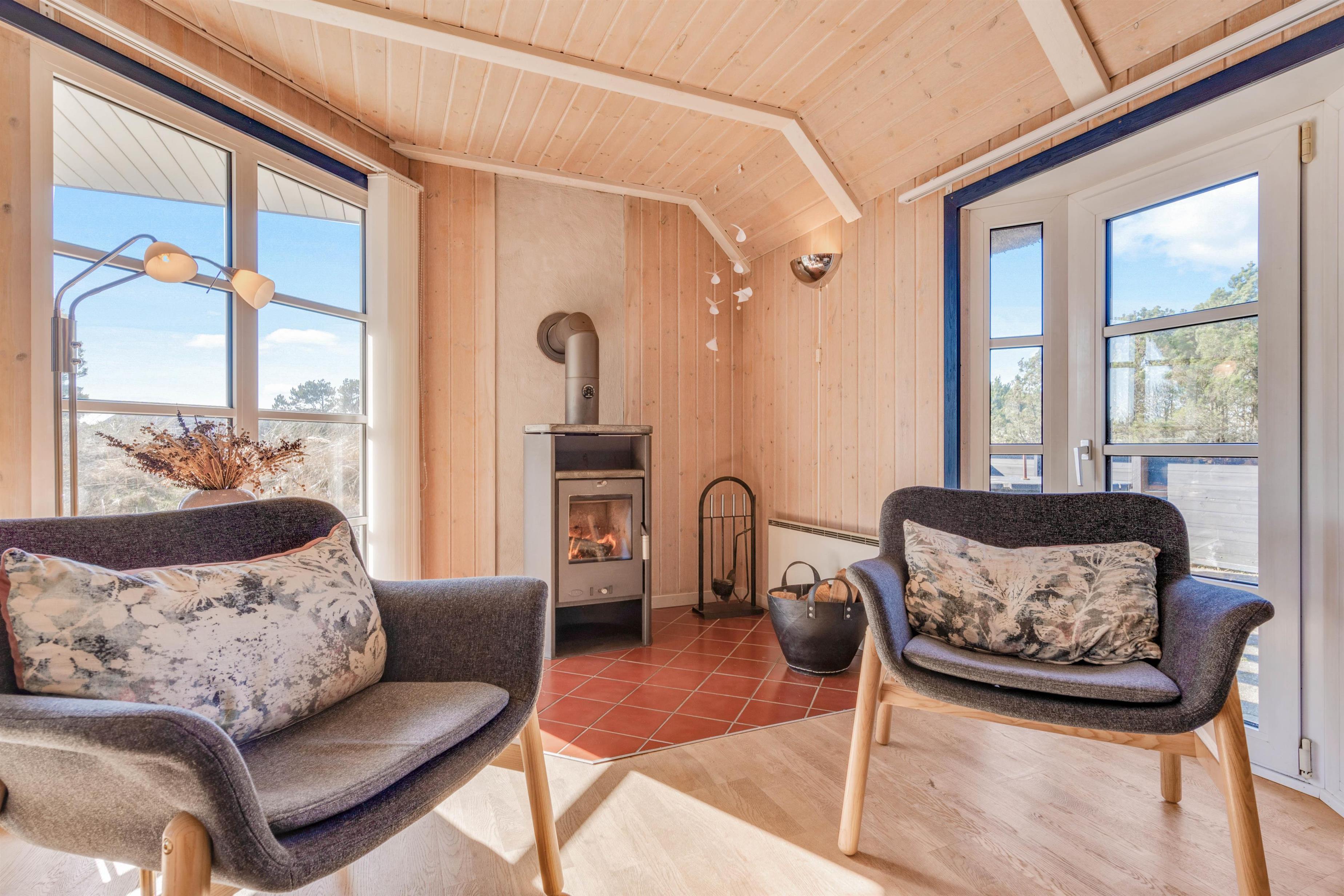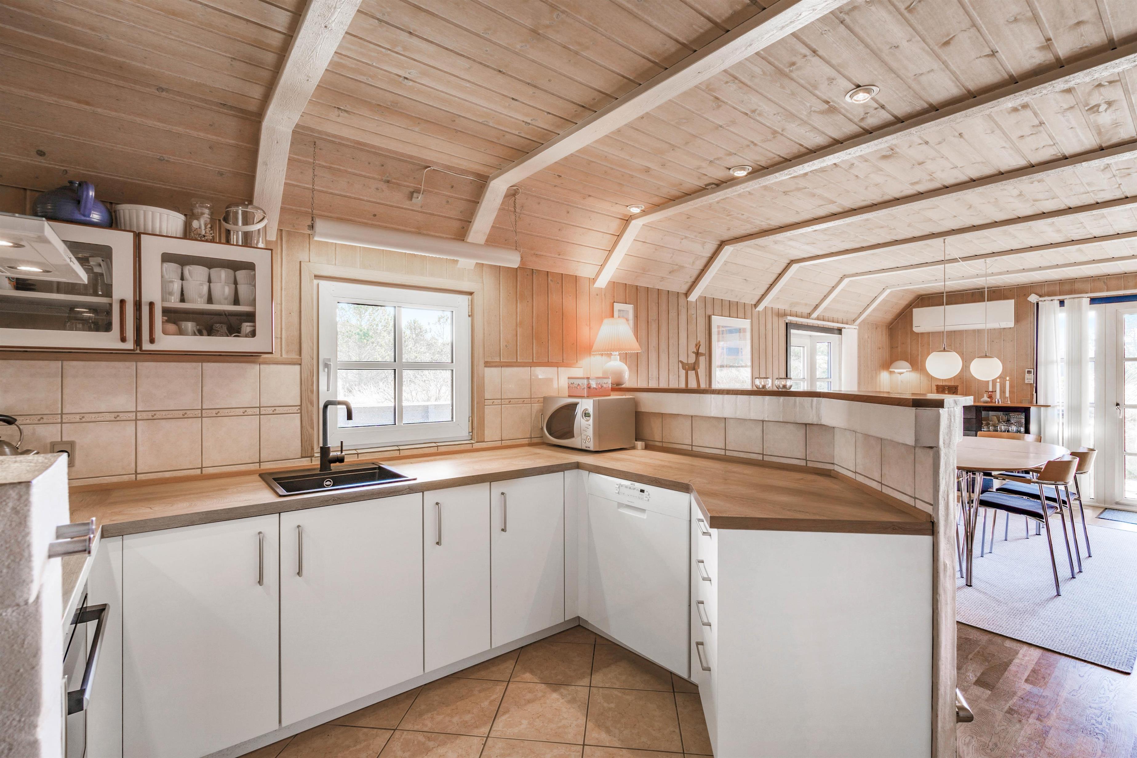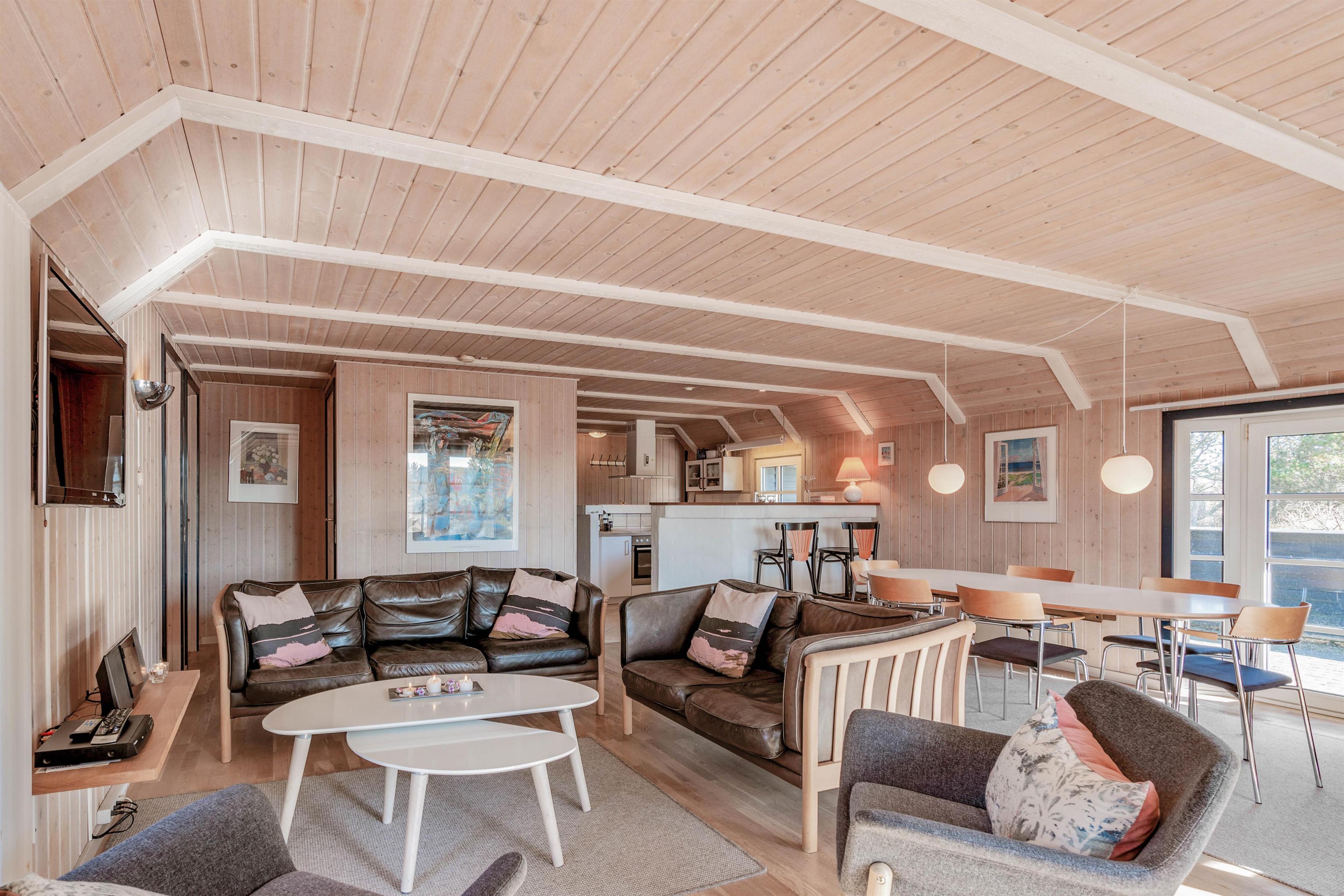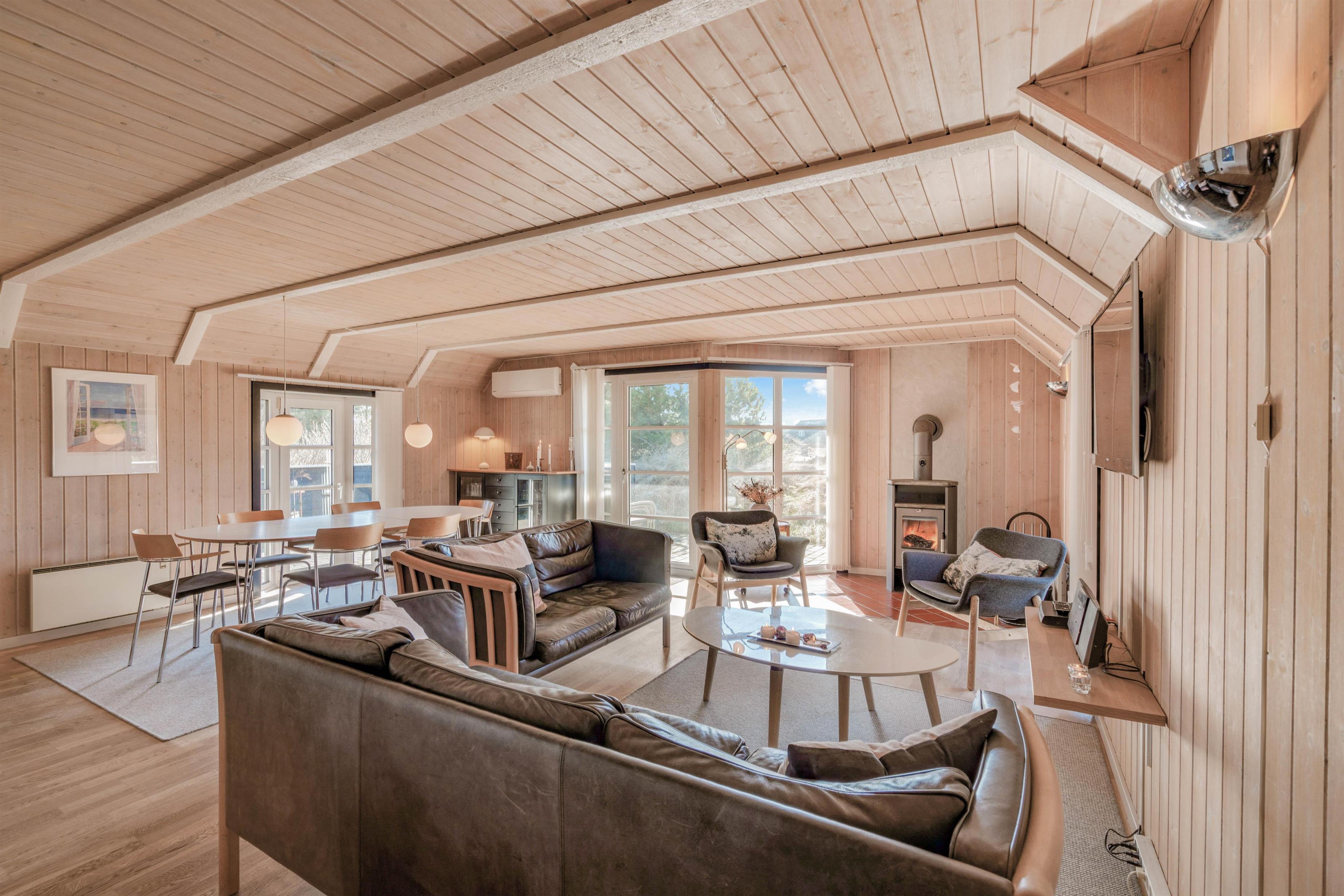 Så snart I træder inden for døren til sommerhuset, kan I mærke den hyggelige feriestemning. Det hyggelige køkken alrum indbyder til fælles madlavning eller hygge i stuen, hvor I kan snakke om dagens aktiviteter, med den hyggelige knitren og varme fra brændeovnen i baggrunden. Her kan I også streame jeres yndlingsserie på fladskærms-tv’et via sommerhusets Chromecast og jeres smartphone.
