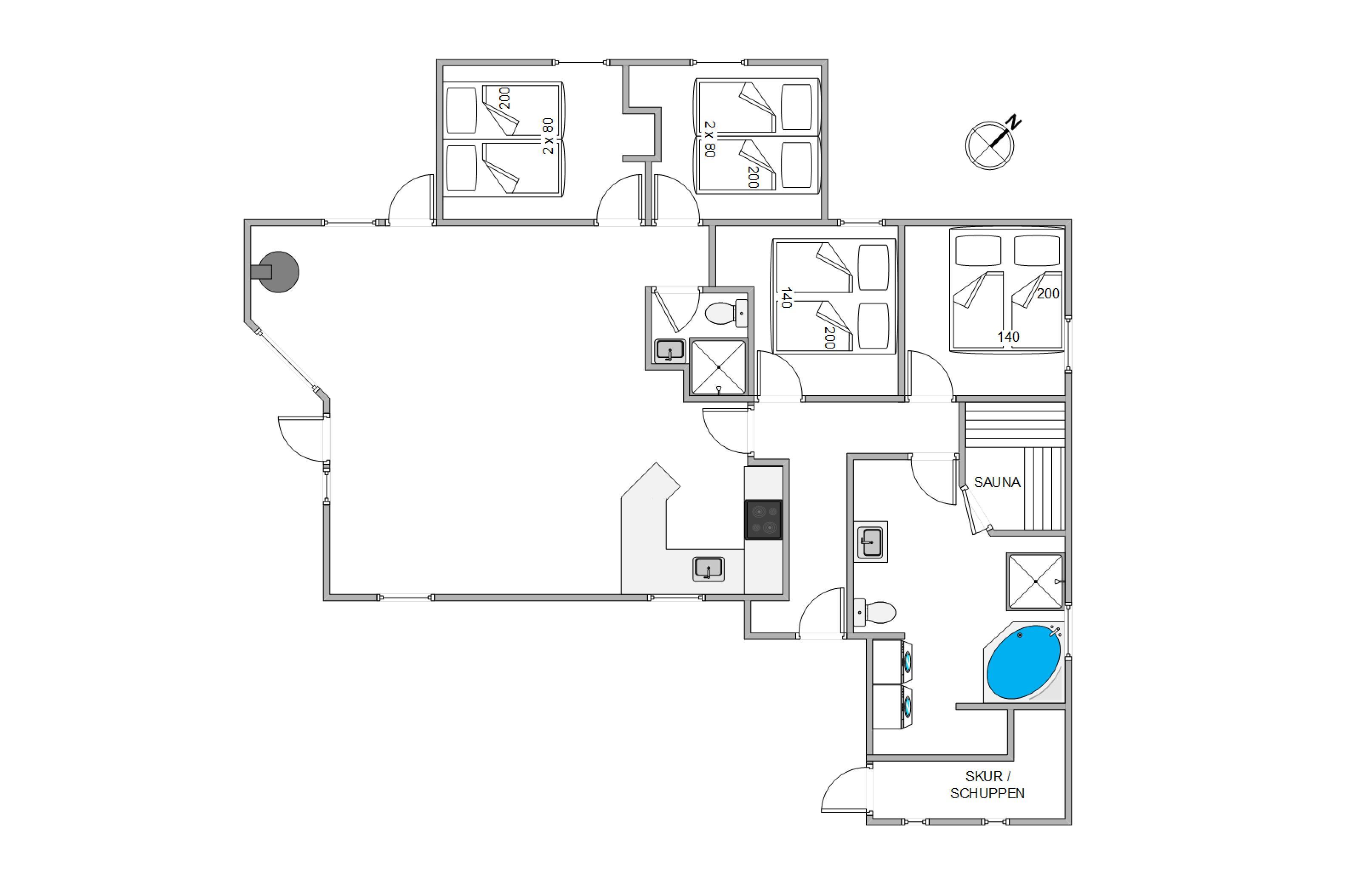 Sommerhusets 8 sovepladser fordeler sig på 4 soveværelser, hvor alle er med dobbeltseng, som sikrer jer en god nattesøvn. Derudover har sommerhuset en varmepumpe, som sørger for en behagelig temperatur til lave omkostninger. Til de daglige gøremål rummer feriehuset også både opvaskemaskine, vaskemaskine og tørretumbler, så de praktiske ting hurtigt er overstået, og ferien rigtigt kan nydes.