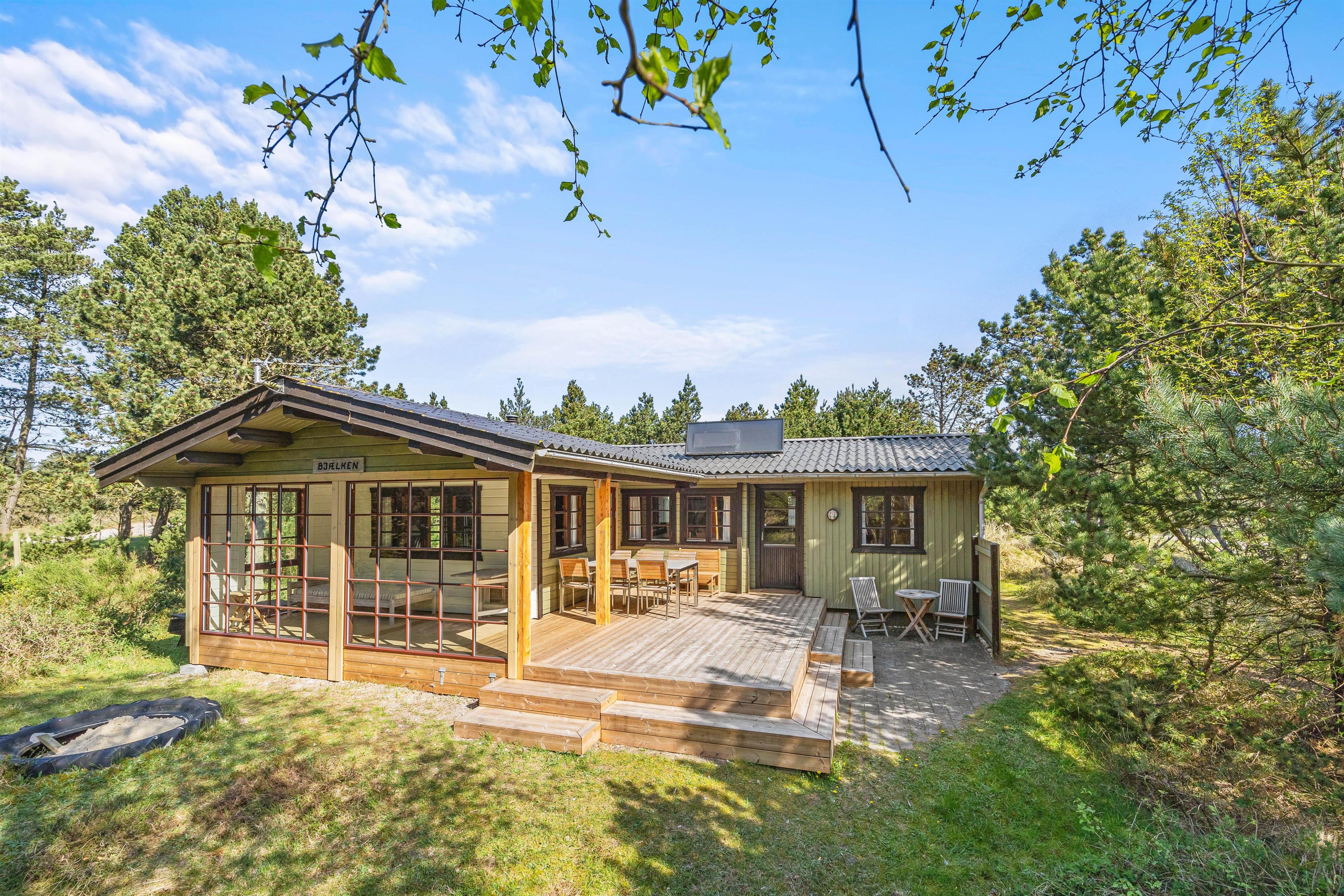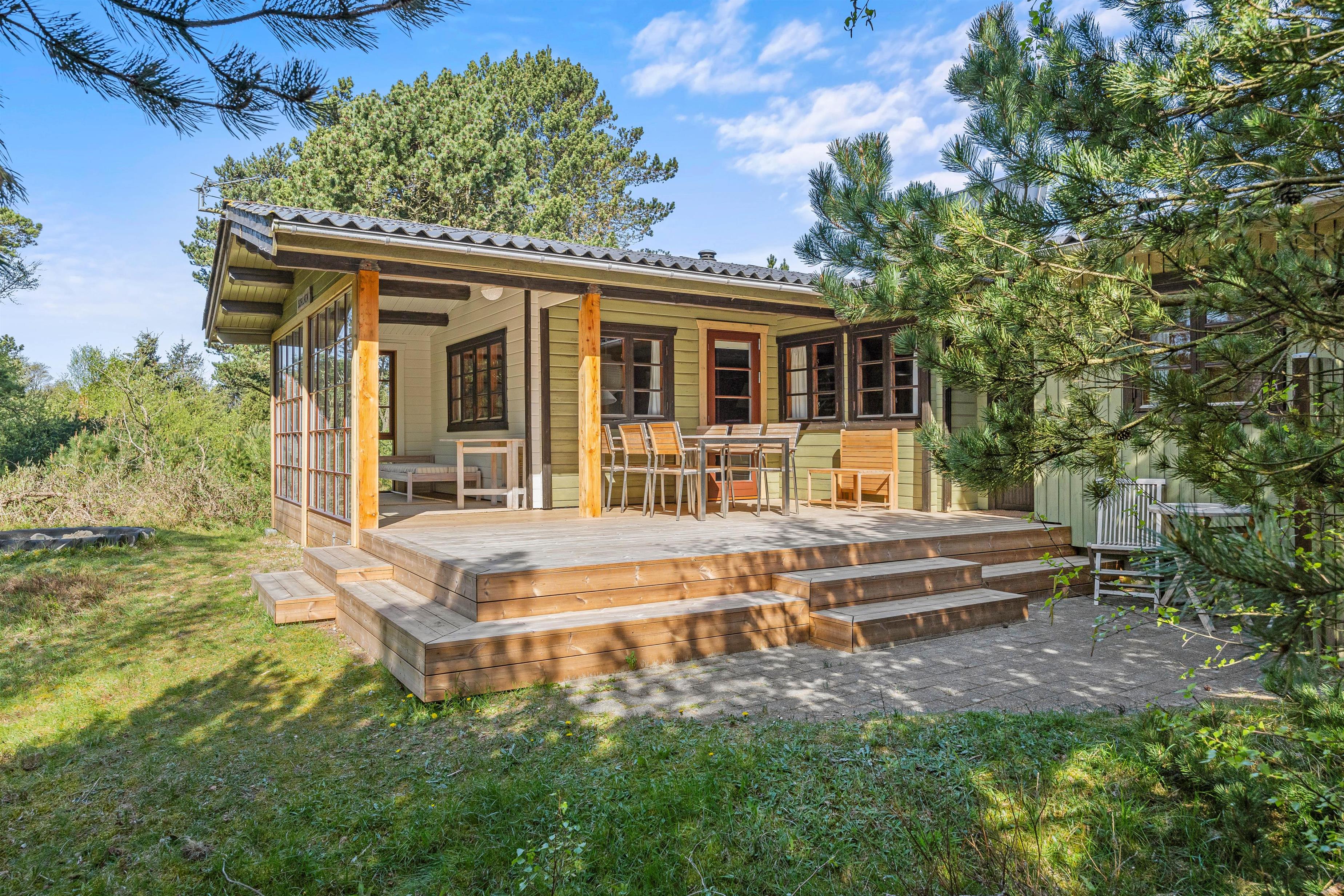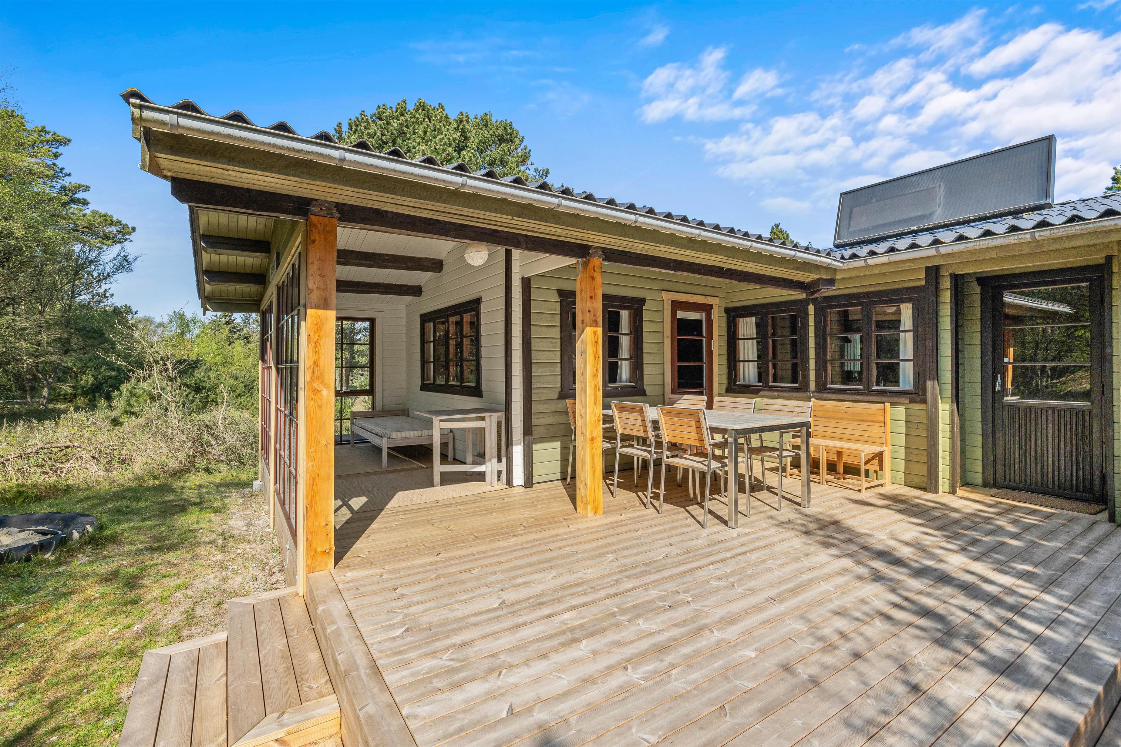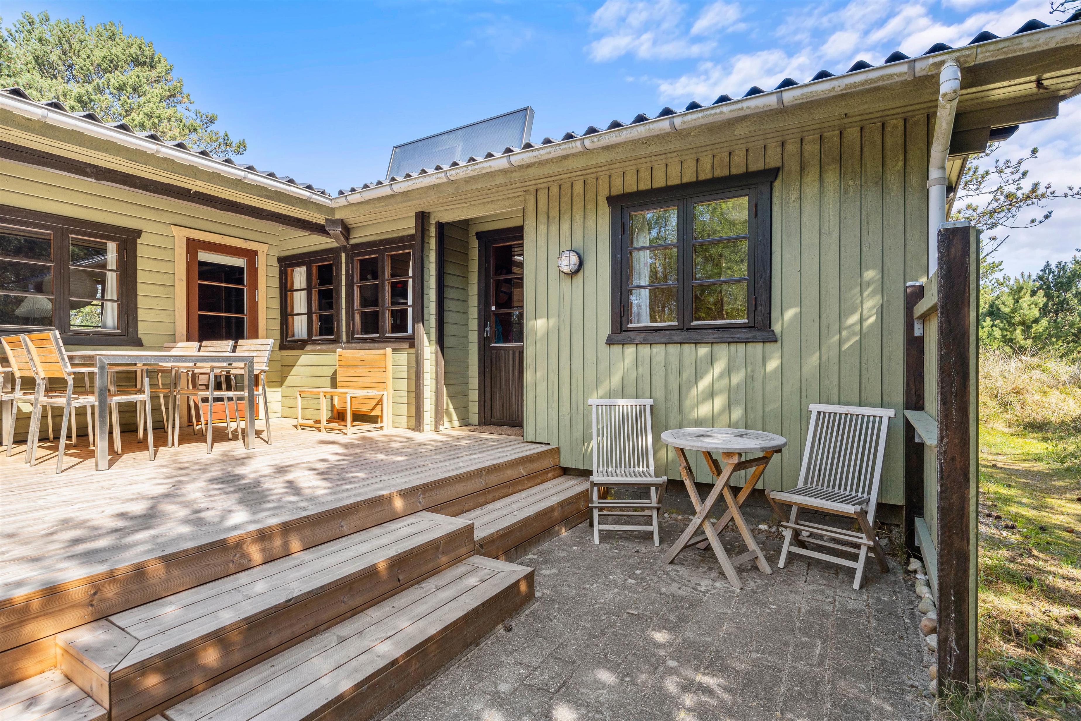 Rundt om feriehuset finder I flere små hyggekroge, hvor I kan sætte jer til rette med en friskbrygget kop kaffe og en spændende bog. Den store, delvist overdækkede terrasse sørger for, at I kan nyde den friske luft og de grønne omgivelser i al slags vejr - og med liggestole, havemøbler og grill til rådighed kan I tilbringe hele dagen udendørs.