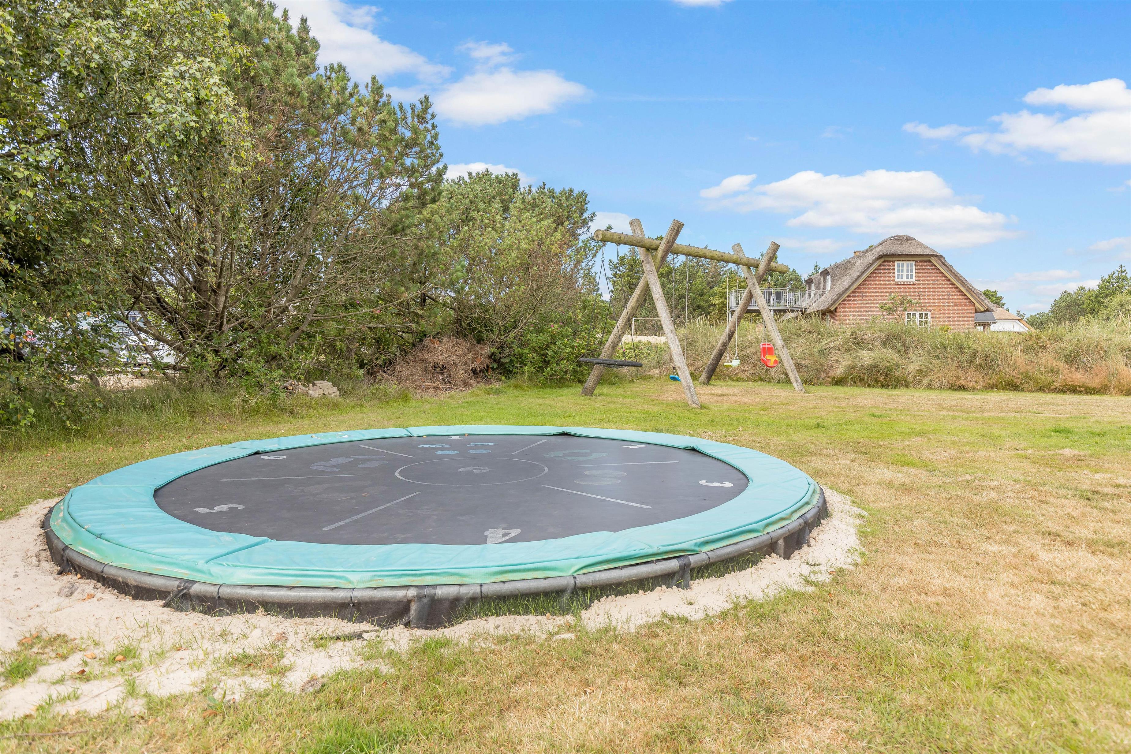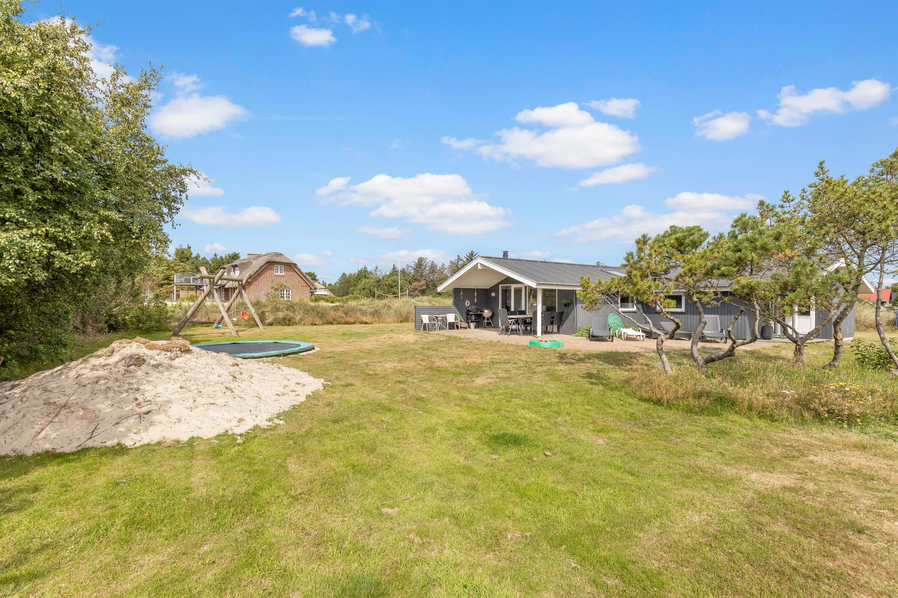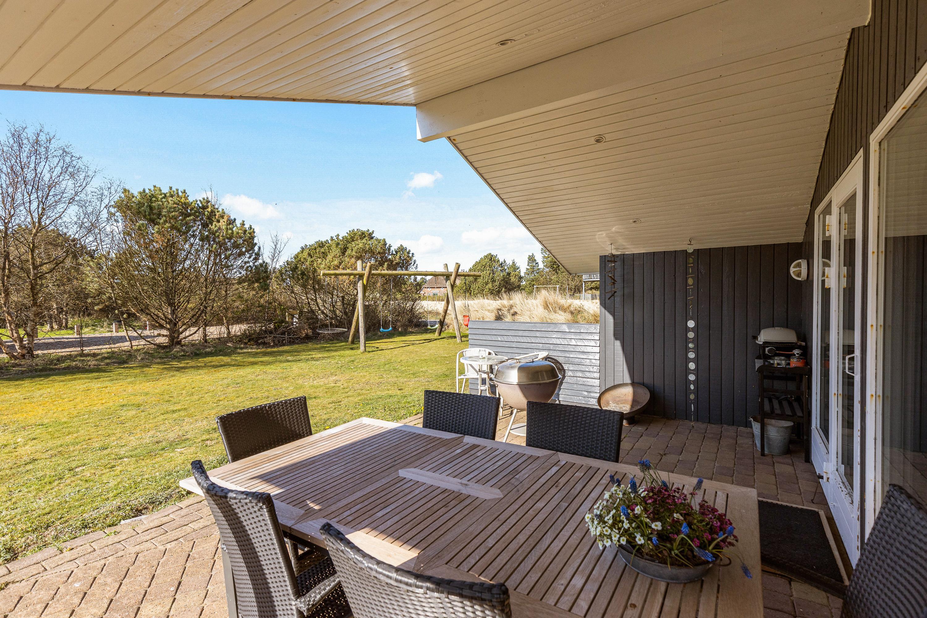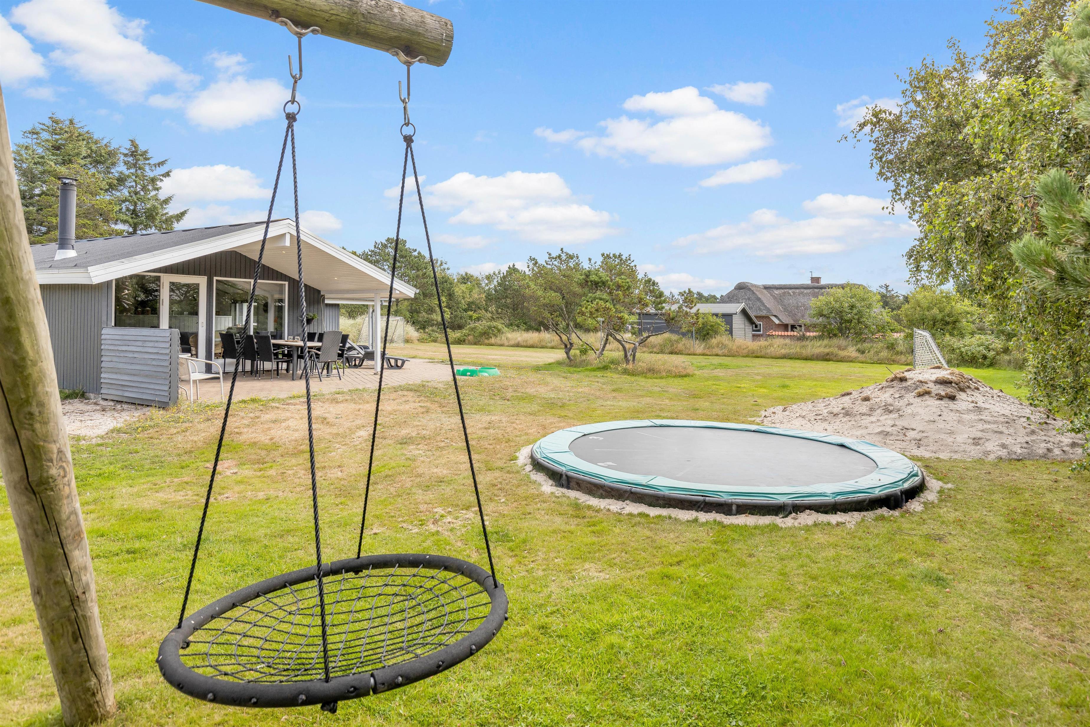 Sommerhuset har ikke kun et hyggeligt indre, der leder tankerne hen på den klassiske sommerhusferie. Også beliggenheden hjælper godt på vej. Her får I masser af grøn natur, som kan nydes fra den delvist overdækkede terrasse, og der er sørget for gyngestativ og sandkasse til de yngste feriegæster. Både børnene og hundene vil elske den store græsplæne, hvor de kan lege løs, mens I slapper af i solen.