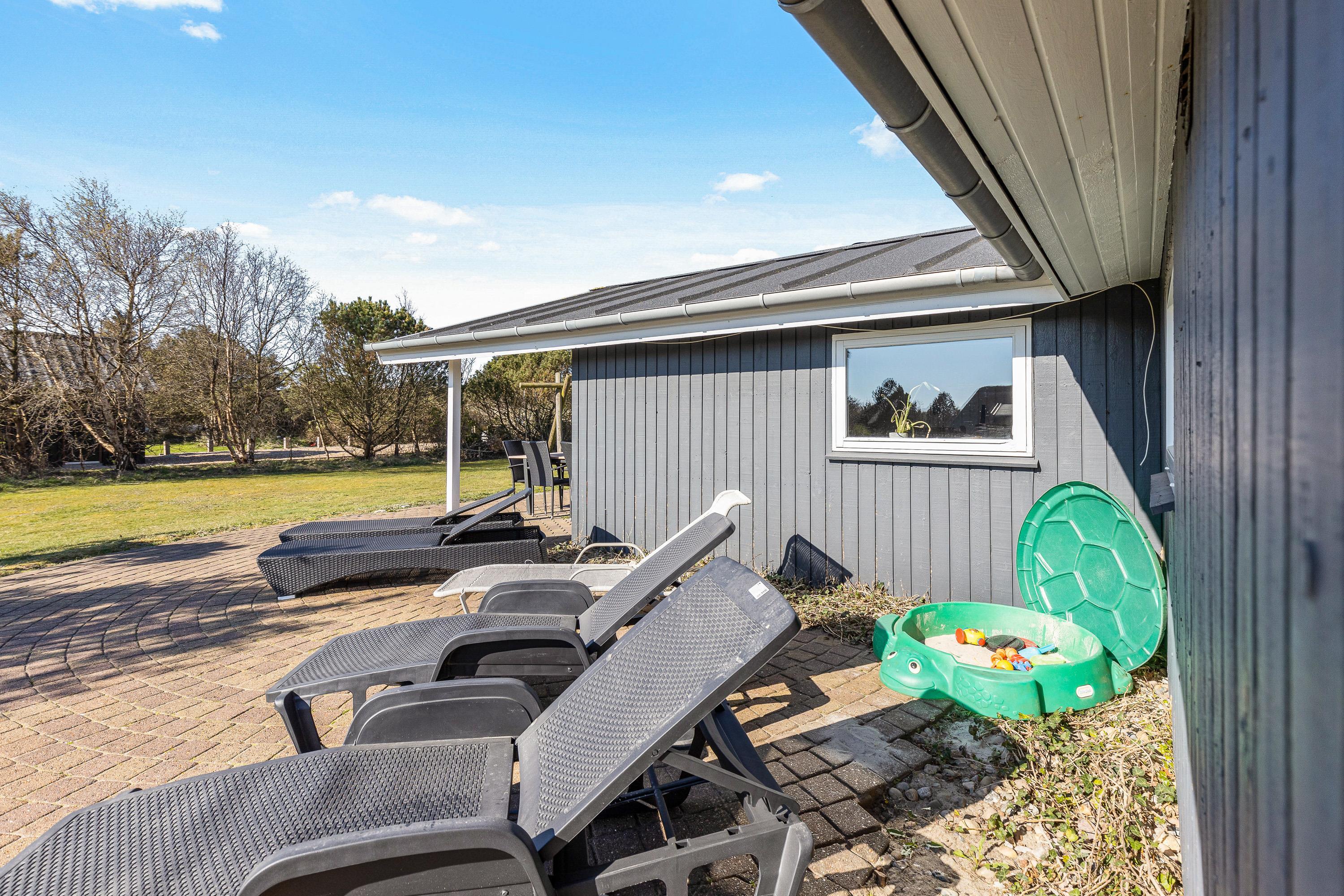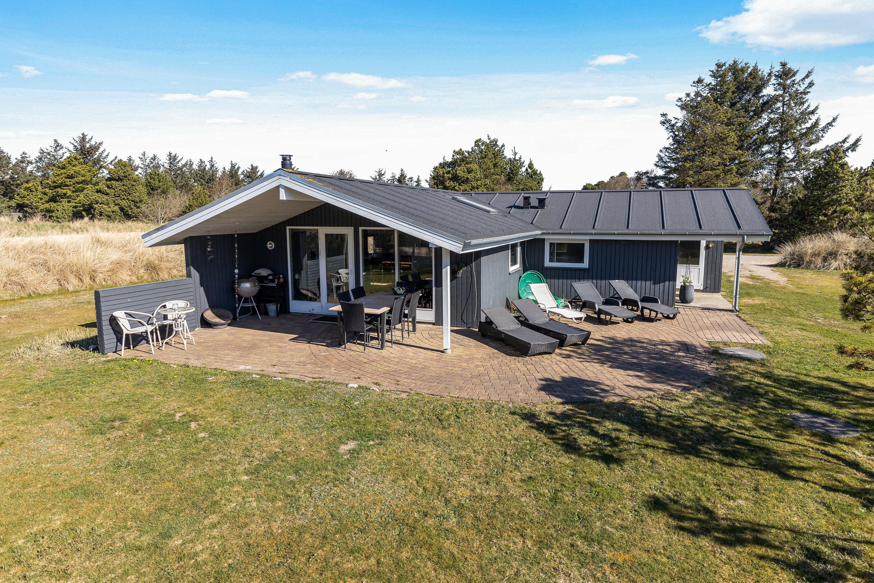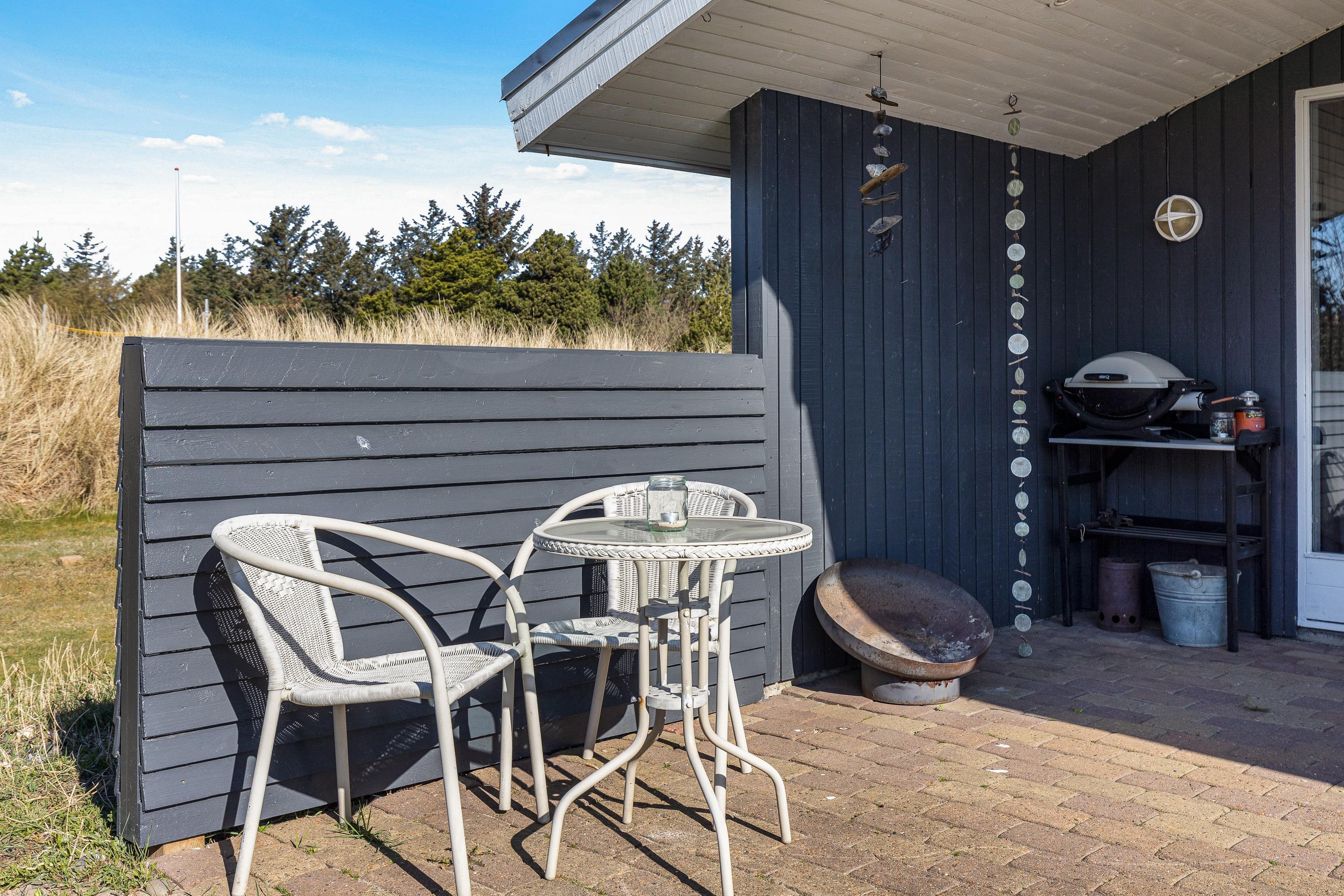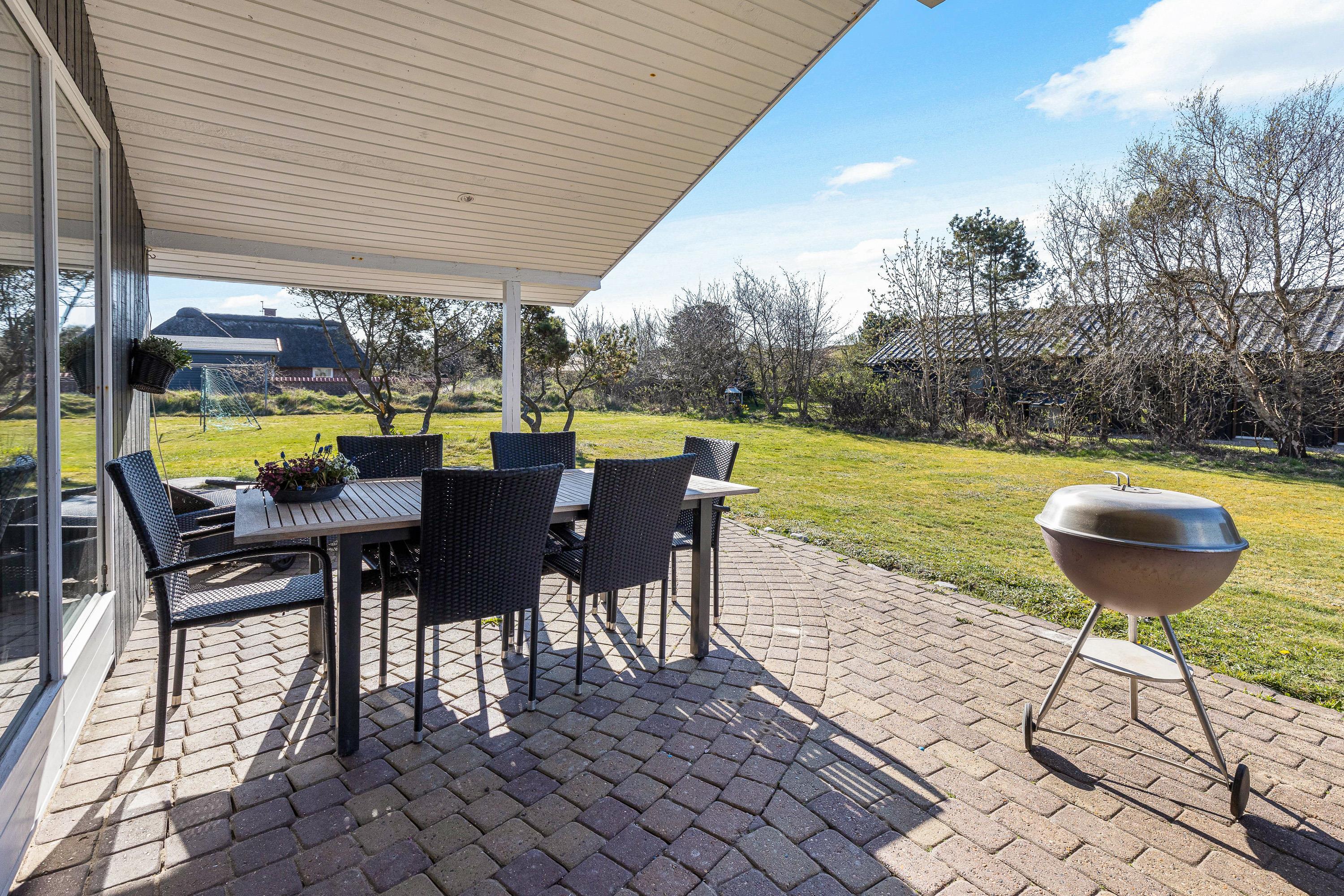 Sommerhuset har ikke kun et hyggeligt indre, der leder tankerne hen på den klassiske sommerhusferie. Også beliggenheden hjælper godt på vej. Her får I masser af grøn natur, som kan nydes fra den delvist overdækkede terrasse, og der er sørget for gyngestativ og sandkasse til de yngste feriegæster. Både børnene og hundene vil elske den store græsplæne, hvor de kan lege løs, mens I slapper af i solen.