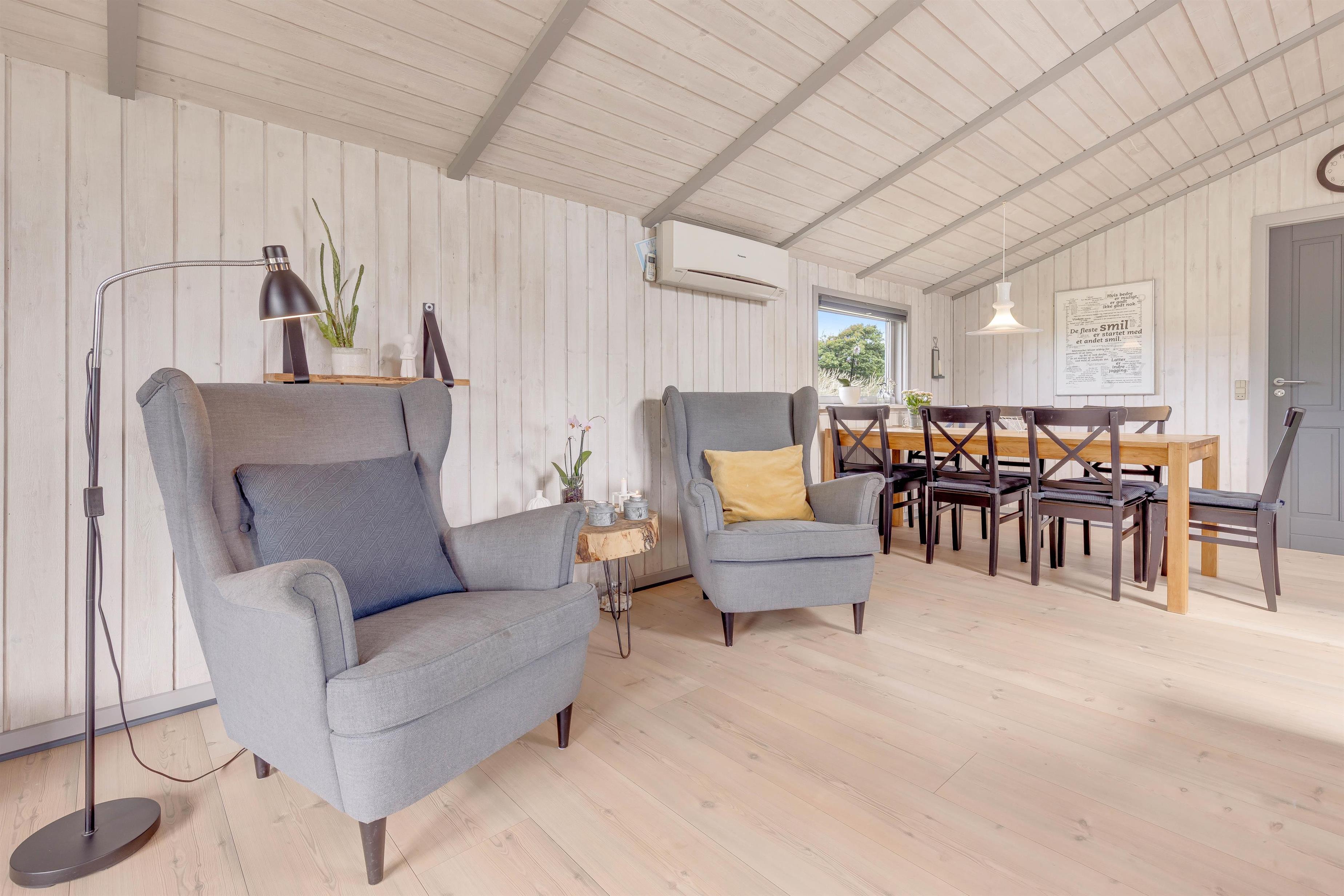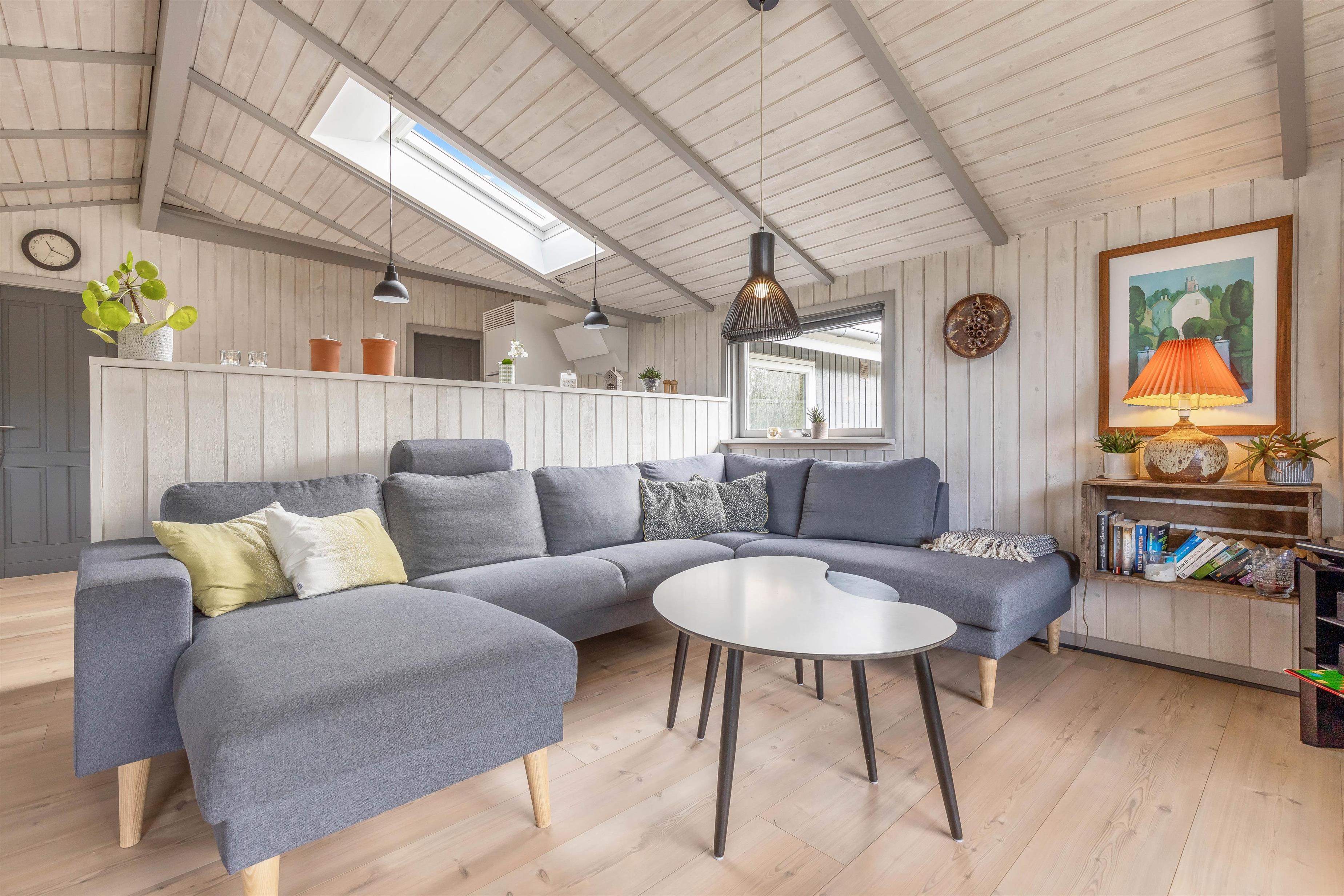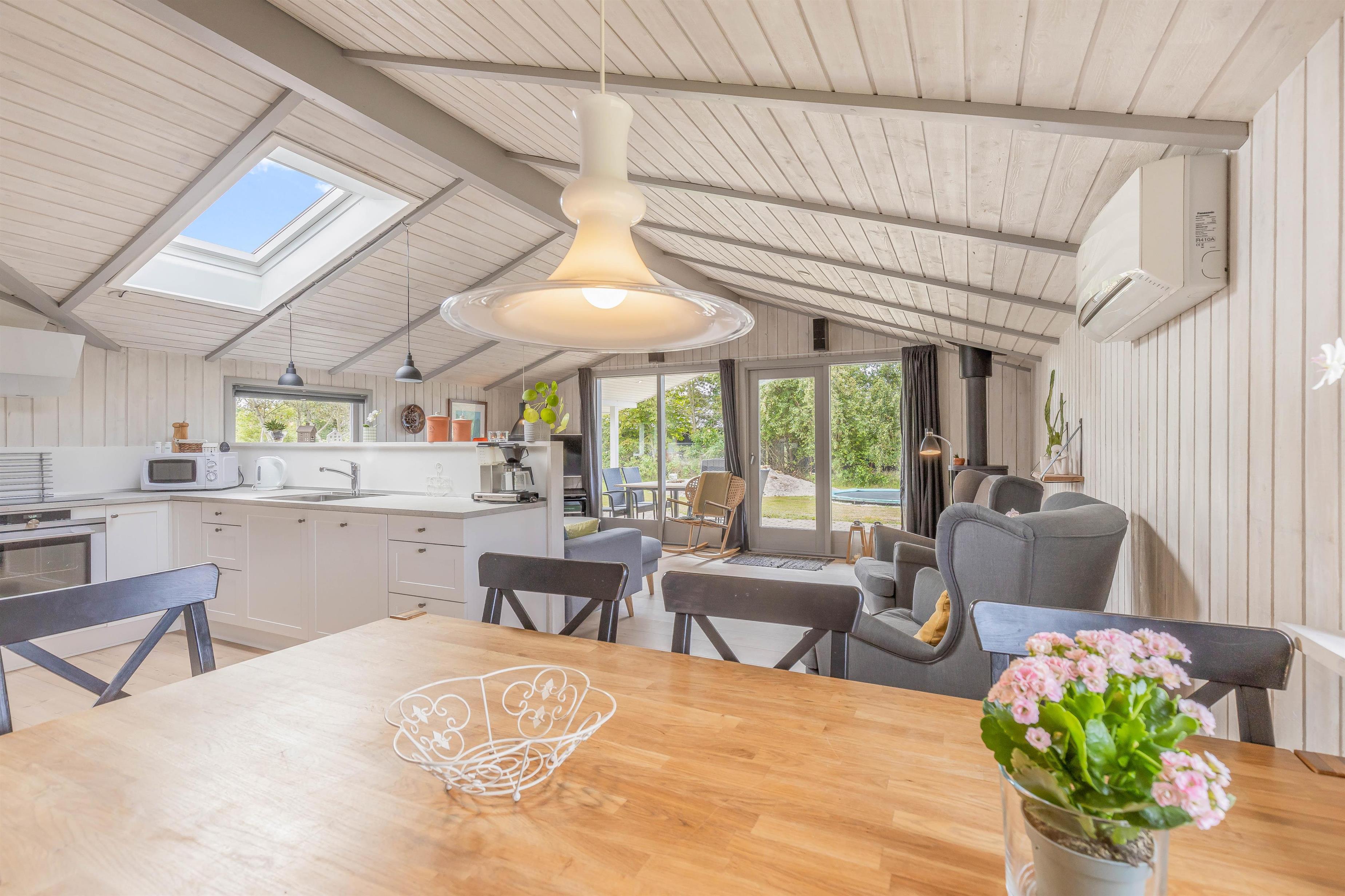 Så snart I træder inden for døren, kan I mærke den klassiske sommerhusstemning brede sig. Sommerhuset oser af charme med sine synlige loftsbjælker og lyse træfarver, og den detaljerige indretning skaber en hjemlig atmosfære. Her er lagt vægt på, at I skal have en afslappende ferie i hyggelige omgivelser.