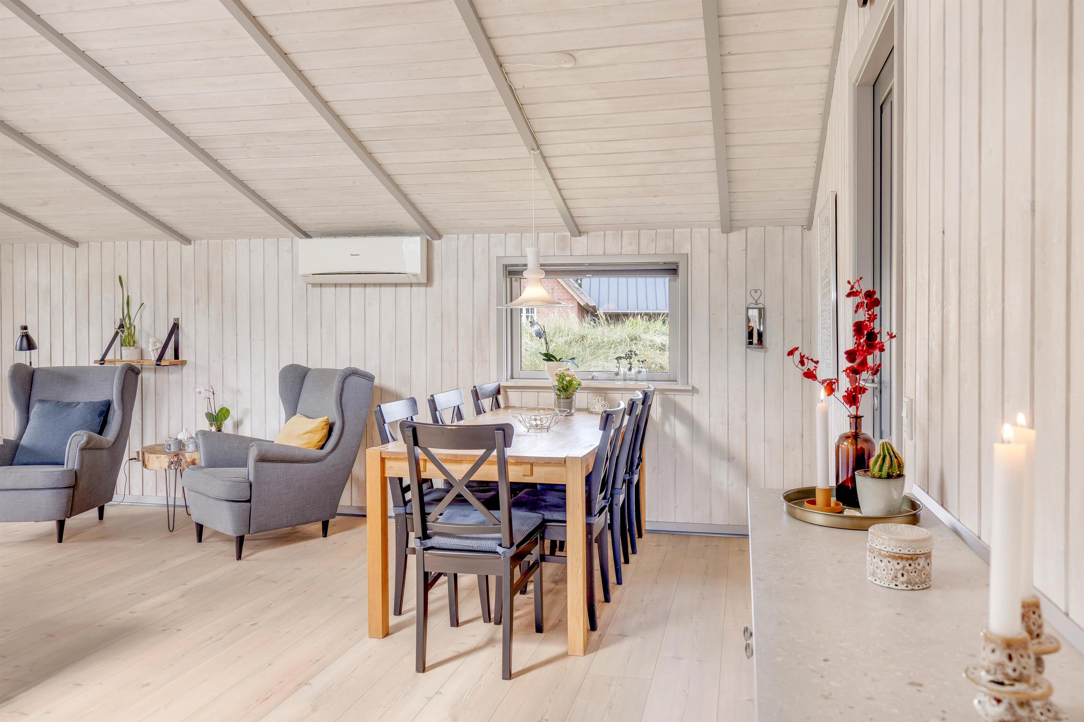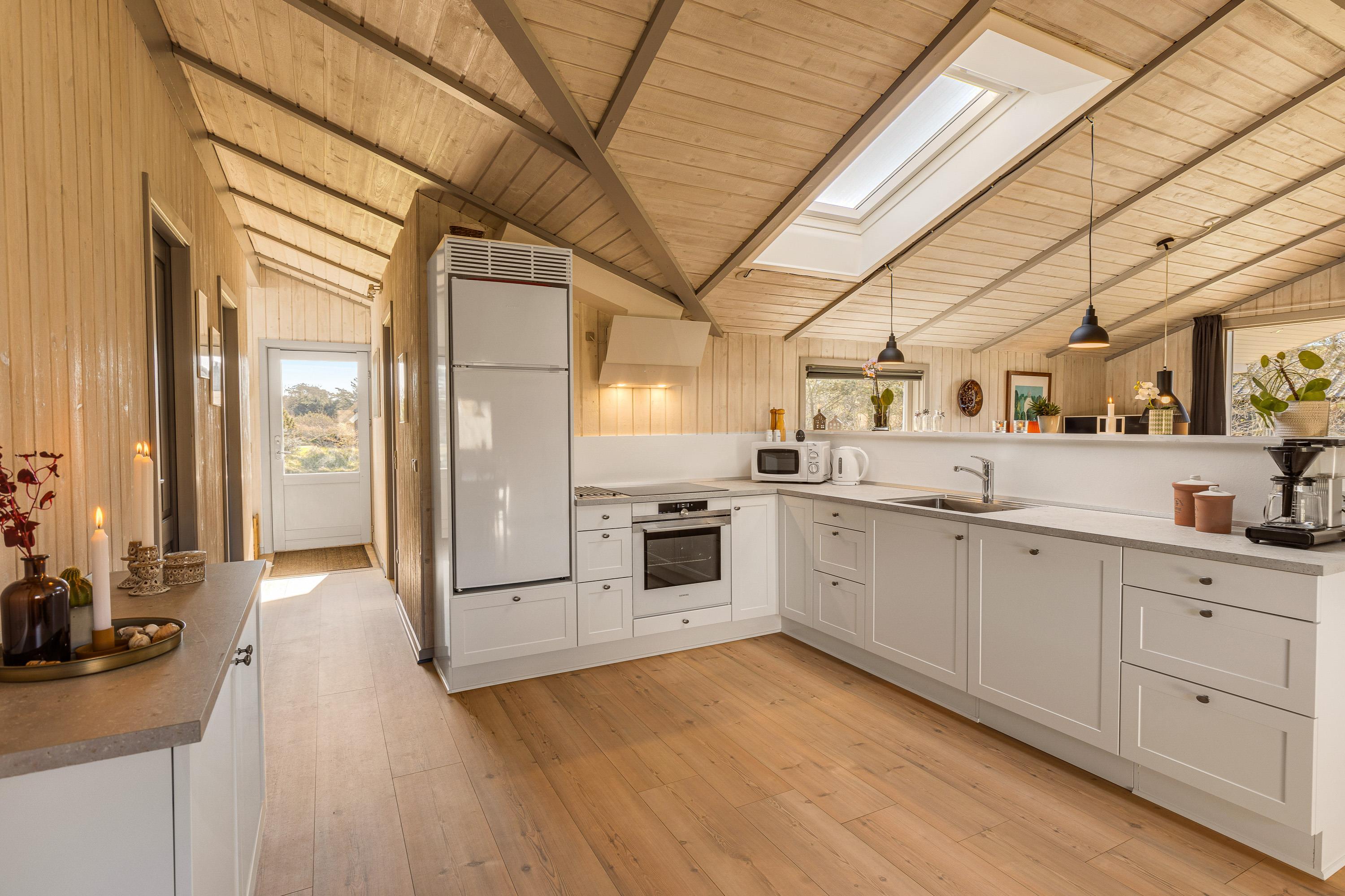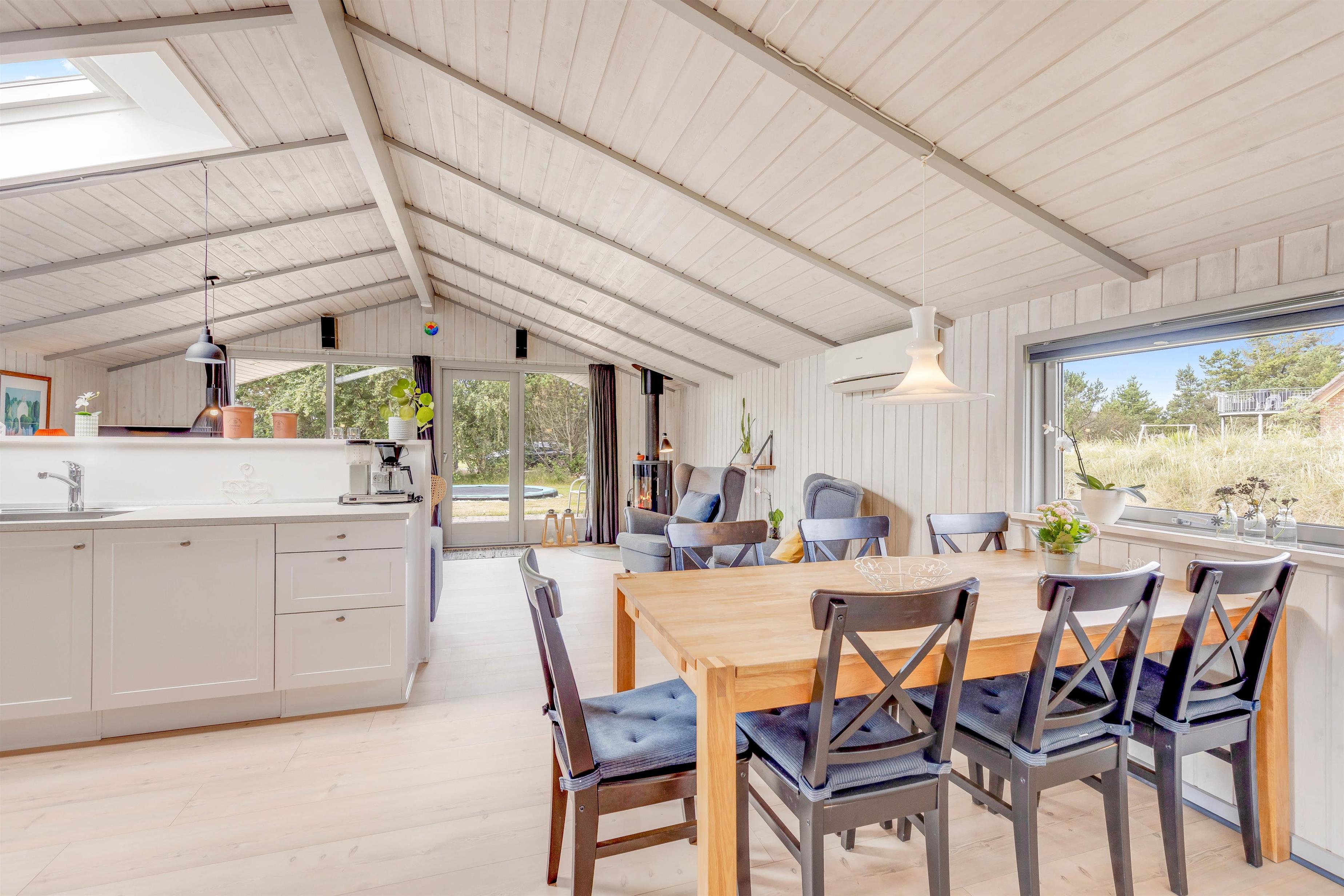 Så snart I træder inden for døren, kan I mærke den klassiske sommerhusstemning brede sig. Sommerhuset oser af charme med sine synlige loftsbjælker og lyse træfarver, og den detaljerige indretning skaber en hjemlig atmosfære. Her er lagt vægt på, at I skal have en afslappende ferie i hyggelige omgivelser.