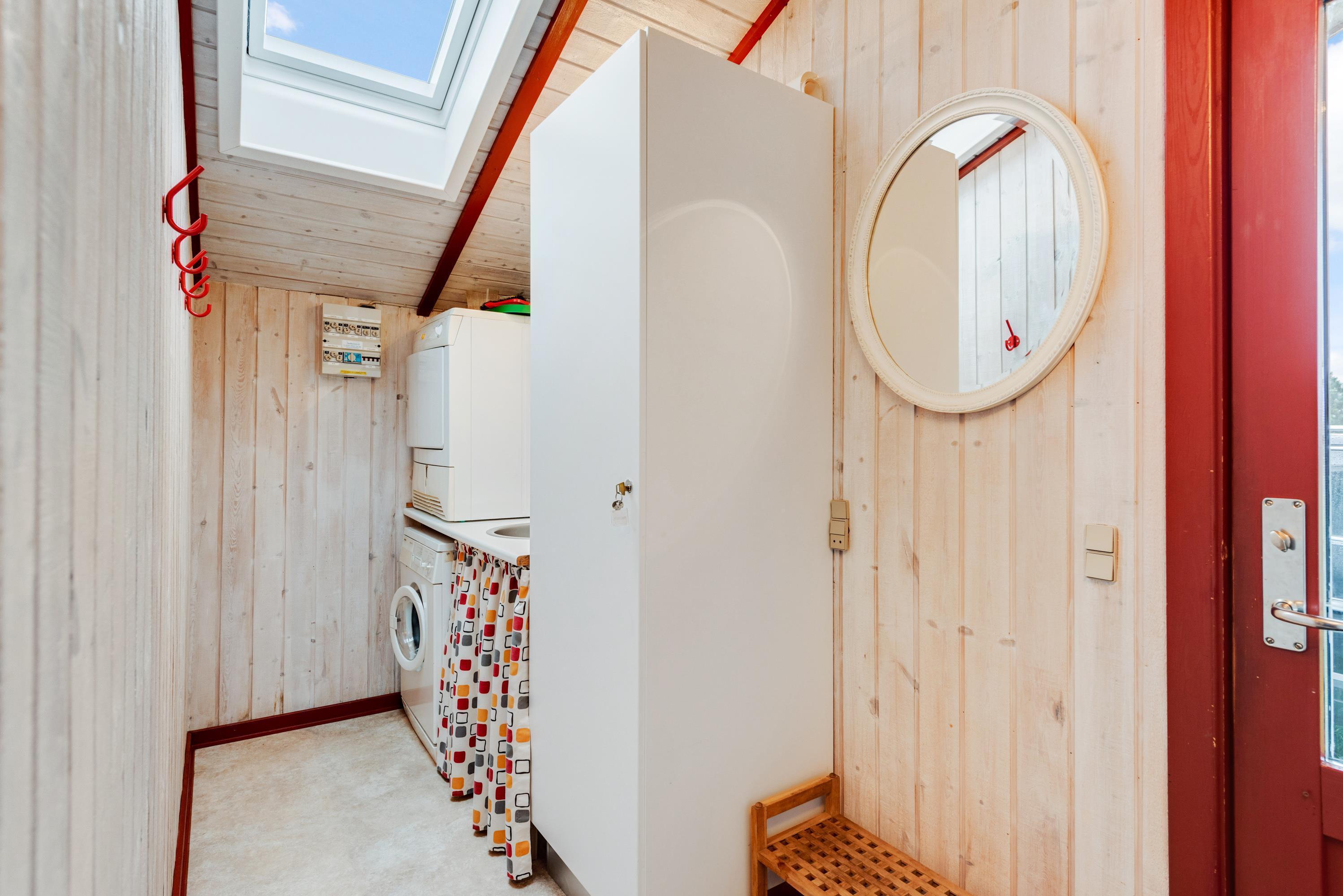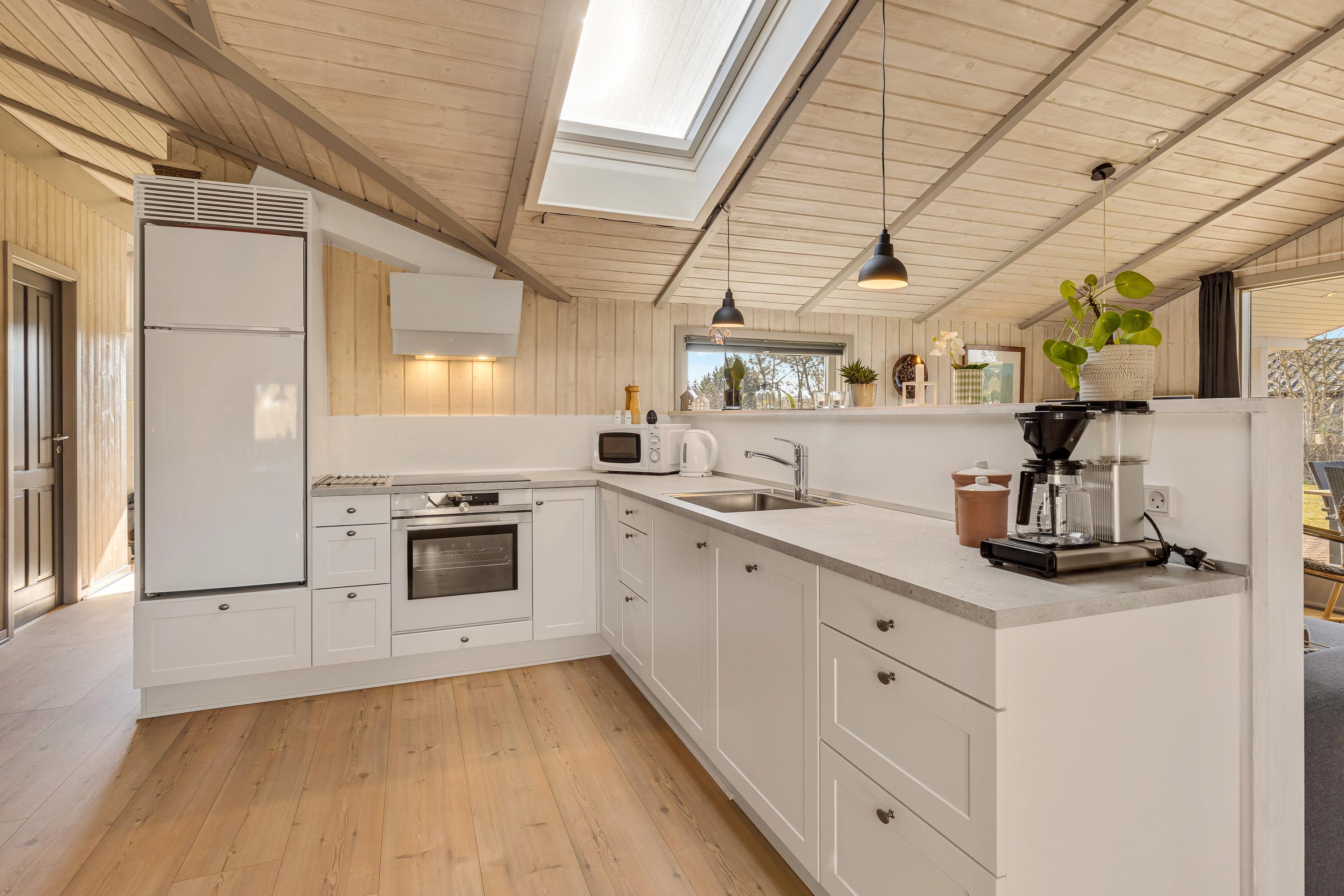I stuen står sommerhusets brændeovn, som altid er en ægte stemningsspreder. Badeværelset er udstyret med gulvvarme, og der er både opvaskemaskine, vaskemaskine og tørretumbler.