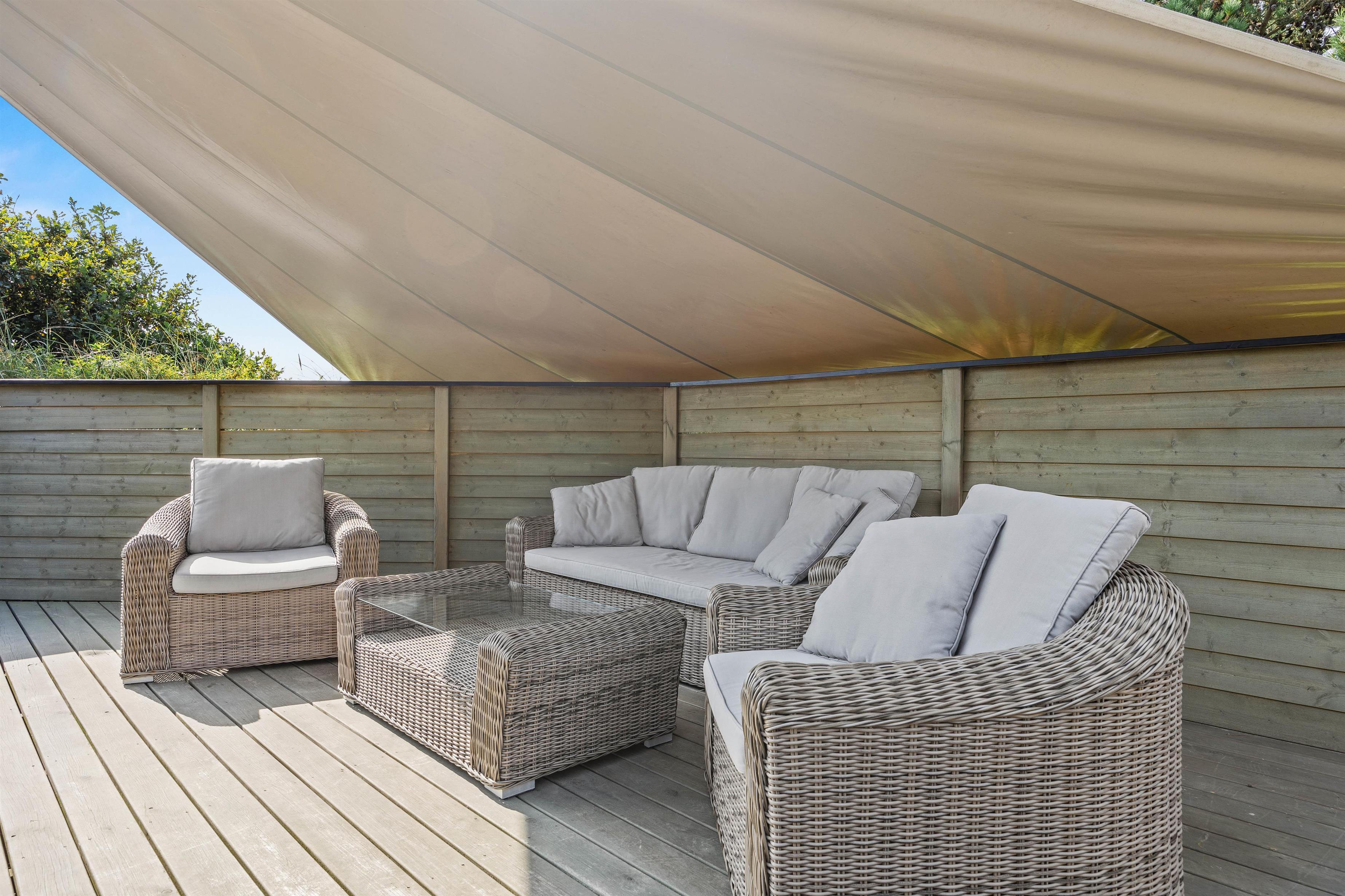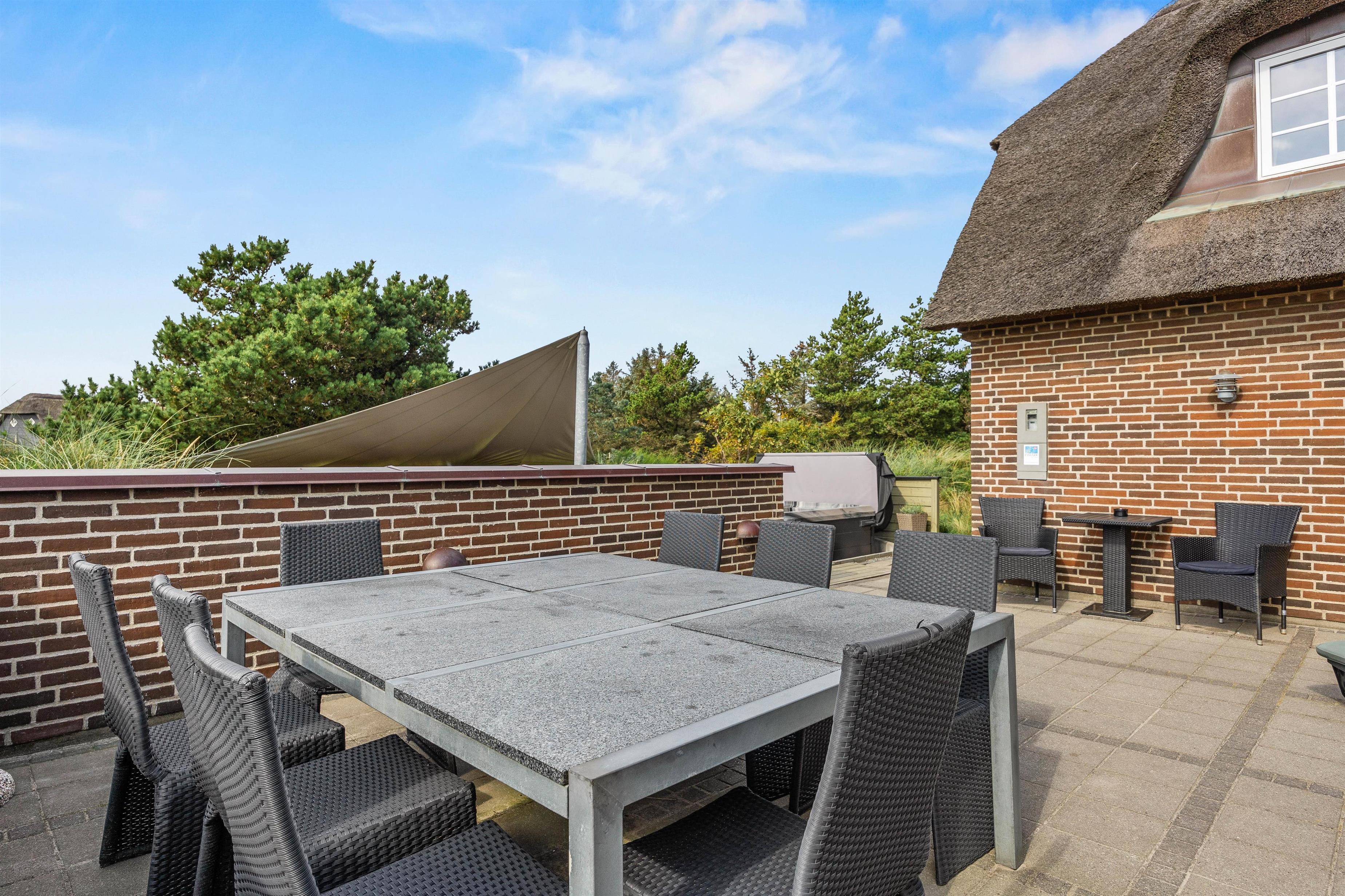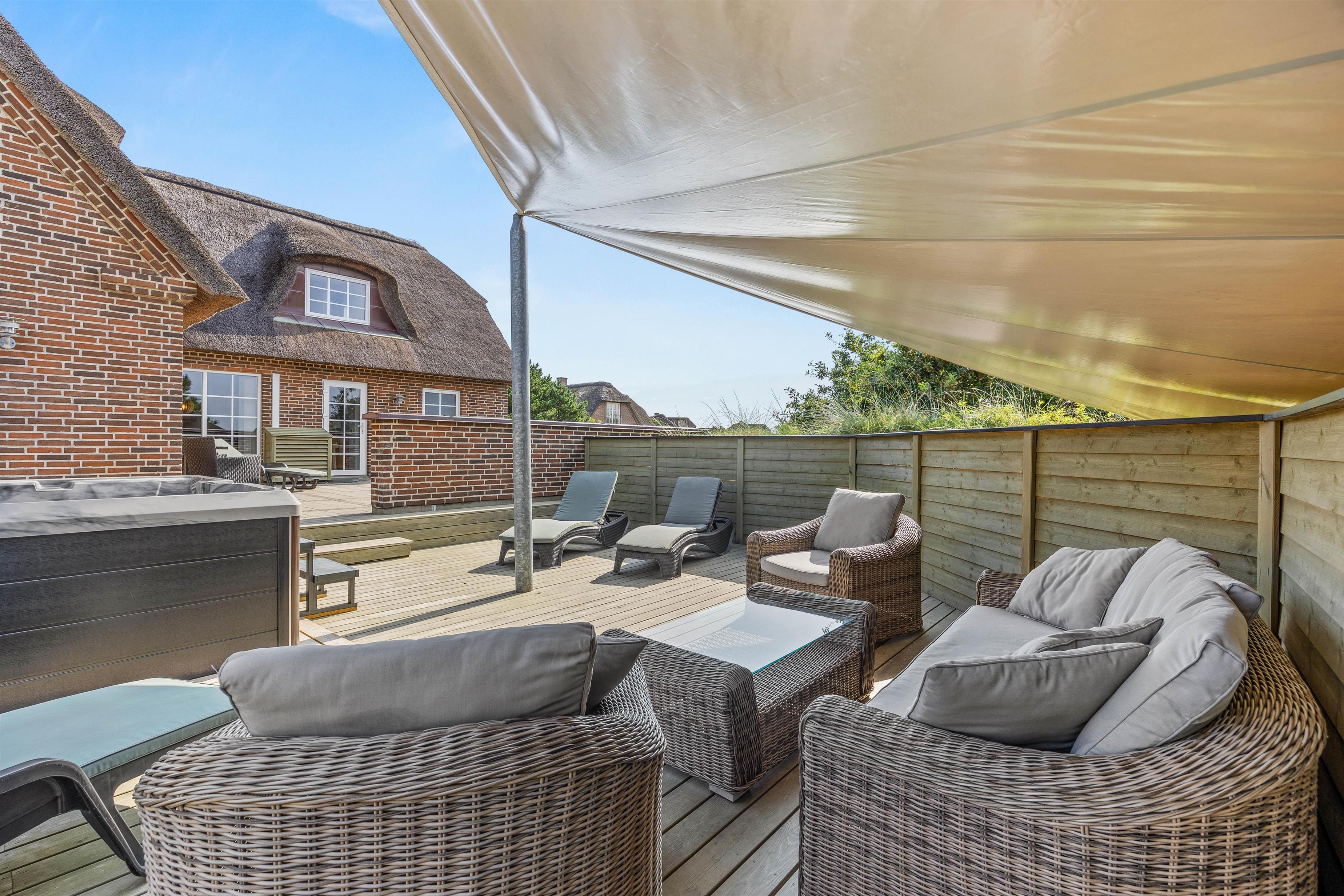 Til huset hører en dejlig terrasse, hvor wellness og velvære igen kommer i fokus med det lækre udendørs spabad og lounge-møbler. Læn jer tilbage i liggestolene, mens børnene bader, eller hop i det varme boblebad på en stjerneklar aften og nyd udsigten og roen.
