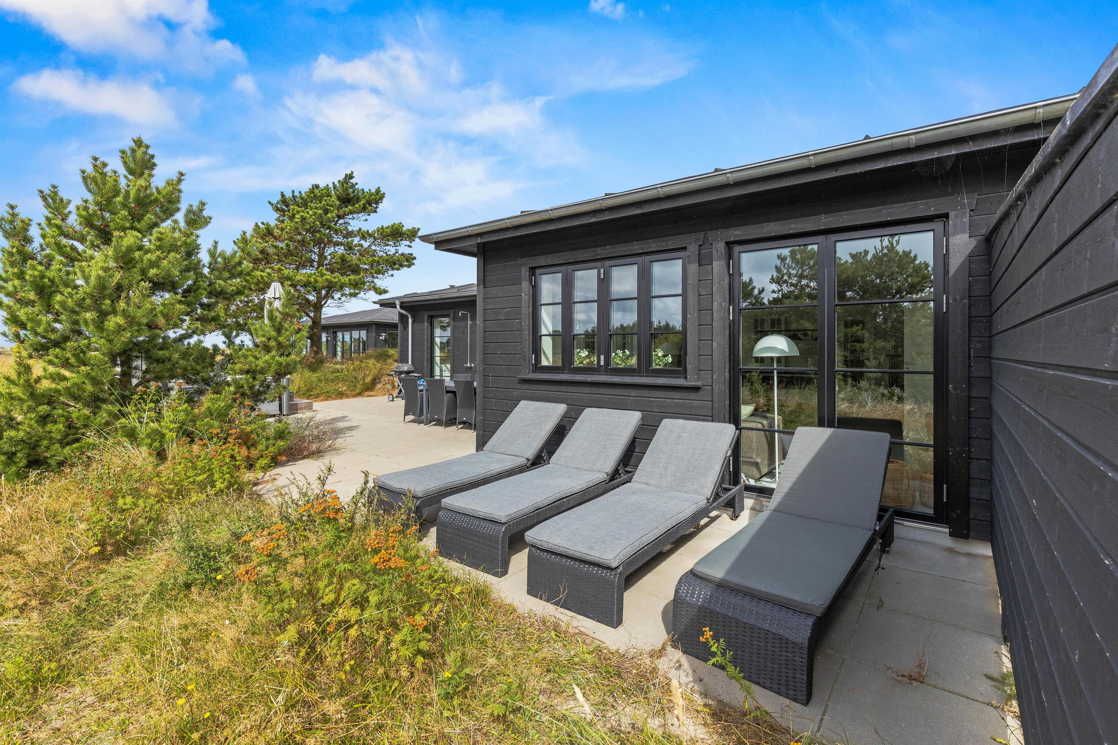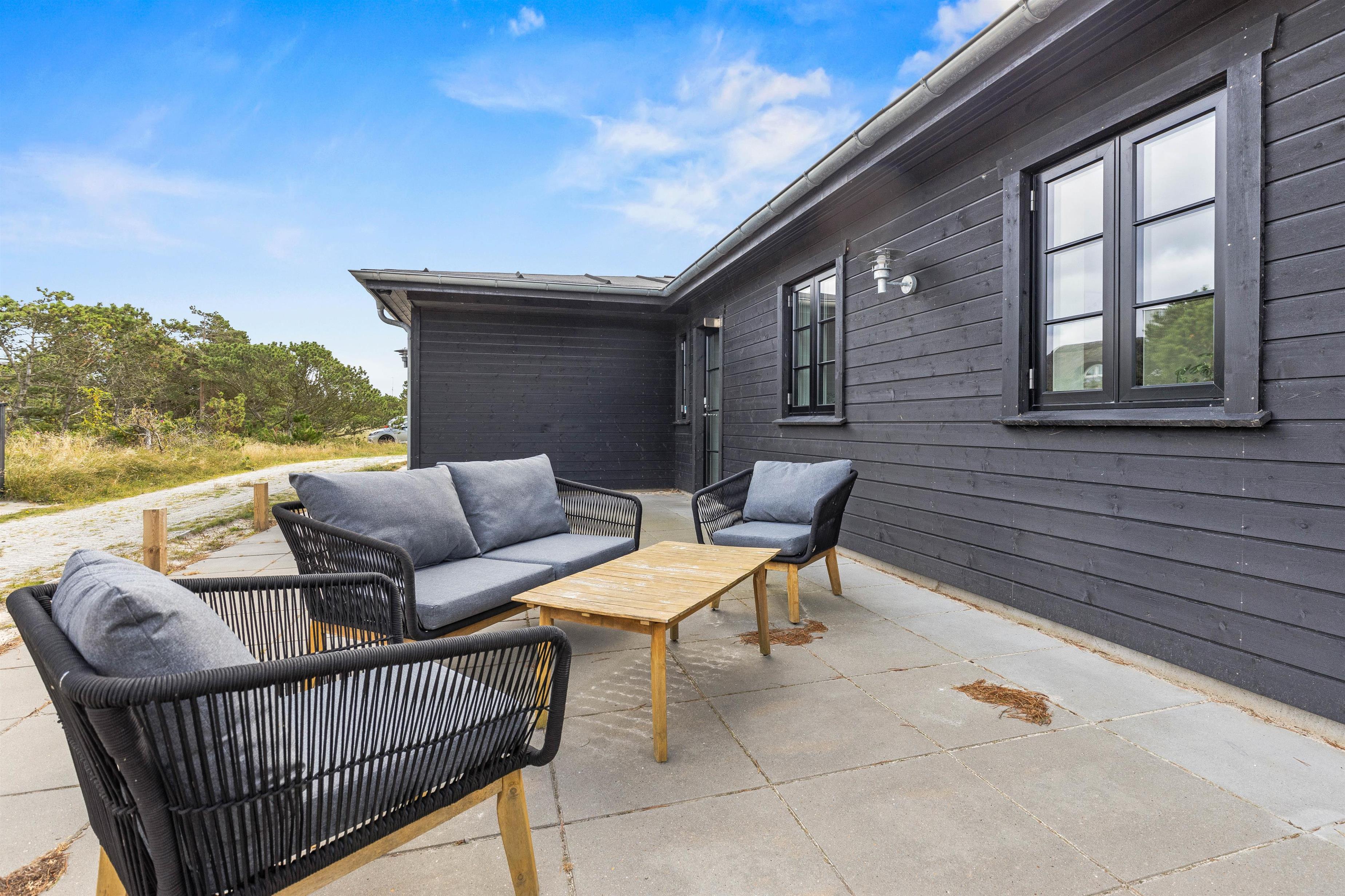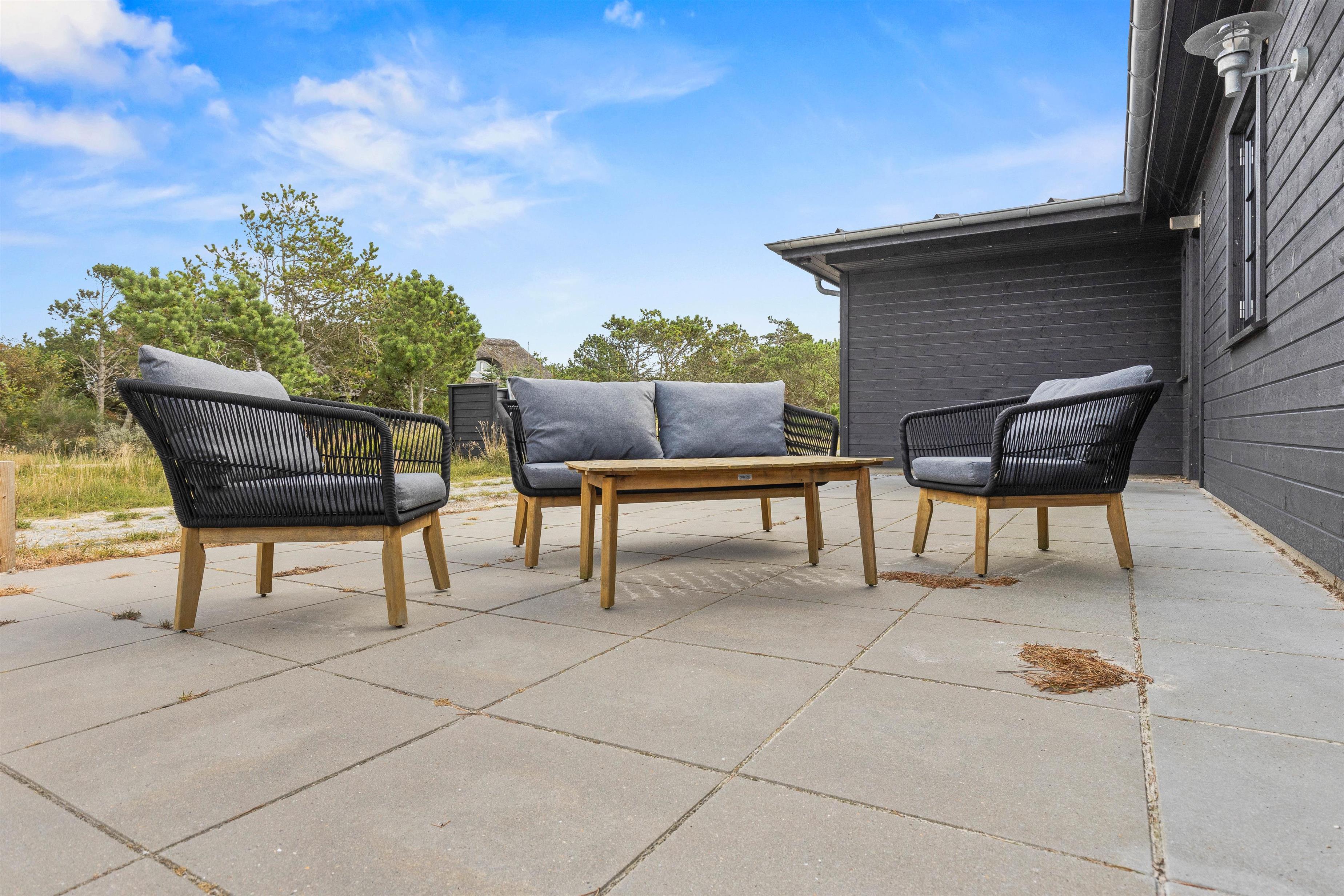 På sommerhusets udeområde har I en dejlig, åben terrasse, hvor I kan tilbringe jeres ferie på de dage, hvor solen står højt på himlen. På terrassen kan I læne jer godt tilbage i havemøbler og liggestole, mens I bare slapper af i solen og nyder ferien.