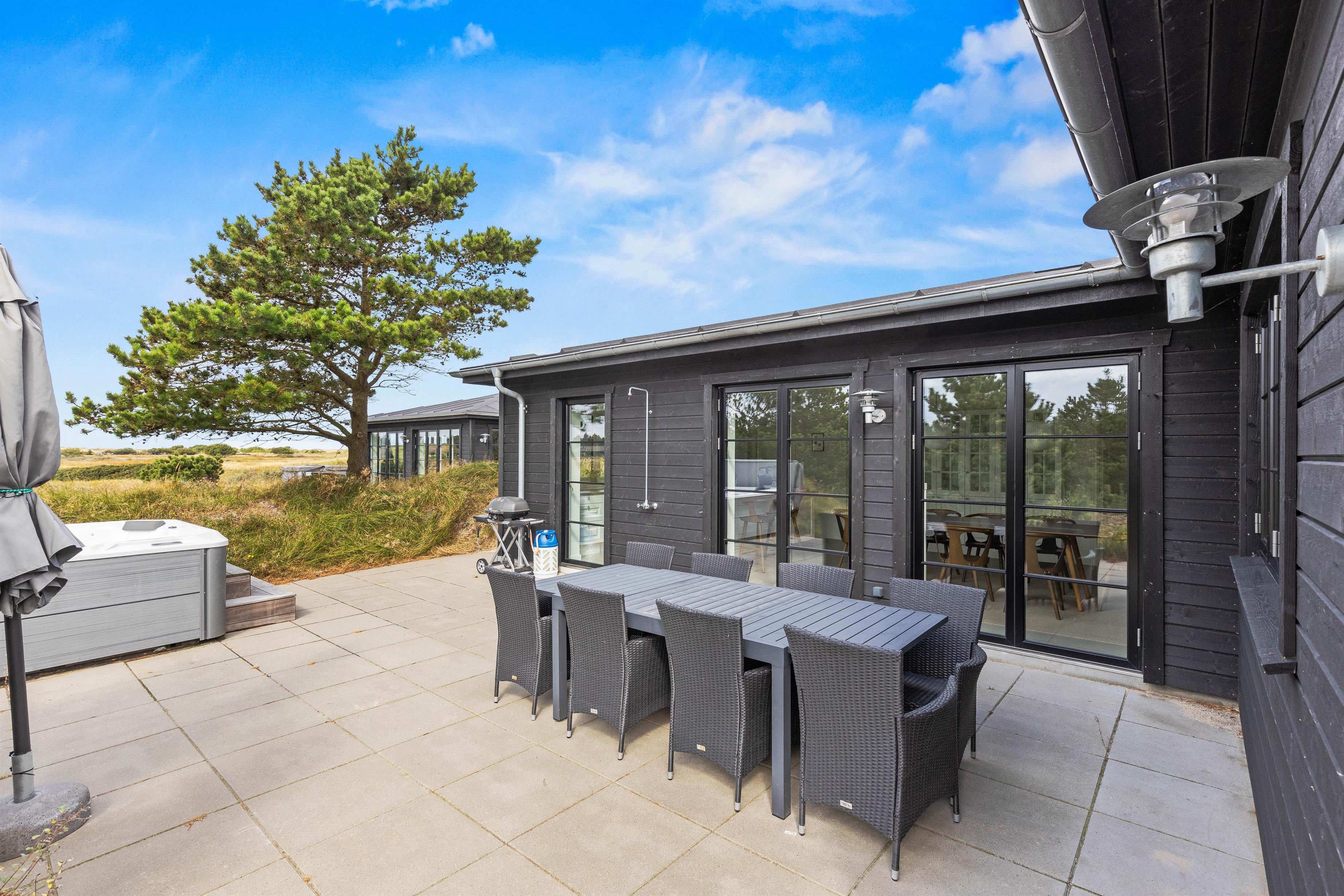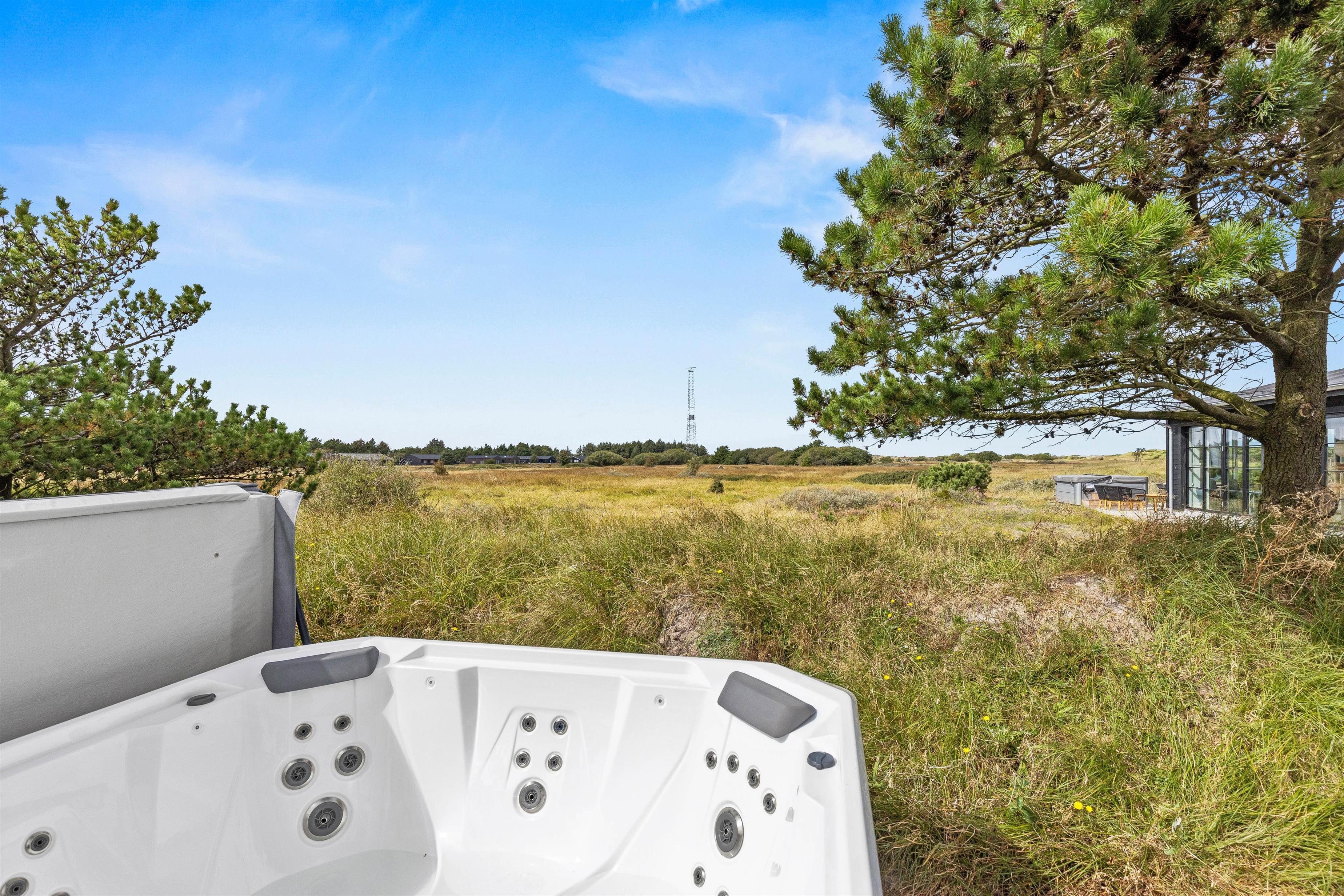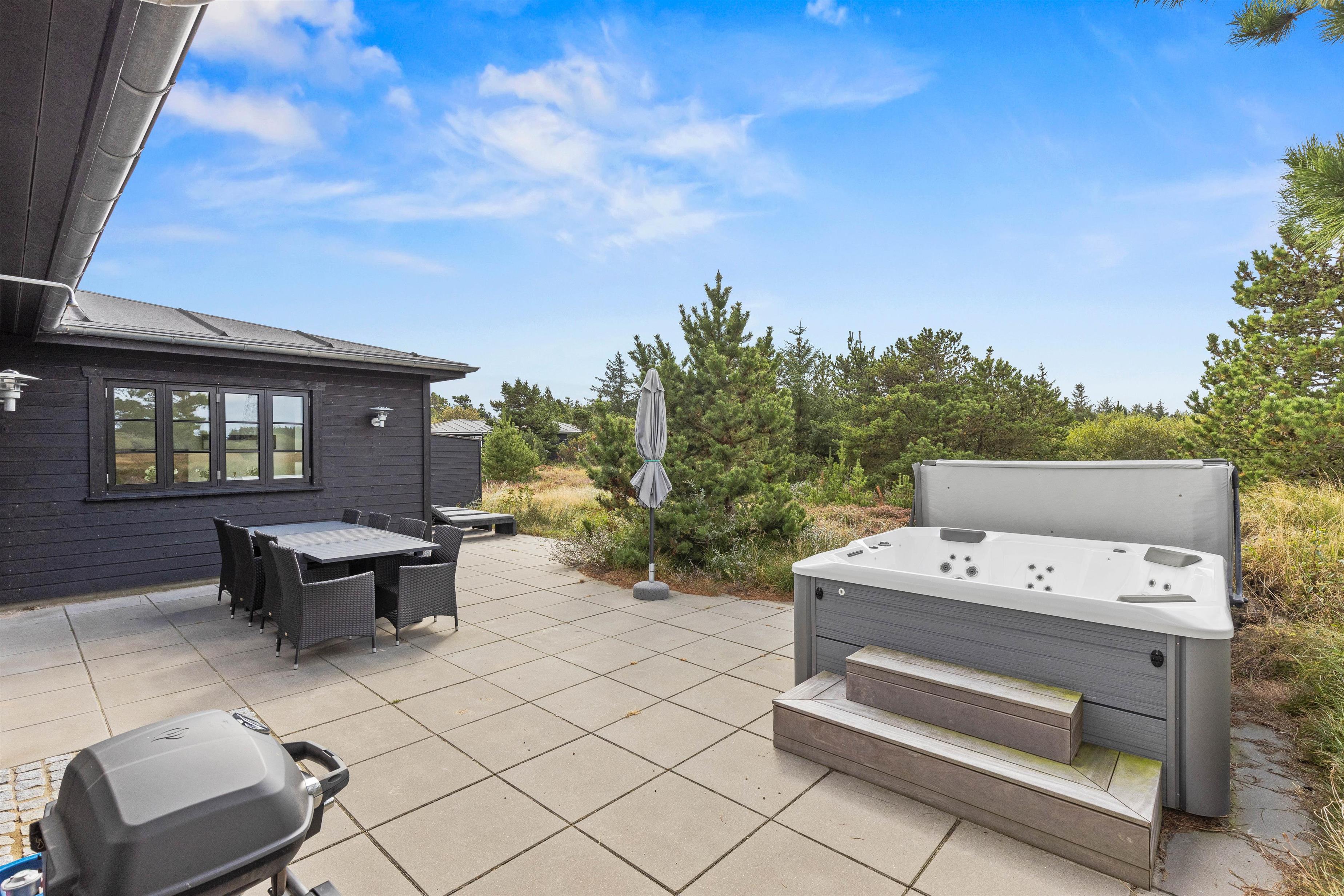 På jeres ferie i sommerhuset kan I se frem til at nyde masser af afslapning. På sommerhusets terrasse venter jer nemlig en dejlig udespa, hvor I kan sætte jer godt til rette i det varme, boblende vand under åben himmel og bare slappe helt af. På terrassen er der desuden en udebruser, I kan skylle jer under fra 1. april til 31. oktober.