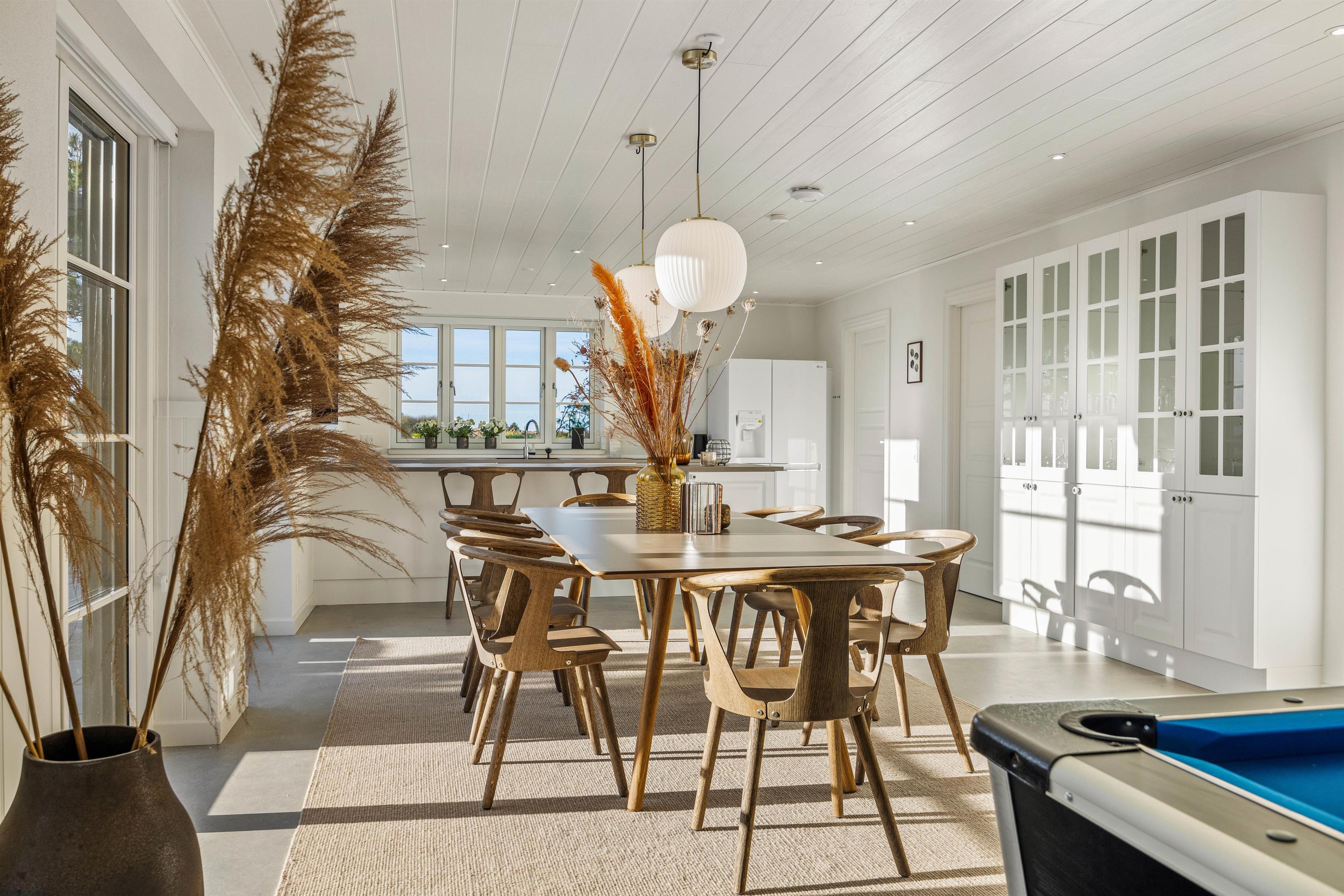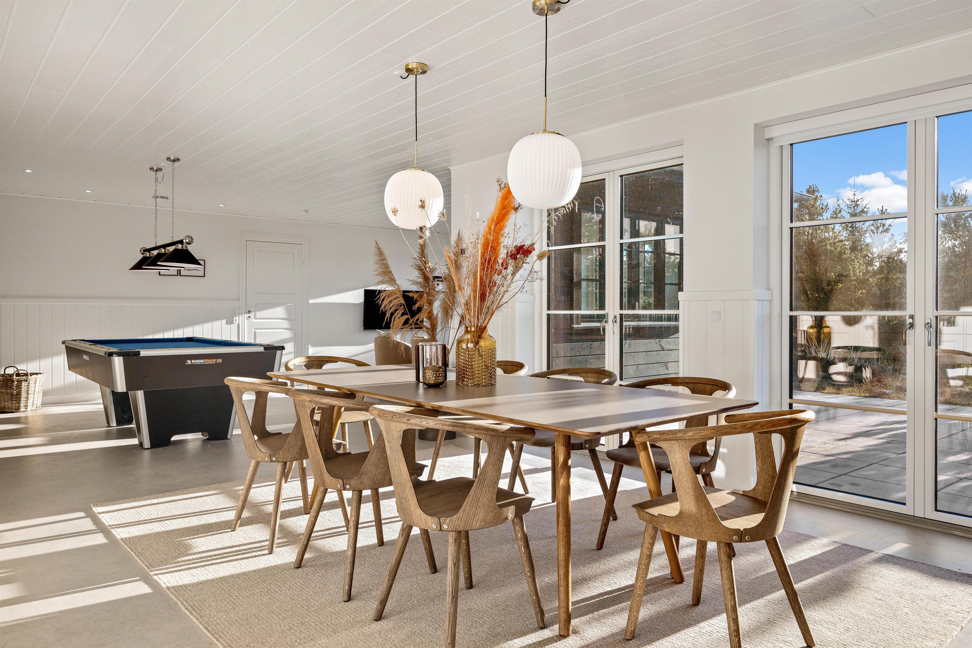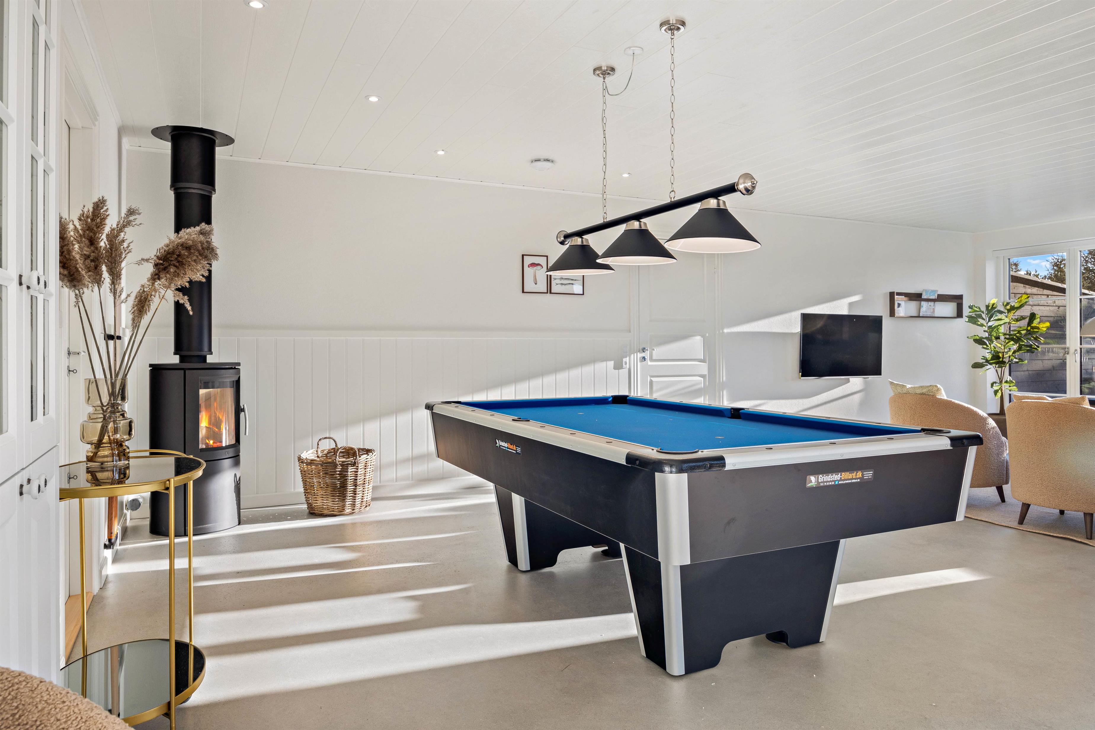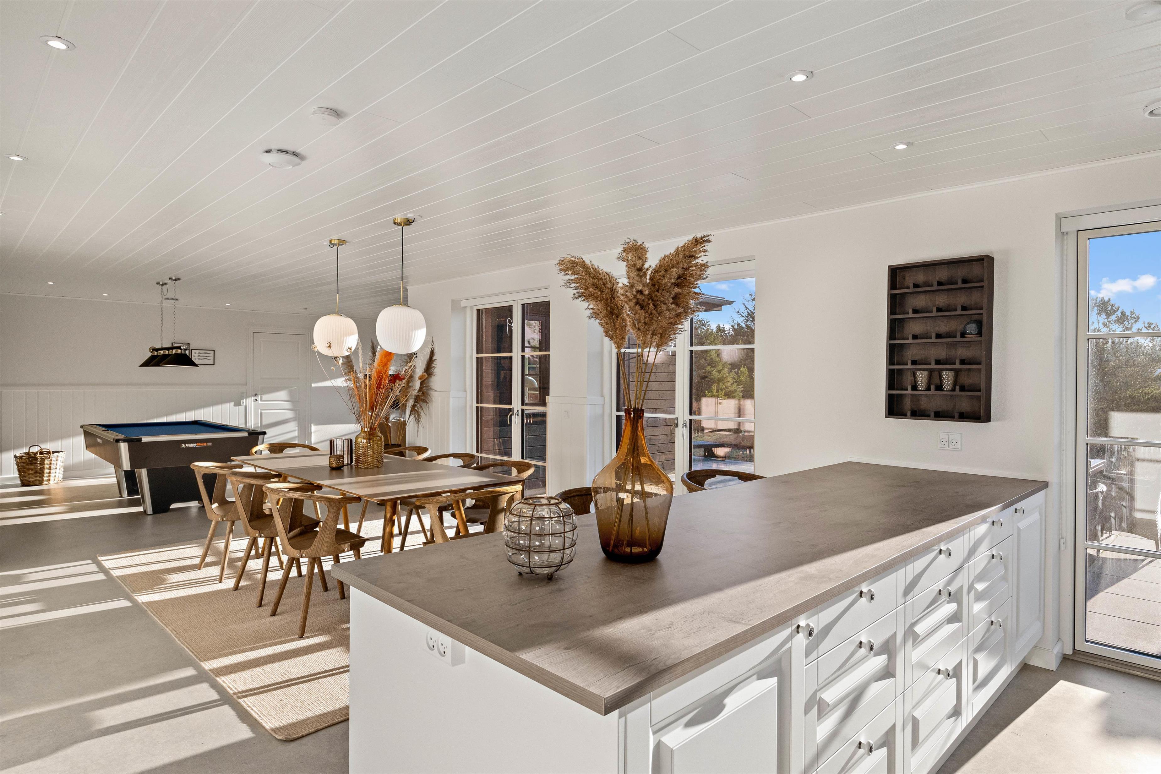 Hjertet i sommerhuset er det skønne alrum, hvor køkken, spiseplads og stue er forenet. Her er rammerne altså sat for mange hyggelige feriestunder med madlavning, spisning, spil og film. Her har I også et billardbord, som I kan tilbringe mange sjove stunder omkring.