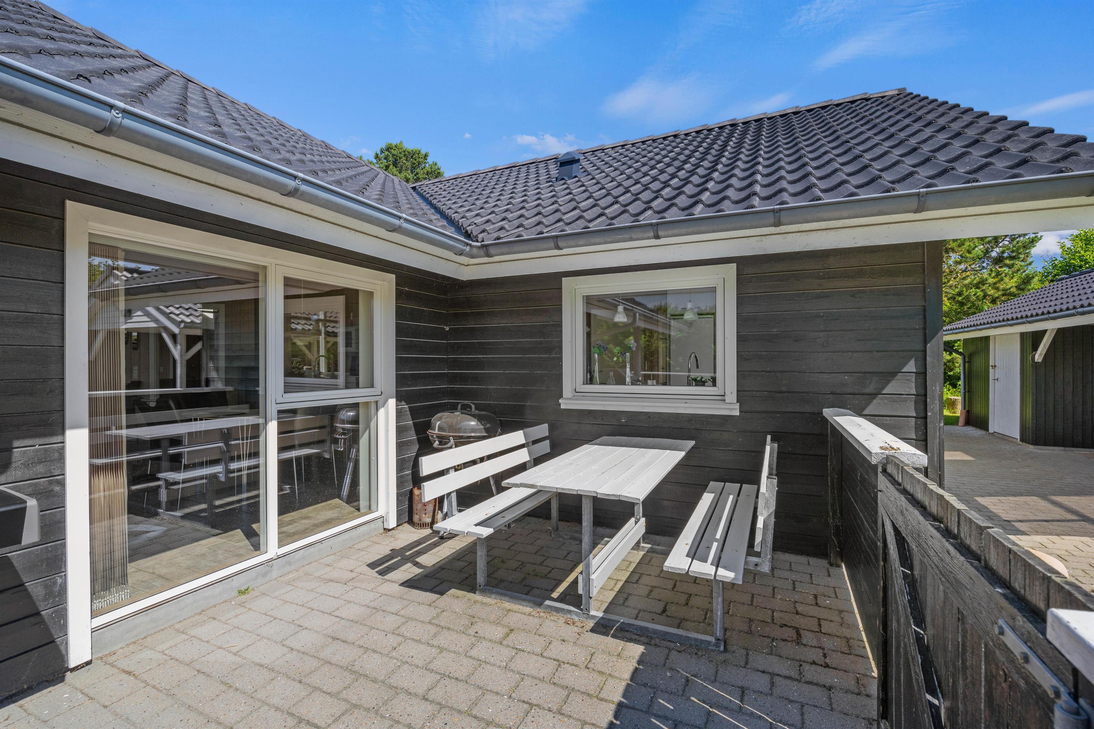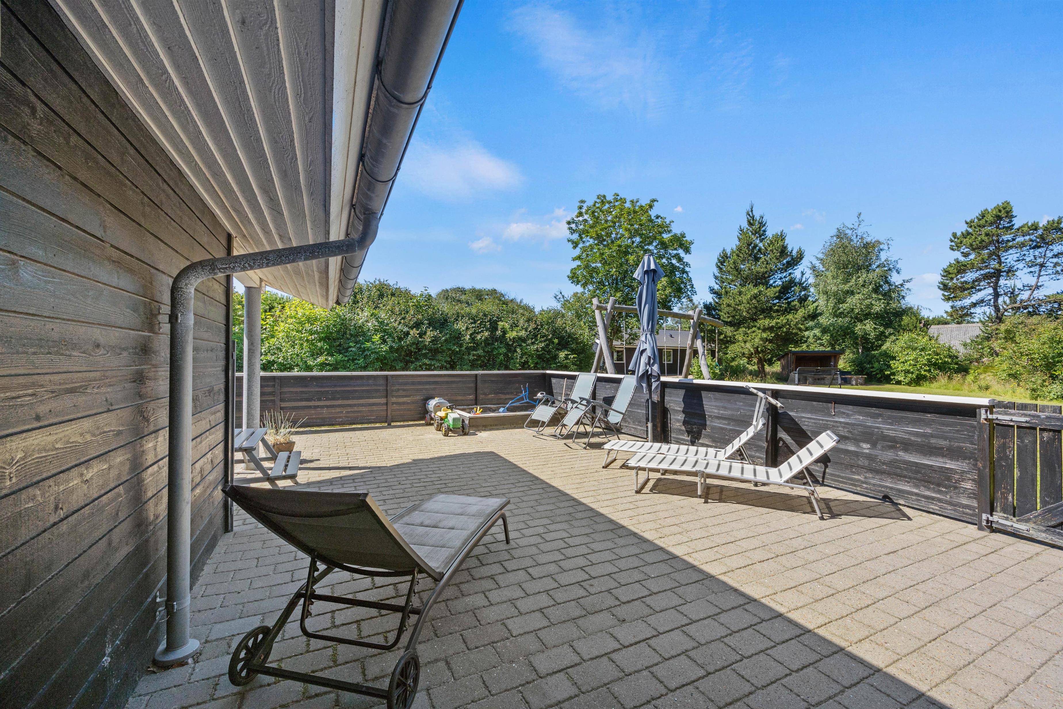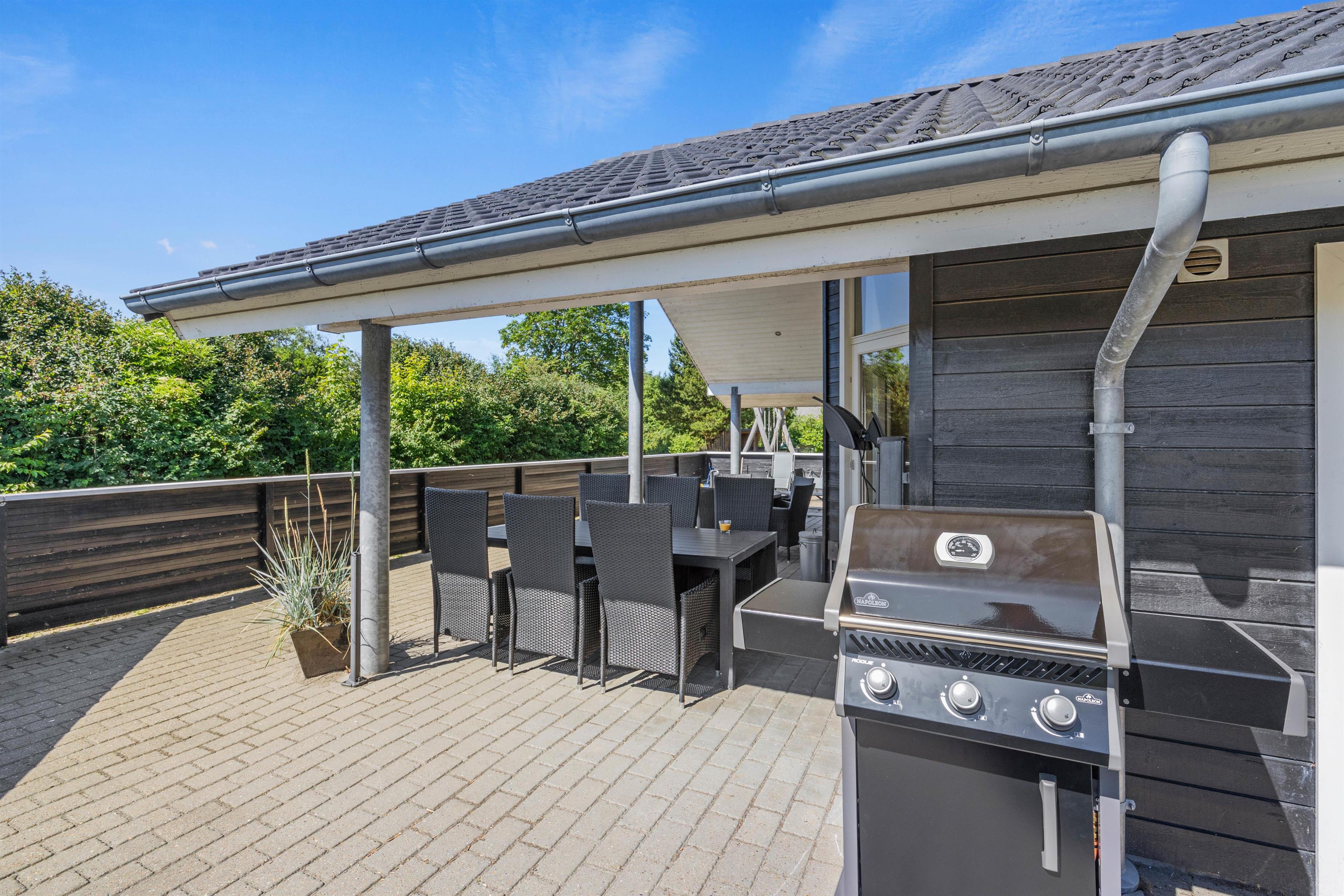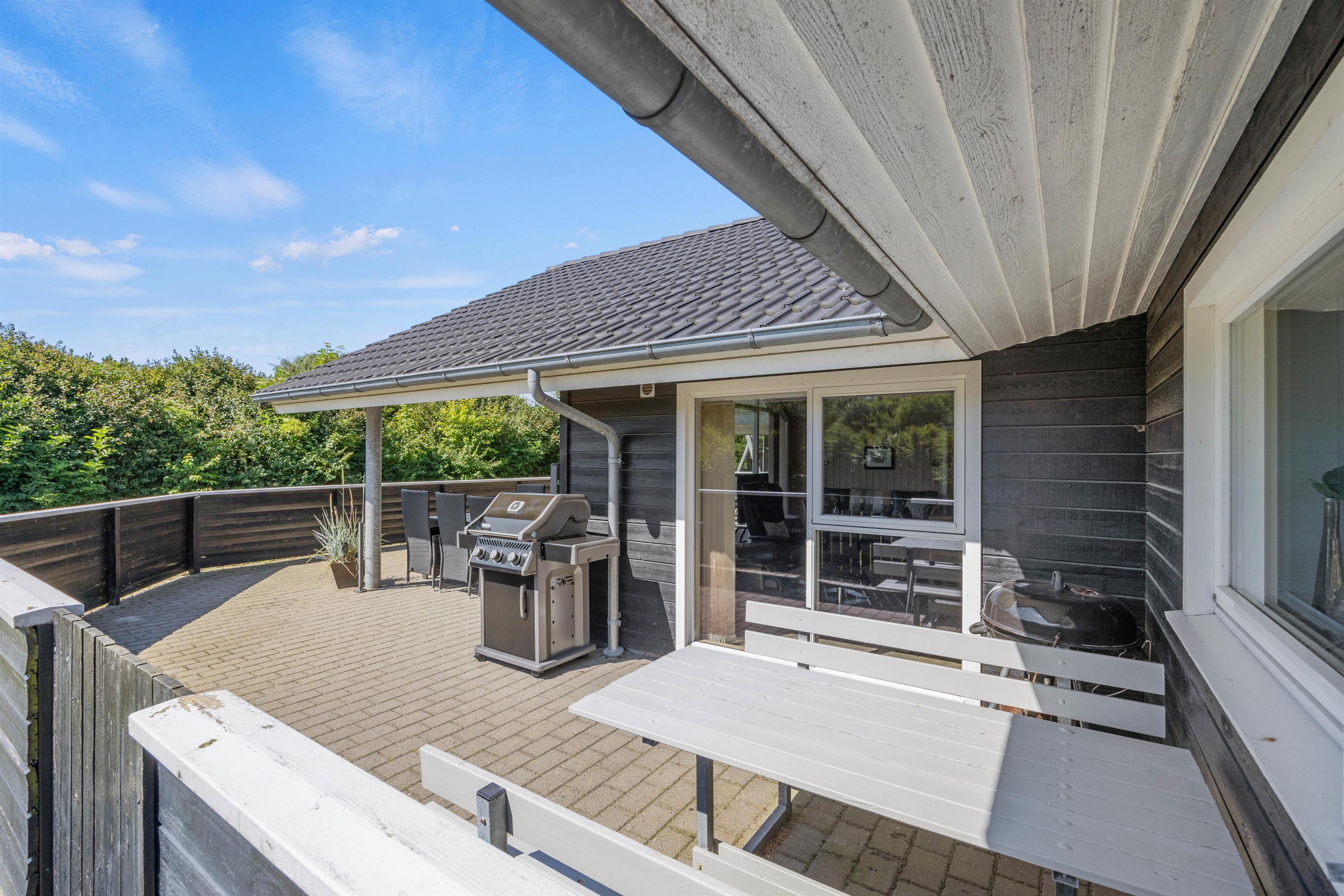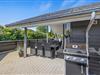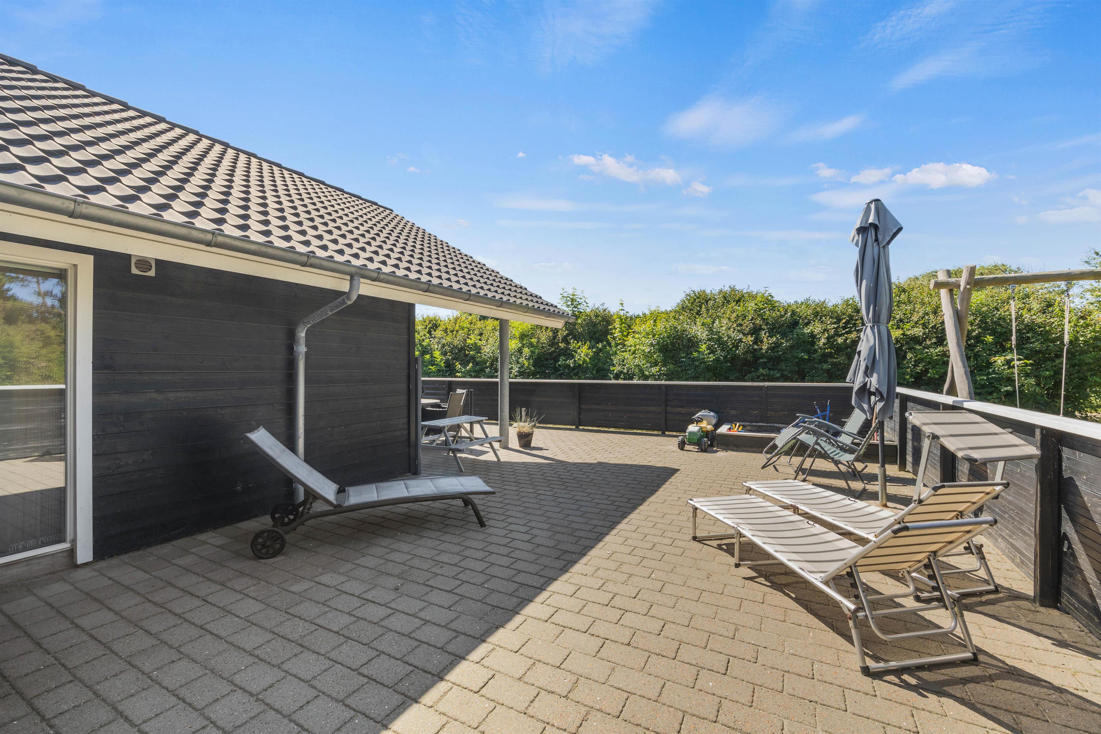 Fra opholdsrummet er der udgang til en stor lukket og delvist overdækket terrasse med flere siddegrupper. Her kan I se på de aktive, der både kan have gang i fodbold eller basket på den velplejede plæne. De mindre børn vil kunne brænde energi af på gyngerne og klatrestativet. De allermindste vil kunne hygge sig i sandkassen, der meget praktisk er placeret indenfor den lukkede terrasse. Udenfor finder I også en flot udebruser, der kan bruges i sommerhalvåret.