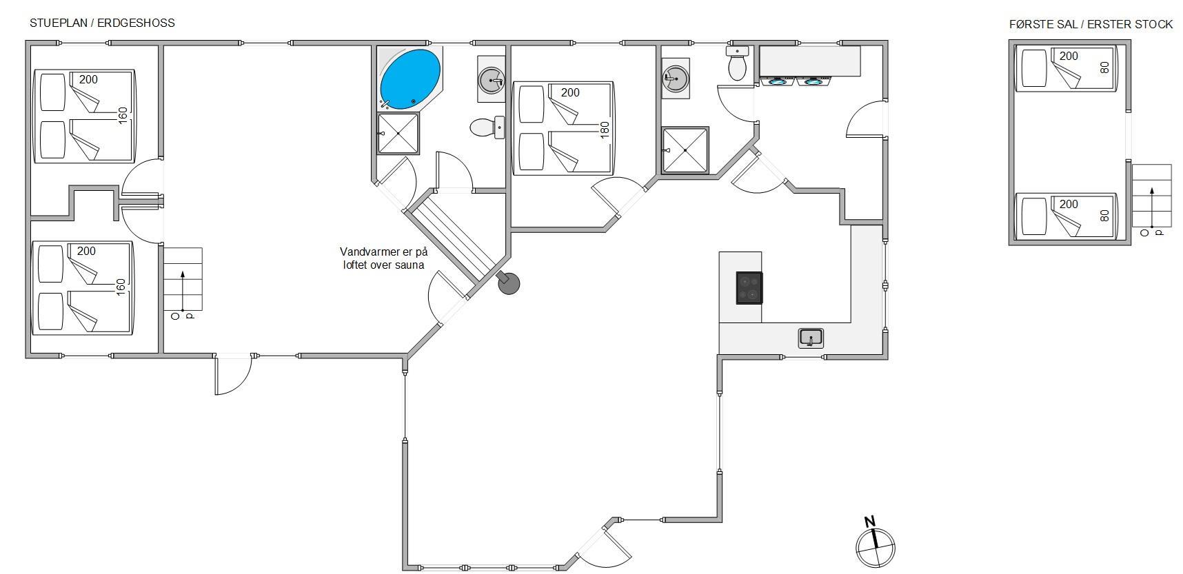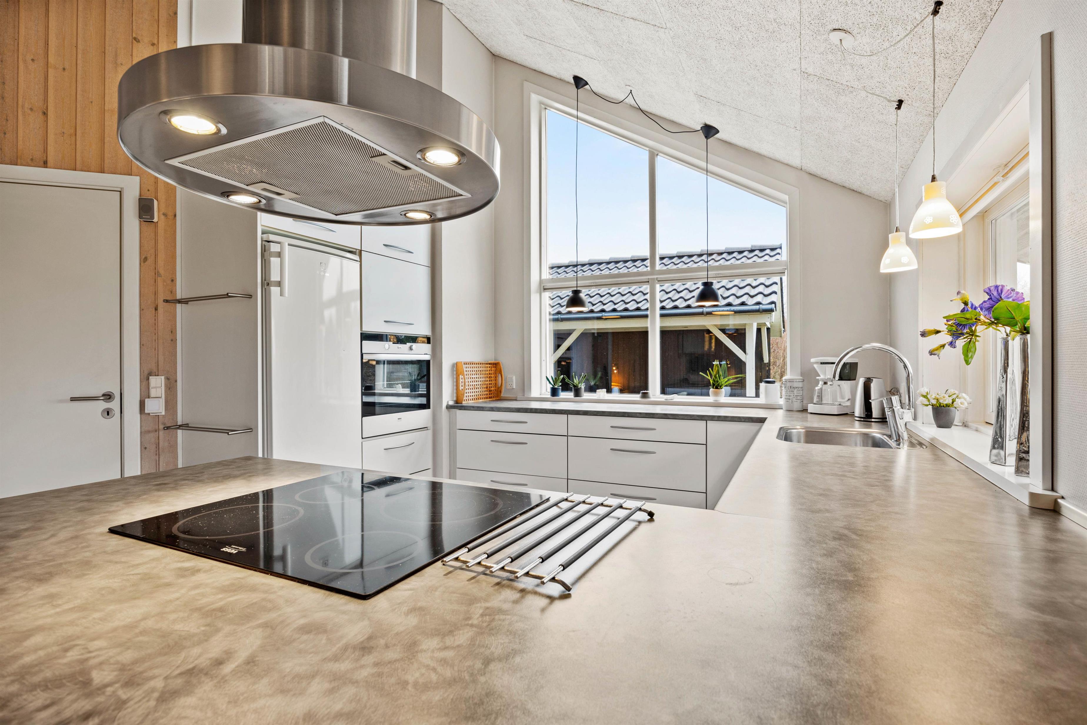 Feriehuset på Hvidbjerg Strandvej 34 indeholder 150 godt fordelte kvadratmeter uden megen spildplads. Lige fra I træder ind i den rummelige entré med vaskemaskine, tørretumbler og ekstra fryser til I går videre ind i køkkenet, fornemmer I den gode plads og skandinaviske indretning. Køkkenet ligger i åben forbindelse til feriehuset centrale rum, hvor I kan mødes til måltiderne og til aftenhygge i de komfortable sofaer foran brændeovnen. Opholdsrummet klinkegulv har gulvvarme, men brug dog også feriehusets energivenlige varmepumpe til at holde en behagelig temperatur.