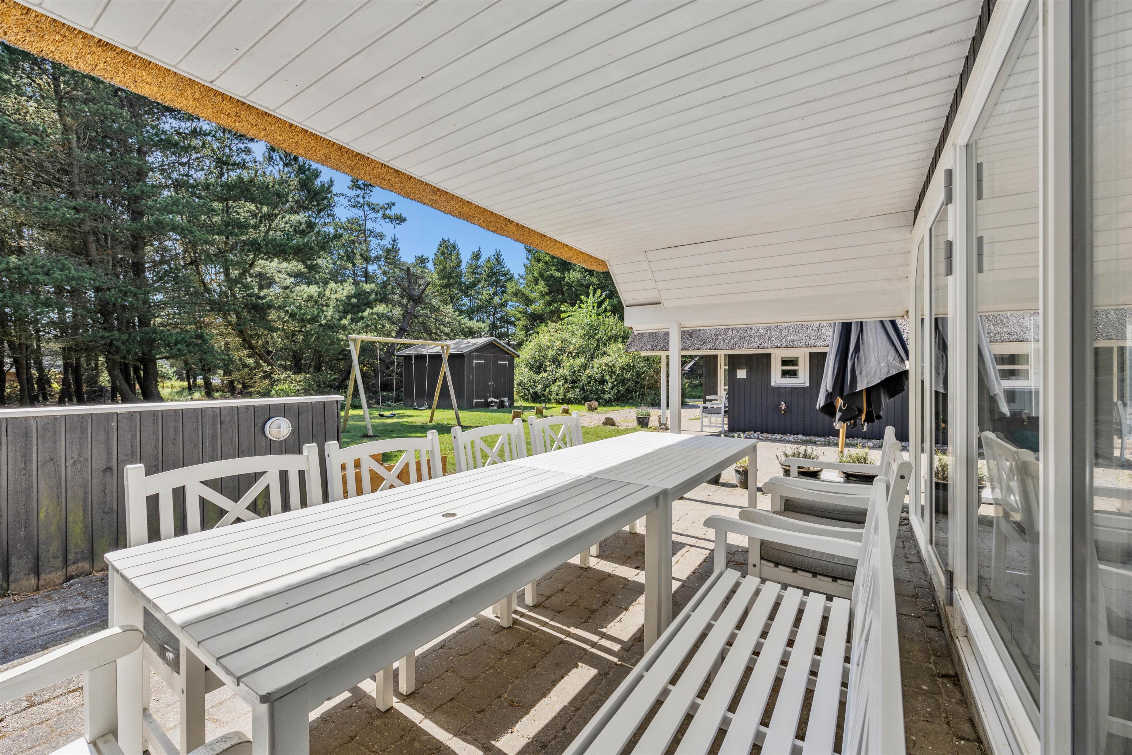 Der er dejligt læ på den 2915 m2 store grund, da de omkringliggende træer skærmer for vestenvinden og giver god mulighed for at nyde udelivet. Feriehuset har flere terrasser, så I har mulighed for at følge solen rundt eller finde skygge. Liggestolene står klar til jer, ligesom gasgrillen kun venter på jeres grillmad.