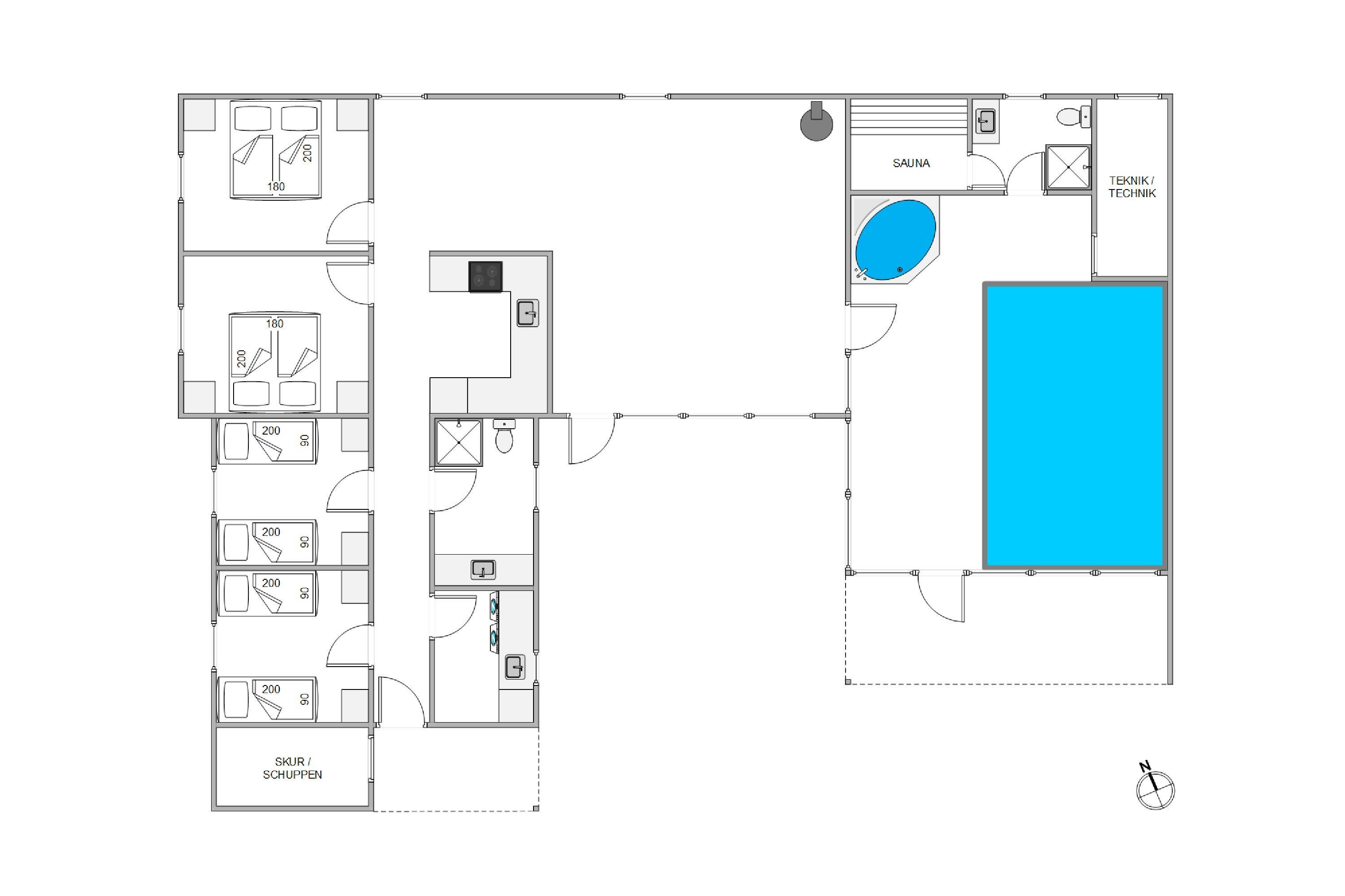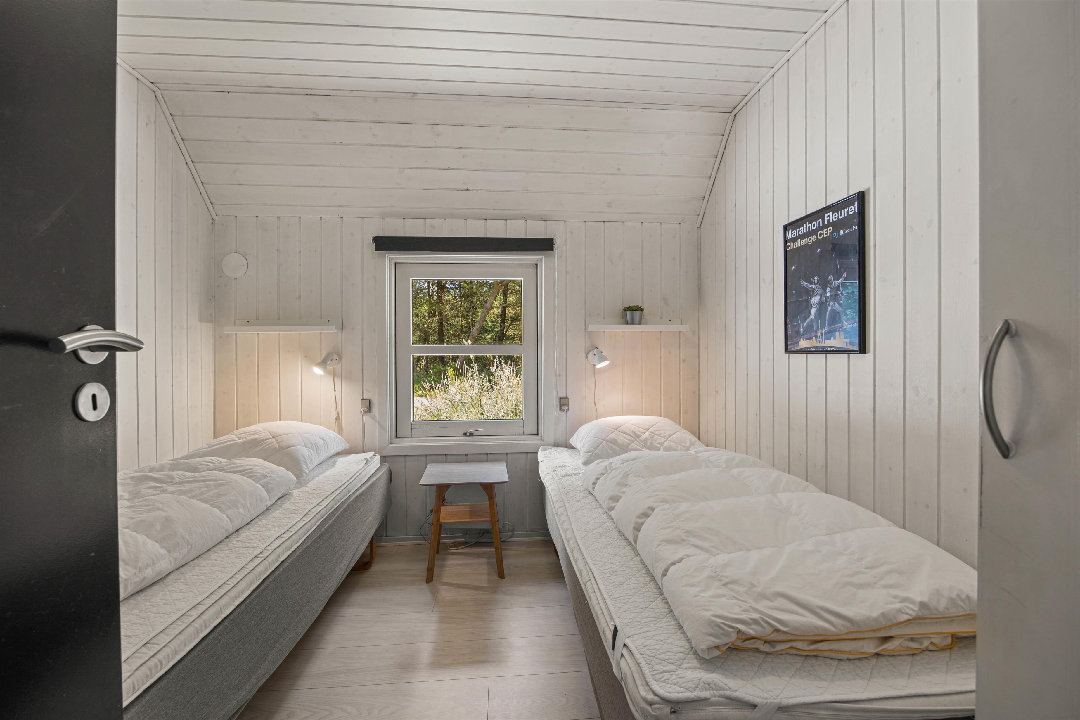 Feriehuset har 4 soveværelser – 2 med dobbeltsenge og 2 med enkeltsenge – og på hvert værelse er der 2 skabe, så I har plads til jeres tøj og sager. Derudover er der også 2 badeværelser med gulvvarme. Det ene ligger på værelsesgangen, og det andet ligger i forbindelse med poolrummet ved siden af saunaen.